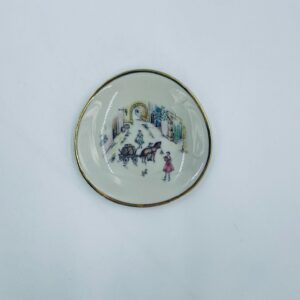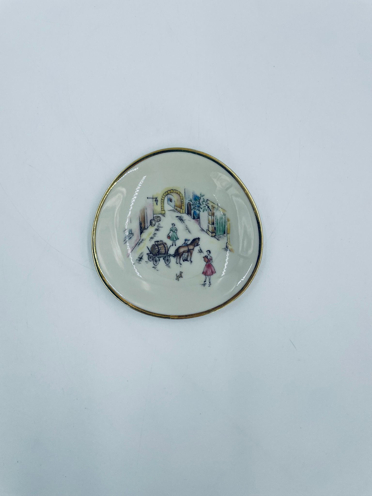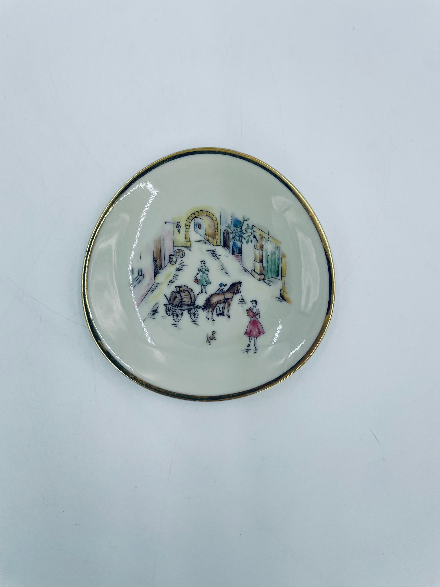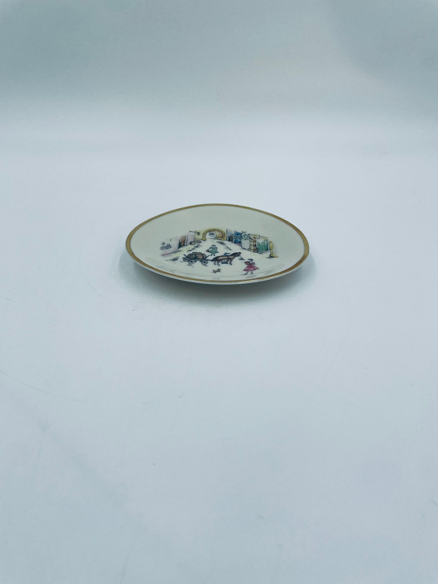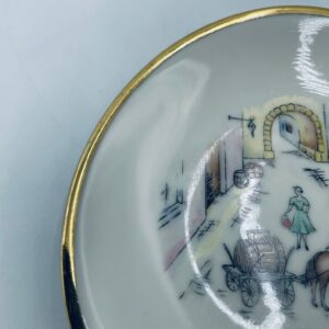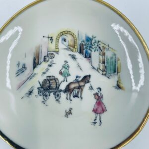 Mały talerzyk konfiturówka pochodzący z Bavarii, wykonany z wysokiej jakości porcelany w kolorze ecru. Talerzyk ręczne malowany, przedstawiający scenkę rodzajową z ludźmi i koniem w uliczce, wykończony złoceniem na rancie. Posiada przetarcie na złoceniu.
