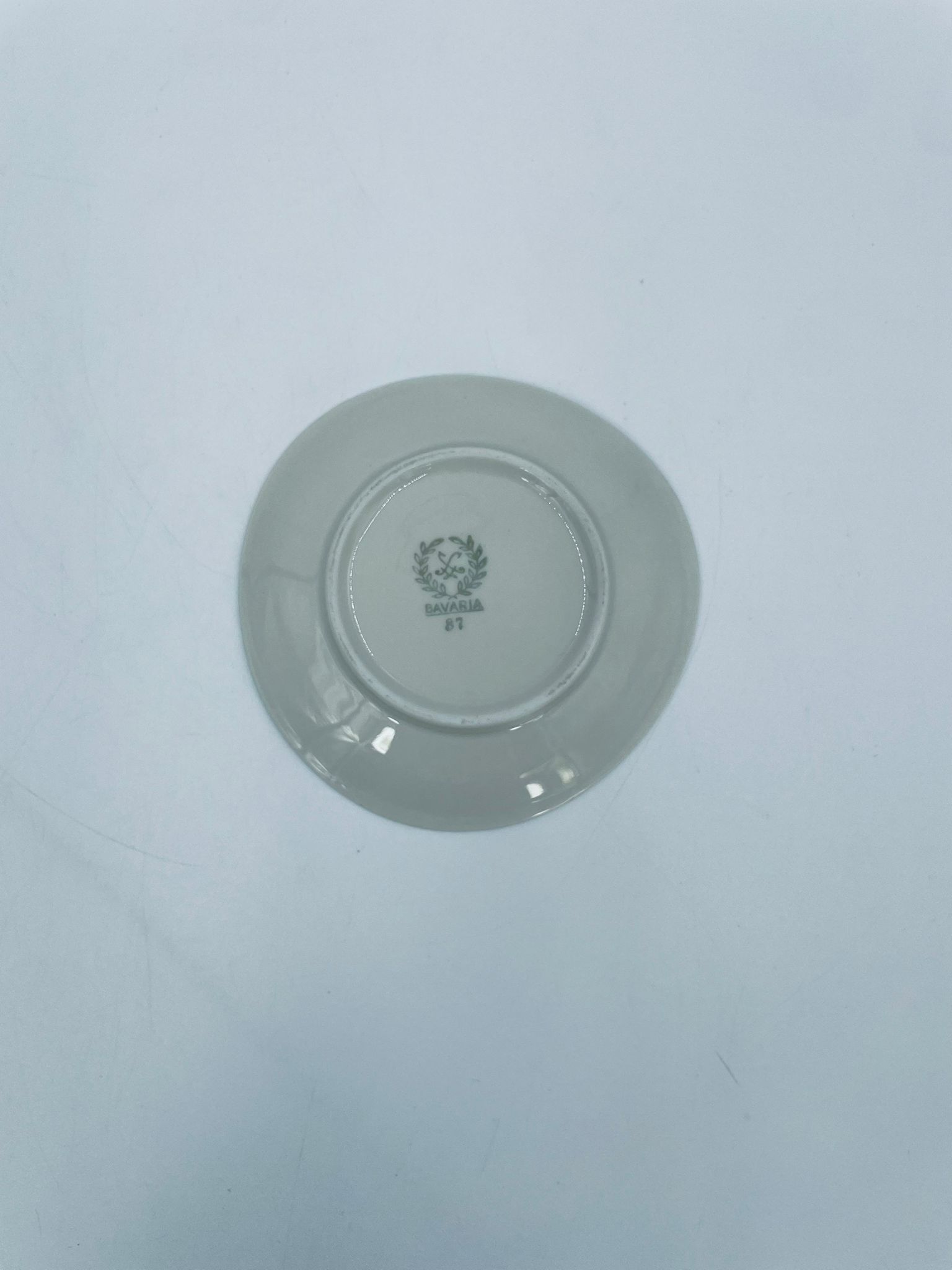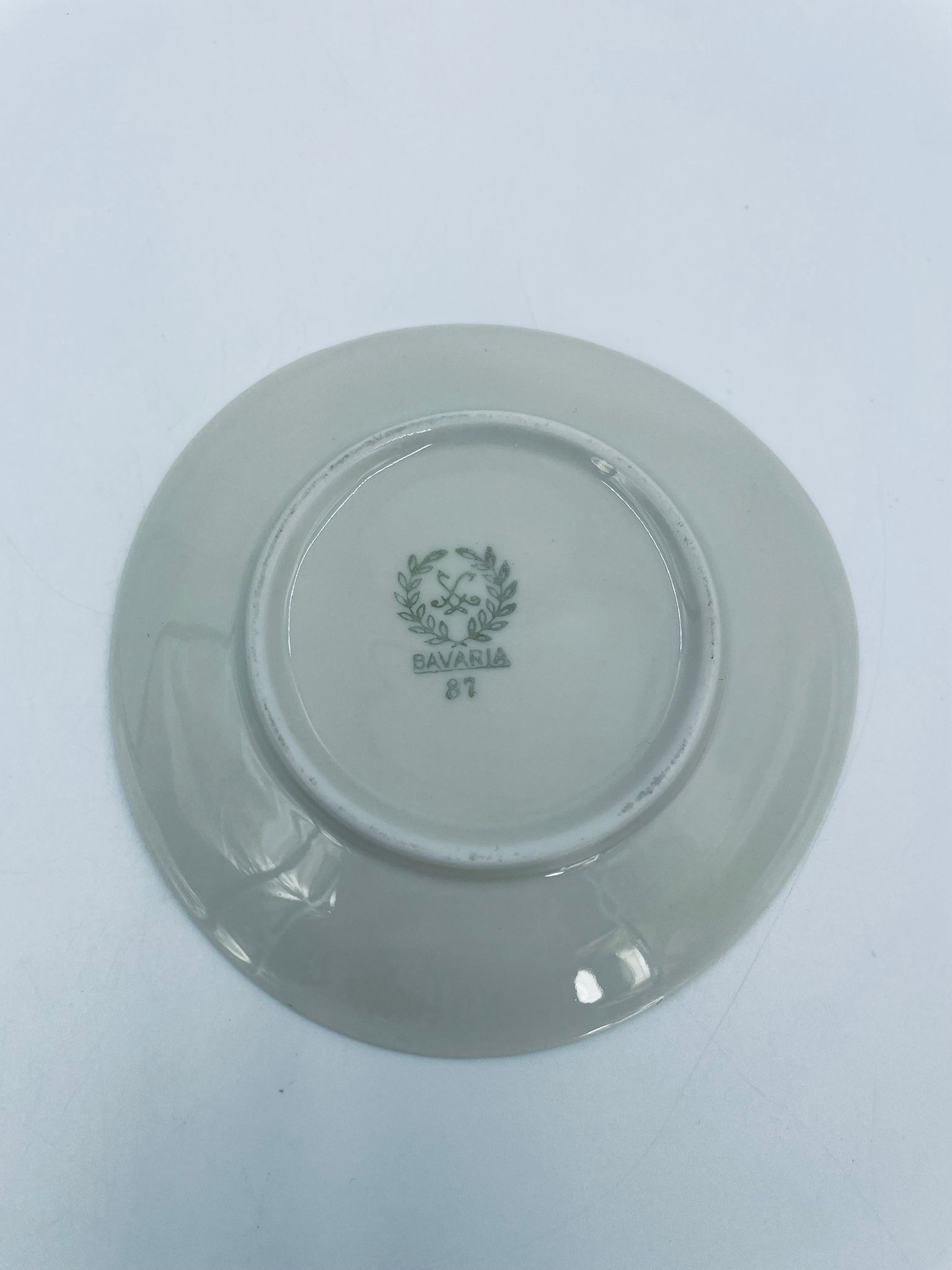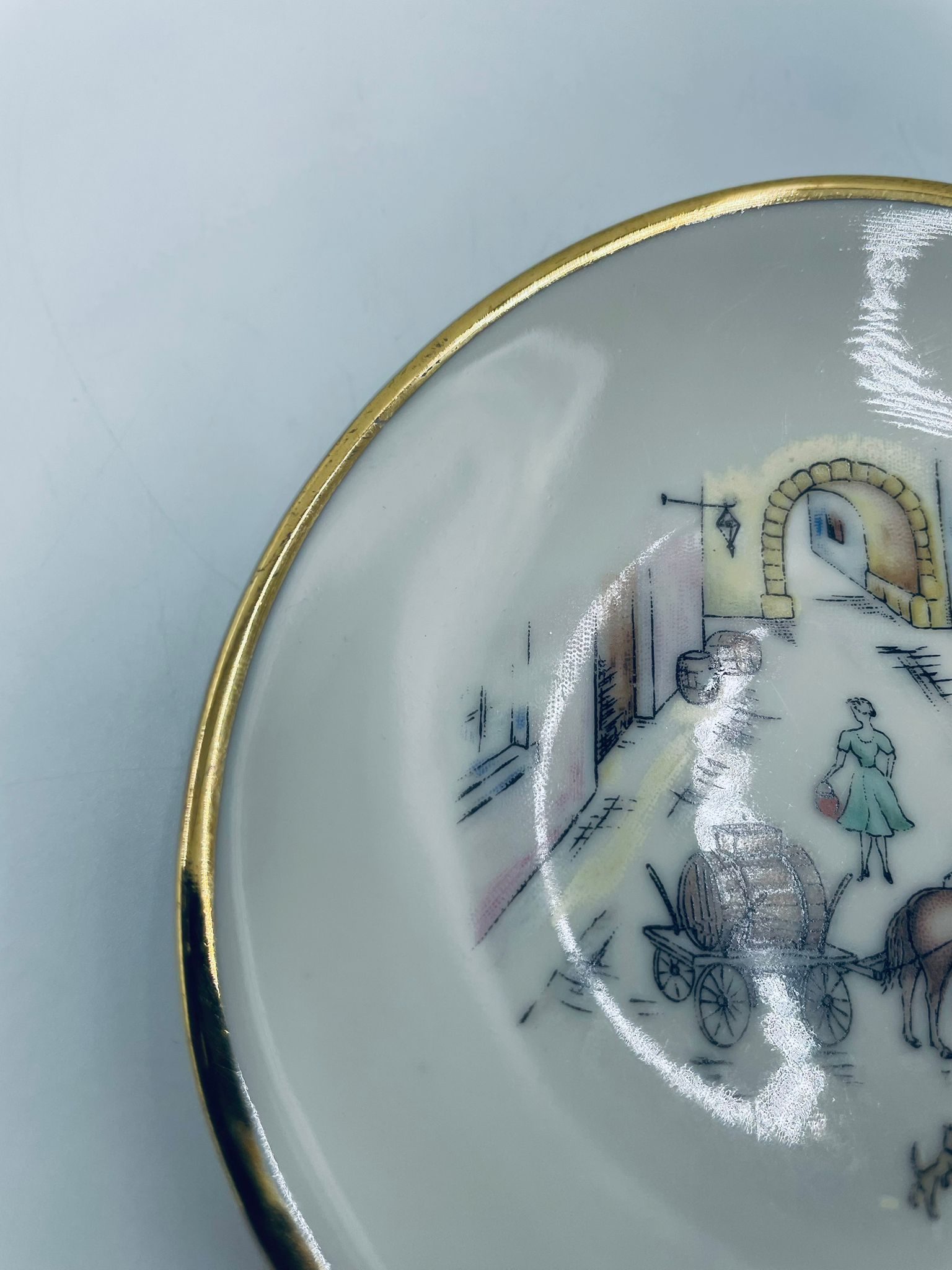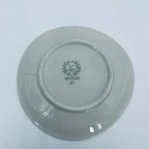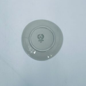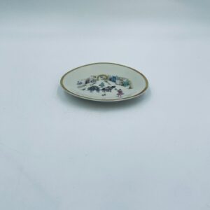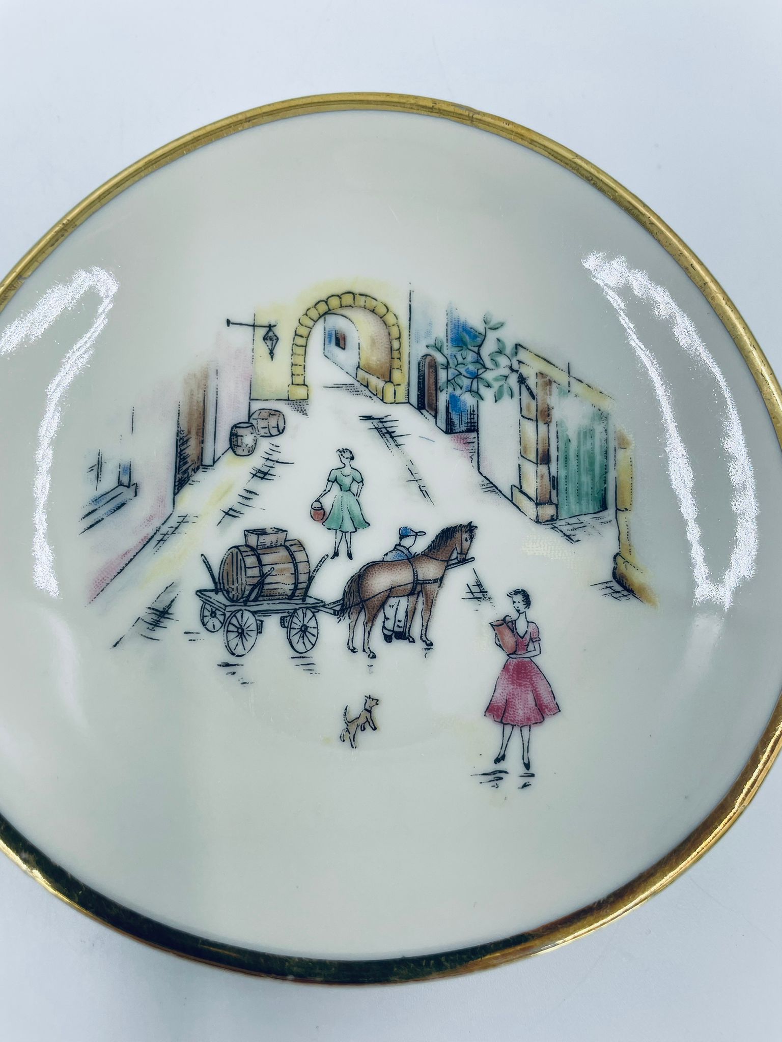 Mały talerzyk konfiturówka pochodzący z Bavarii, wykonany z wysokiej jakości porcelany w kolorze ecru. Talerzyk ręczne malowany, przedstawiający scenkę rodzajową z ludźmi i koniem w uliczce, wykończony złoceniem na rancie. Posiada przetarcie na złoceniu.