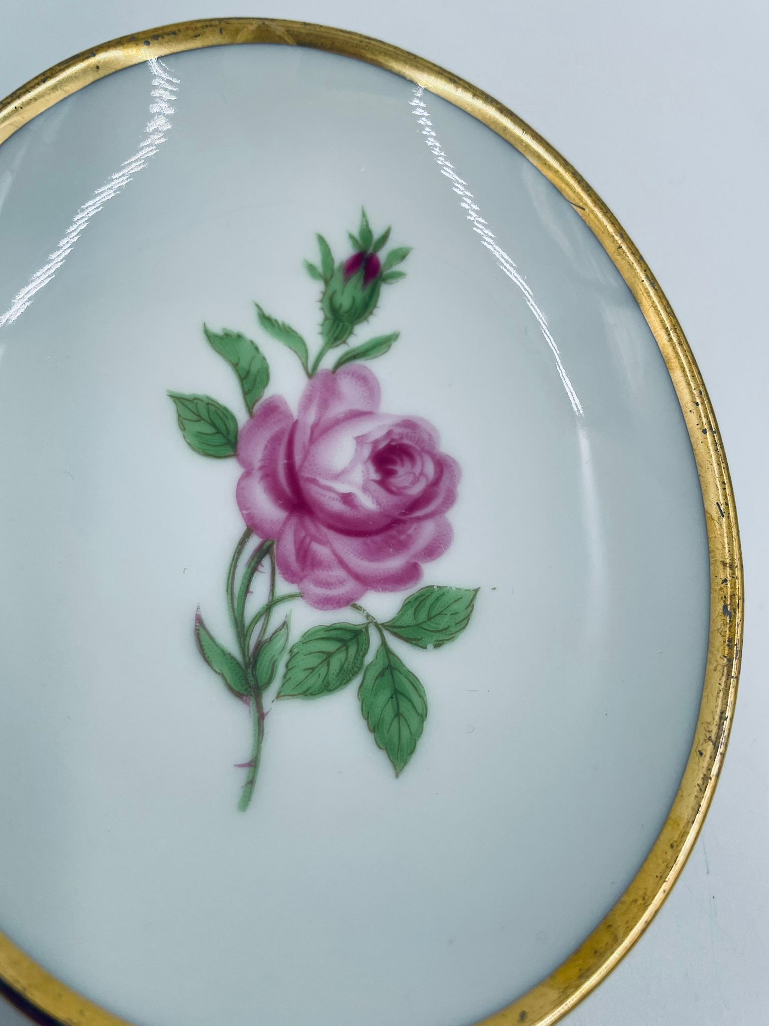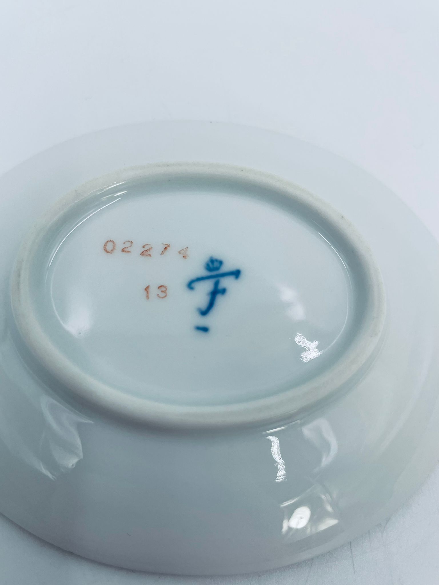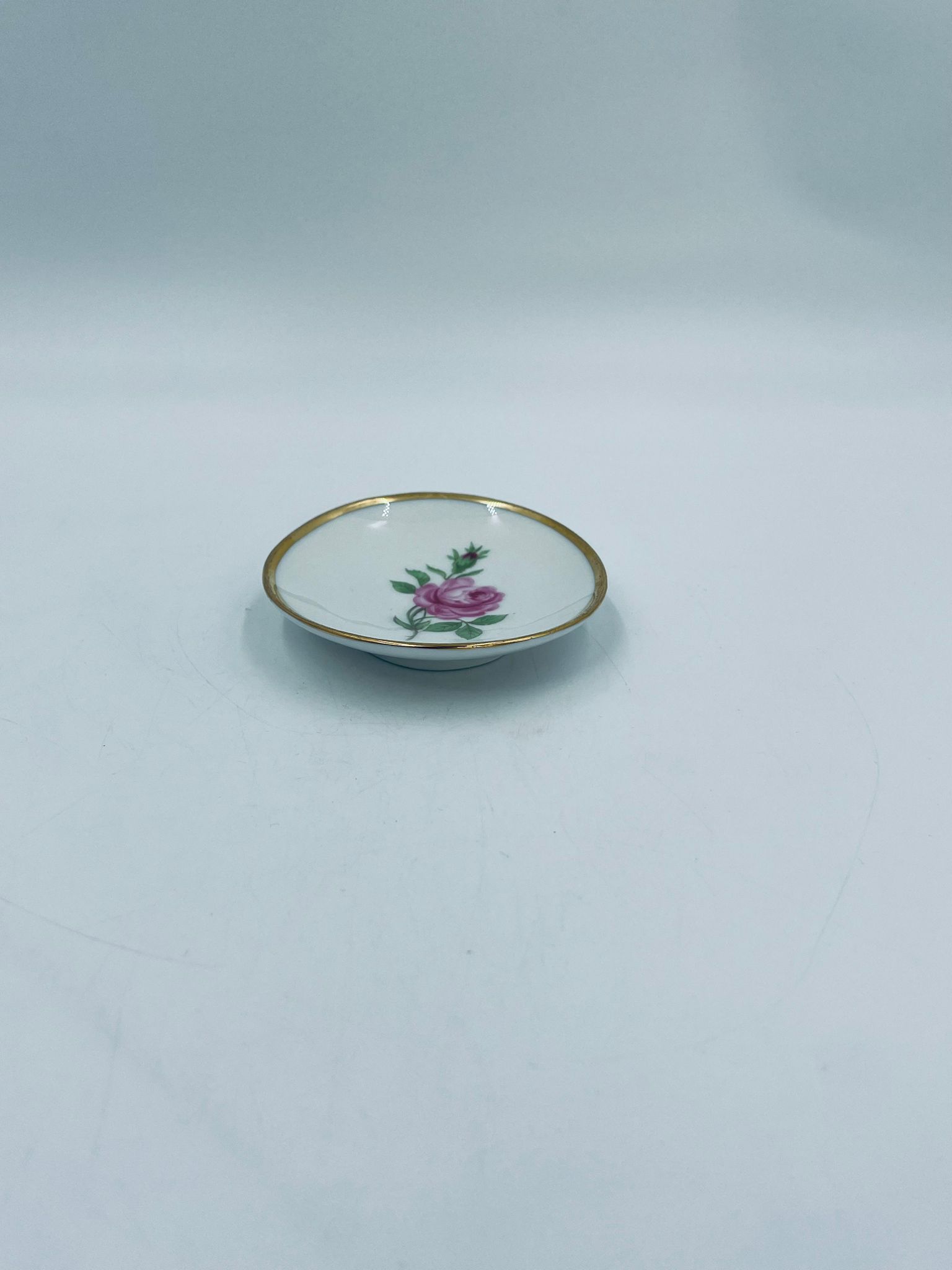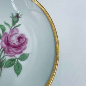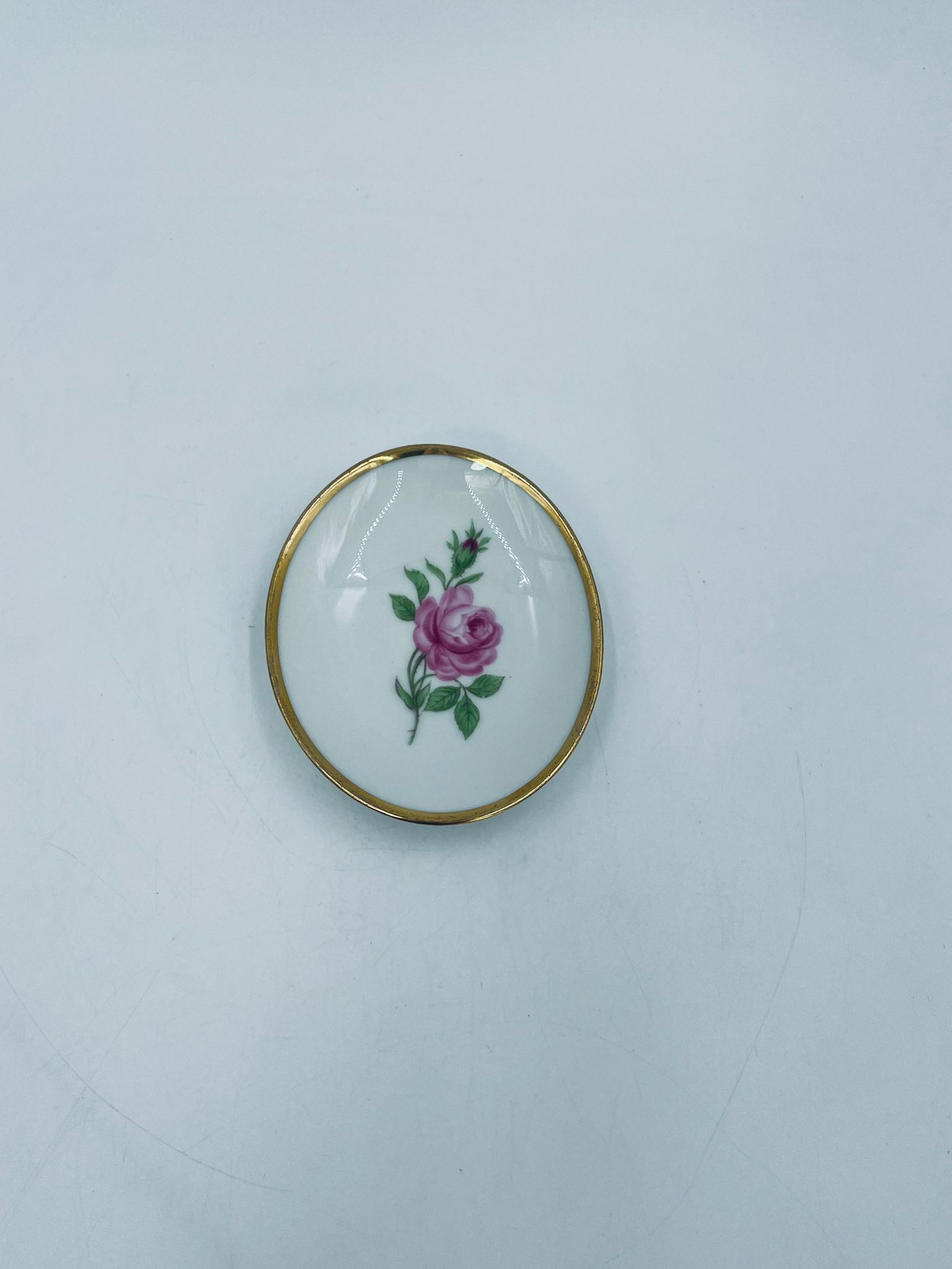 Mały talerzyk wytwórni Furstenberg, wykonany z wysokie jakości białej porcelany. Talerzyk o owalnym kształcie, ozdobiony wzorem, recznie malowanej róży, wykończony złoceniem na rancie. Posiada przetarcie na złoceniu.