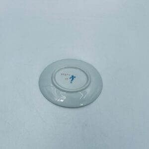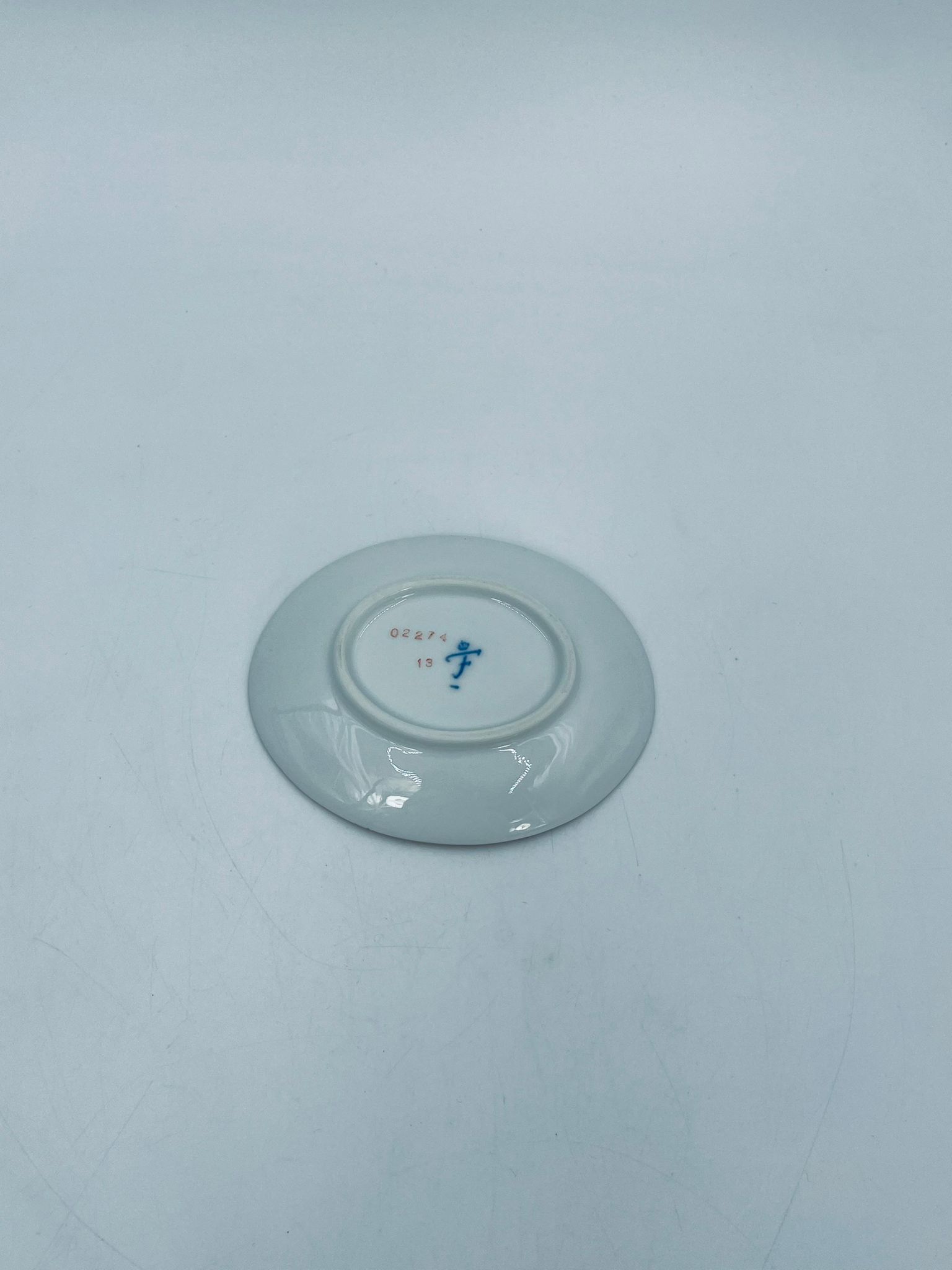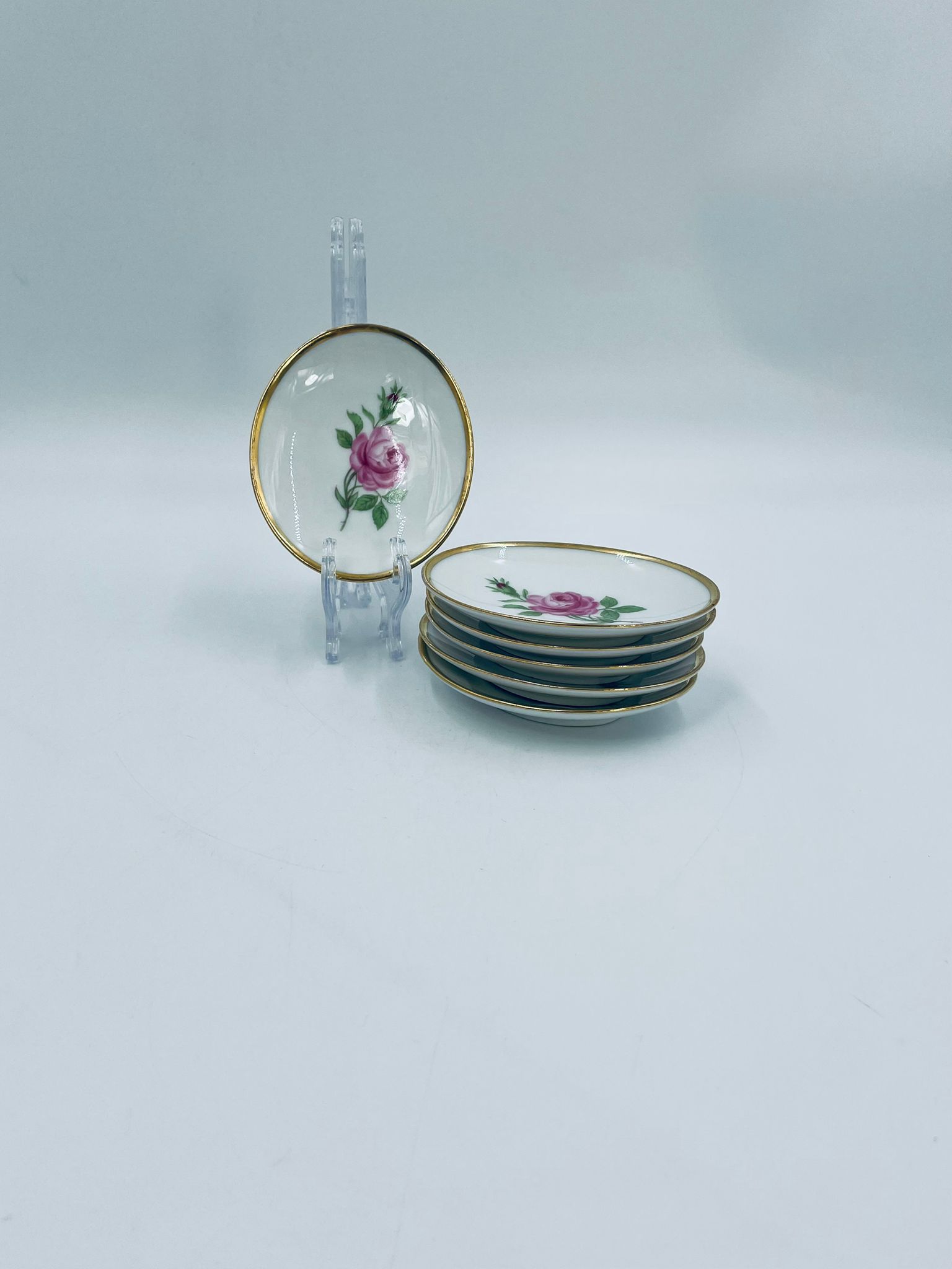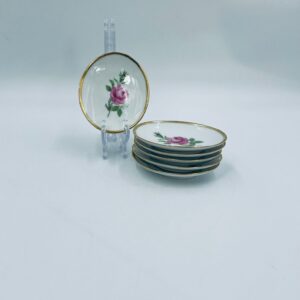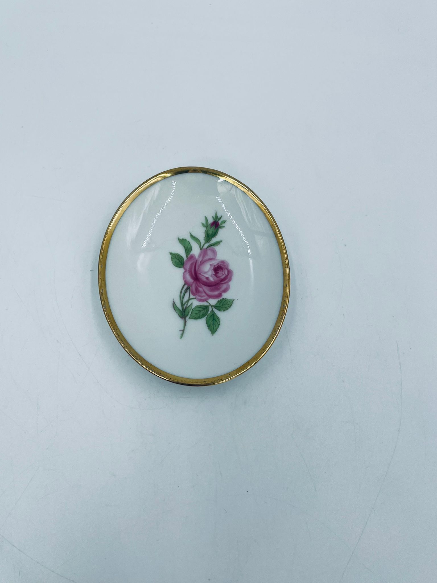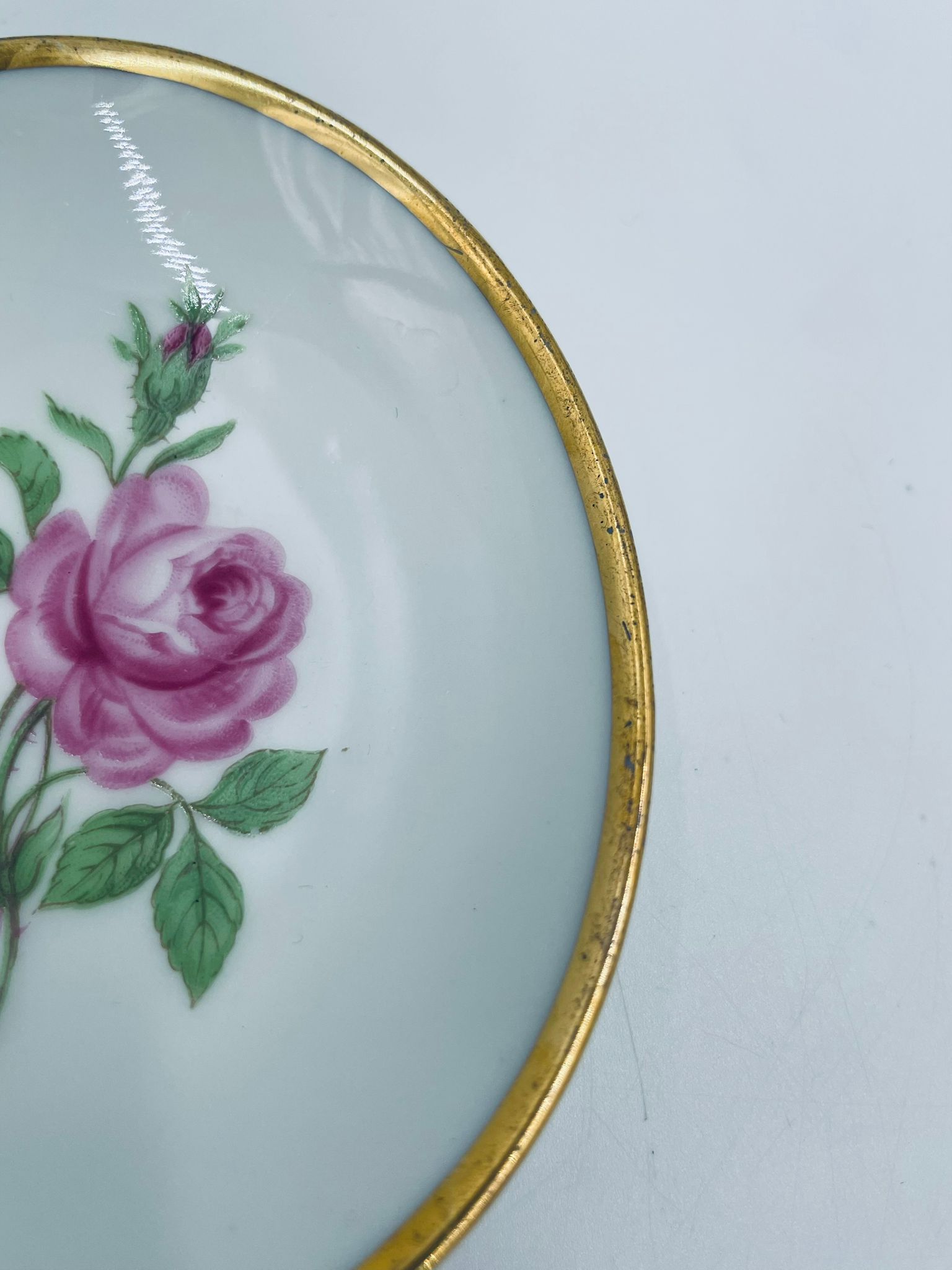 Mały talerzyk wytwórni Furstenberg, wykonany z wysokie jakości białej porcelany. Talerzyk o owalnym kształcie, ozdobiony wzorem, recznie malowanej róży, wykończony złoceniem na rancie. Posiada przetarcie na złoceniu.