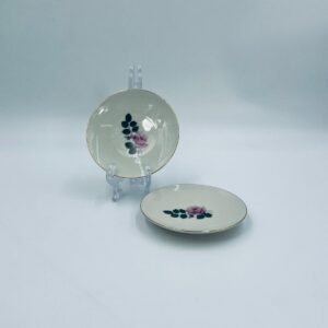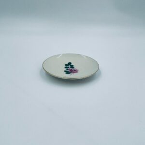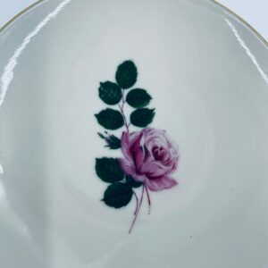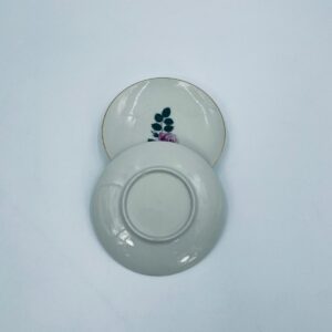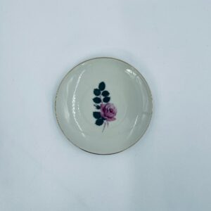 Mały talerzyk, spodek pod filiżankę w stylu Vintage, wykonany z wysokiej jakości porcelany w kolorze ecru. Talerzyk ozdobiony wzorem różowej róży z zielonymi listkami, wykończony złoceniem na rancie.