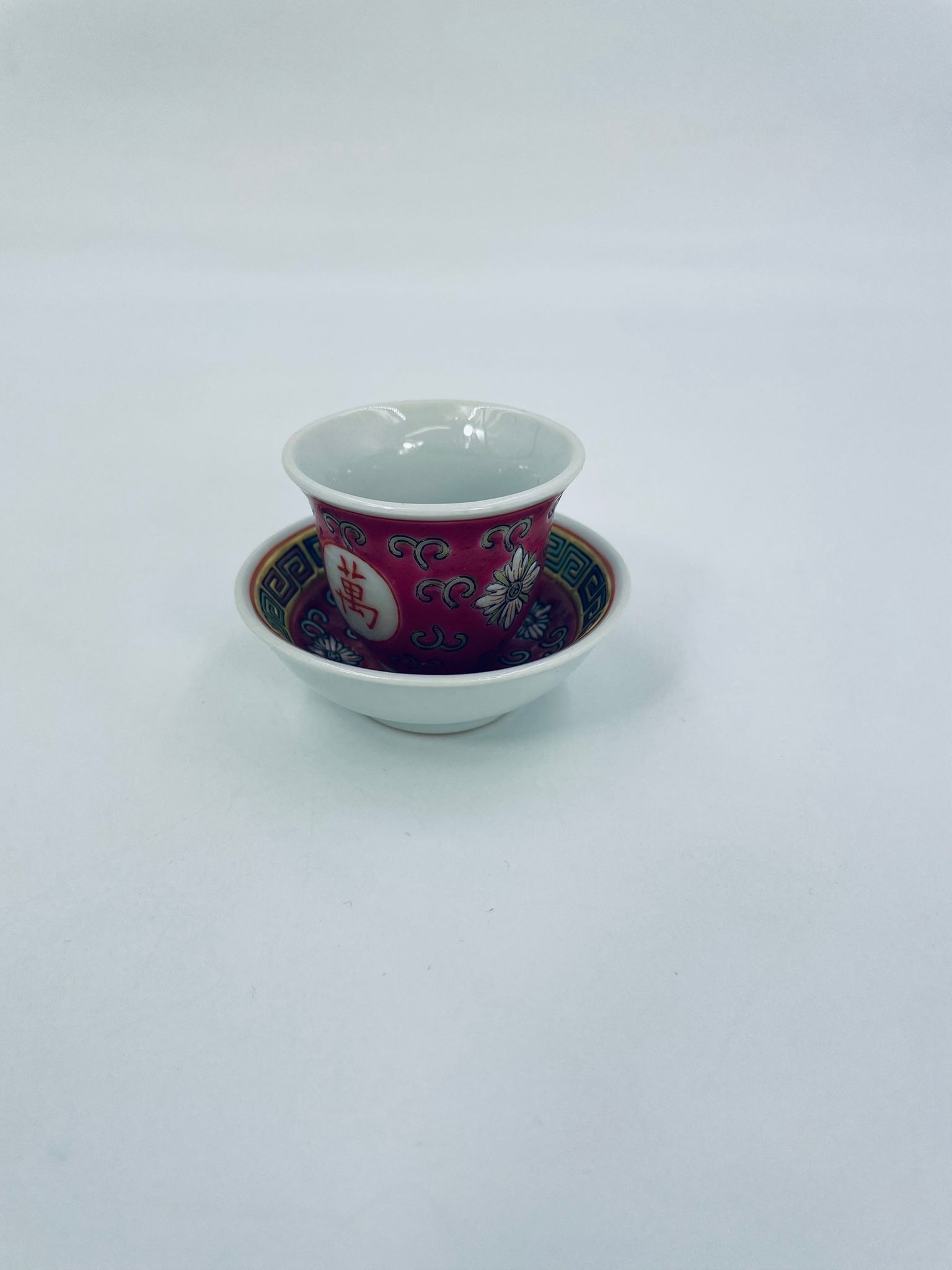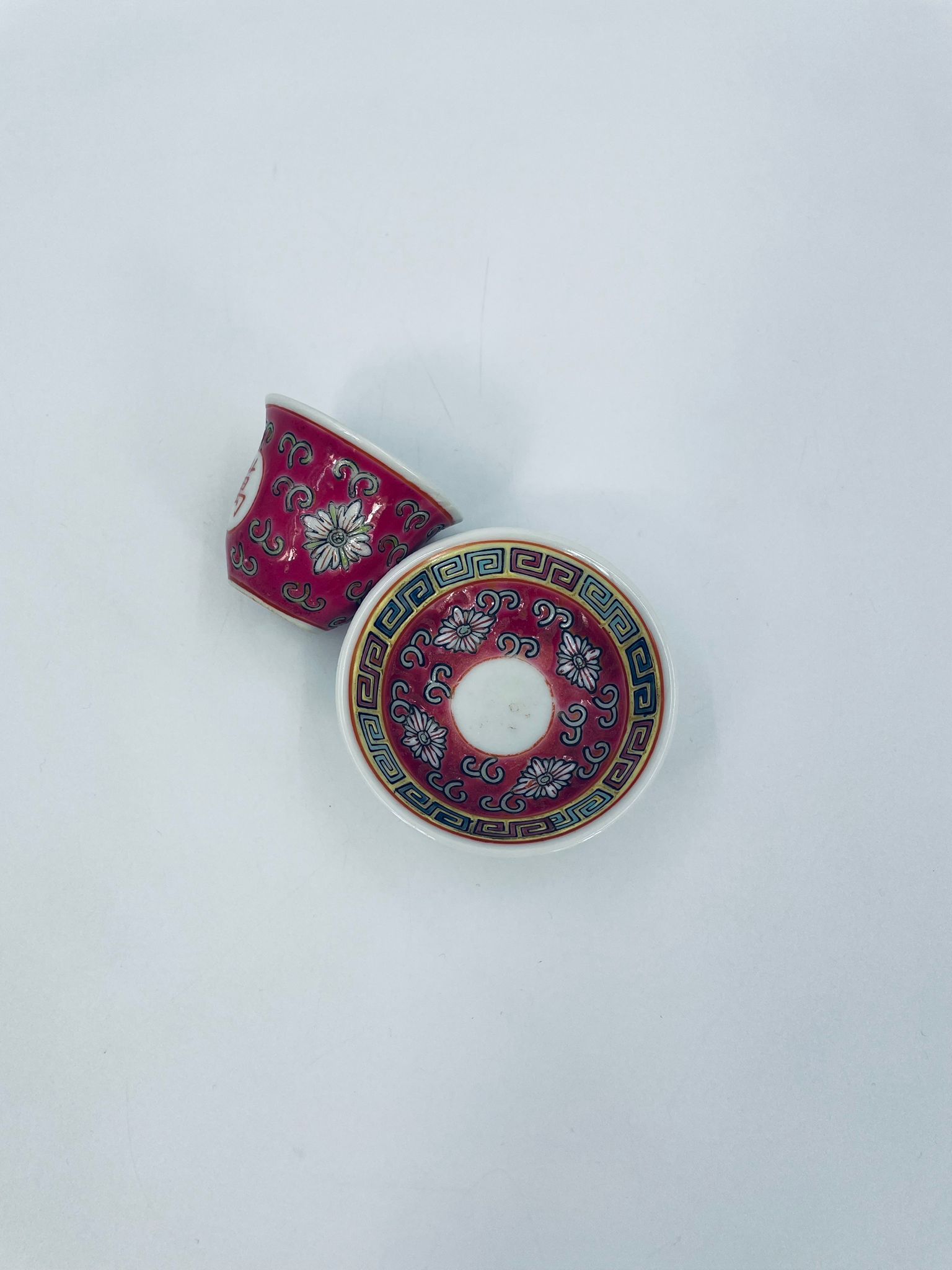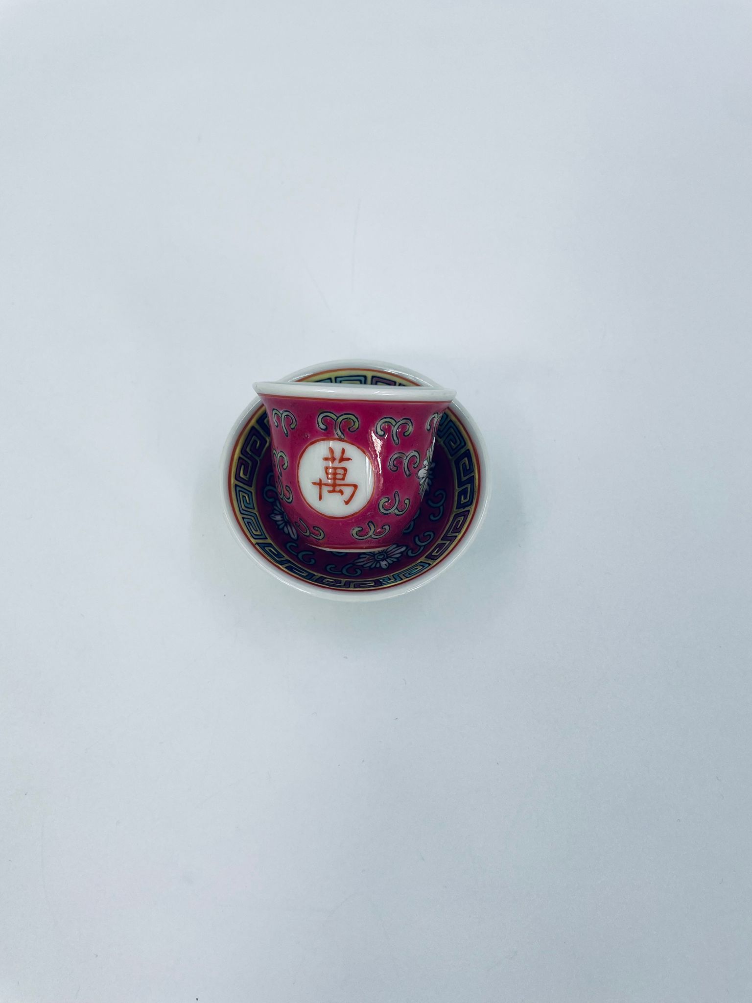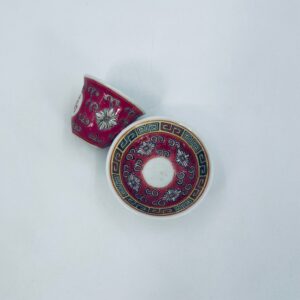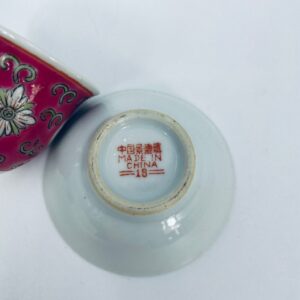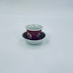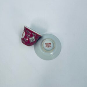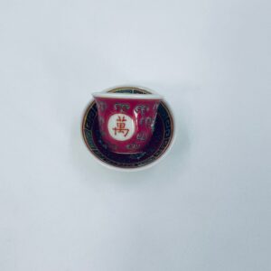 Miniaturowa filiżanka kolekcjonerska w zestawie duo do Shake Mun Shou, pochodząca z Jingdezhen, historycznej stolicy porcelany w Chinach w latach 60tych XXw. Zestaw charakteryzuje się zdobionym symbolem „Shou” (długowieczność), otoczonymi motywami kwiatowymi i kolorowa, geometryczną obwódką na spodku. Posiada przetarcia.