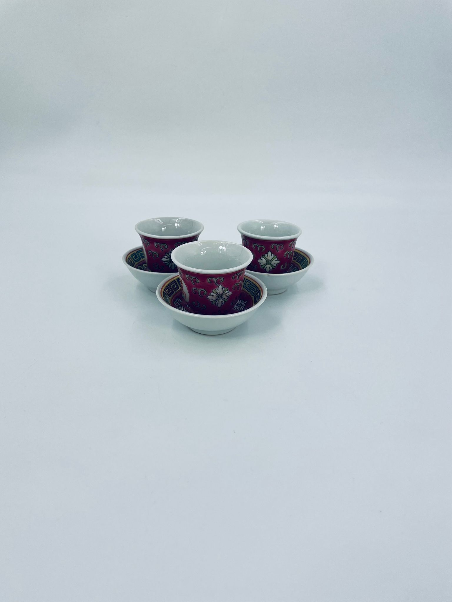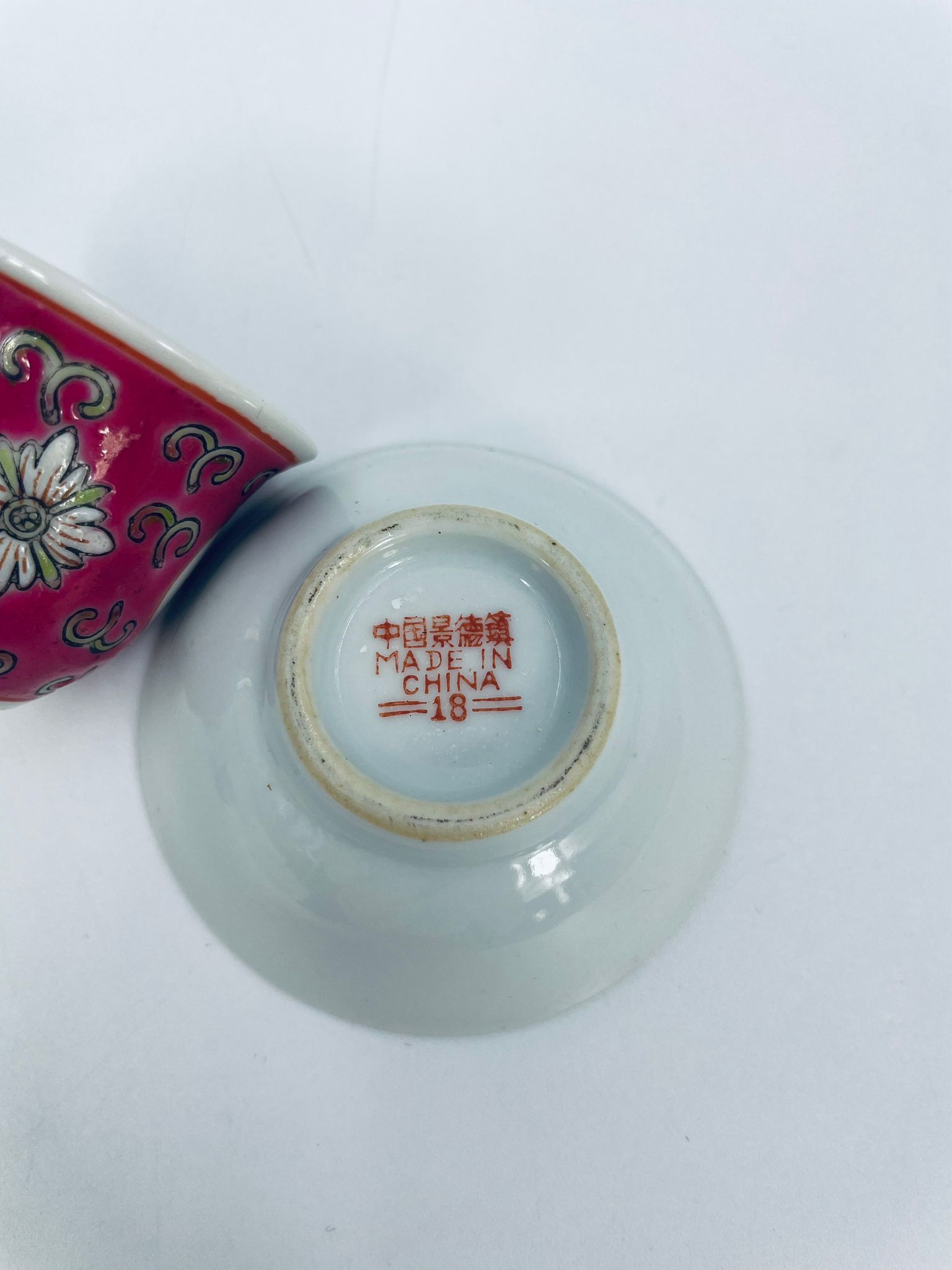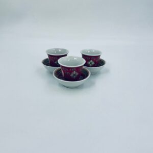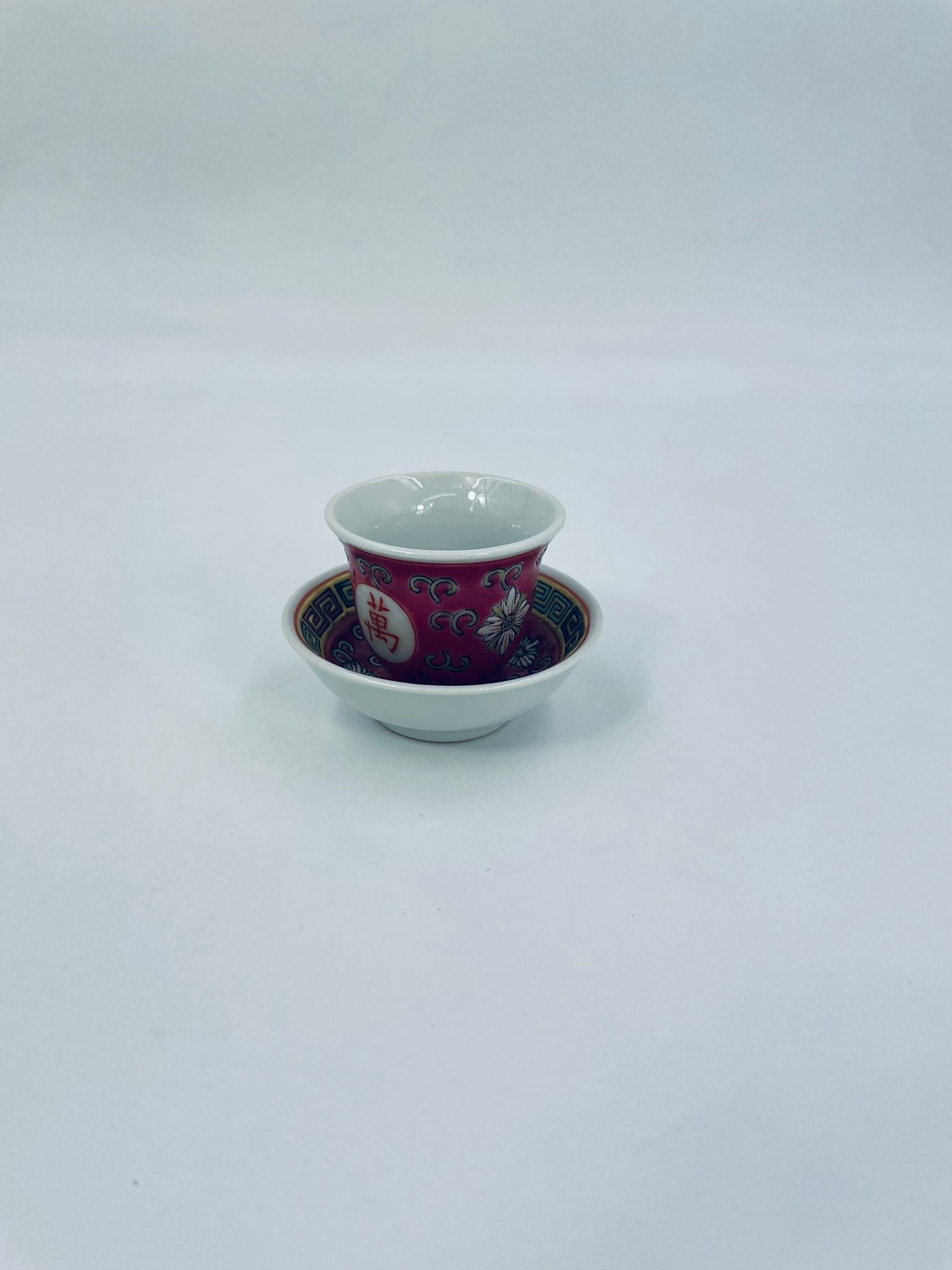 Miniaturowa filiżanka kolekcjonerska w zestawie duo do Shake Mun Shou, pochodząca z Jingdezhen, historycznej stolicy porcelany w Chinach w latach 60tych XXw. Zestaw charakteryzuje się zdobionym symbolem „Shou” (długowieczność), otoczonymi motywami kwiatowymi i kolorowa, geometryczną obwódką na spodku. Posiada przetarcia.
