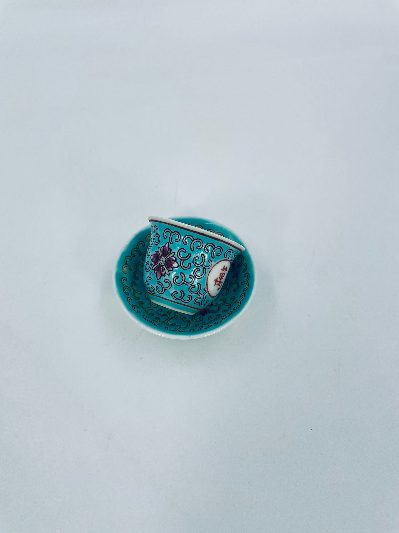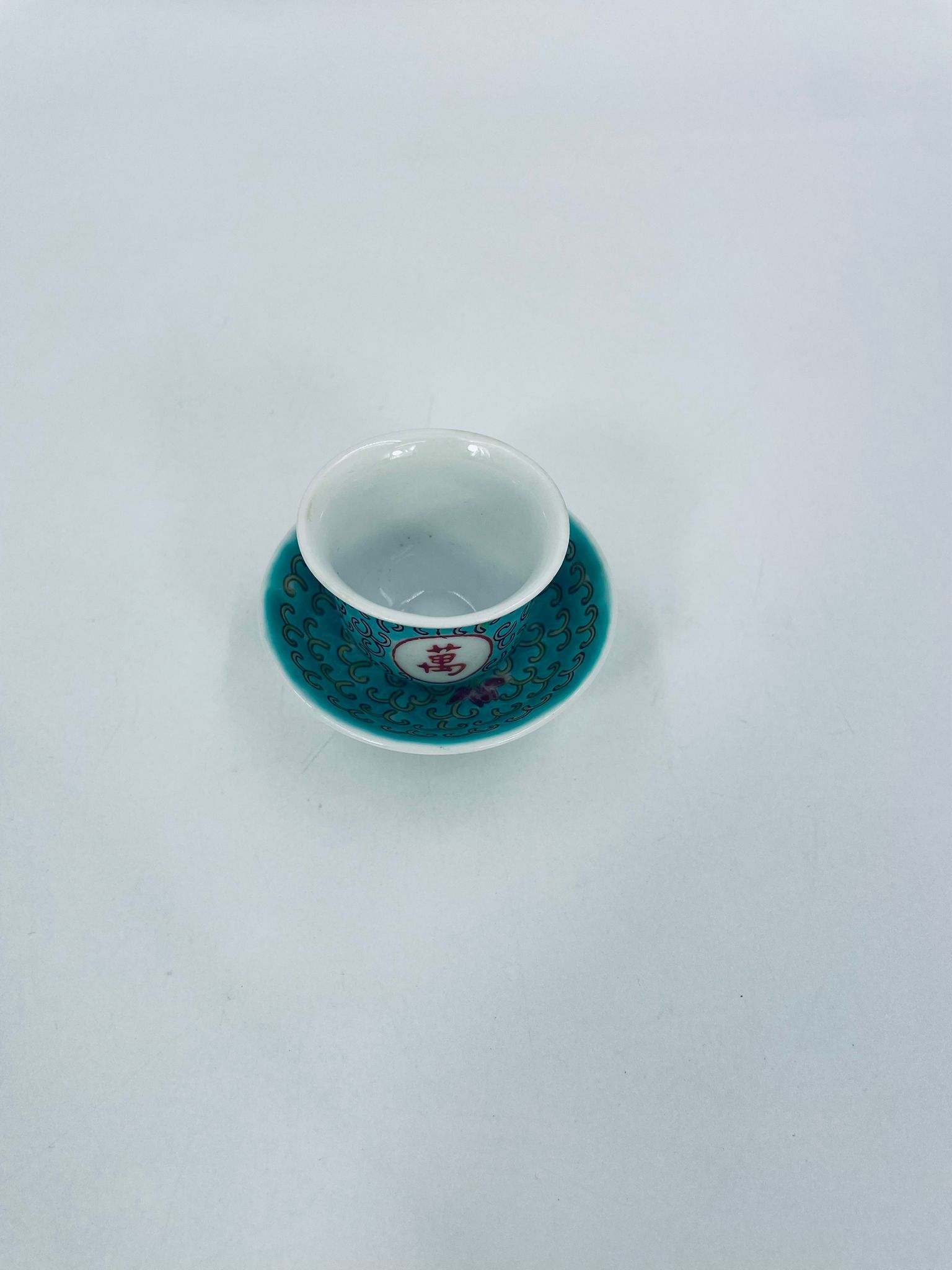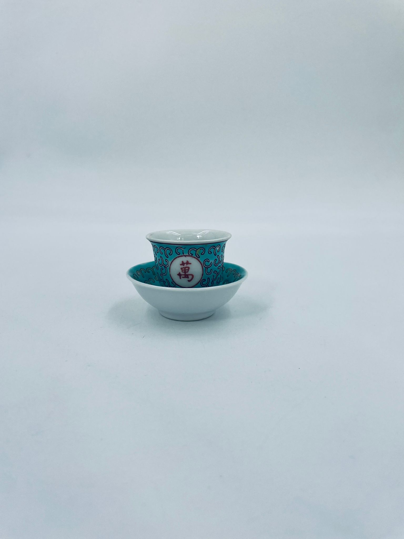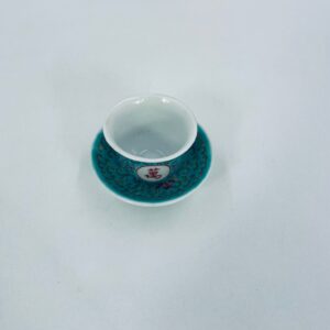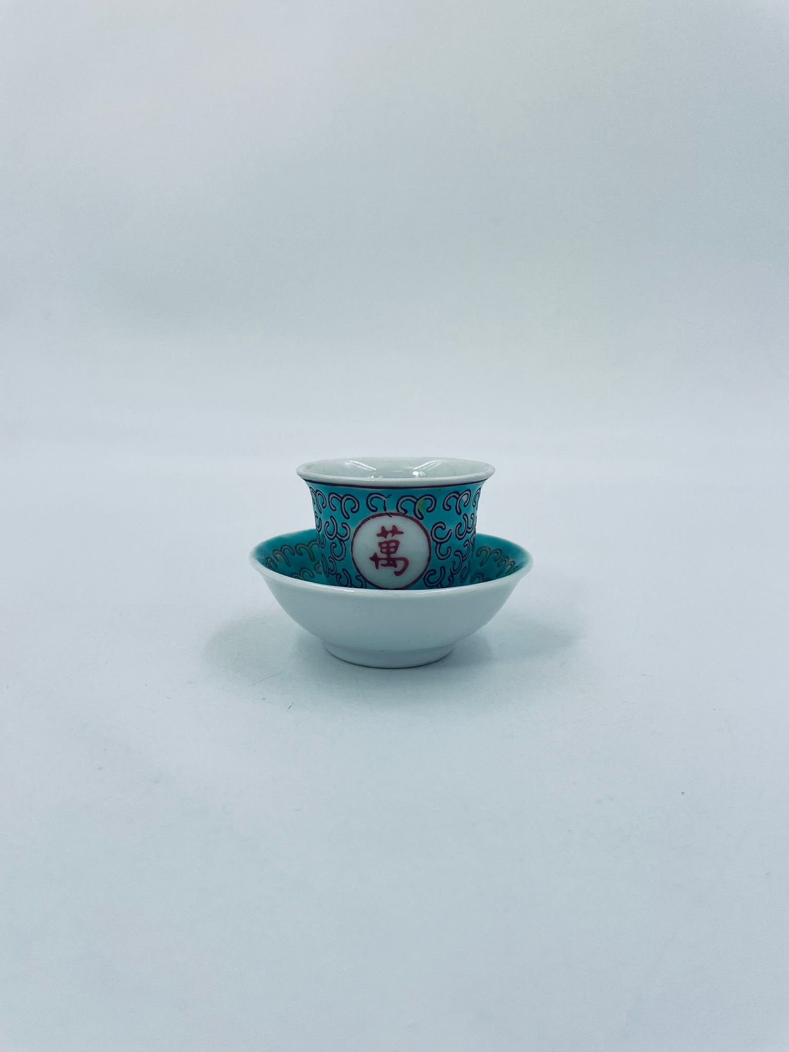 Miniaturowa filiżanka kolekcjonerska w zestawie duo do Shake Mun Shou, pochodząca z Jingdezhen, historycznej stolicy porcelany w Chinach w latach 60tych XXw. Zestaw charakteryzuje się kolorem turkusowym , zdobionym symbolem „Shou” (długowieczność), otoczonym motywem kwiatowym i zwojami. Posiada przetarcia.