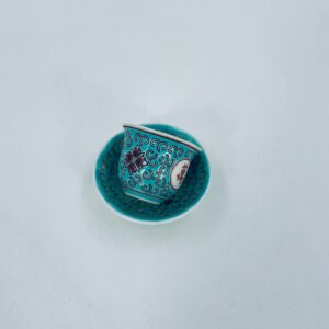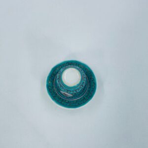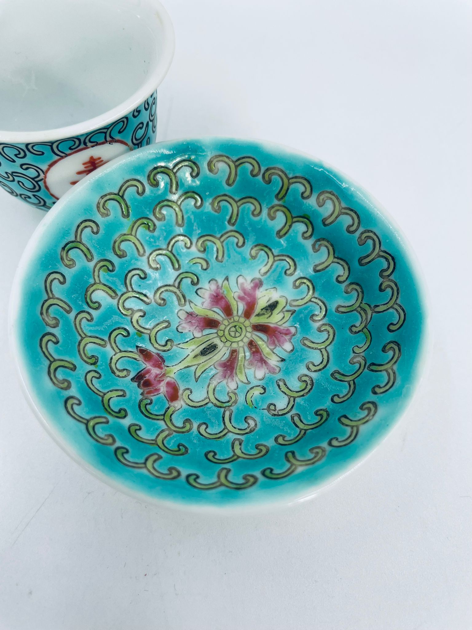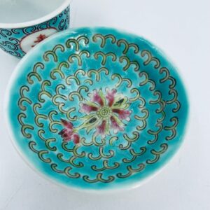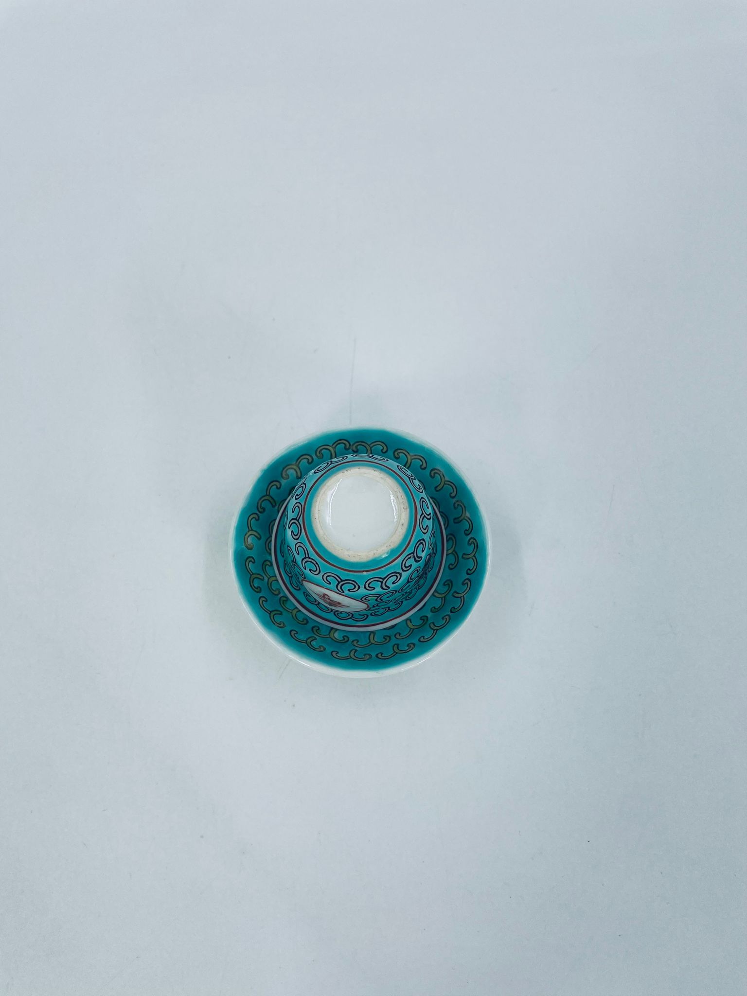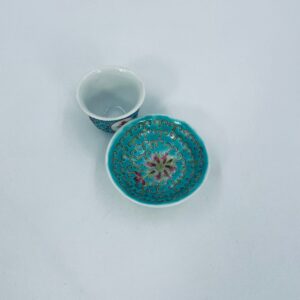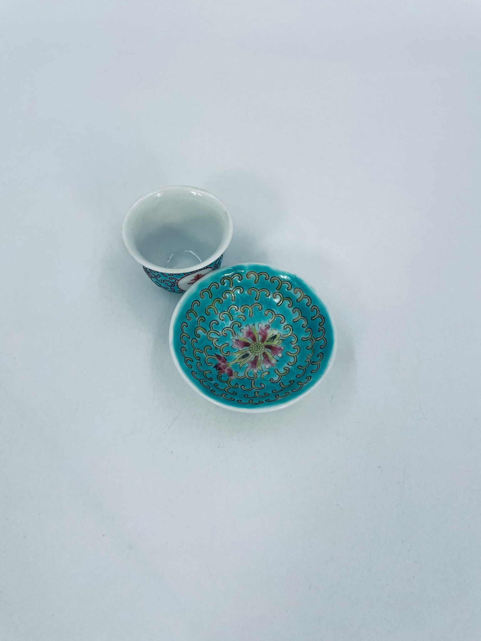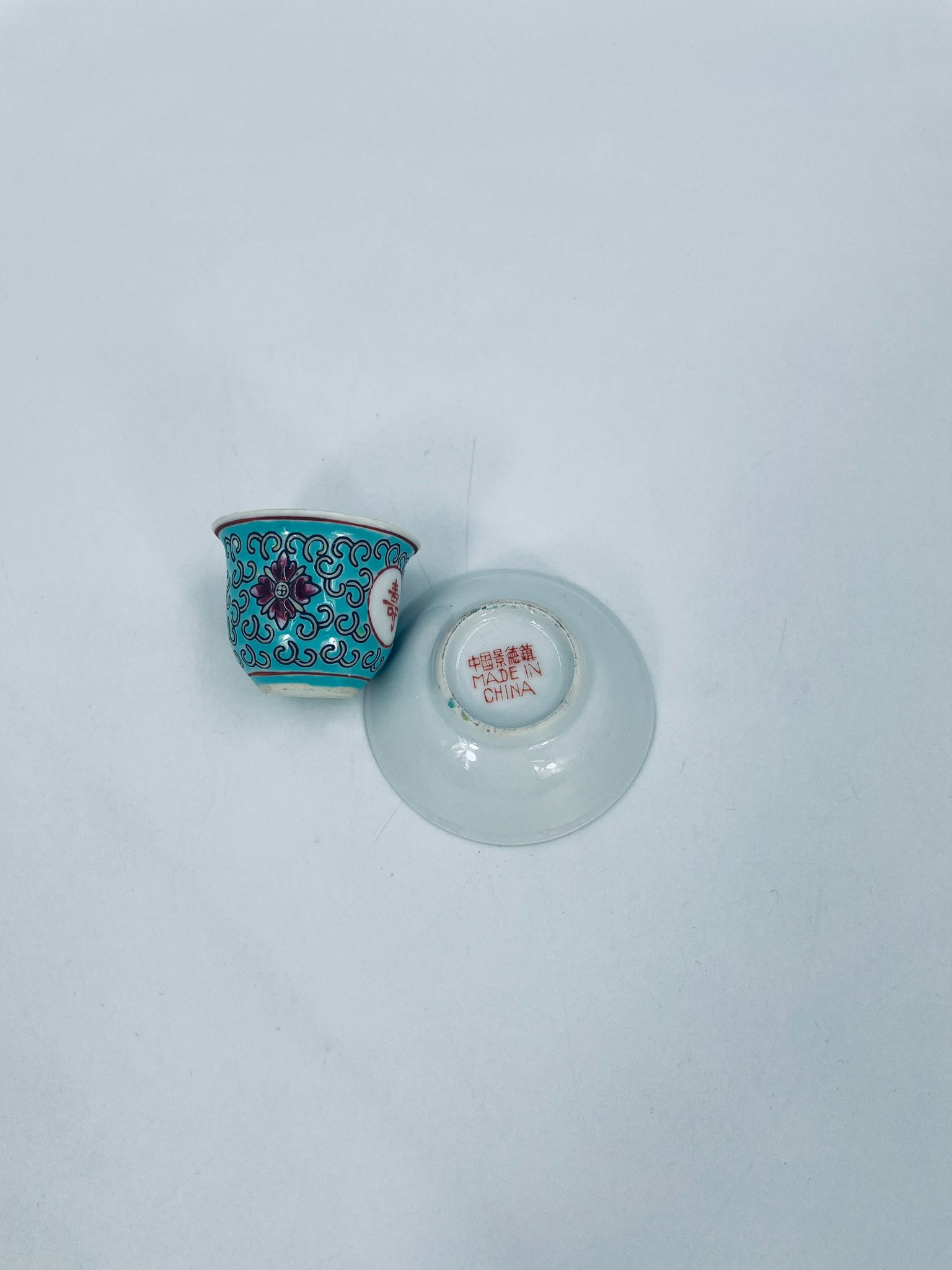 Miniaturowa filiżanka kolekcjonerska w zestawie duo do Shake Mun Shou, pochodząca z Jingdezhen, historycznej stolicy porcelany w Chinach w latach 60tych XXw. Zestaw charakteryzuje się kolorem turkusowym , zdobionym symbolem „Shou” (długowieczność), otoczonym motywem kwiatowym i zwojami. Posiada przetarcia.