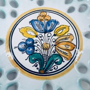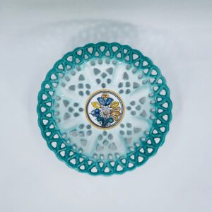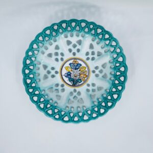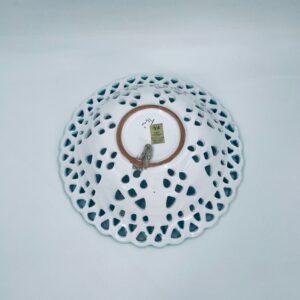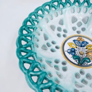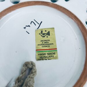Misa dekoracyjna pochodząca z Węgier, oceniona przez Radę Sztuki Ludowej wykonana z ceramiki szkliwionej. Misa charakteruzuje się ręcznie malowanym wzorem kwiatowym oraz ażurową, koronkową krawędzią w turkusowym kolorze. Misa może służyć do serwowania owoców, słodyczy lub jako dekoracja ścienna.
