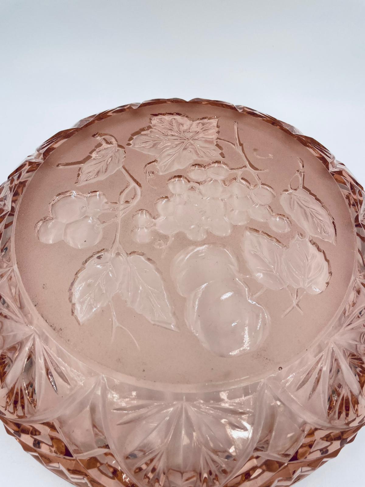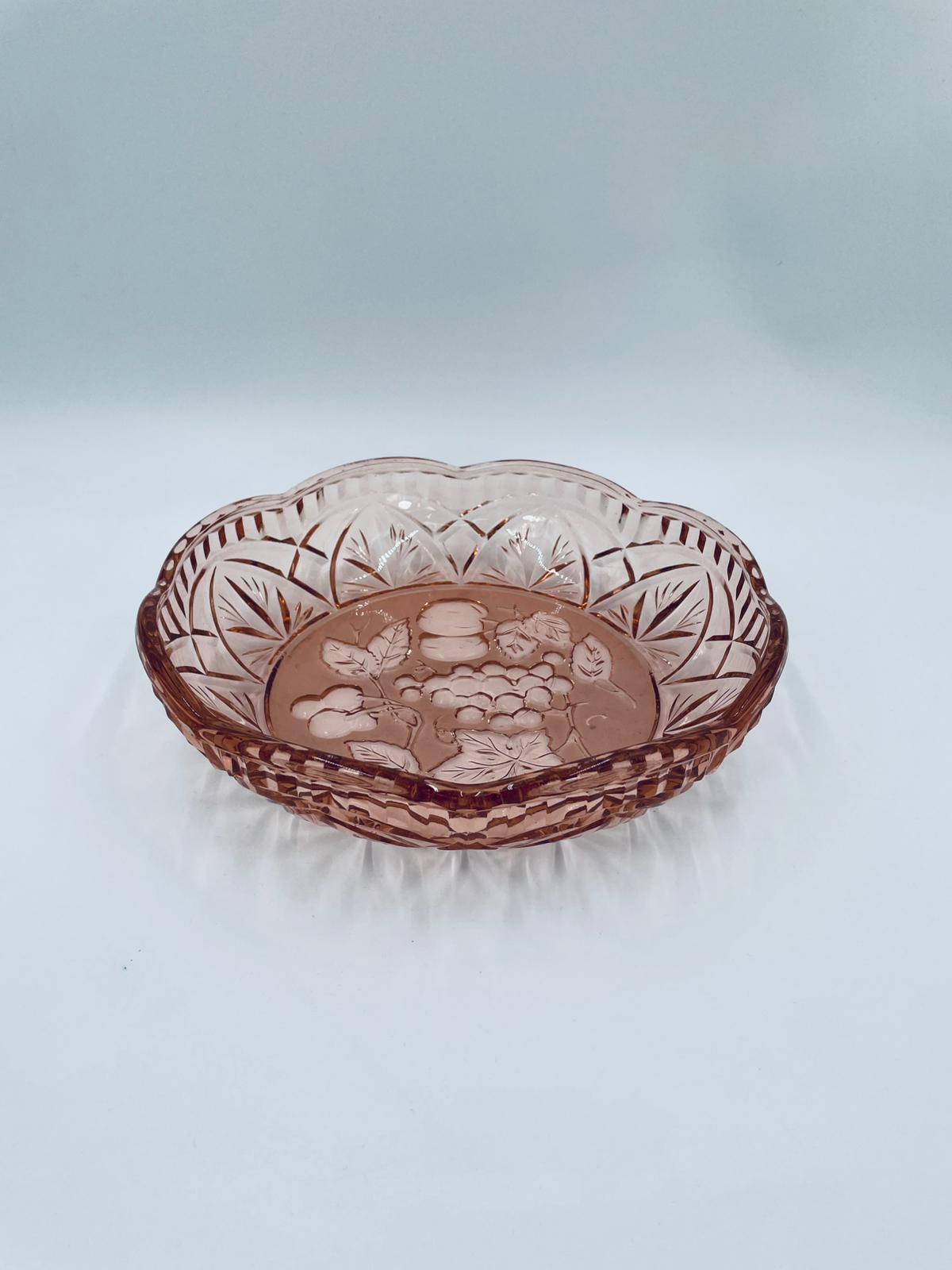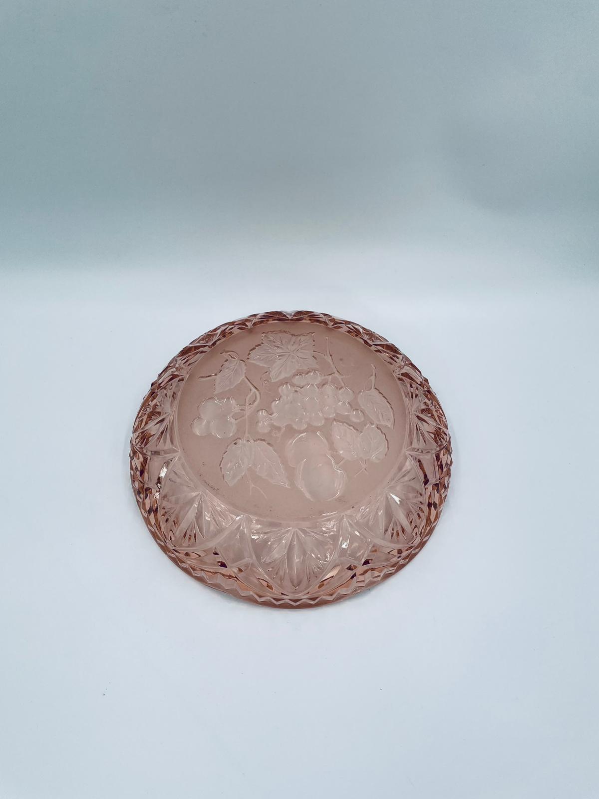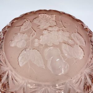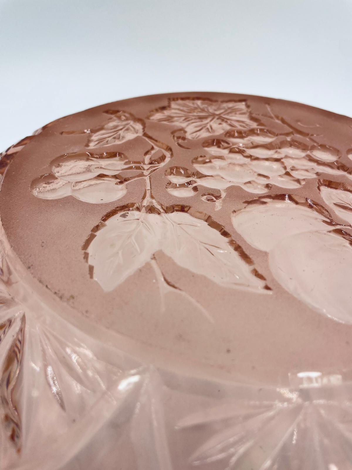 Misa dekoracyjna „Granada” wyprodukowana przez Veb Sachsenglas, wykonana z wysokiej jakości szkła w kolorze rozalinowym. Misa charakteryzuje się dekoracyjnym tłoczonym wzorem winogron i liści na dnie naczynia oraz falistym brzegiem.