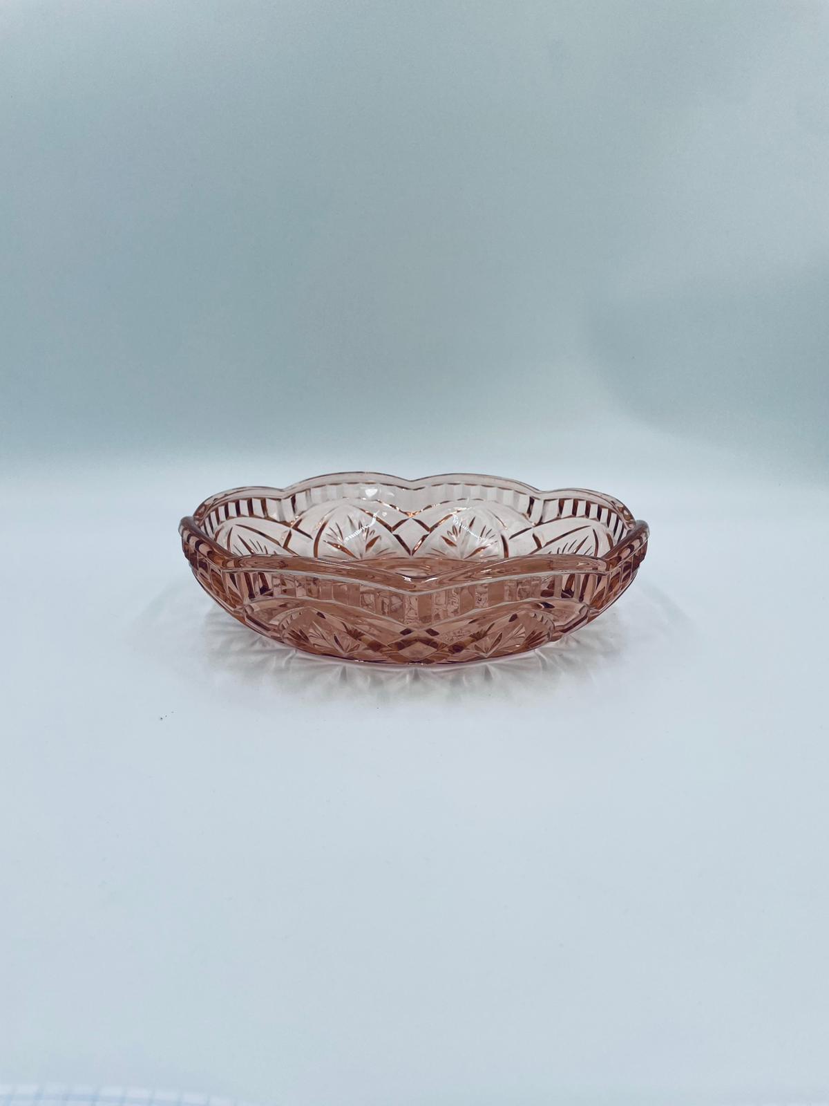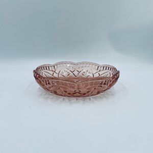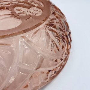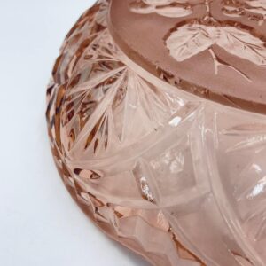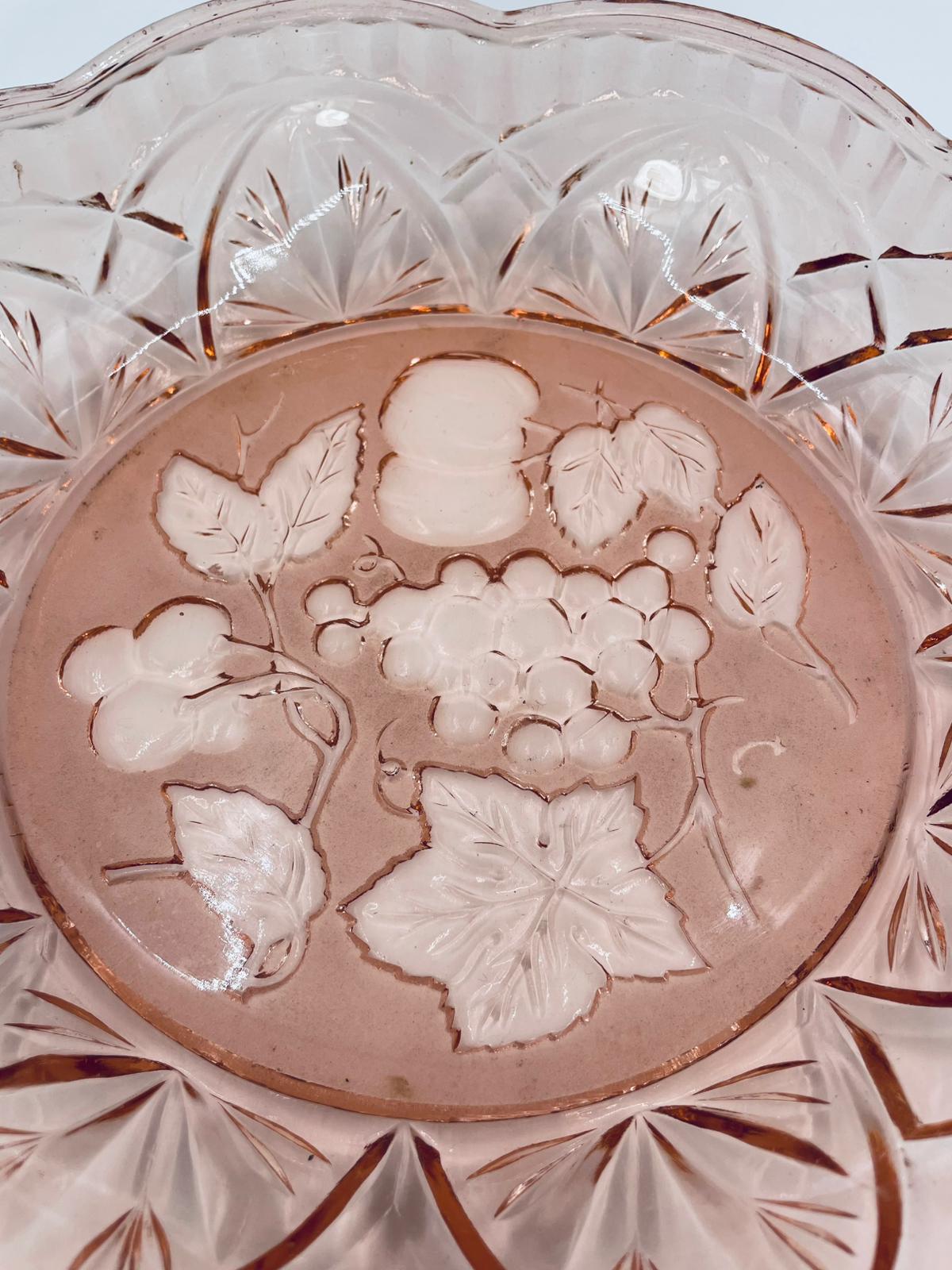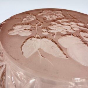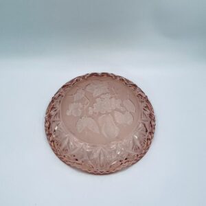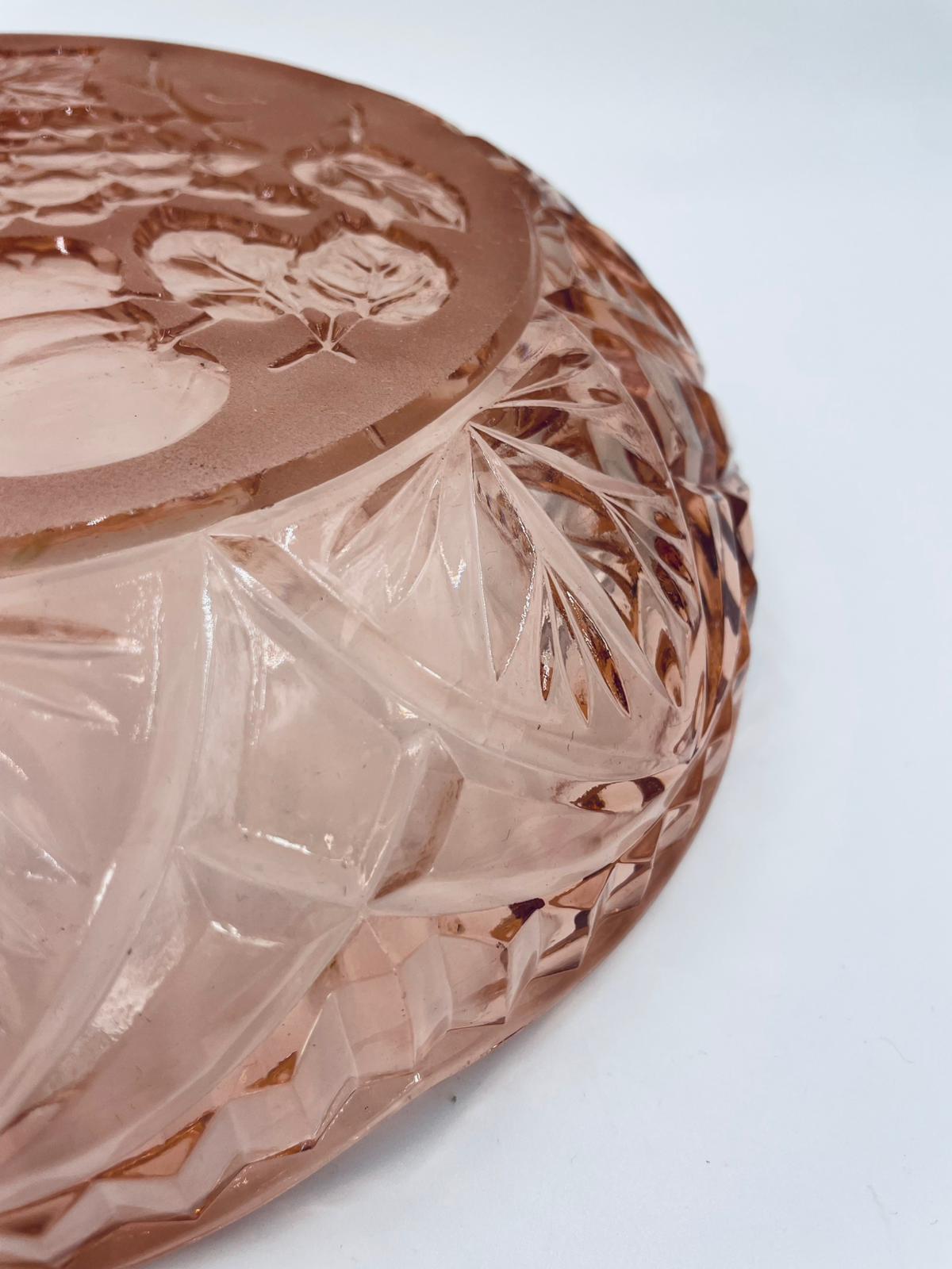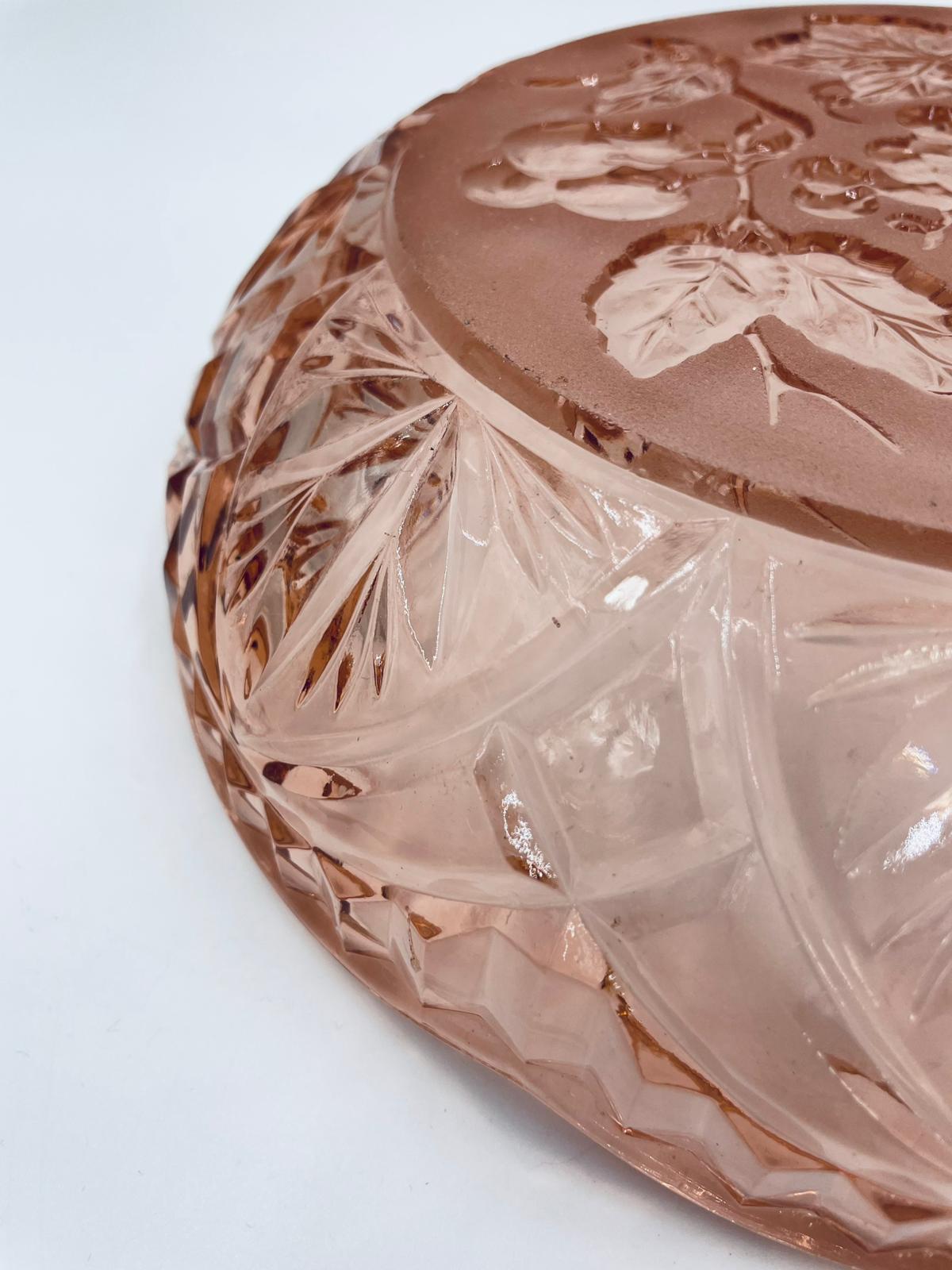 Misa dekoracyjna „Granada” wyprodukowana przez Veb Sachsenglas, wykonana z wysokiej jakości szkła w kolorze rozalinowym. Misa charakteryzuje się dekoracyjnym tłoczonym wzorem winogron i liści na dnie naczynia oraz falistym brzegiem.