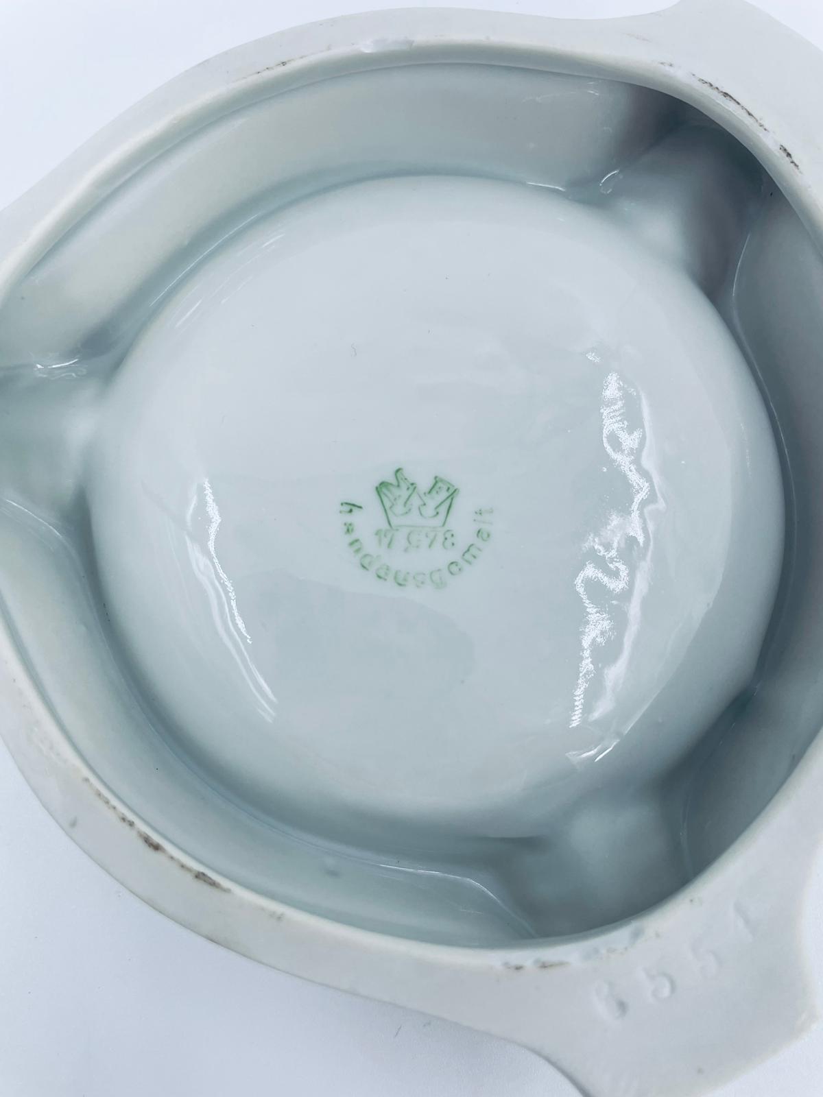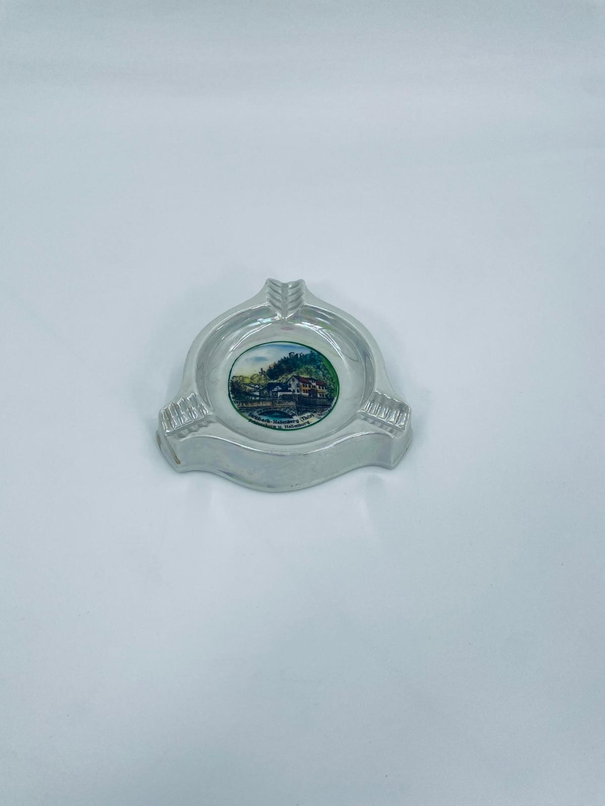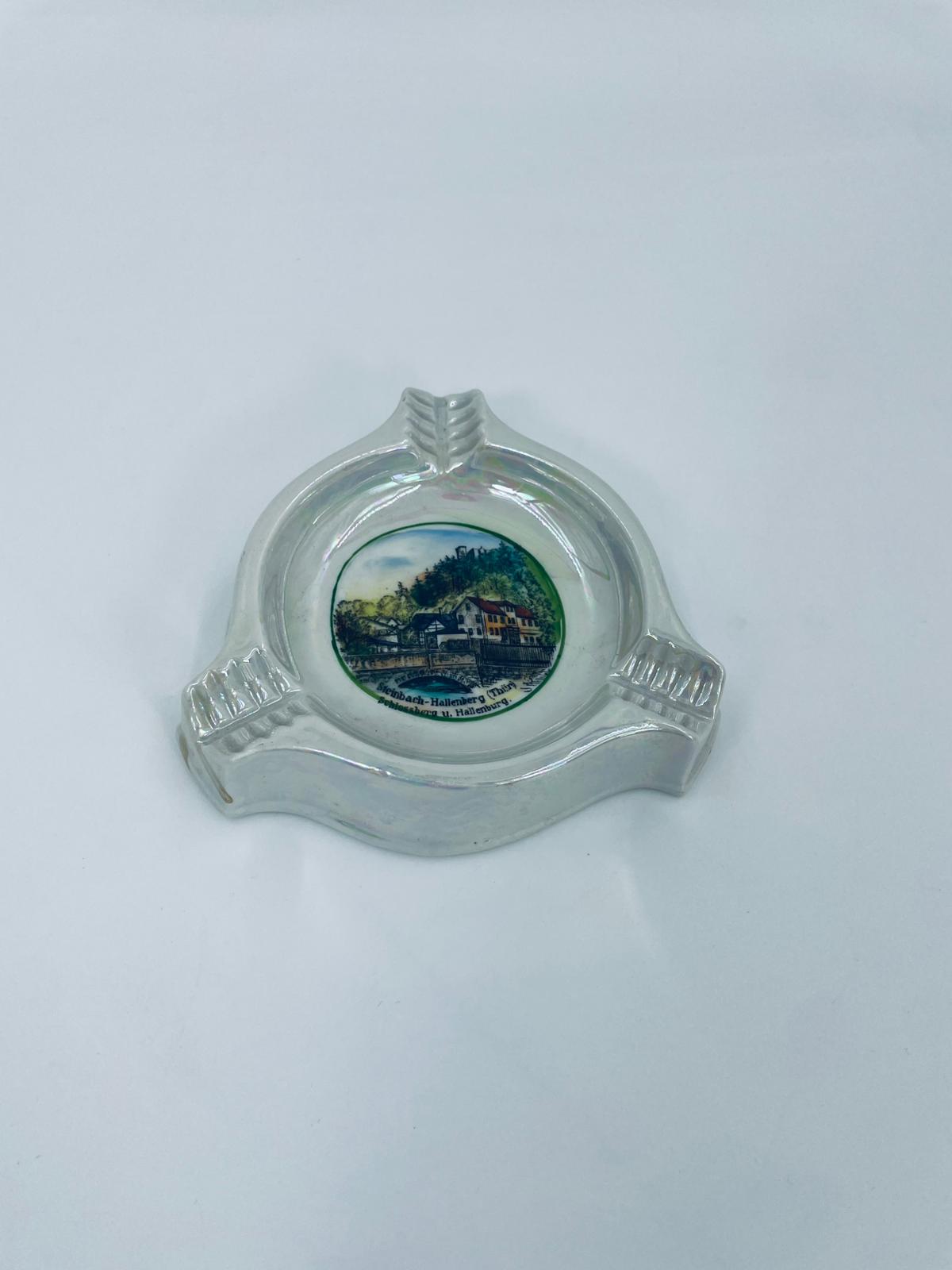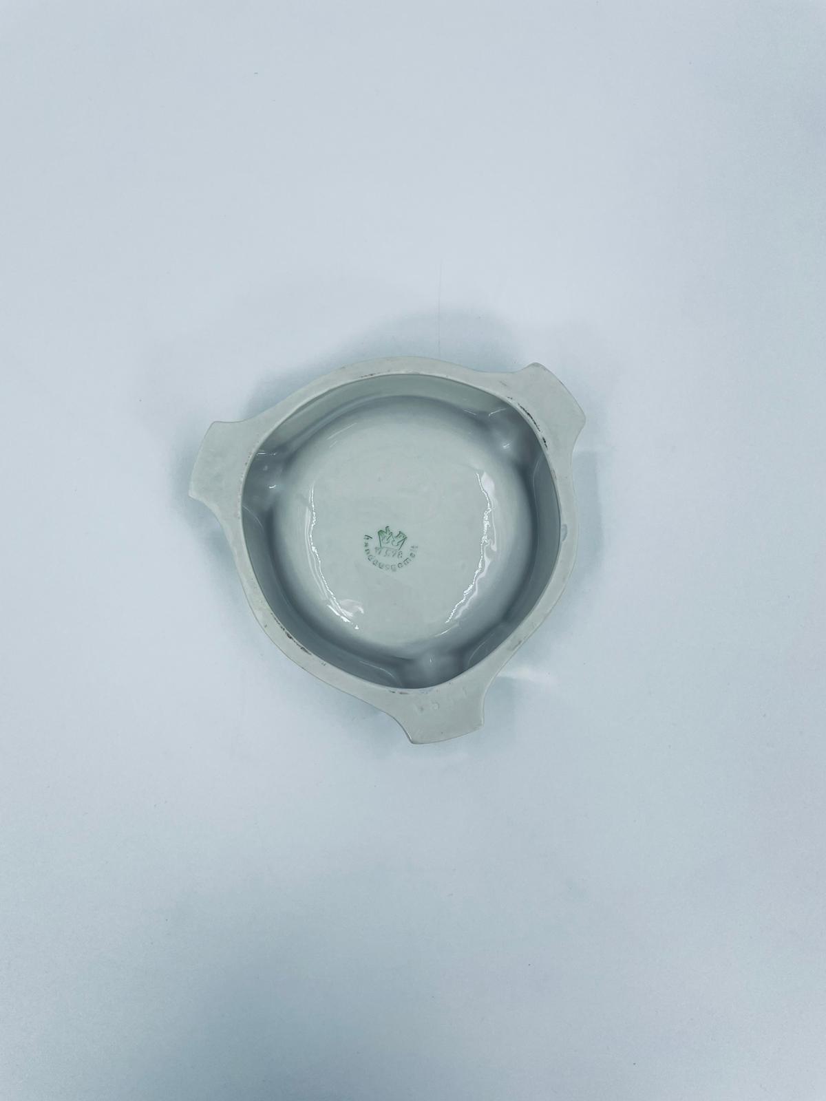 Misa dekoracyjna Handausgemalt, wykonana z porcelany w kolorze perłowym. Przedmiot ma trójkątny kształt z zaokrąglonymi rogami i trzema wgłębieniami, w centralnej części znajduje się krajobraz miejski z budynkami i mostem. Przedmiot może służyć jako popielnica.