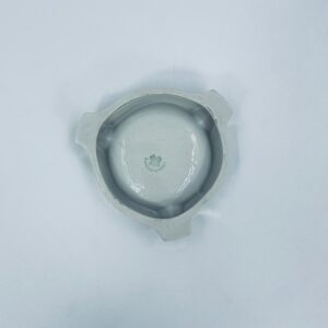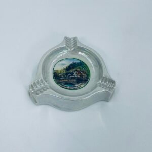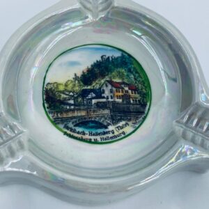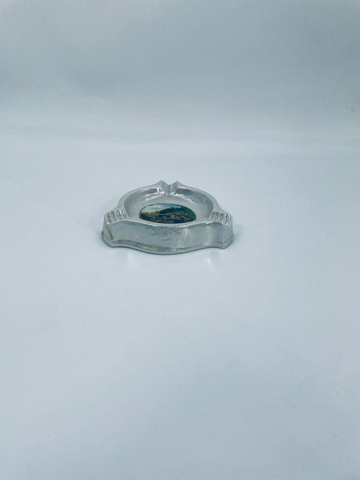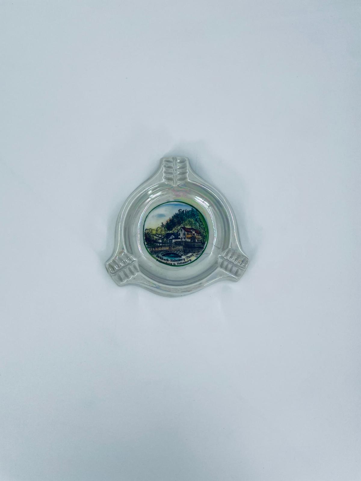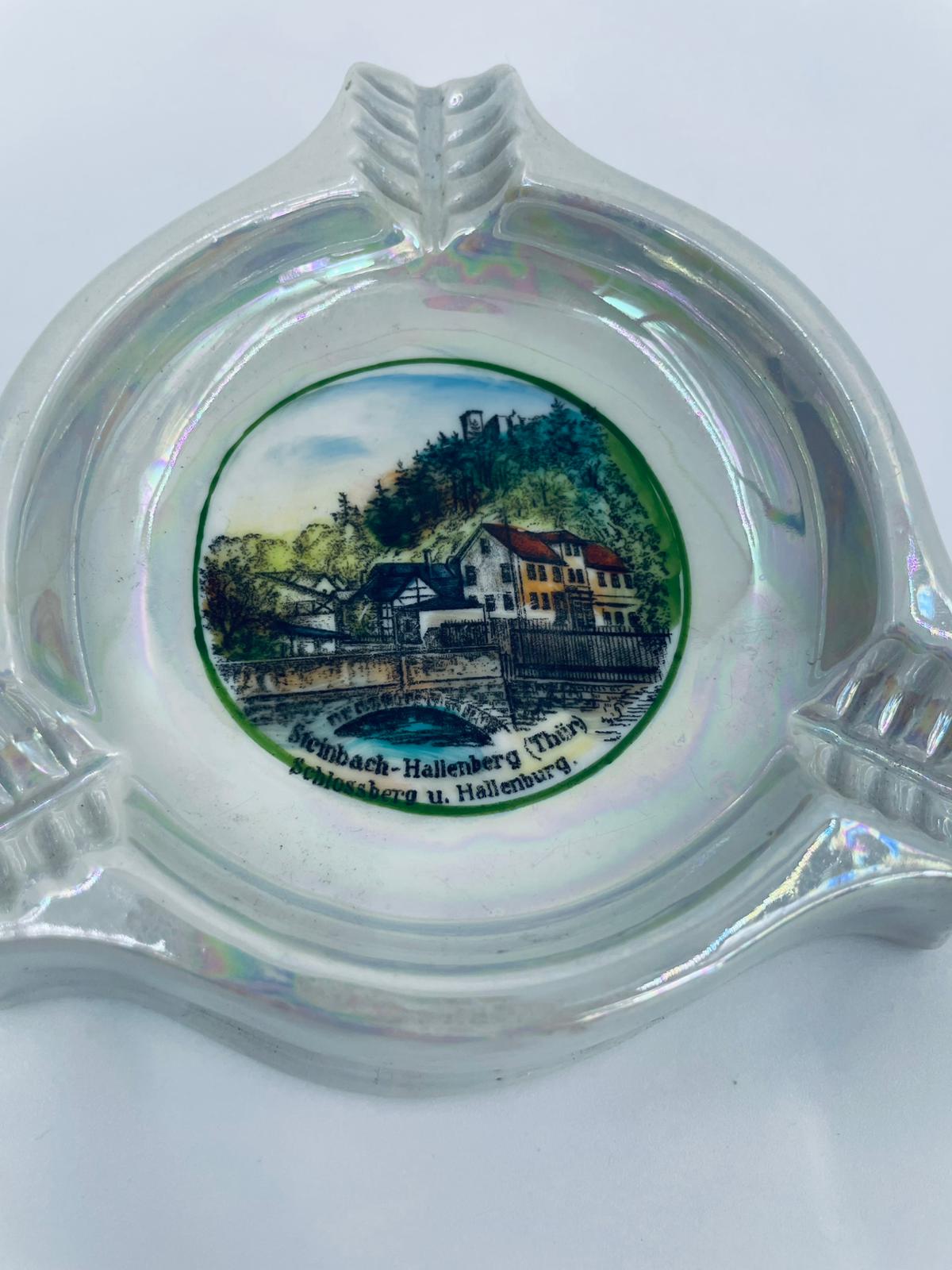 Misa dekoracyjna Handausgemalt, wykonana z porcelany w kolorze perłowym. Przedmiot ma trójkątny kształt z zaokrąglonymi rogami i trzema wgłębieniami, w centralnej części znajduje się krajobraz miejski z budynkami i mostem. Przedmiot może służyć jako popielnica.