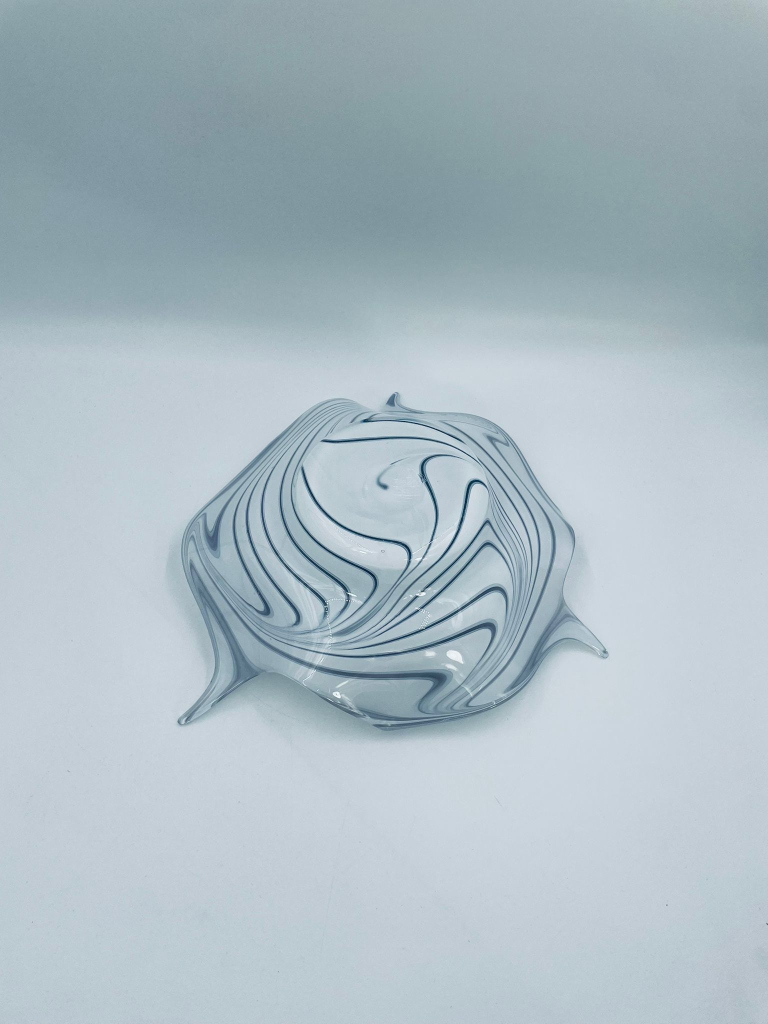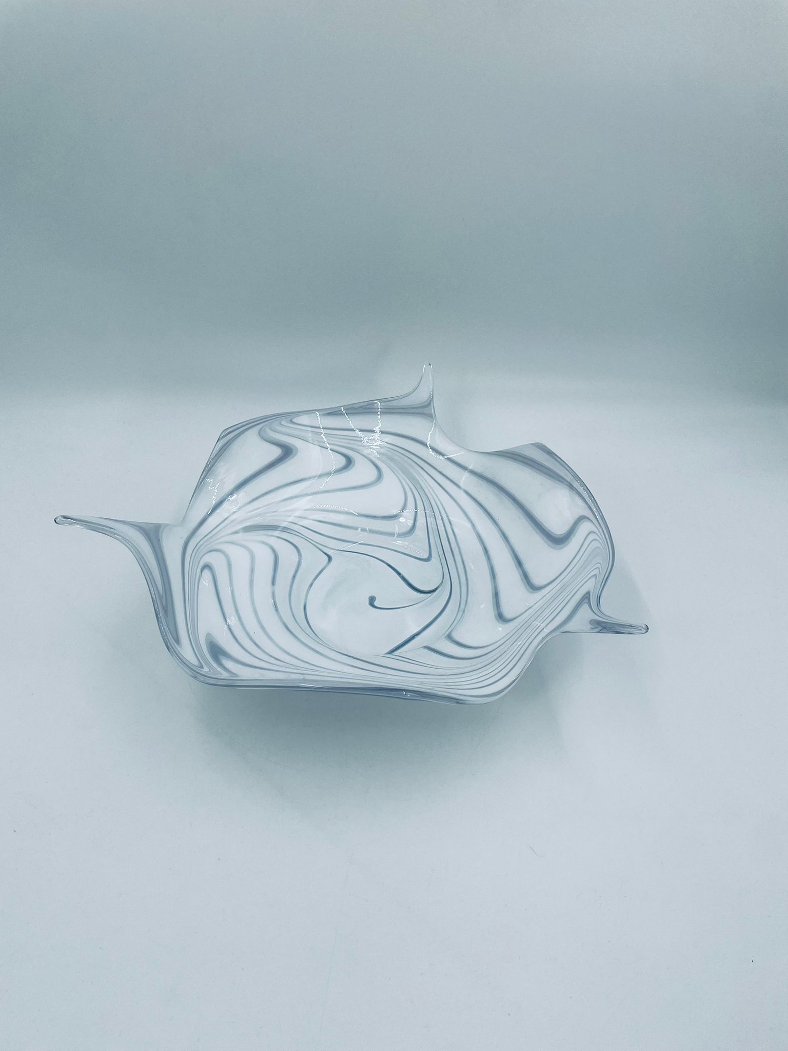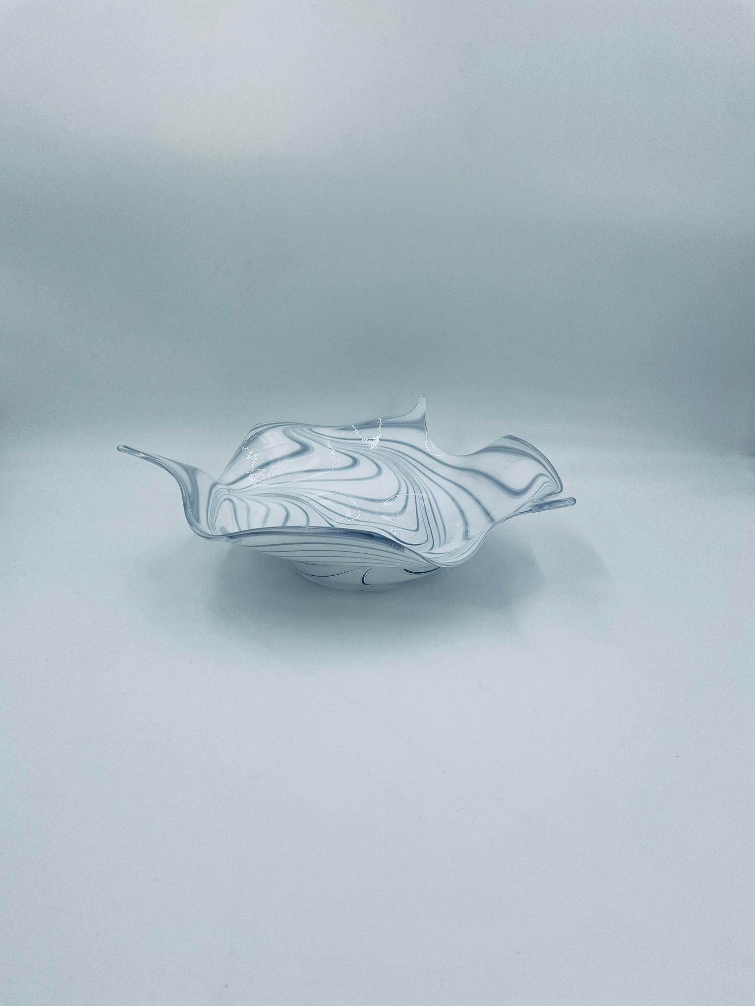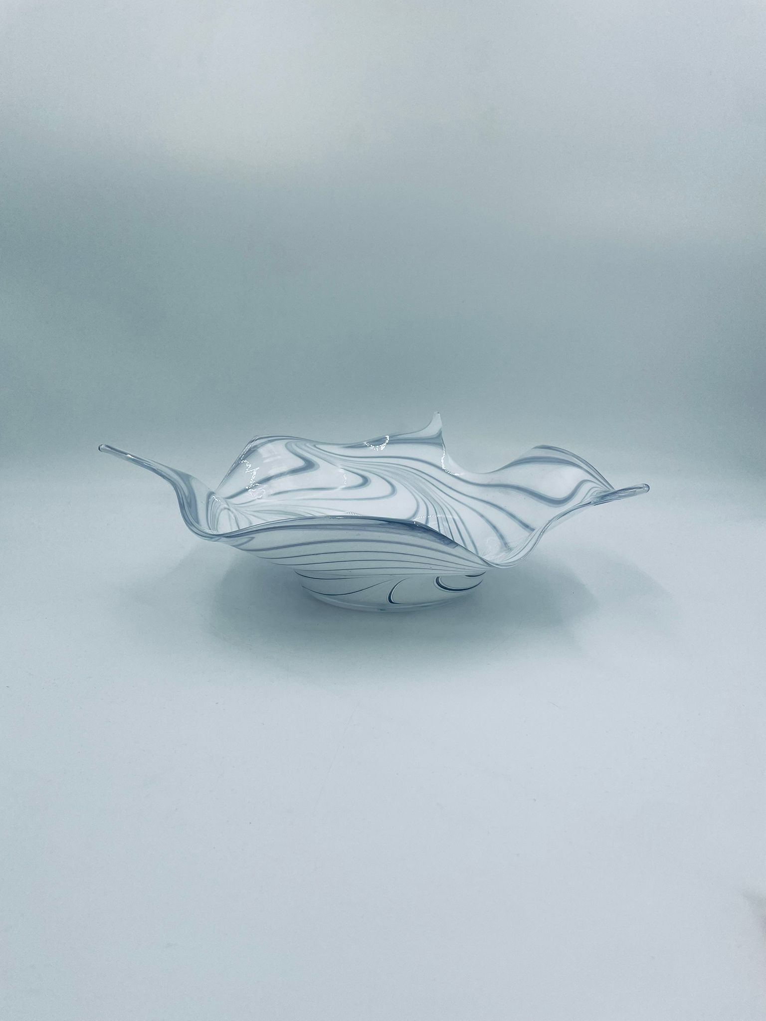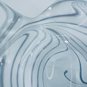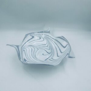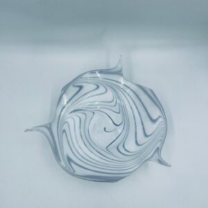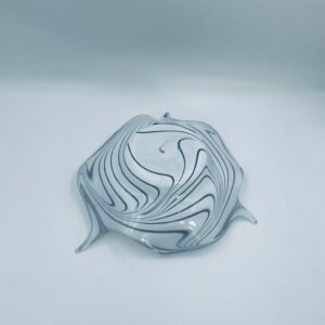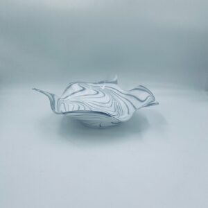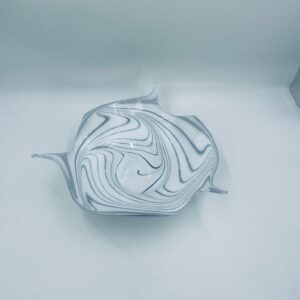 Misa dekoracyjna owoce w stylu Vintage, wykonana z wysokie jakości szkła artystycznego. Misa charakteryzuje się falistym, nieregularnym brzegiem oraz wirującym wzorem w szaro białym kolorze.