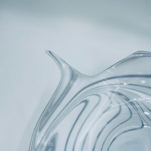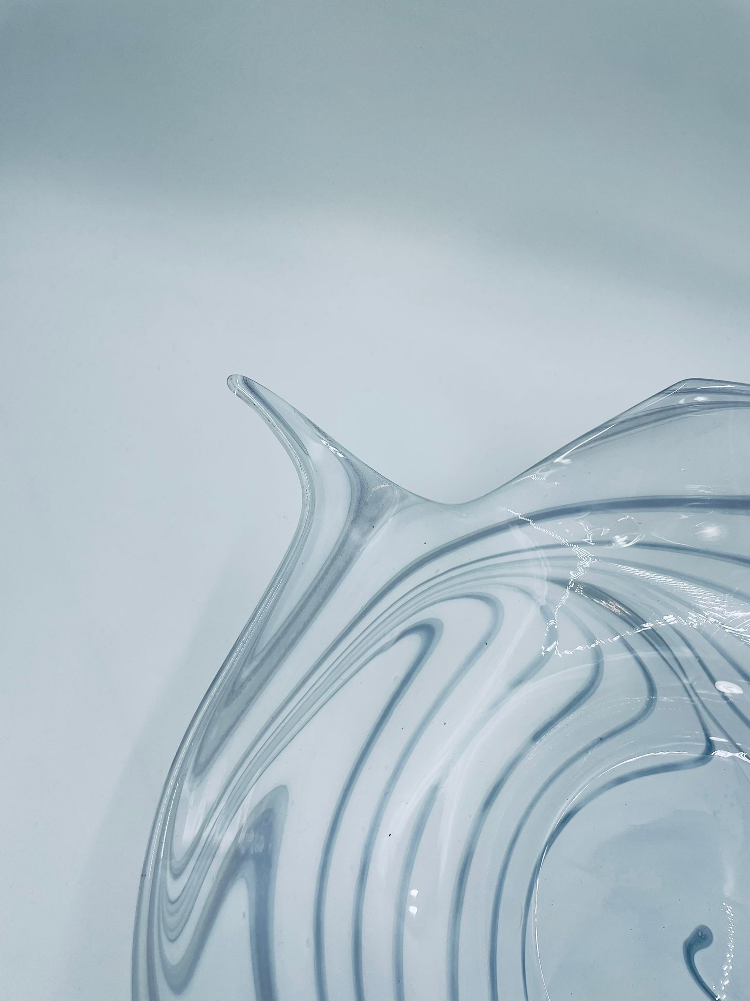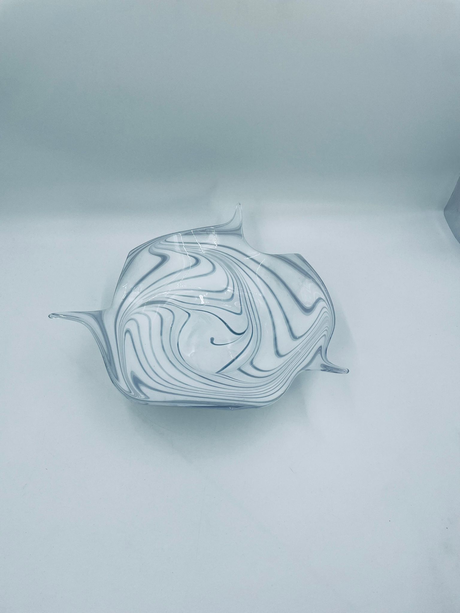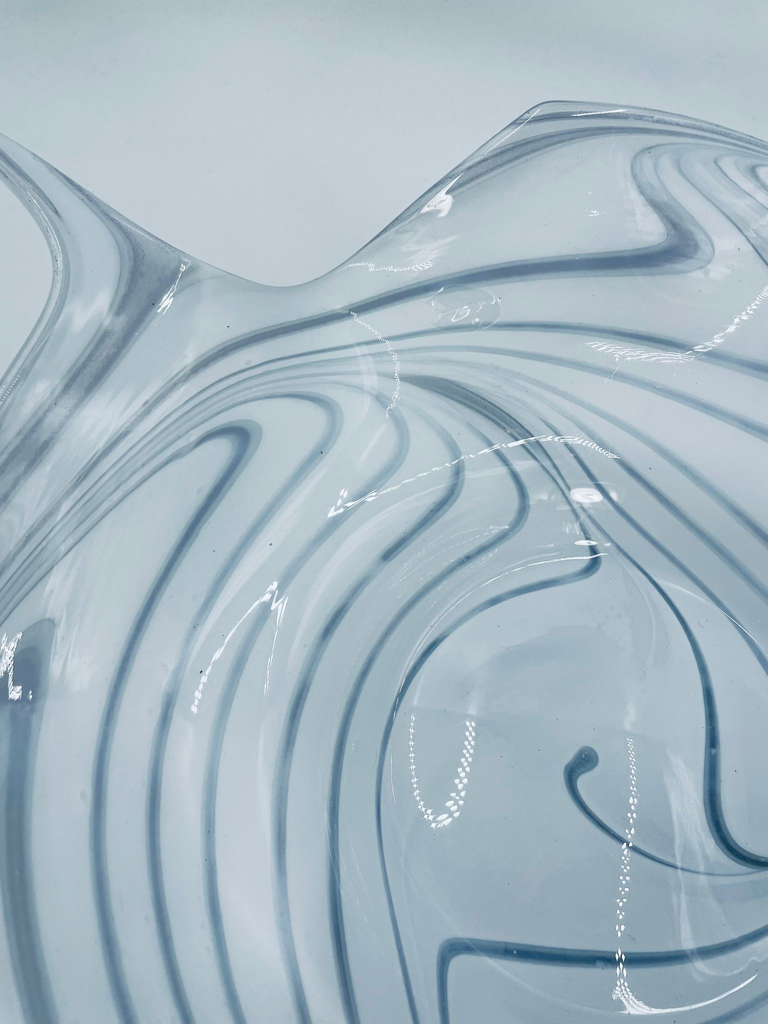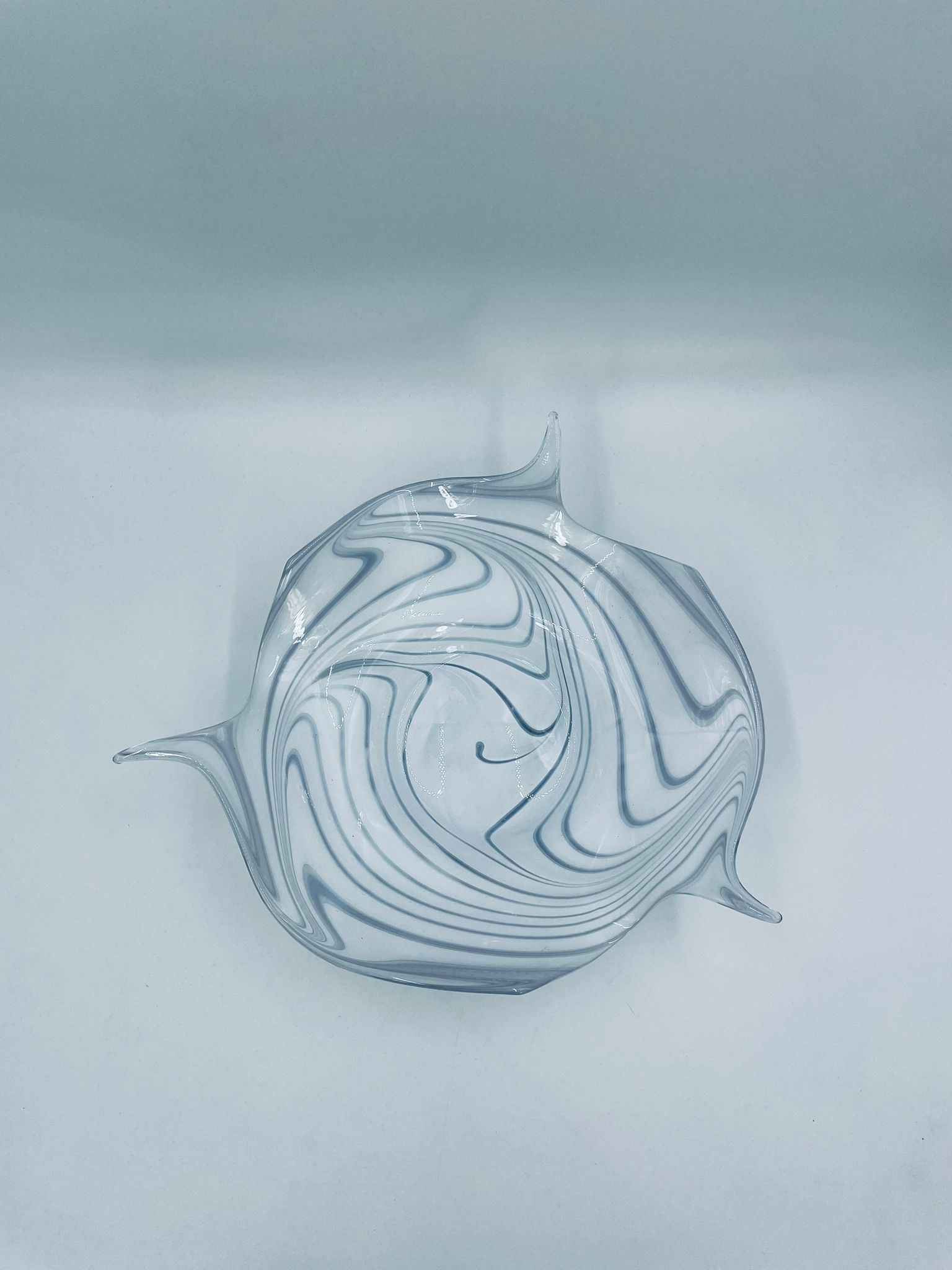Misa dekoracyjna owoce w stylu Vintage, wykonana z wysokie jakości szkła artystycznego. Misa charakteryzuje się falistym, nieregularnym brzegiem oraz wirującym wzorem w szaro białym kolorze.
