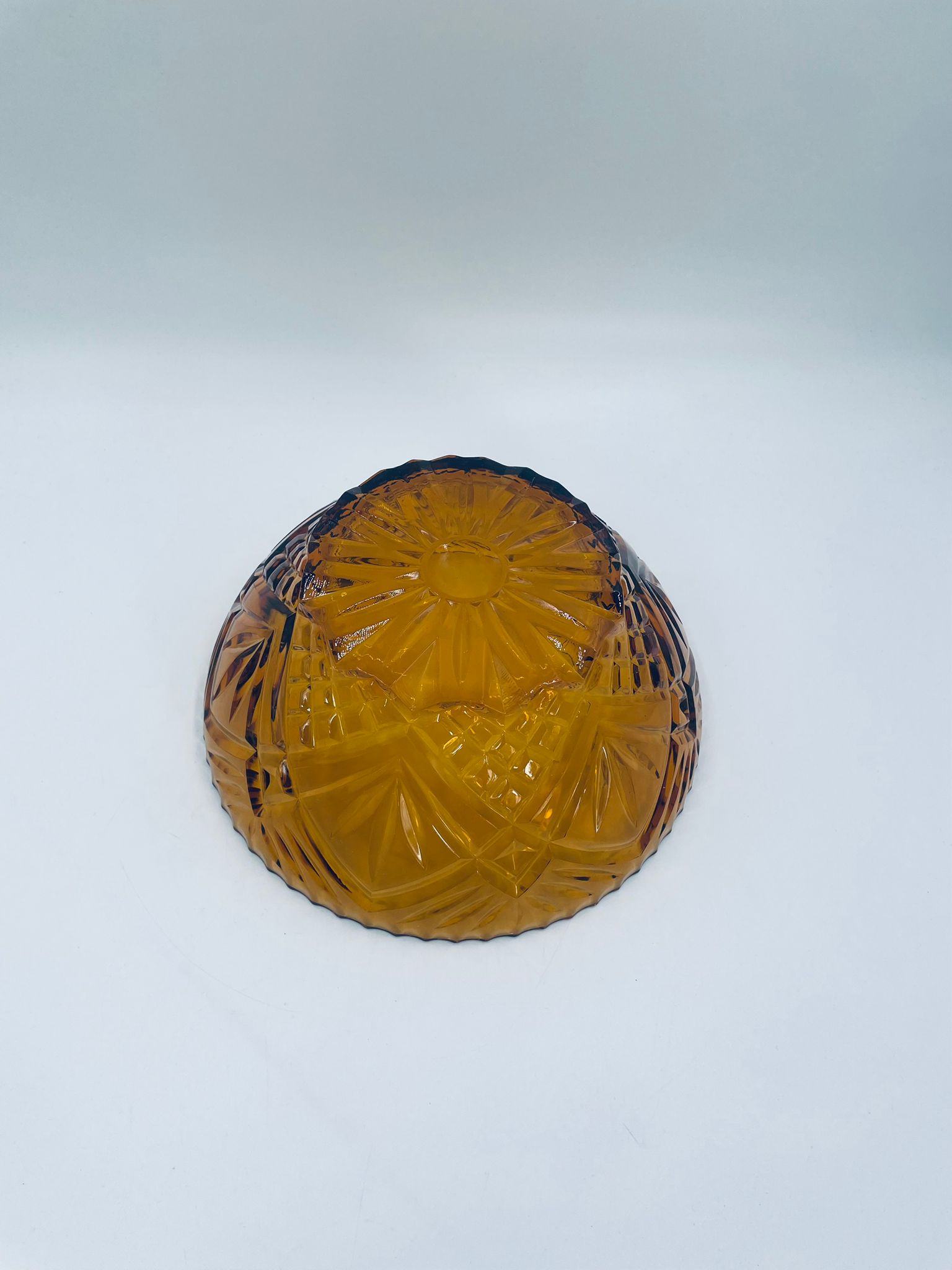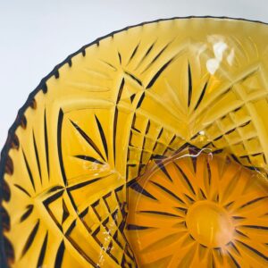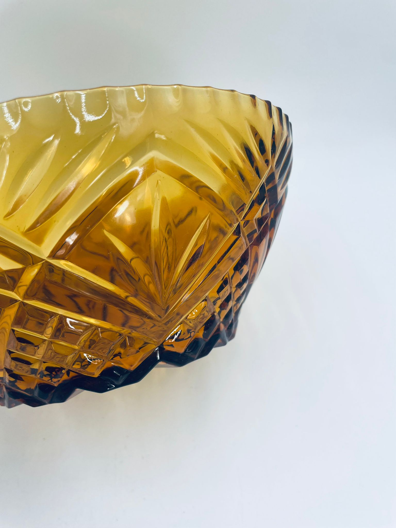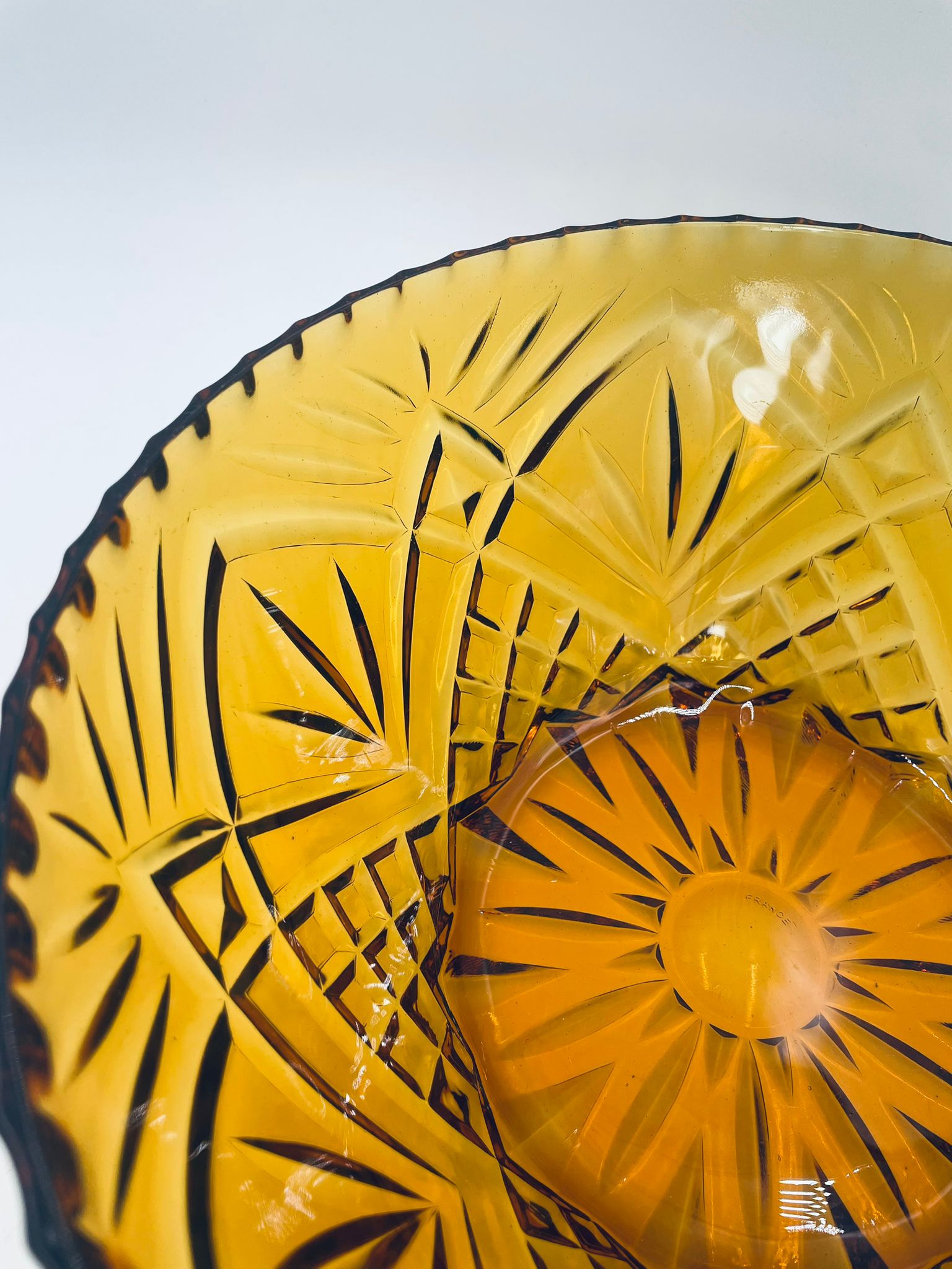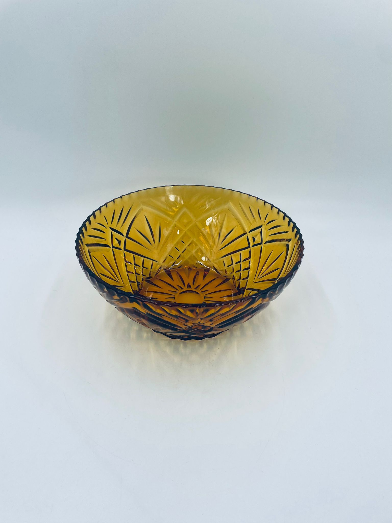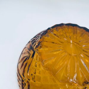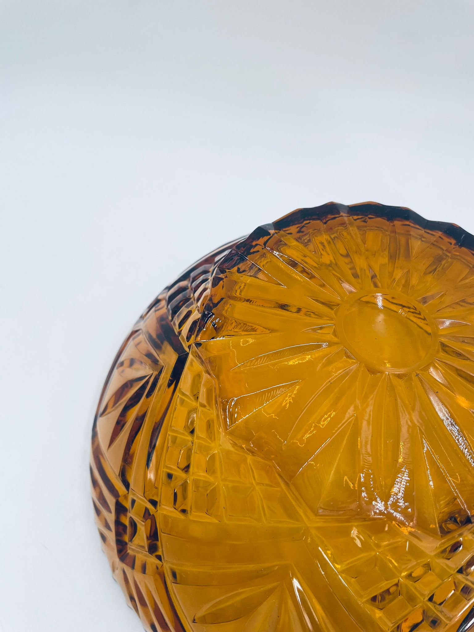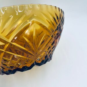 Misa dekoracyjna pochodząca z Francuskiej huty szkła z lat 60tych, w stylu Vintage, wykonana z wysokie jakości szkła kryształowego. Misa w bursztynowym kolorze, charakteryzuje się bogatymi, recznie szlifowanymi, geometrycznymi zdobieniami.