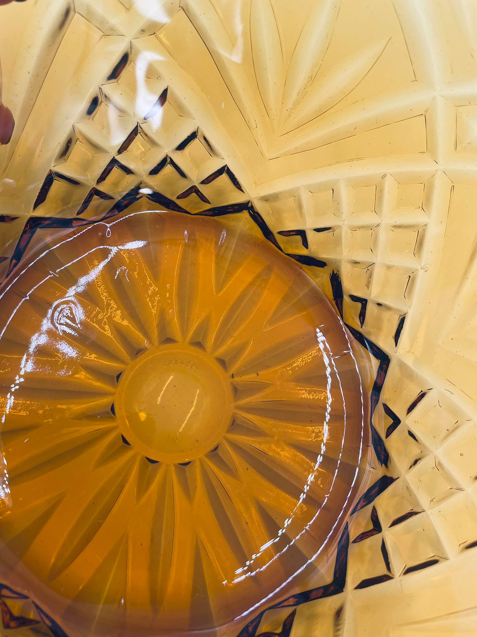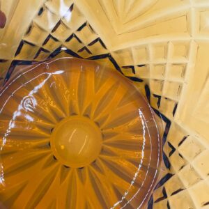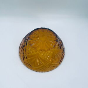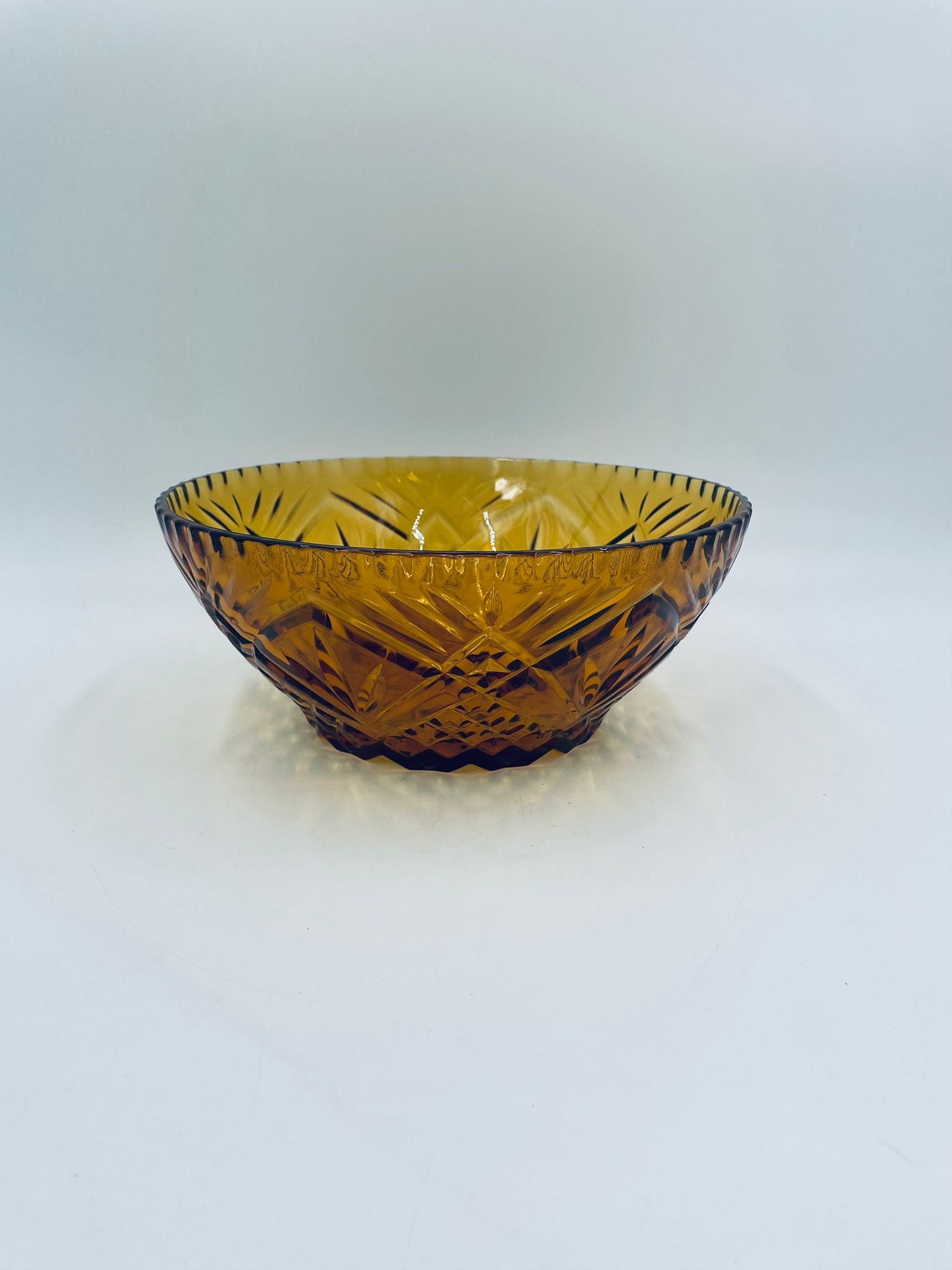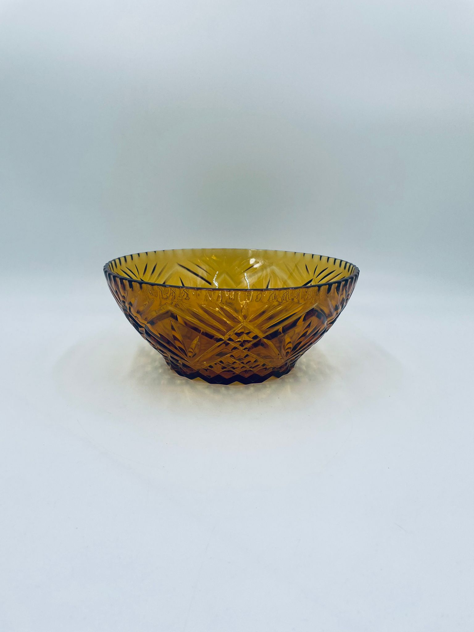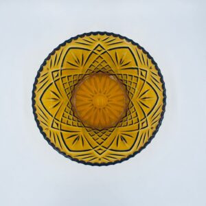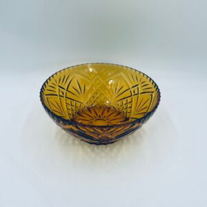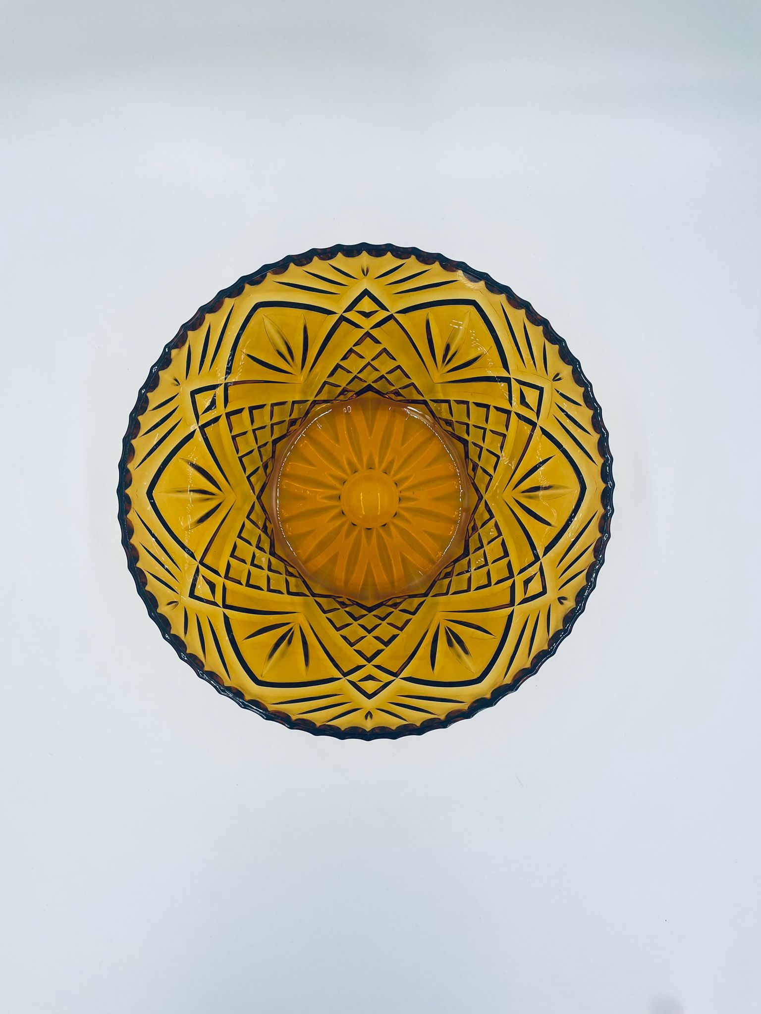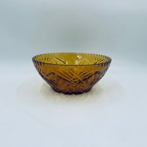 Misa dekoracyjna pochodząca z Francuskiej huty szkła z lat 60tych, w stylu Vintage, wykonana z wysokie jakości szkła kryształowego. Misa w bursztynowym kolorze, charakteryzuje się bogatymi, recznie szlifowanymi, geometrycznymi zdobieniami.