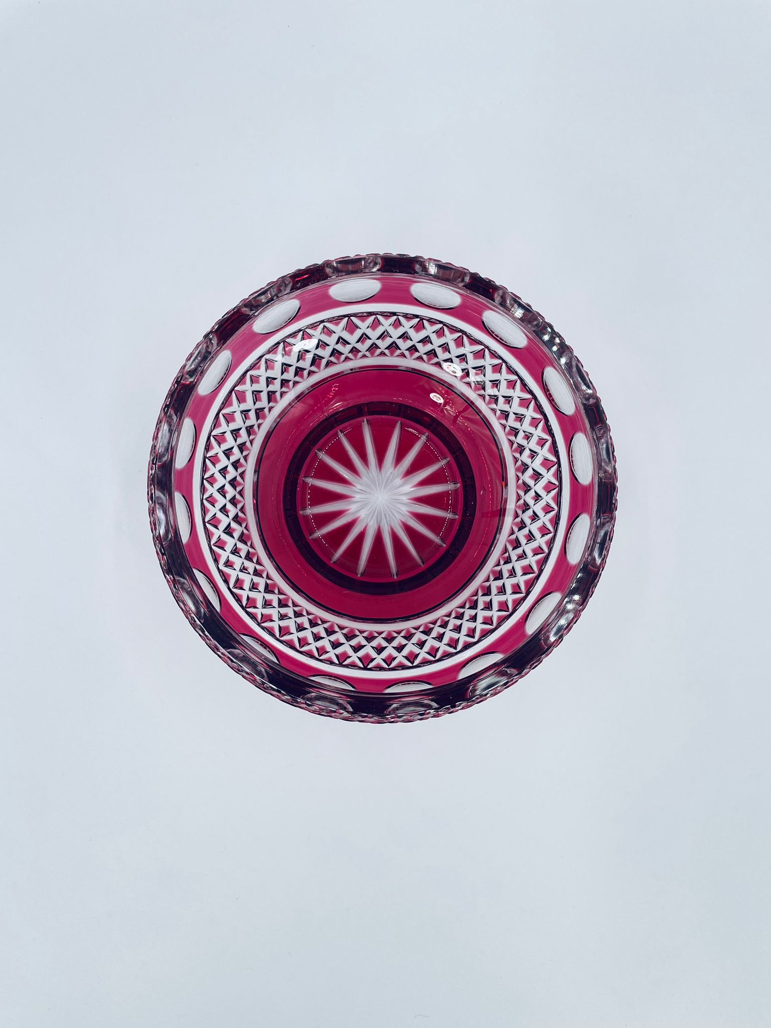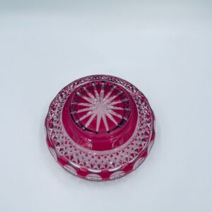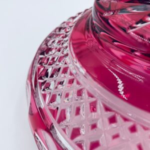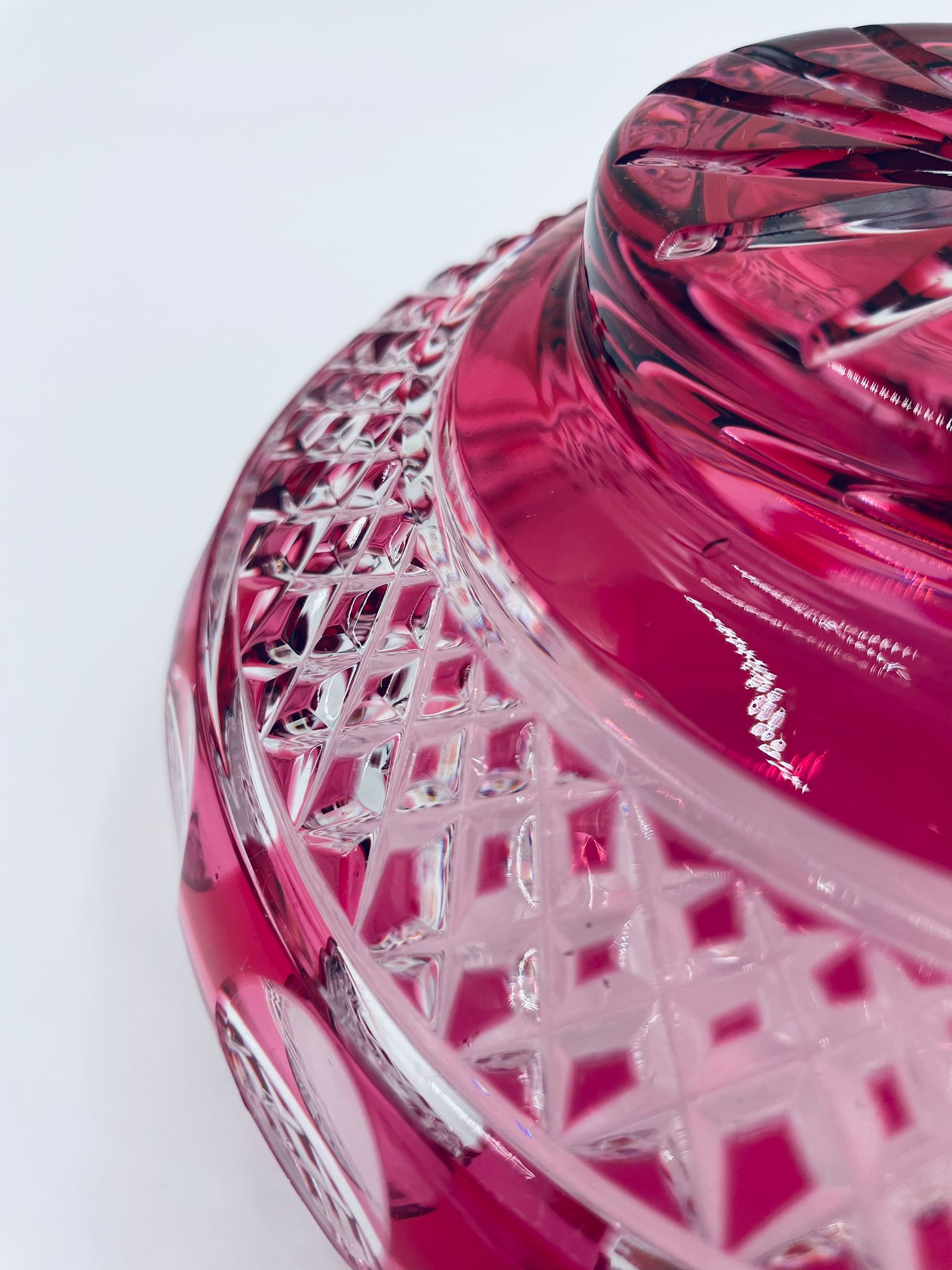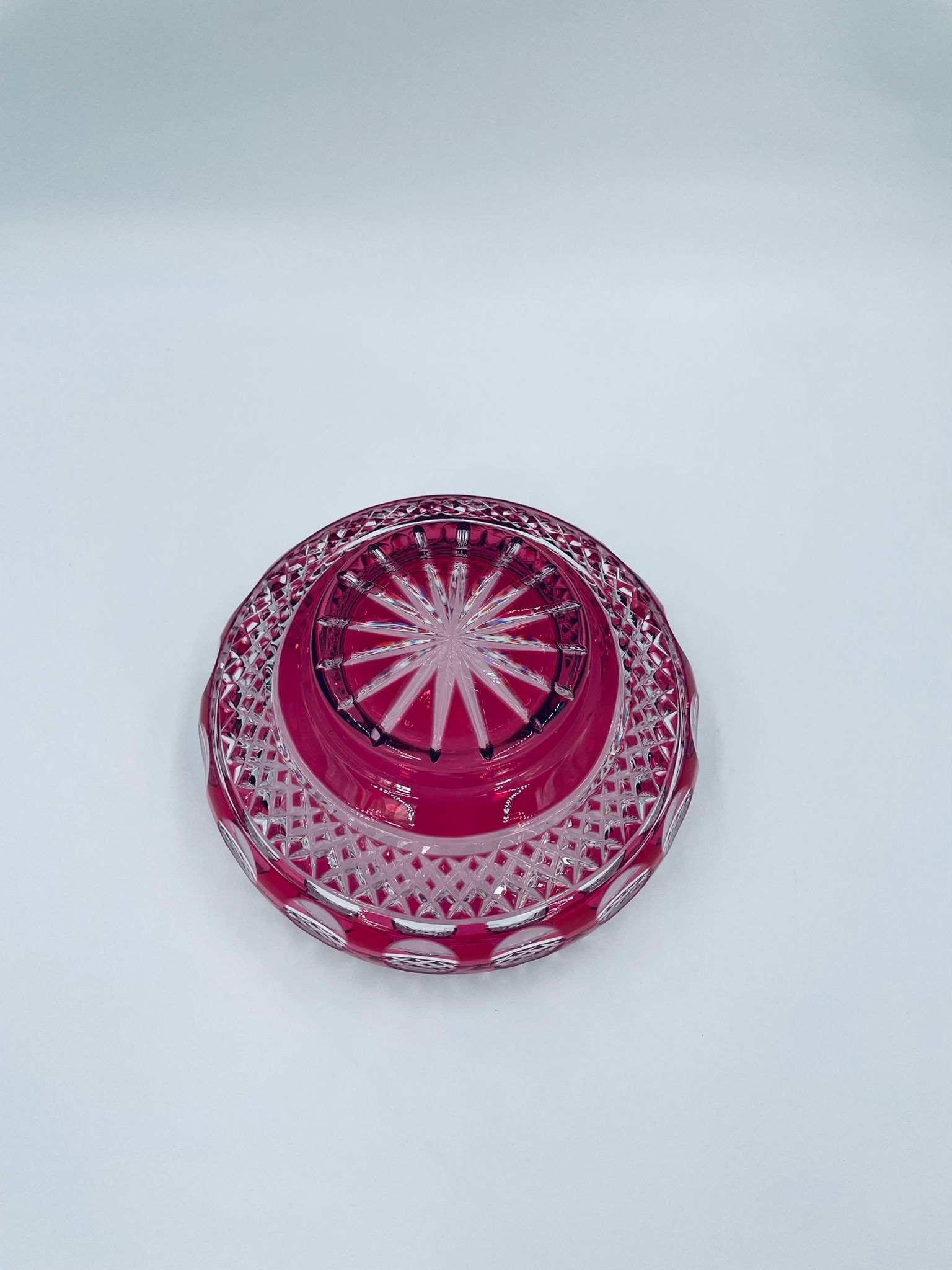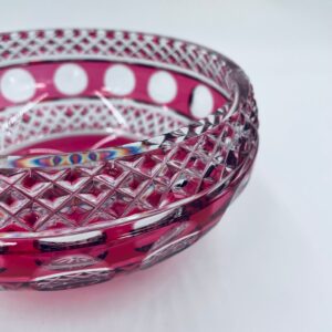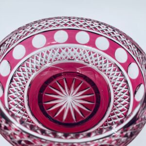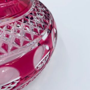 Misa dekoracyjna wytwórni Val Saint Lambert z lat 1950-1960, wykonana z wysokiej jakości kryształu. Misa barwiona w masie na kolor rubinowy, ozdobiona fasetowanymi , diamentowymi szlifami.
