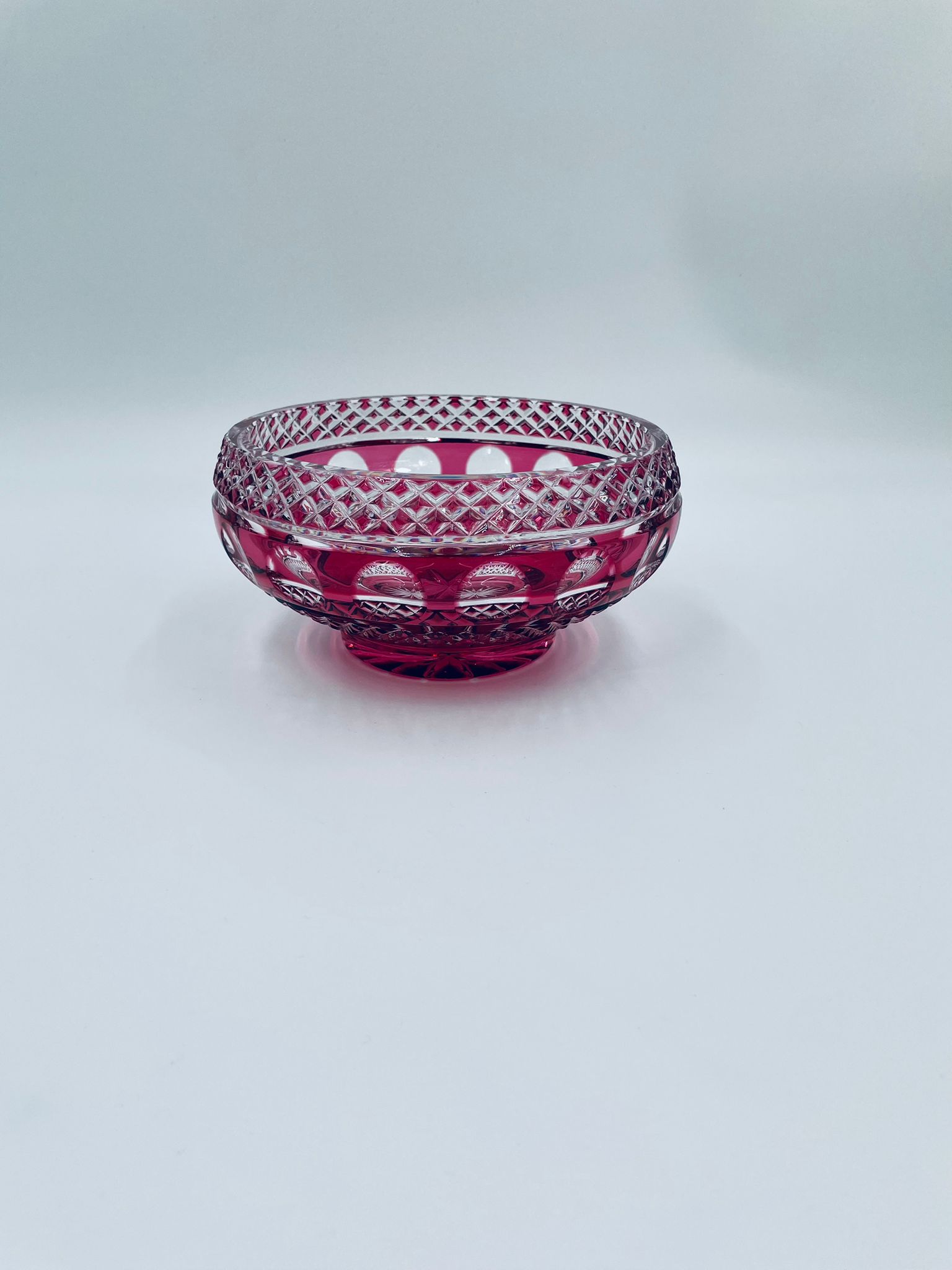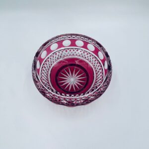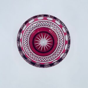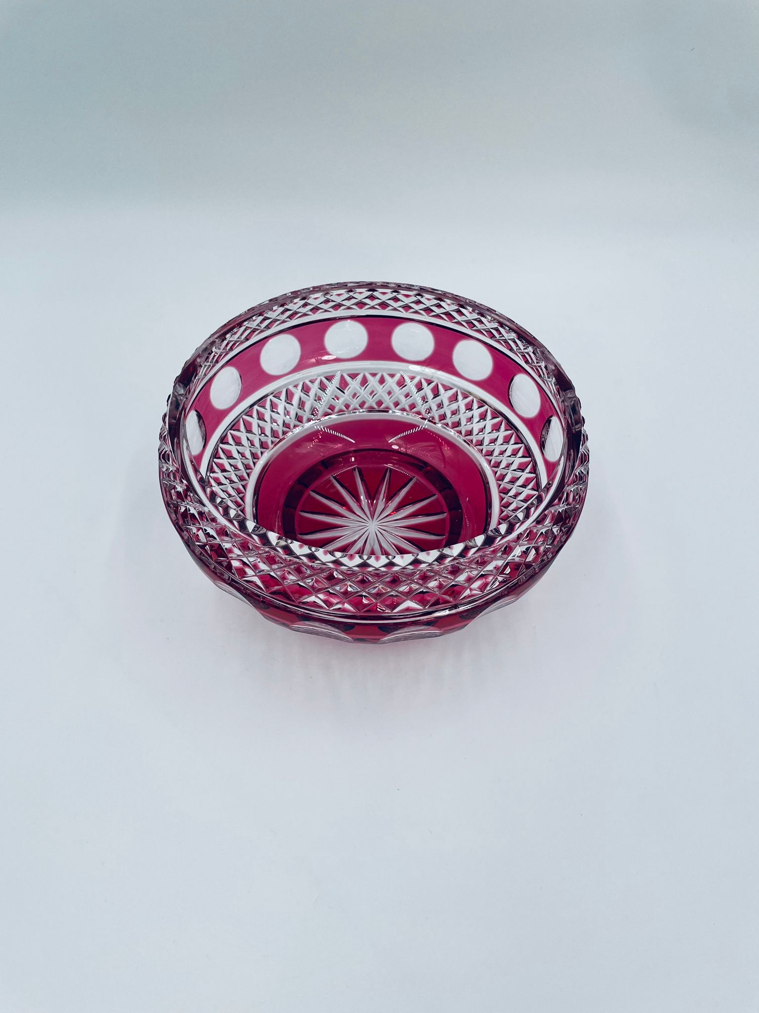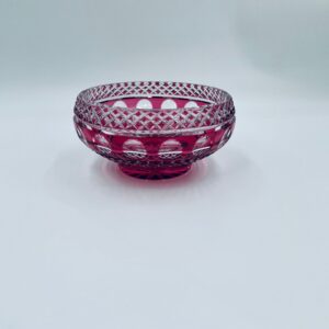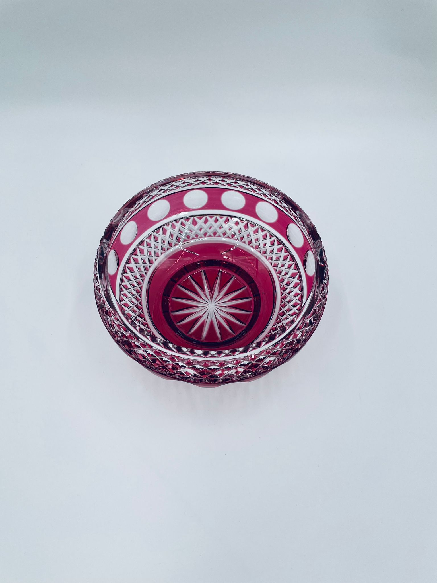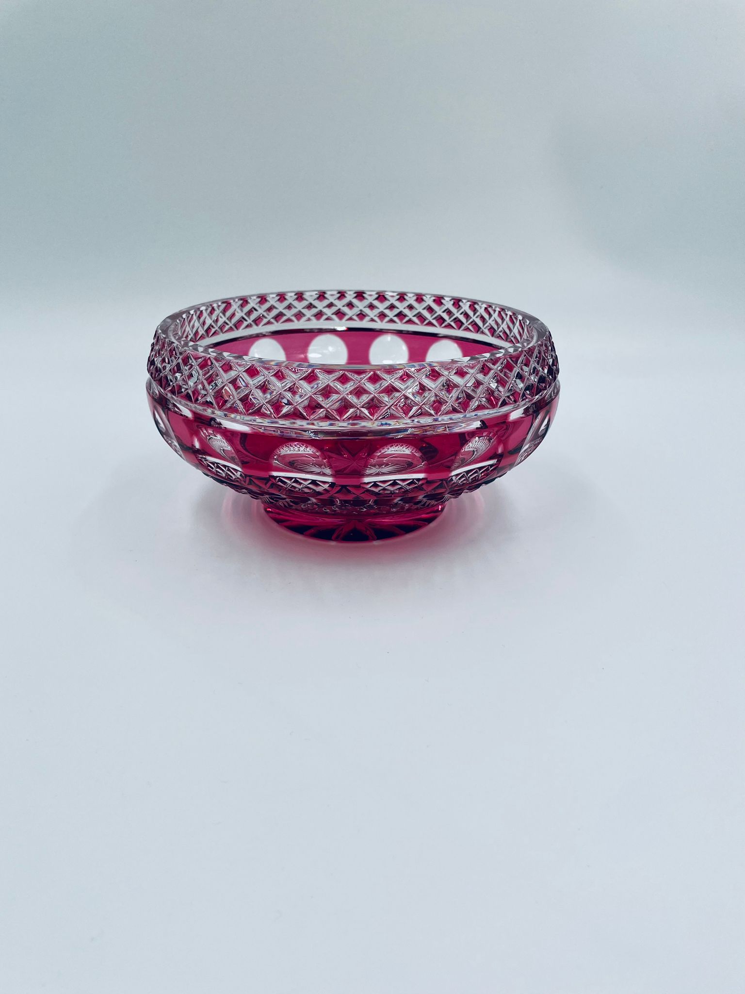 Misa dekoracyjna wytwórni Val Saint Lambert z lat 1950-1960, wykonana z wysokiej jakości kryształu. Misa barwiona w masie na kolor rubinowy, ozdobiona fasetowanymi , diamentowymi szlifami.