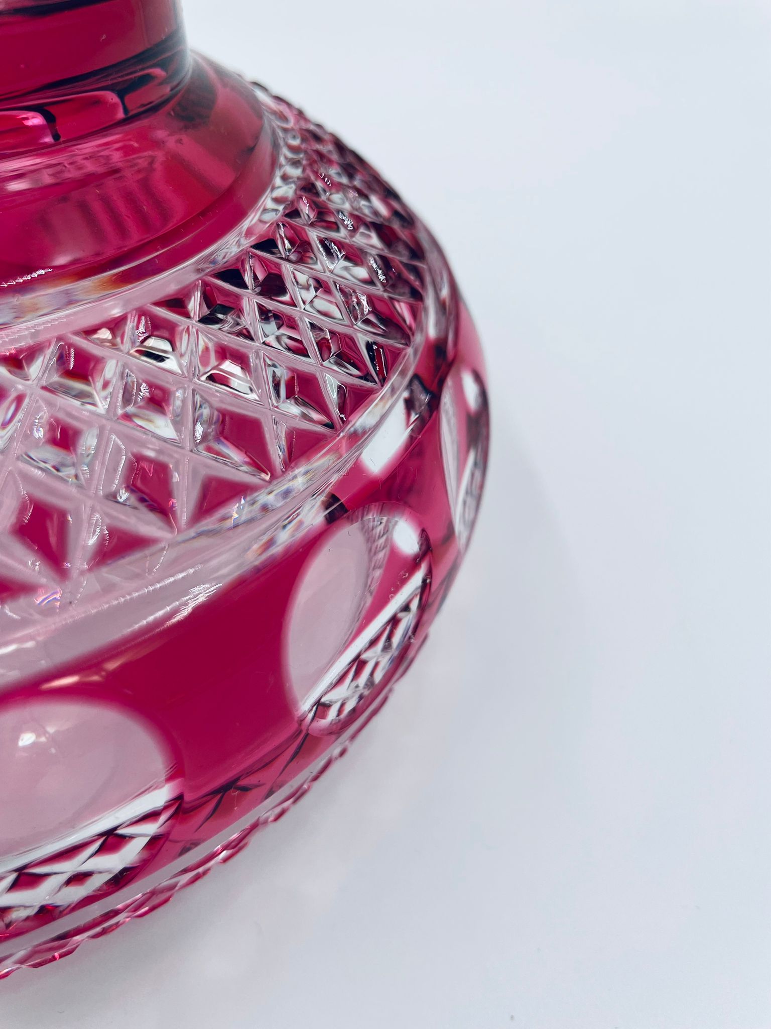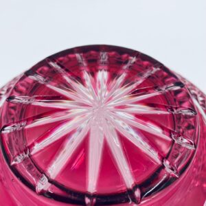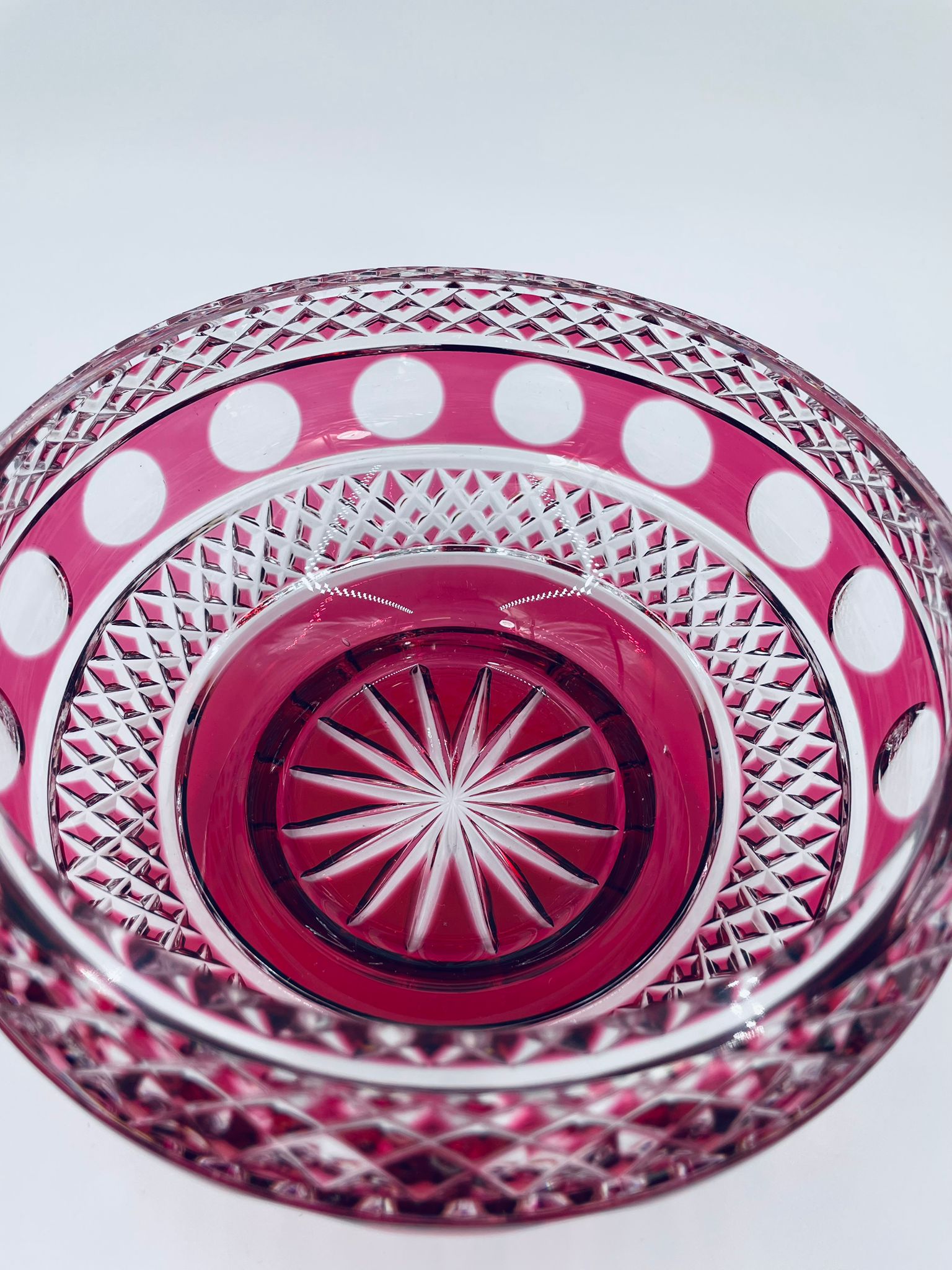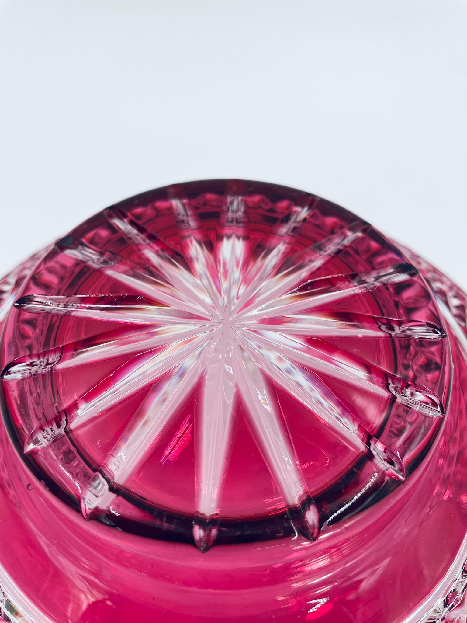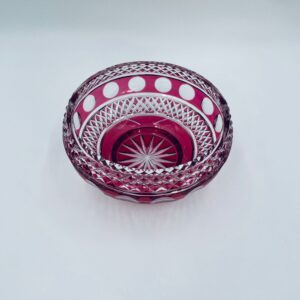 Misa dekoracyjna wytwórni Val Saint Lambert z lat 1950-1960, wykonana z wysokiej jakości kryształu. Misa barwiona w masie na kolor rubinowy, ozdobiona fasetowanymi , diamentowymi szlifami.
