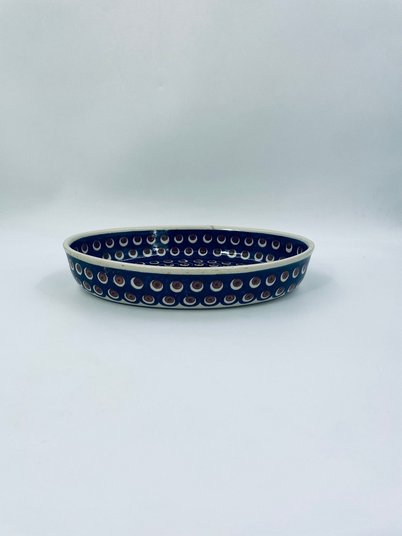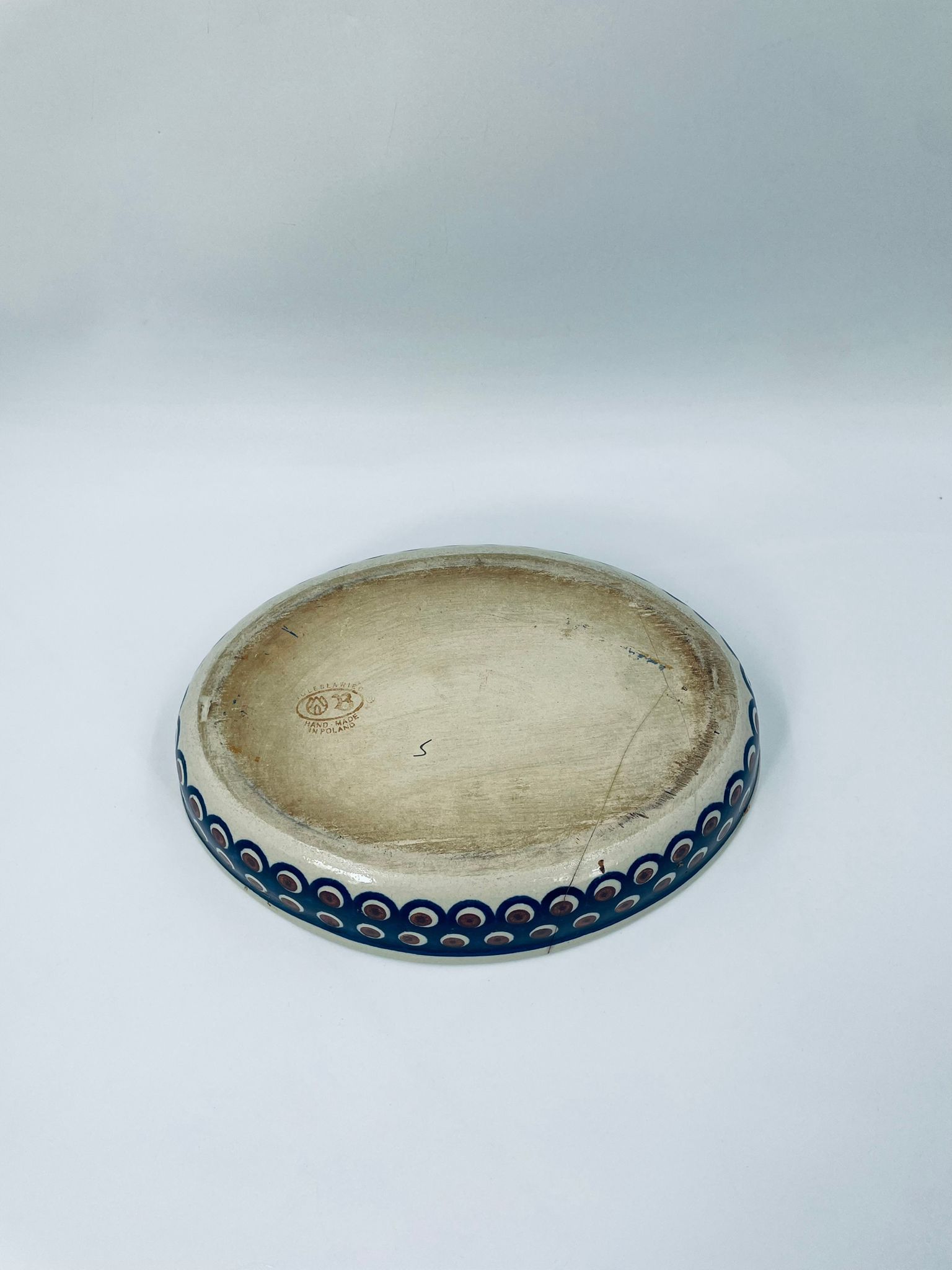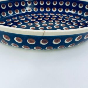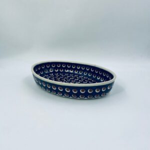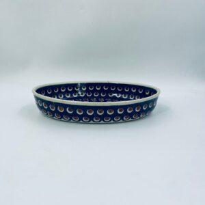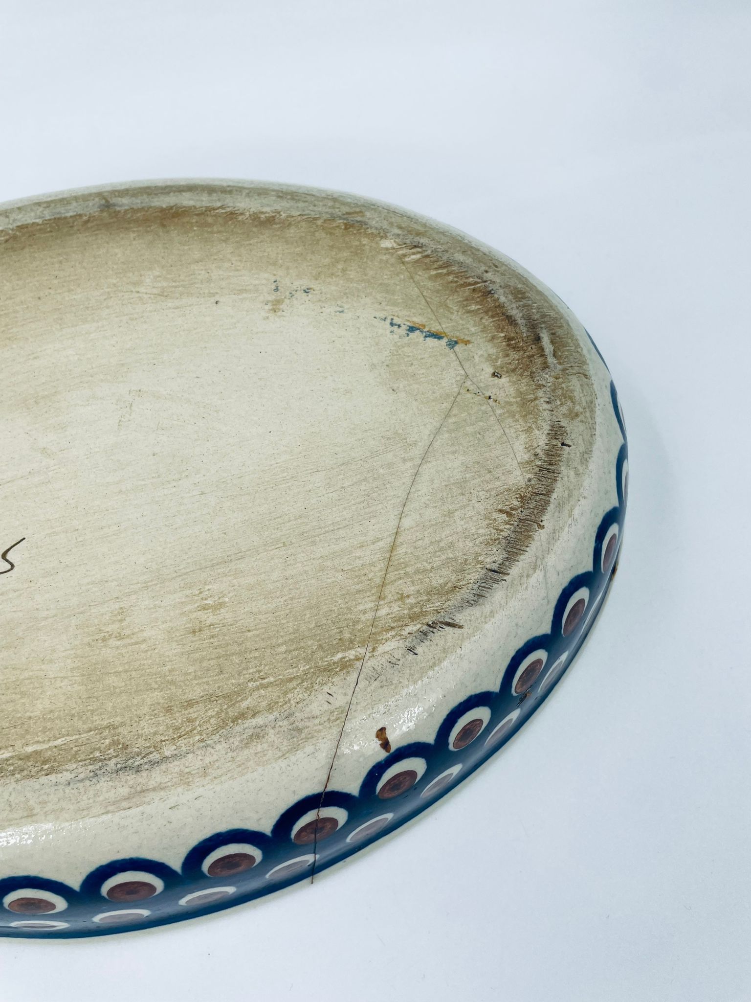 Misa Polskiej wytwórni Bolesławiec, wykonana z najwyższej jakości ceramiki. Misa owalna, ręcznie robiona, ozdobiona jest ręcznie malowanym, tradycyjnym wzorem pawiego oczka. Wzory na Bolesławieckiej ceramice naniesione są metodą stempelkową oraz pędzlem. Misa posiada pęknięcie.