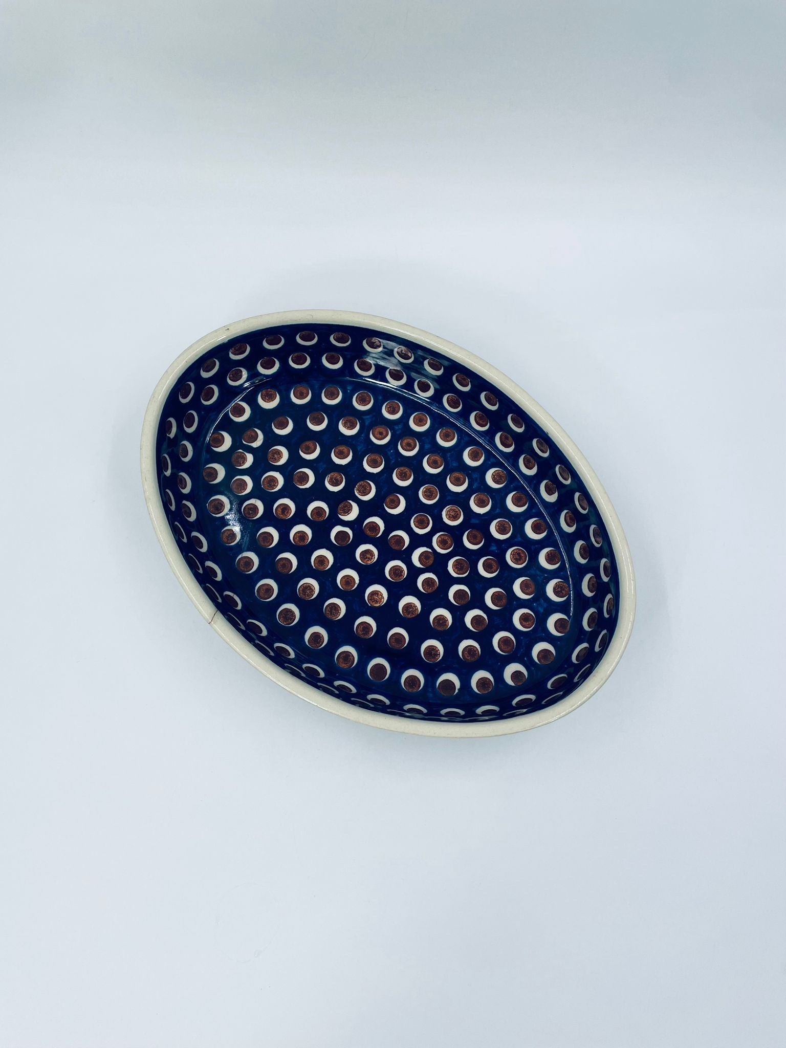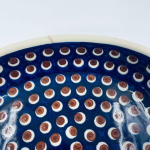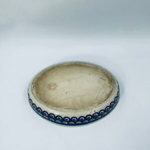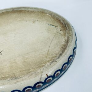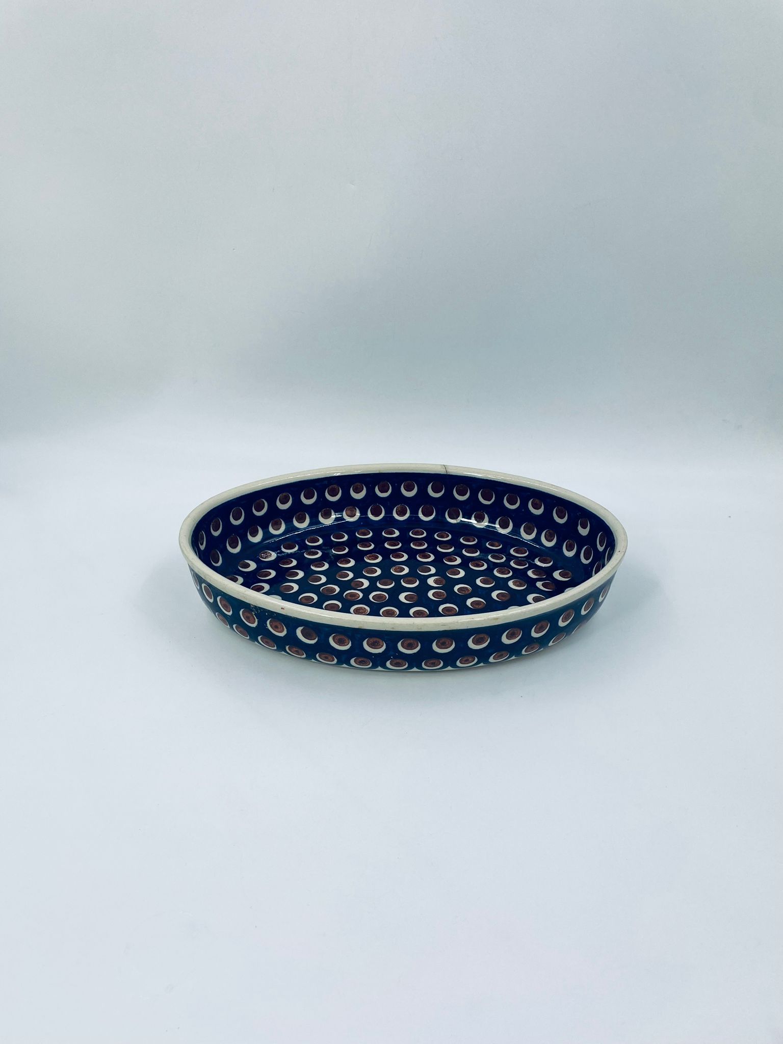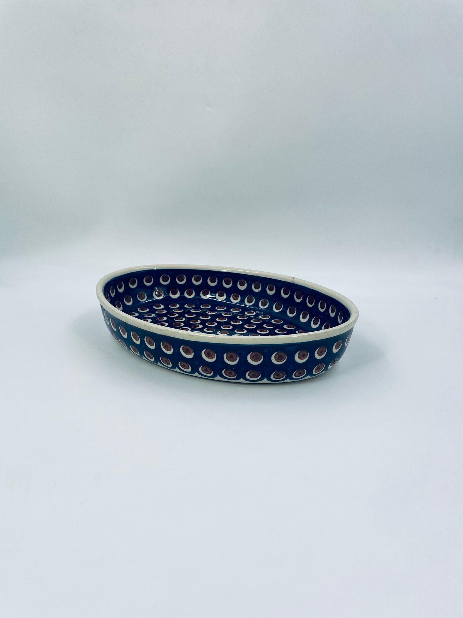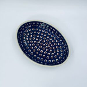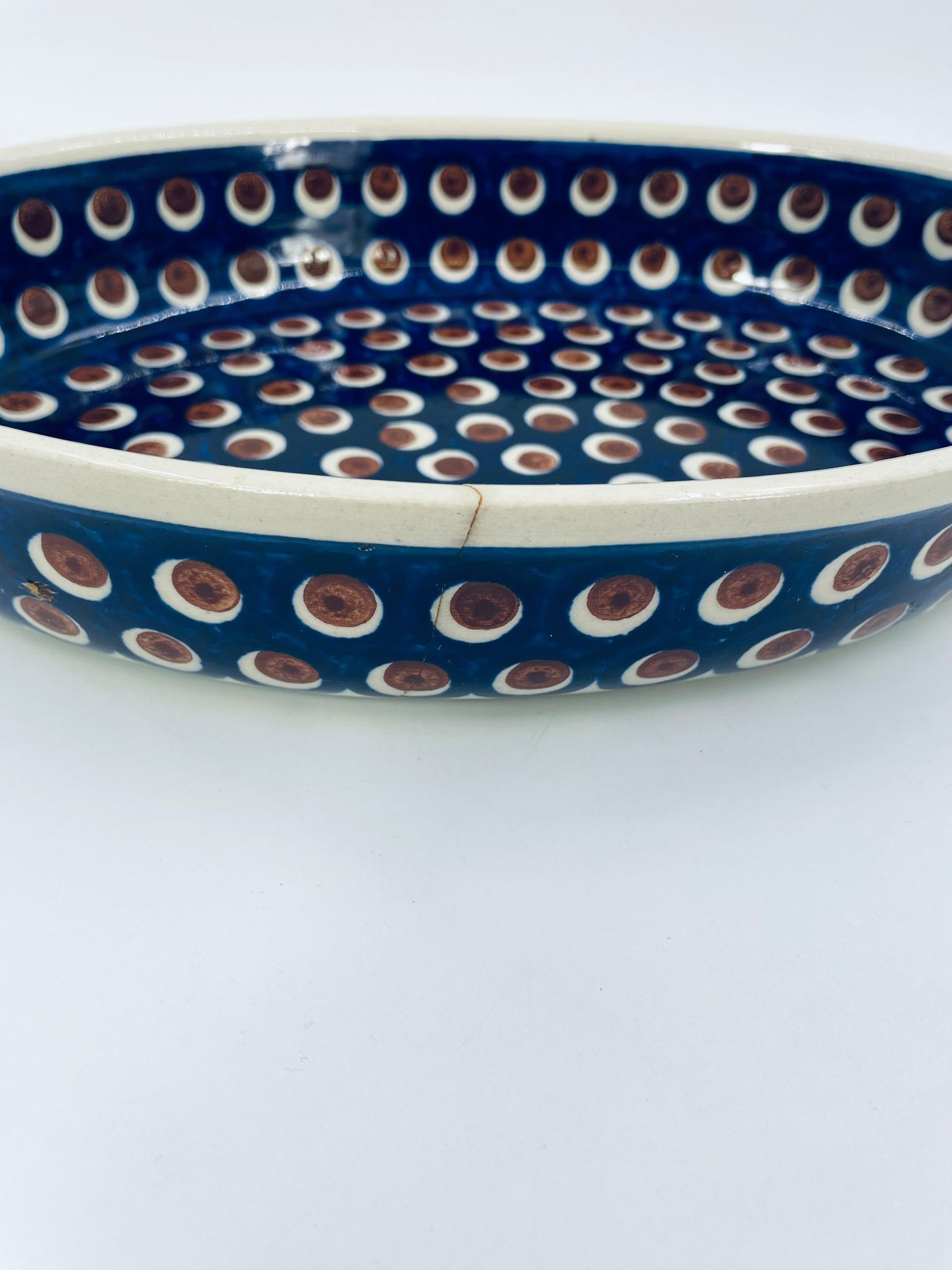 Misa Polskiej wytwórni Bolesławiec, wykonana z najwyższej jakości ceramiki. Misa owalna, ręcznie robiona, ozdobiona jest ręcznie malowanym, tradycyjnym wzorem pawiego oczka. Wzory na Bolesławieckiej ceramice naniesione są metodą stempelkową oraz pędzlem. Misa posiada pęknięcie.