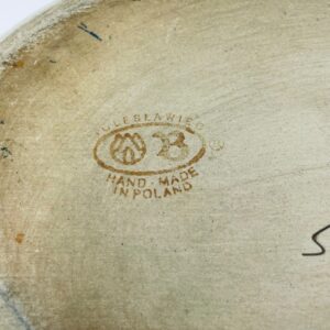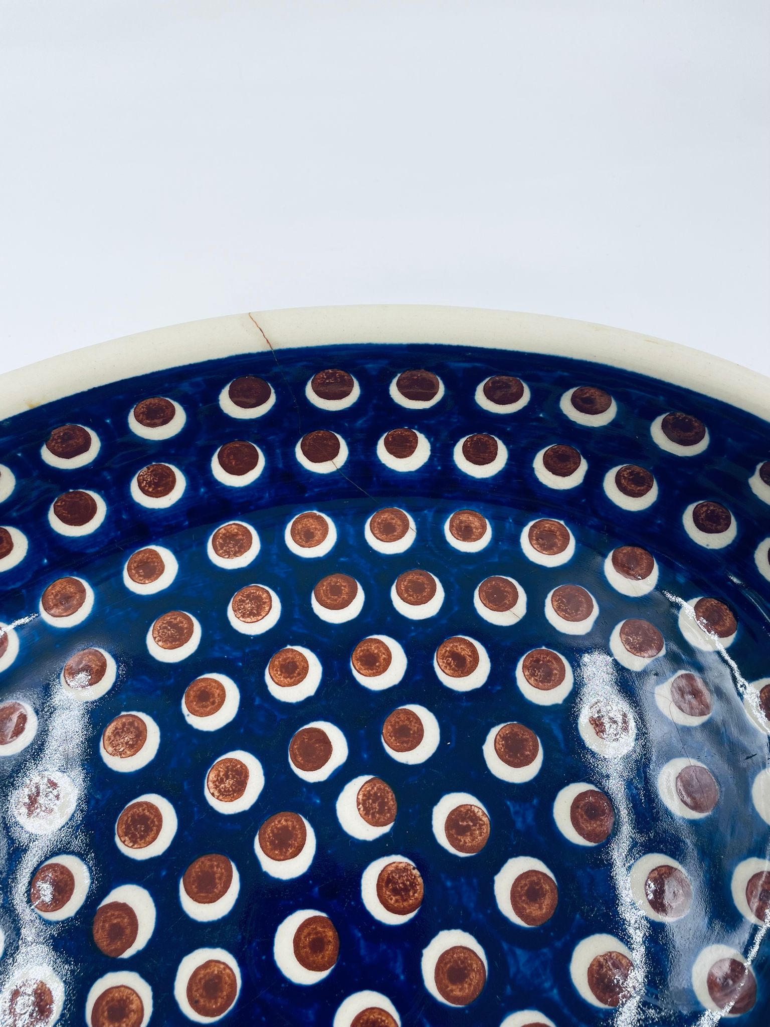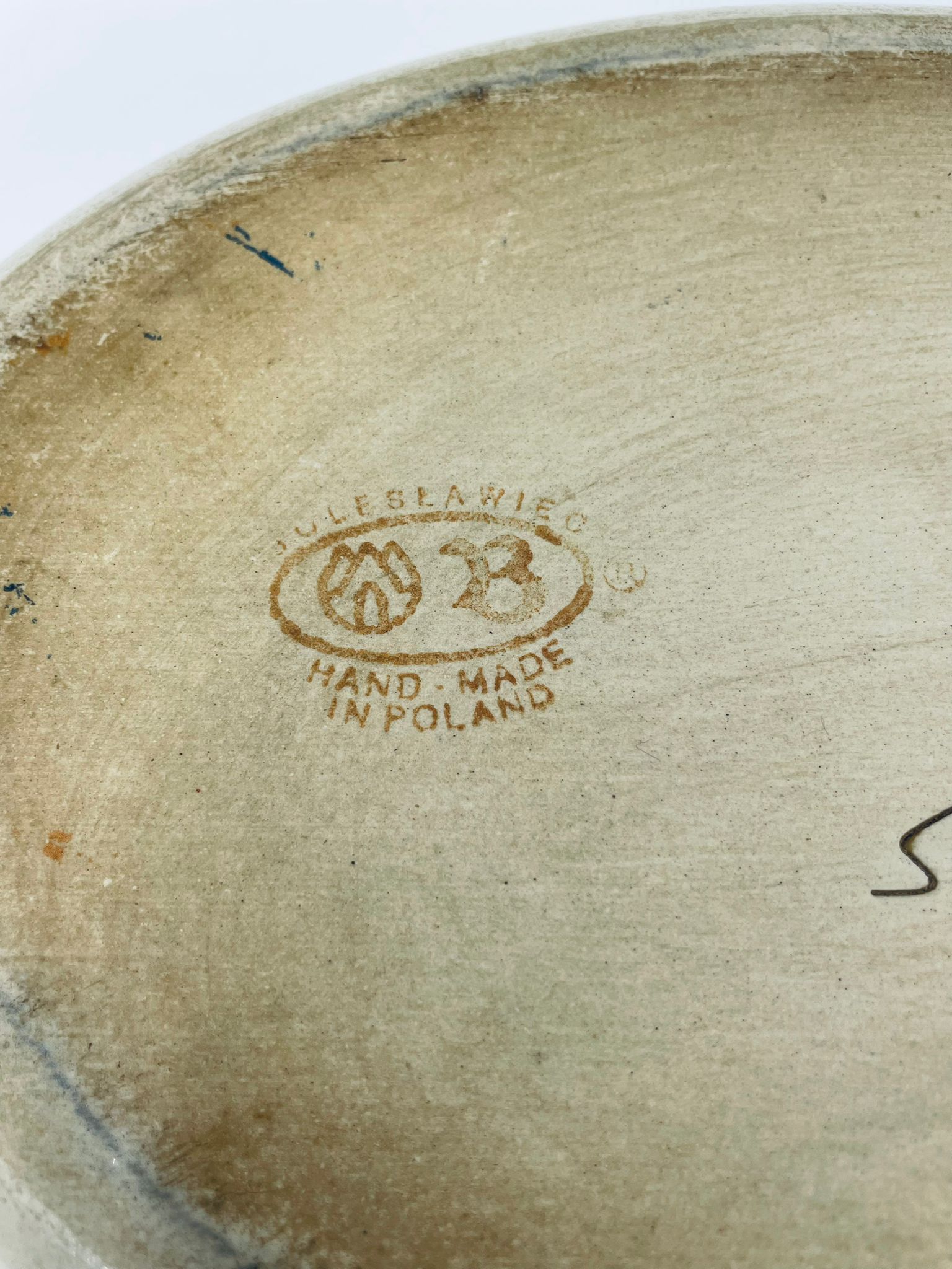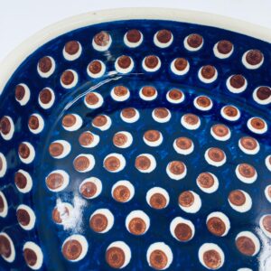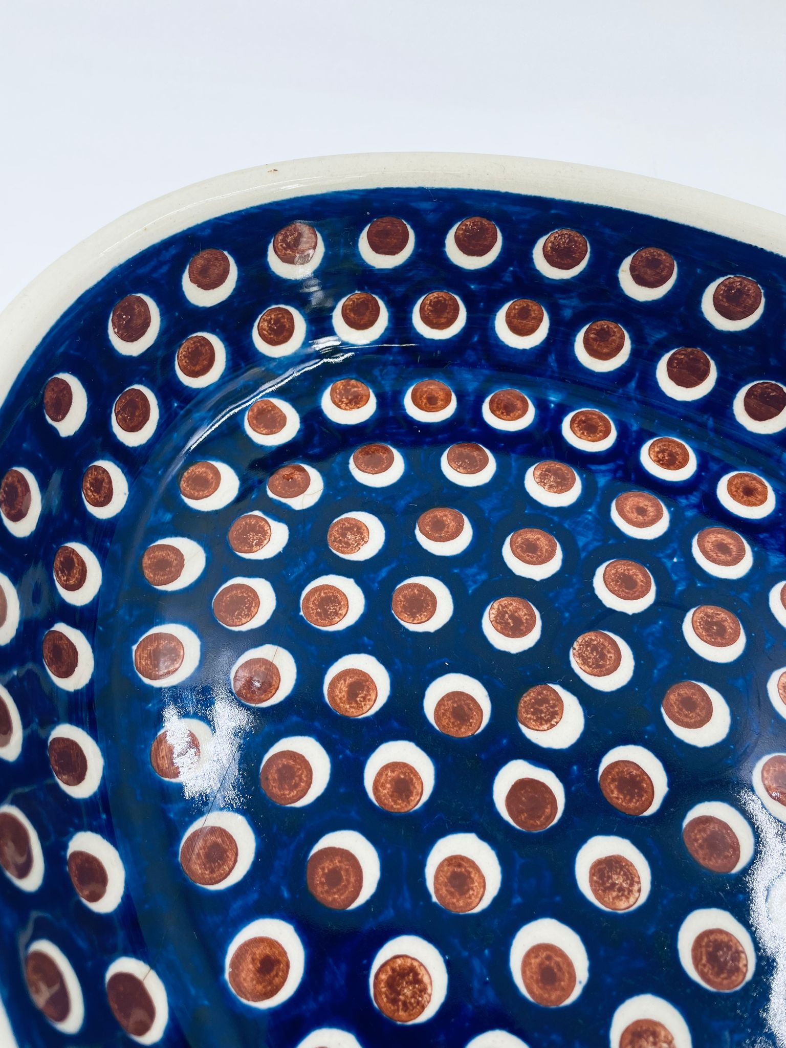 Misa Polskiej wytwórni Bolesławiec, wykonana z najwyższej jakości ceramiki. Misa owalna, ręcznie robiona, ozdobiona jest ręcznie malowanym, tradycyjnym wzorem pawiego oczka. Wzory na Bolesławieckiej ceramice naniesione są metodą stempelkową oraz pędzlem. Misa posiada pęknięcie.