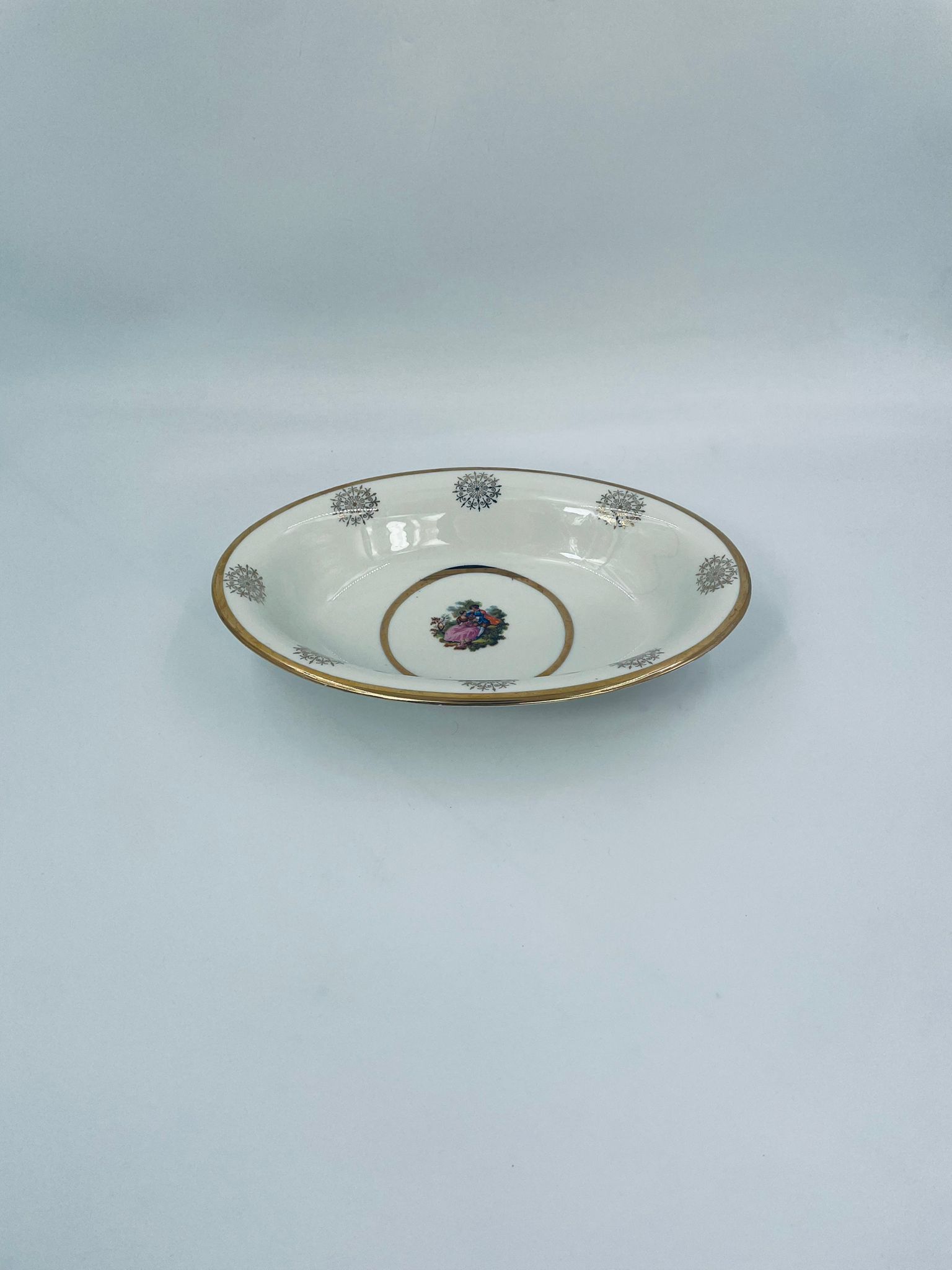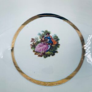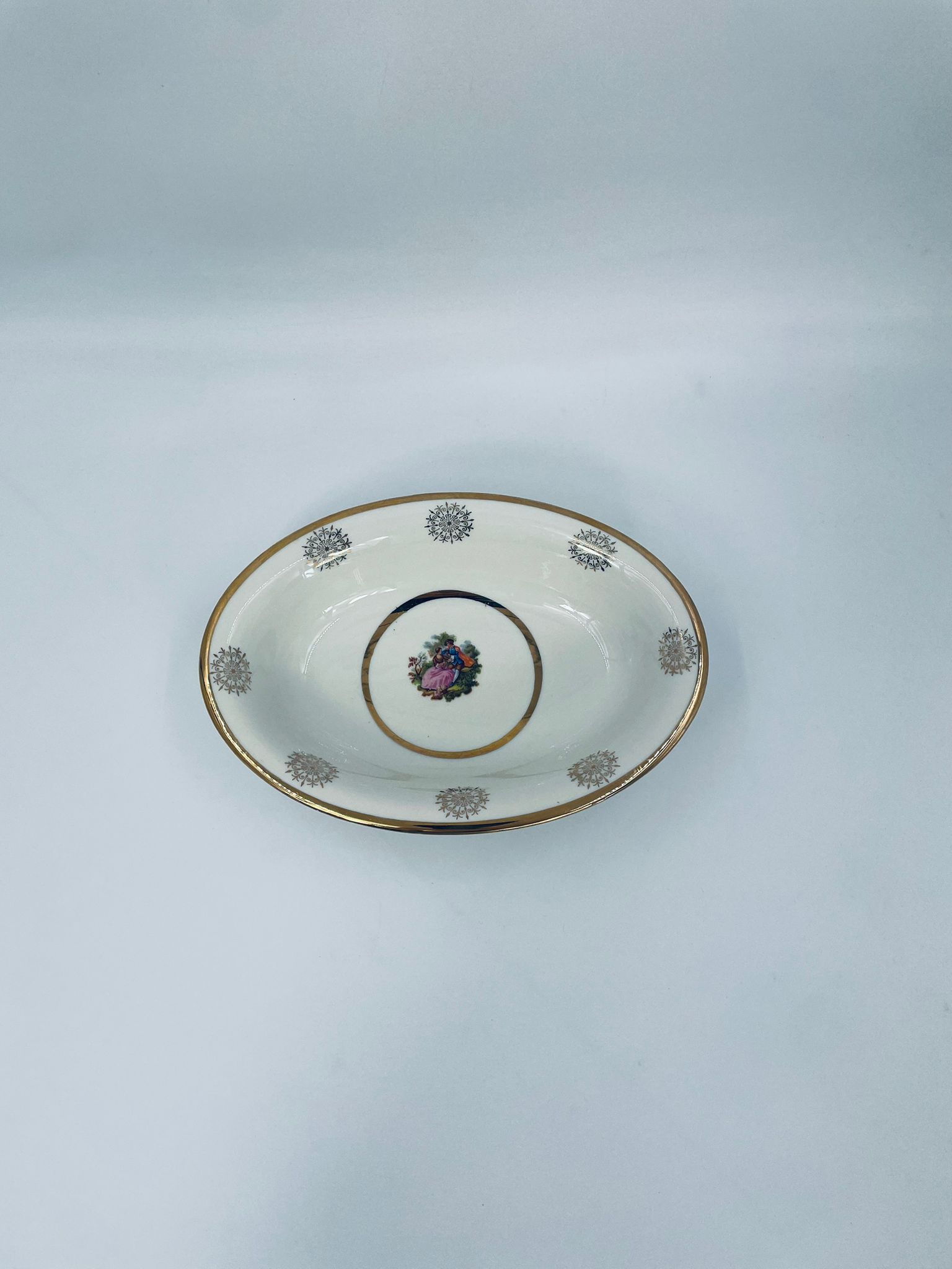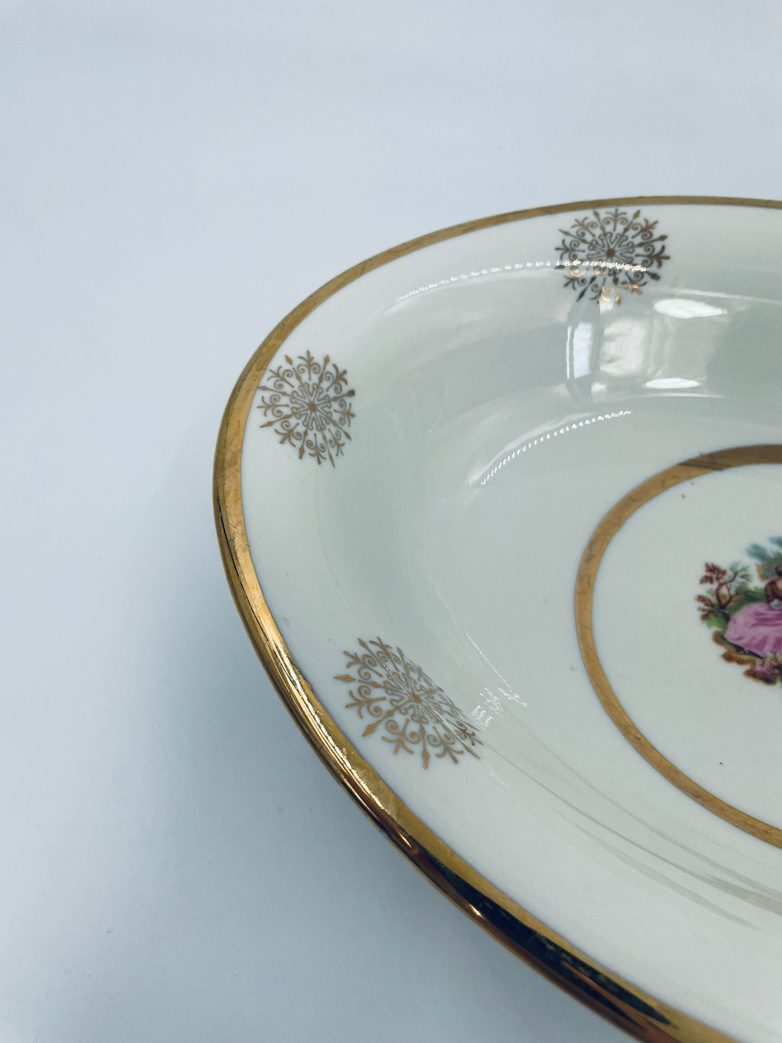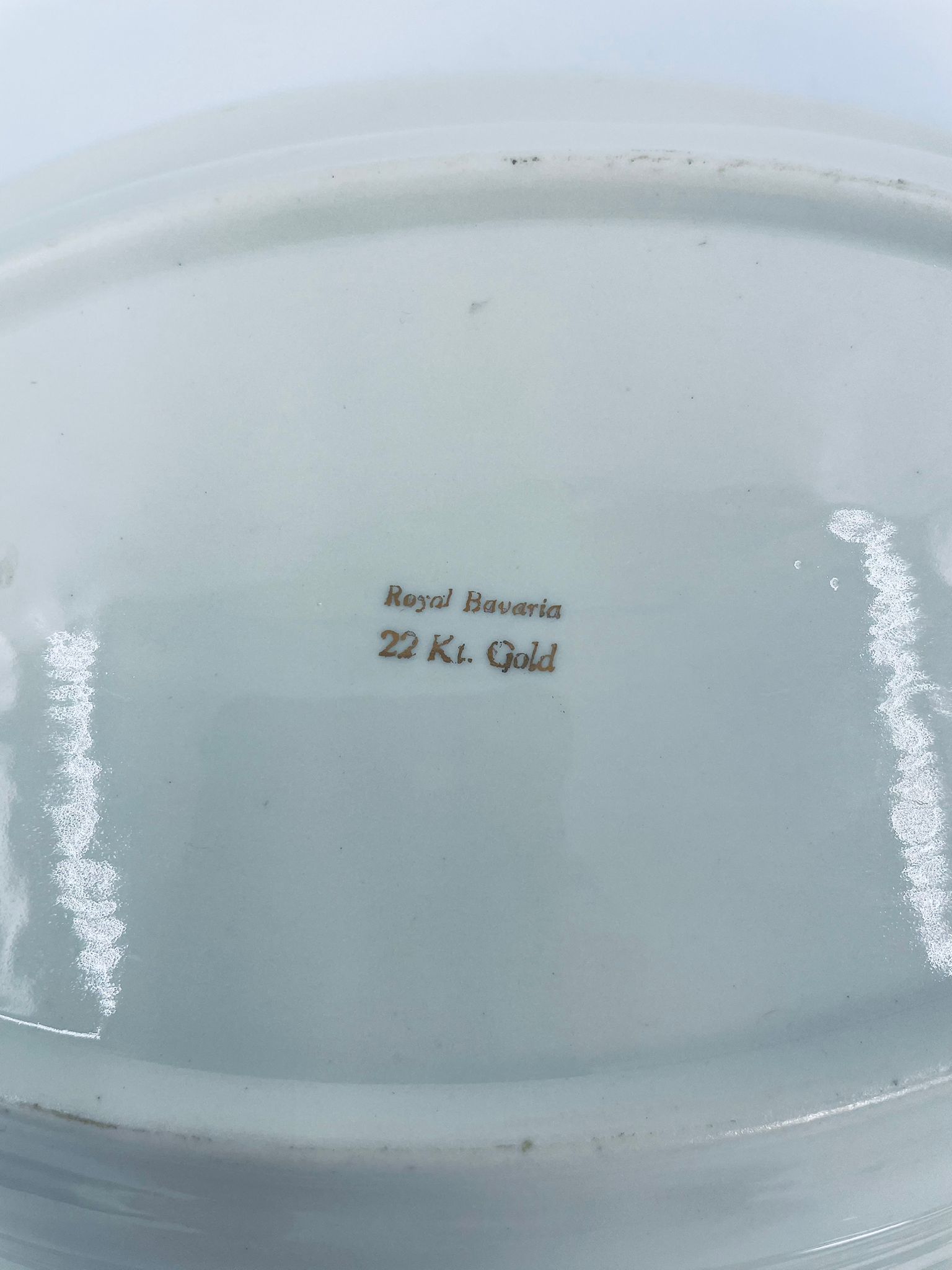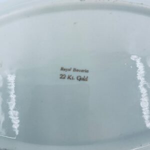 Bardzo rzadka, antyczna z czasów renesansu misa owalna wytwórni Royal Bavaria, wykonana z wysokiej jakości porcelany w kolorze ecru w stylu rokoko. Zdobiona jest sceną przedstawiającą postacie w strojach epoki, otoczona złotymi ornamentami przypominającymi płatki śniegu, wykończona jest złoceniem na obrzeżach. Miseczka posiada przetarcia na złoceniach.