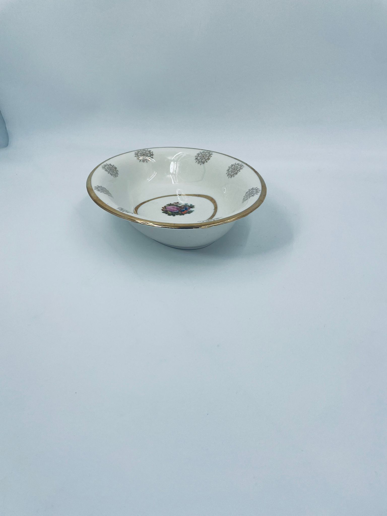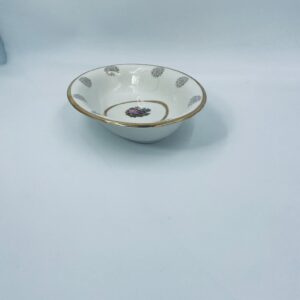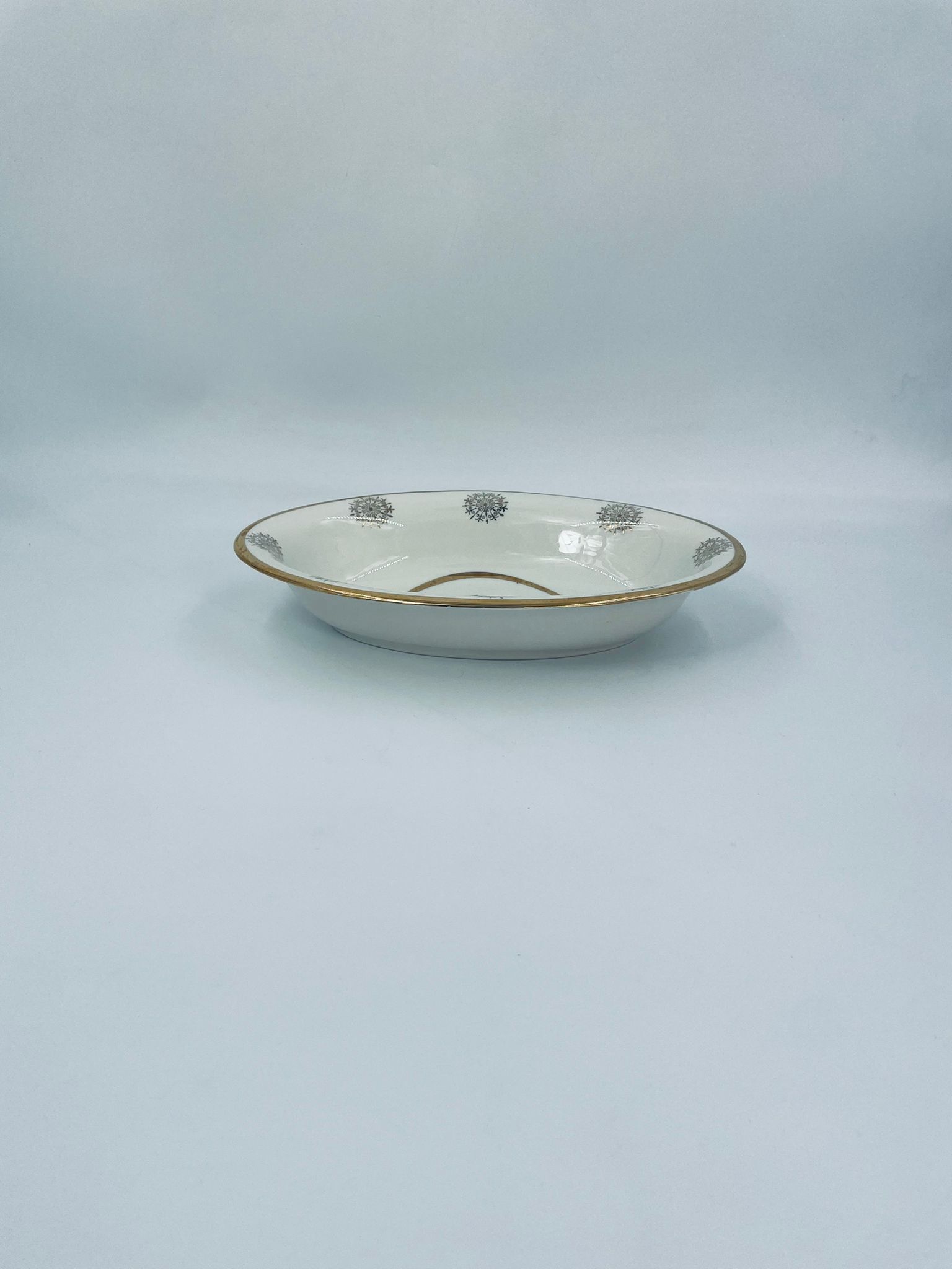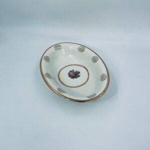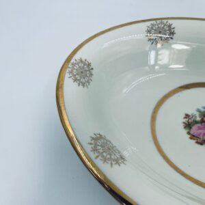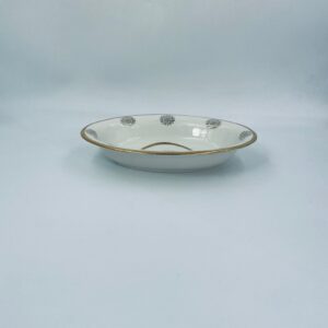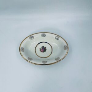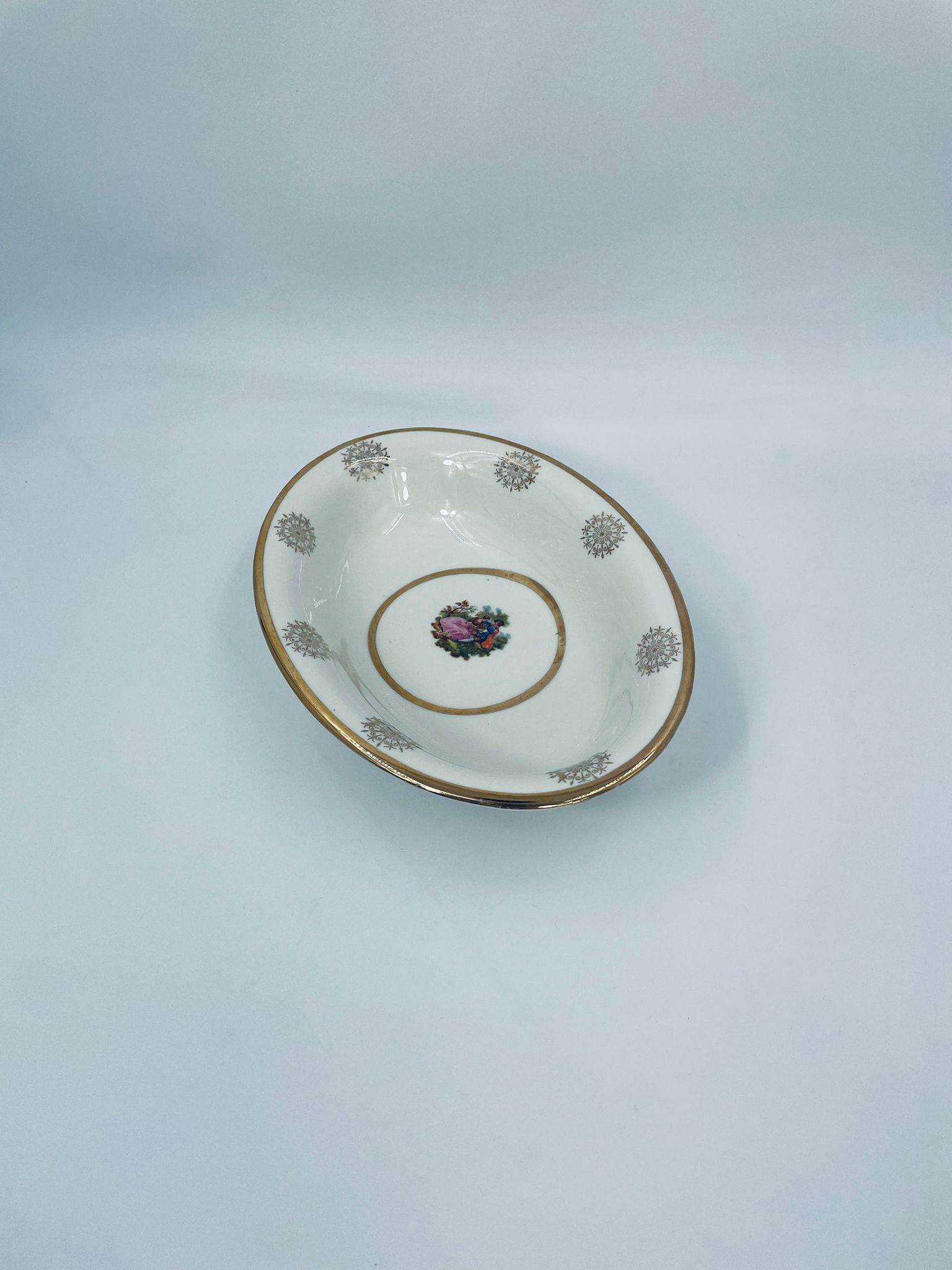 Bardzo rzadka, antyczna z czasów renesansu misa owalna wytwórni Royal Bavaria, wykonana z wysokiej jakości porcelany w kolorze ecru w stylu rokoko. Zdobiona jest sceną przedstawiającą postacie w strojach epoki, otoczona złotymi ornamentami przypominającymi płatki śniegu, wykończona jest złoceniem na obrzeżach. Miseczka posiada przetarcia na złoceniach.