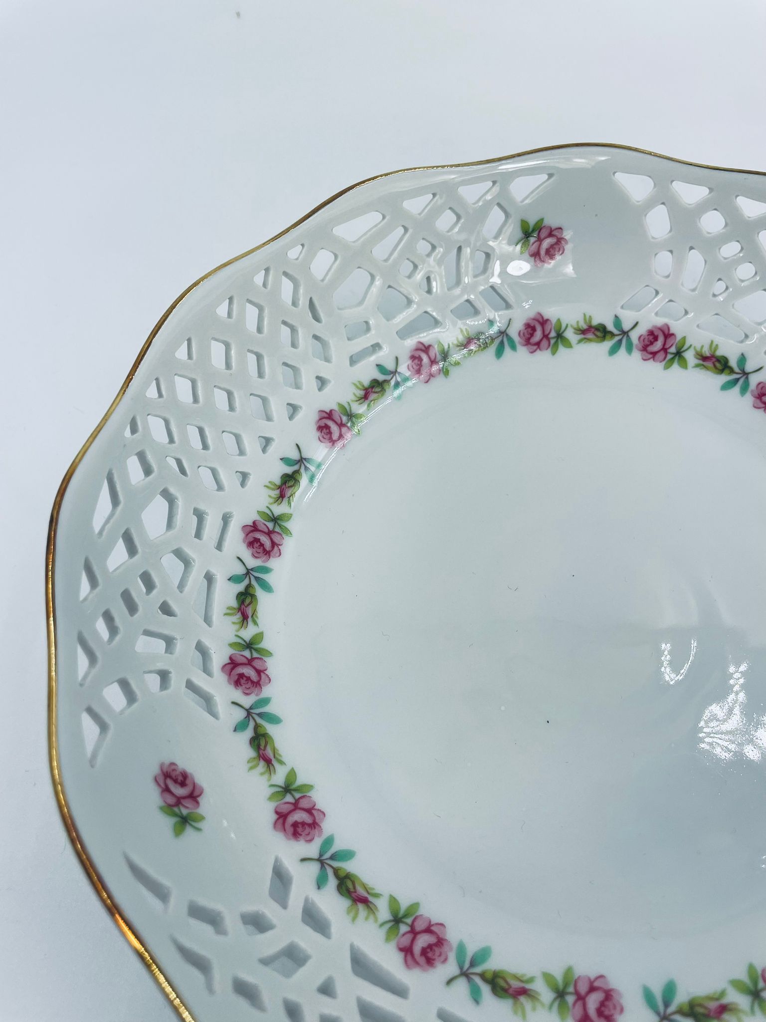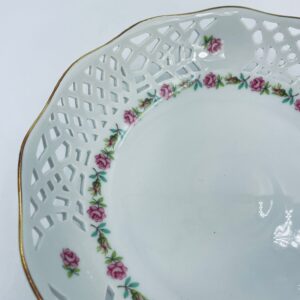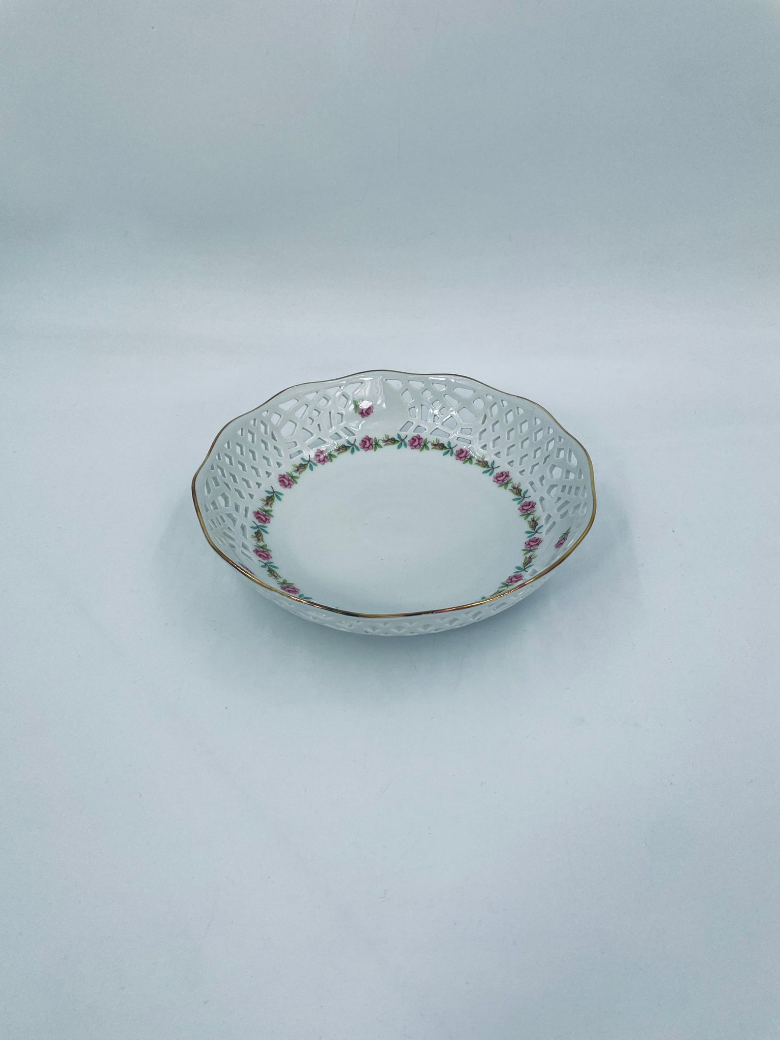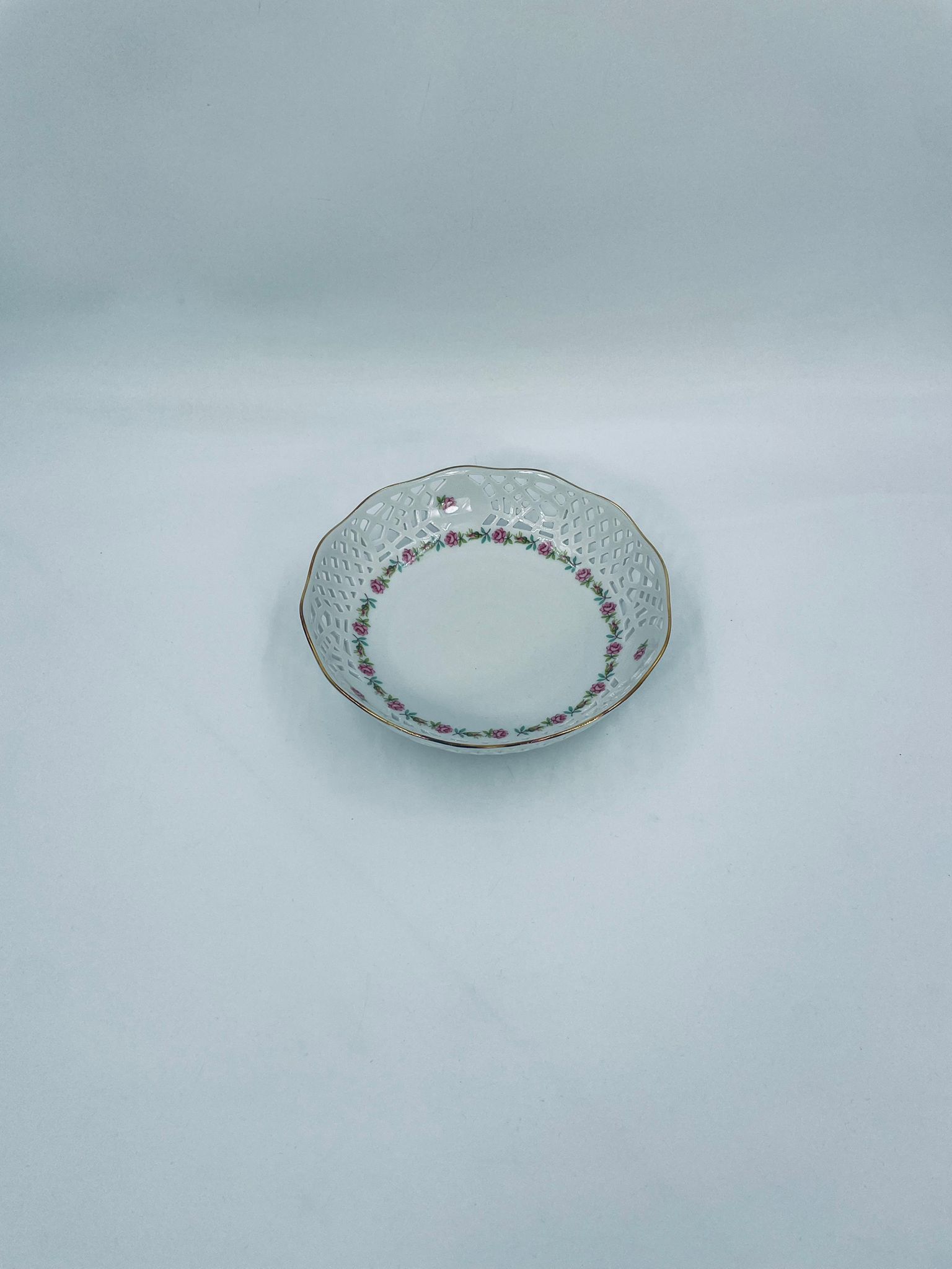 Misa/ patera wytwórni Form Marienbad Jgres Weiss, wykonana z wysokiej jakości białej porcelany. Misa charakteryzuje się ażurowym kołnierzem oraz motywem małych, delikatnych, różowych kwiatków, wykończona złoceniem na górnym falowanym rancie.