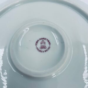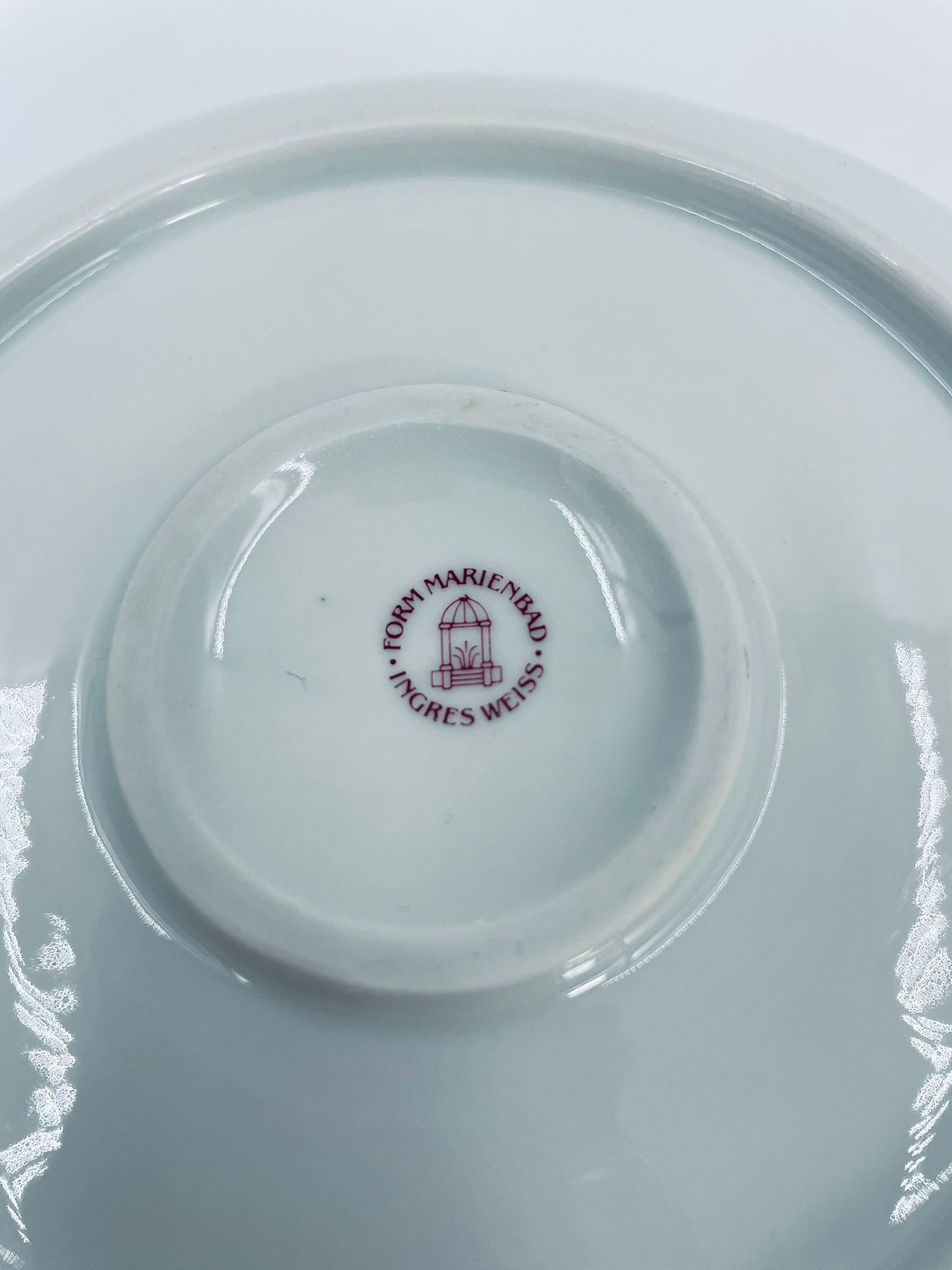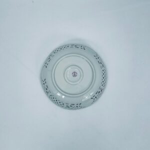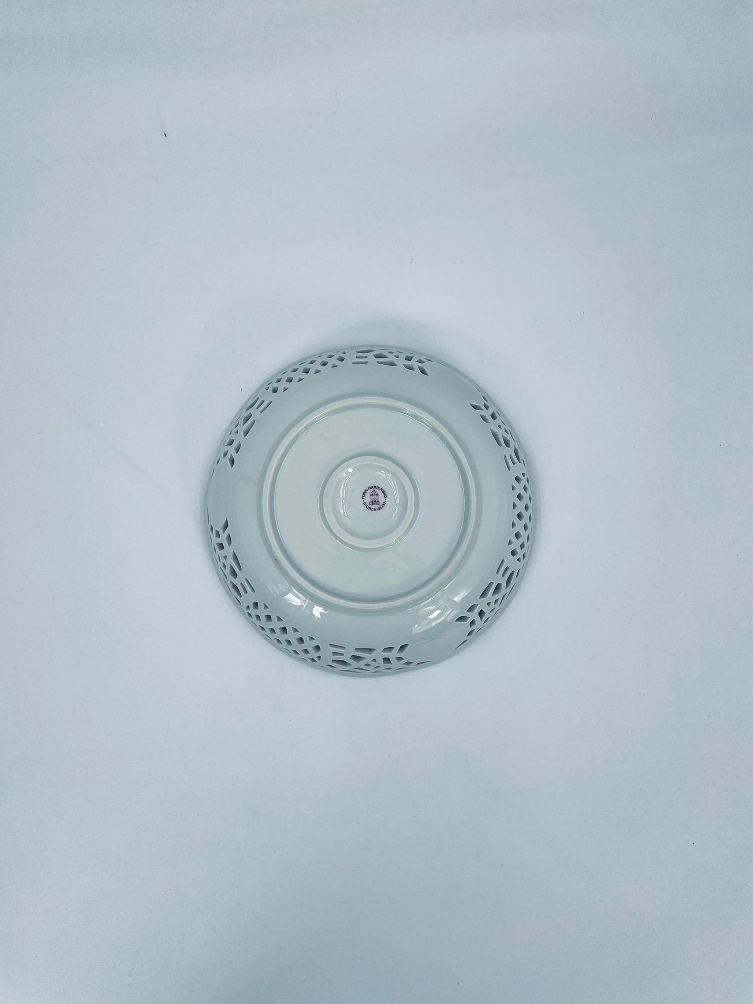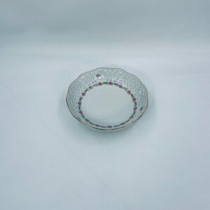 Misa/ patera wytwórni Form Marienbad Jgres Weiss, wykonana z wysokiej jakości białej porcelany. Misa charakteryzuje się ażurowym kołnierzem oraz motywem małych, delikatnych, różowych kwiatków, wykończona złoceniem na górnym falowanym rancie.