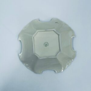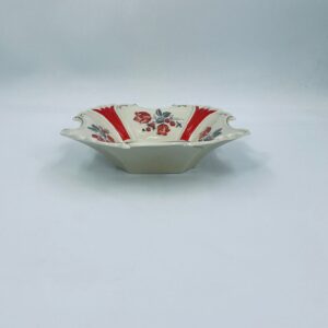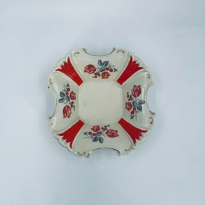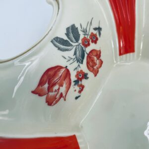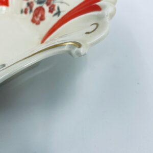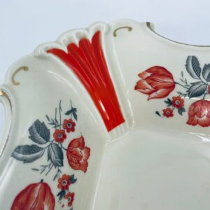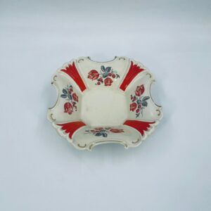Misa dekoracyjna wytwórni Thuringen, wykonana z wysokiej jakości porcelany w kolorze ecru. Misa charakteryzuje się ozdobnym, nieregularnym brzegiem ze złotymi akcentami podkreślającymi krawędzie, czerwonymi kwiatami z szarymi listkami oraz dominującymi , czerwonymi , pionowymi pasami, posiada mały uszczerbek na rancie.