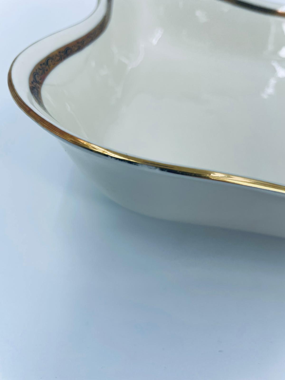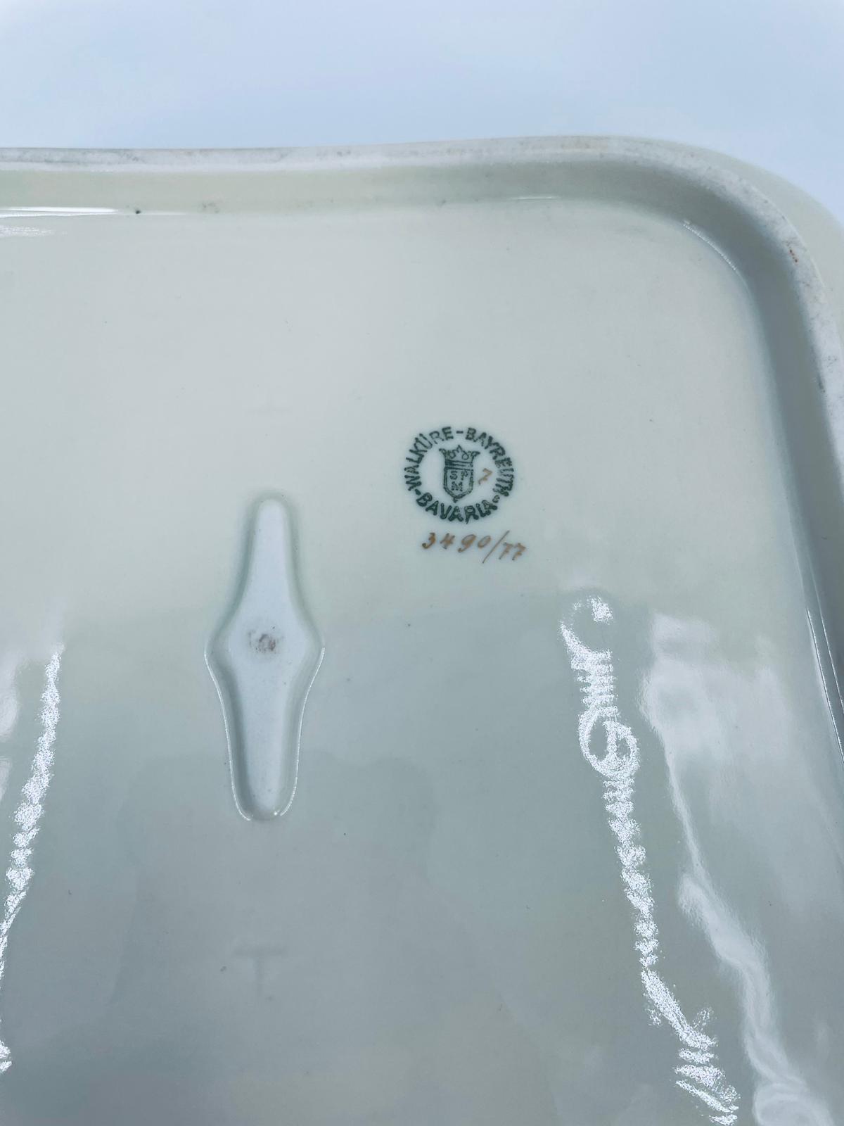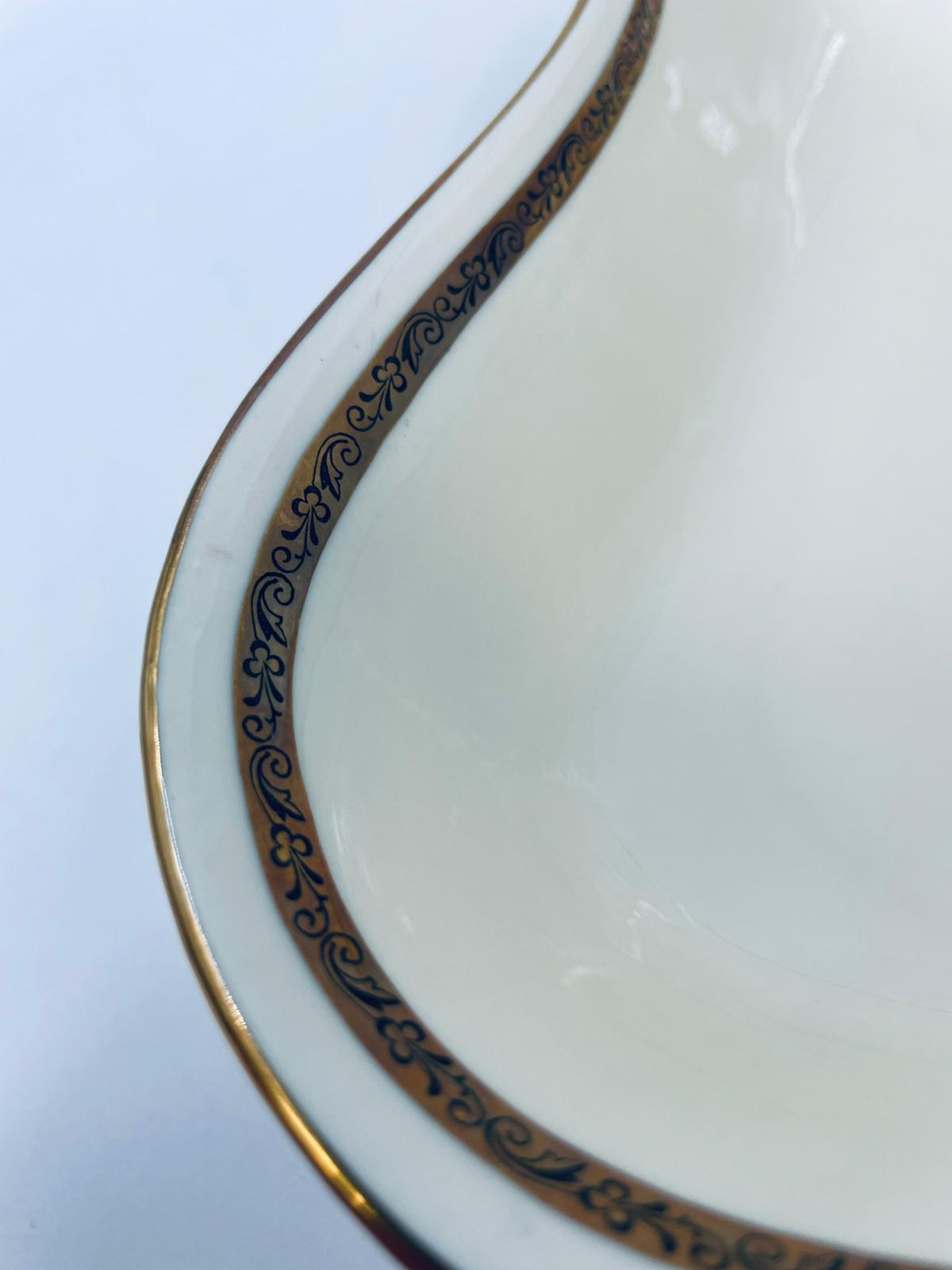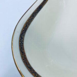 Misa wytwórni Walkure Bayreuth Bavaria, wykonana z wysokiej jakości porcelany w kolorze ecru. Charakteryzuje się eleganckim designem, złotym pasem ze wzorem w koło naczynia, falistym brzegiem wykończonym złoceniem na rancie. Posiada przetarcie na złoceniu.
