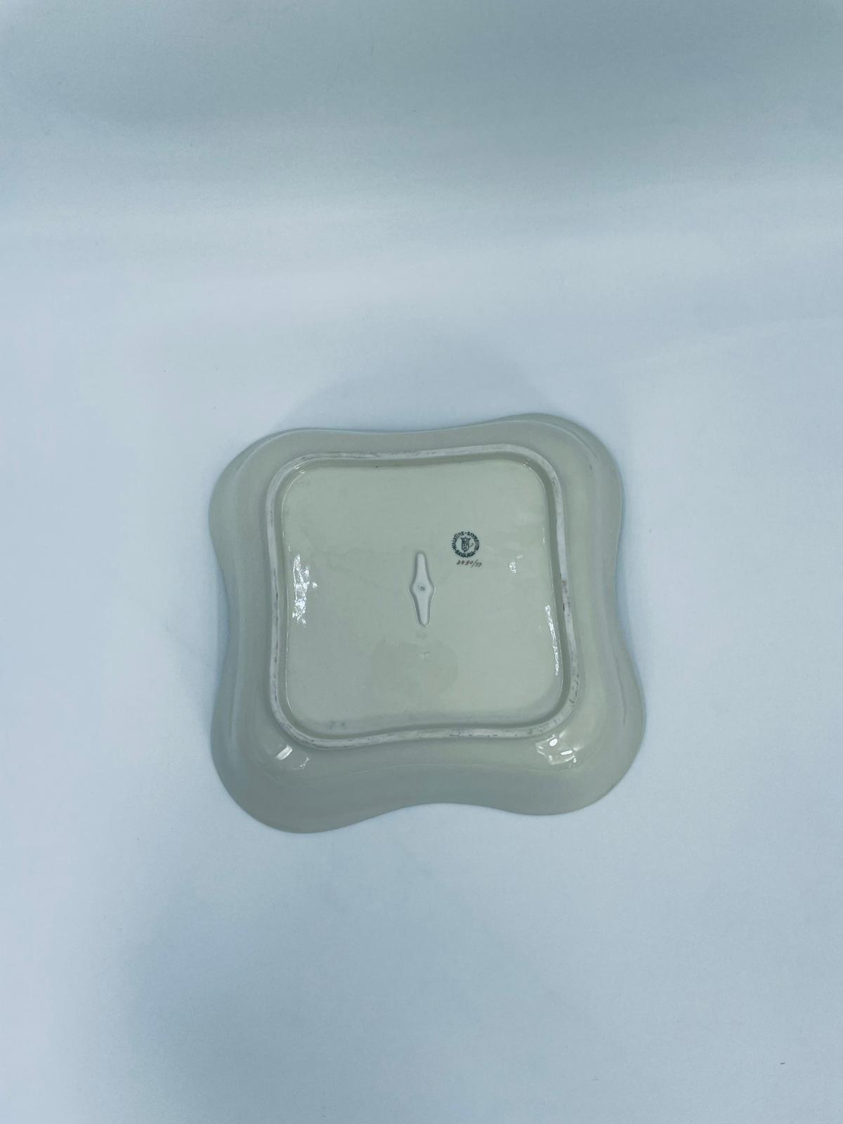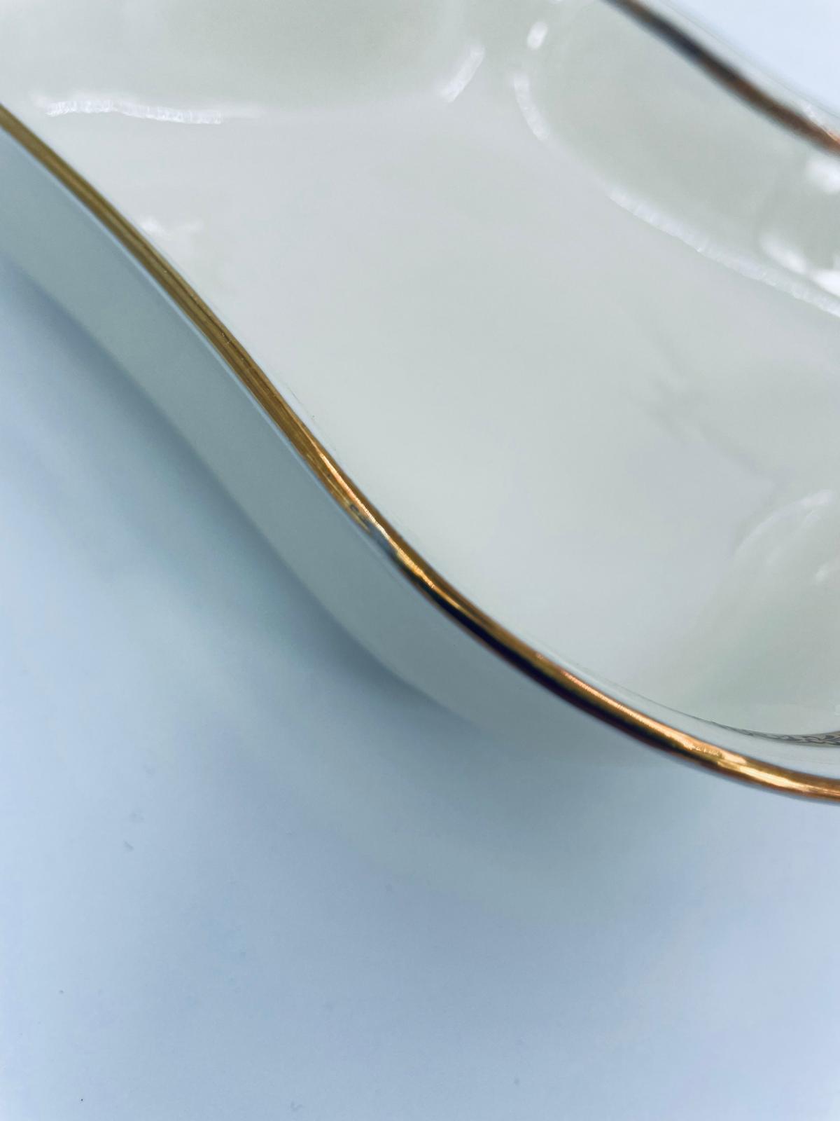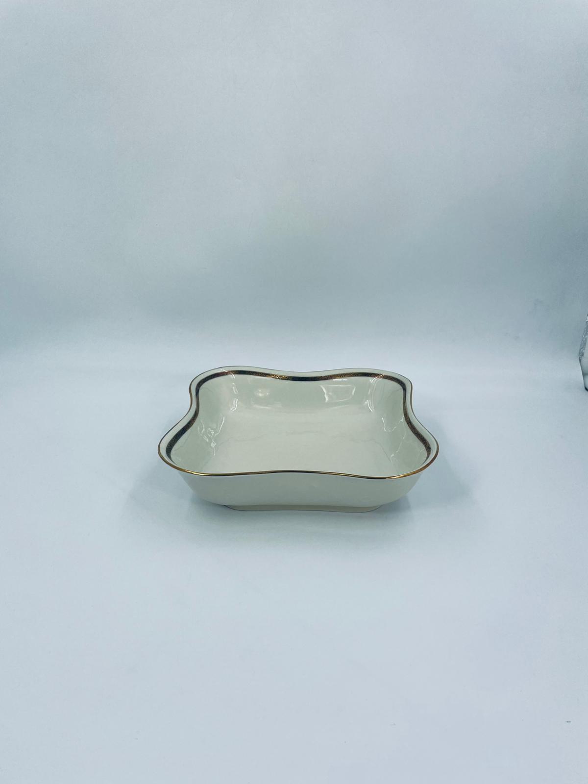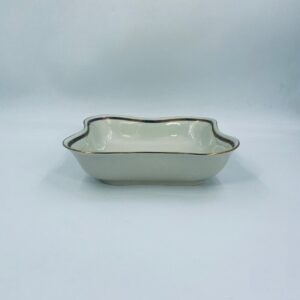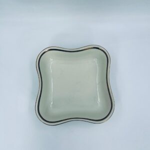 Misa wytwórni Walkure Bayreuth Bavaria, wykonana z wysokiej jakości porcelany w kolorze ecru. Charakteryzuje się eleganckim designem, złotym pasem ze wzorem w koło naczynia, falistym brzegiem wykończonym złoceniem na rancie. Posiada przetarcie na złoceniu.