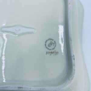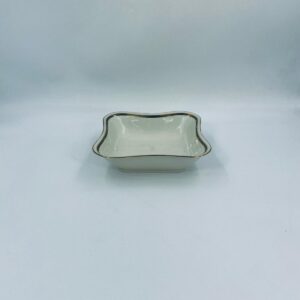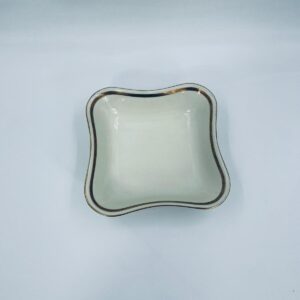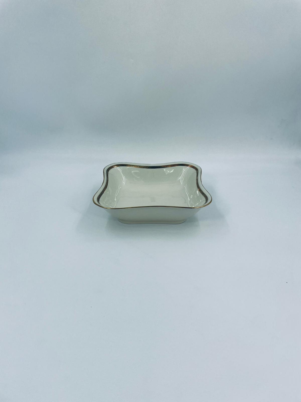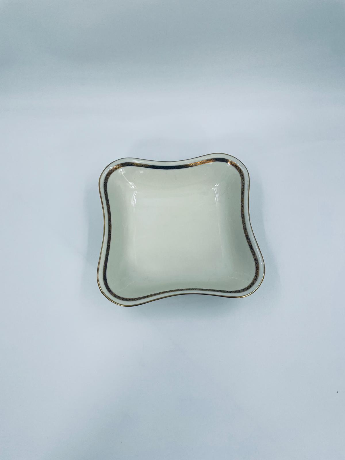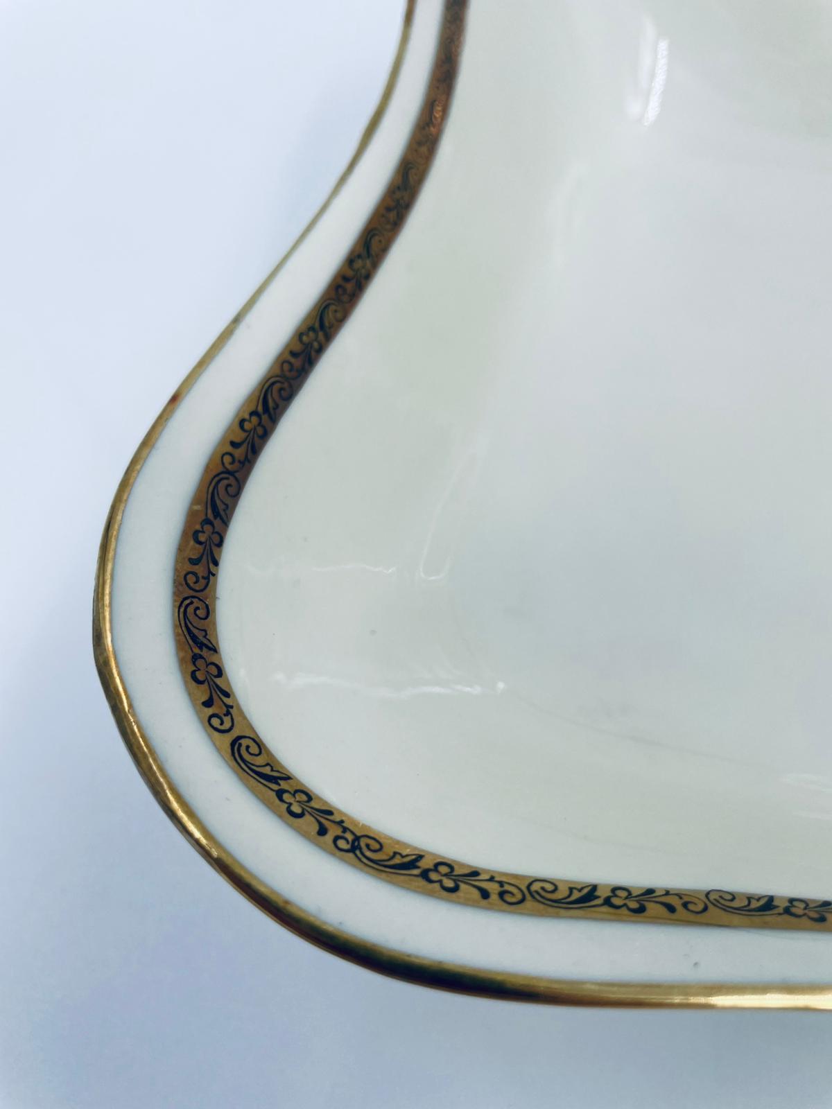 Misa wytwórni Walkure Bayreuth Bavaria, wykonana z wysokiej jakości porcelany w kolorze ecru. Charakteryzuje się eleganckim designem, złotym pasem ze wzorem w koło naczynia, falistym brzegiem wykończonym złoceniem na rancie.