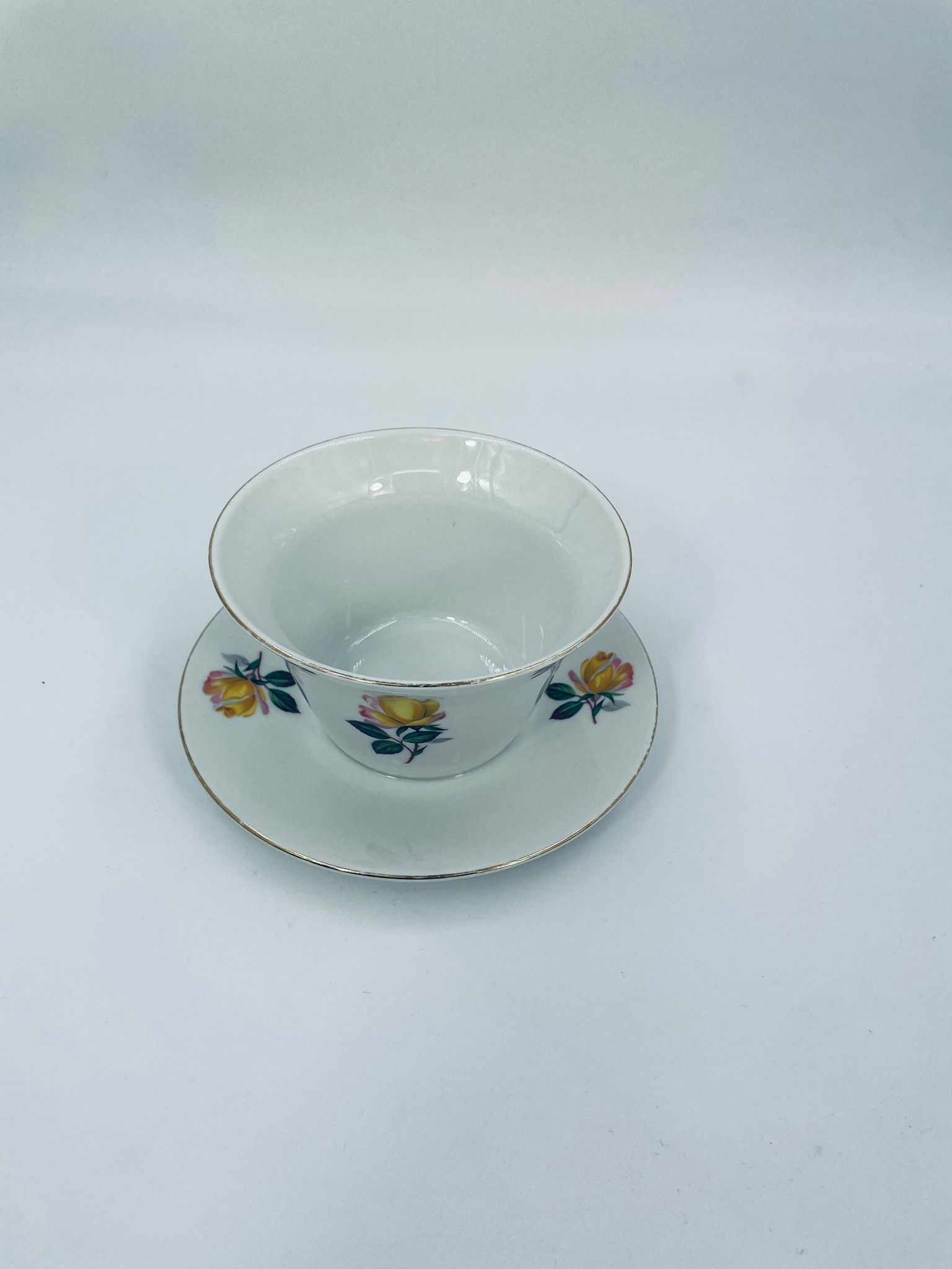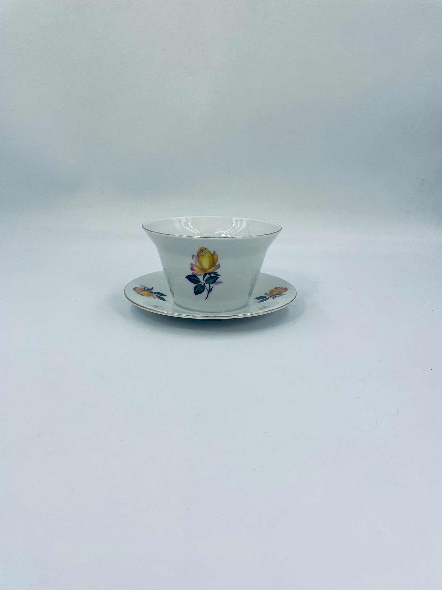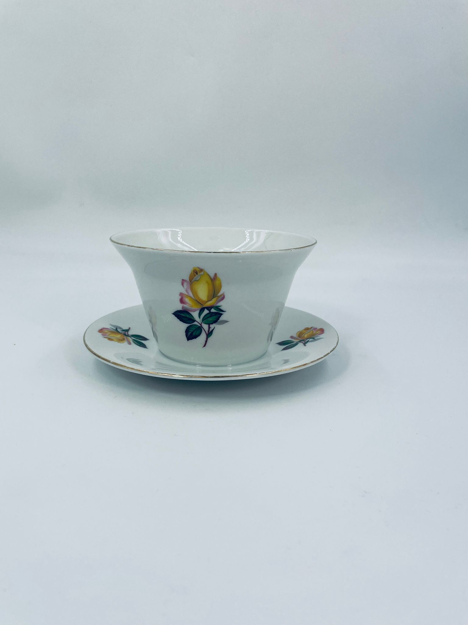 Misa, Sosjerka , Bulionówka z podstawką wytwórni Scherzer Bavaria, wykonana z białej porcelany z motywem złotych róż, wykończona złoceniem na rantach. Posiada niewielkie przetarcia na złoceniu.