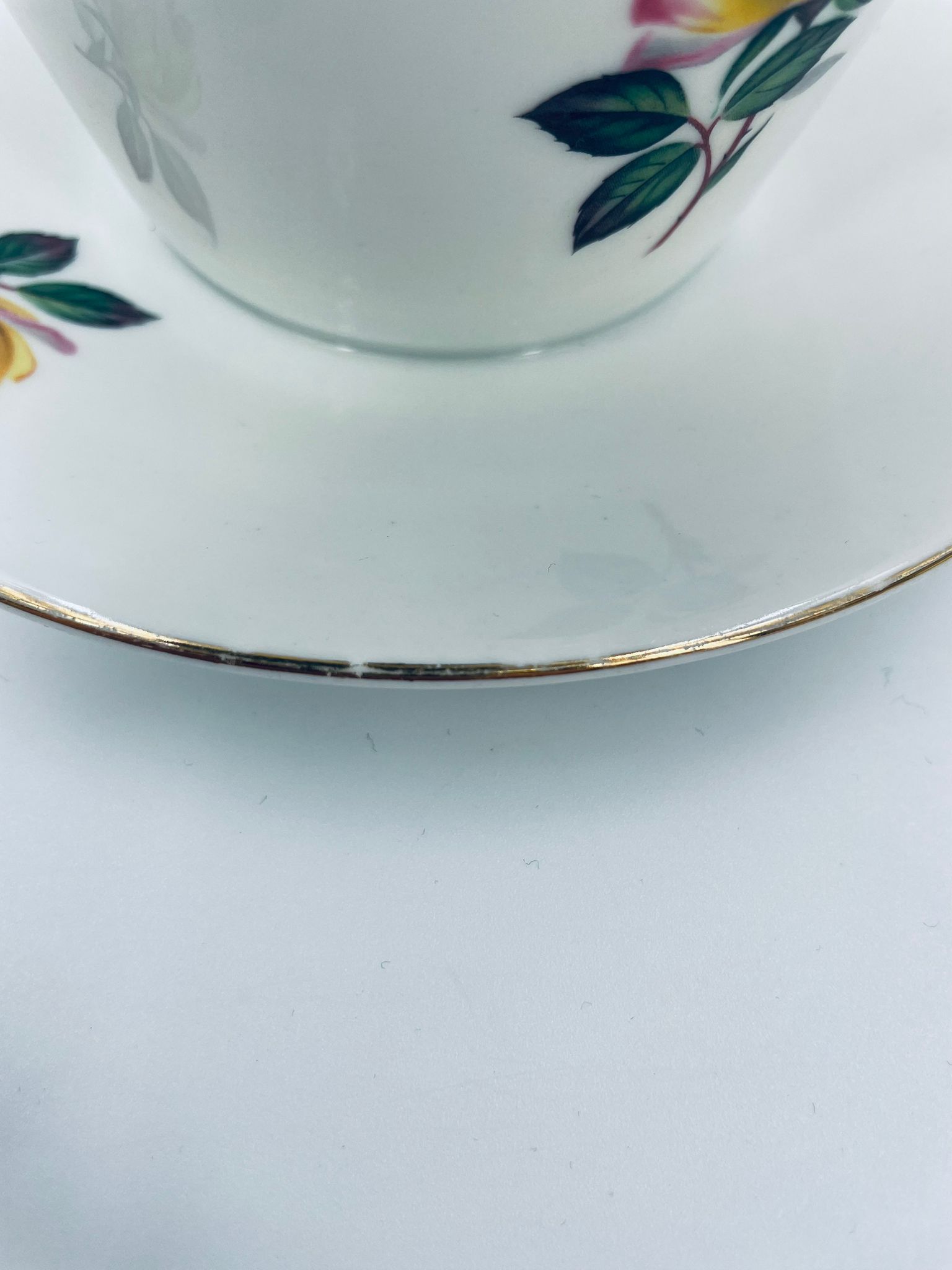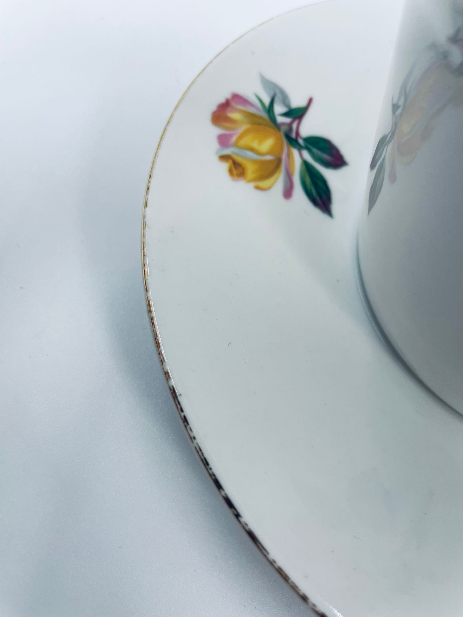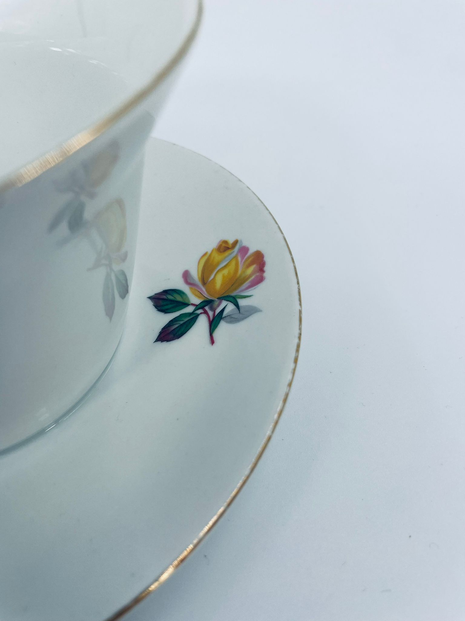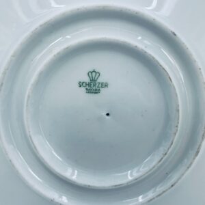 Misa, Sosjerka , Bulionówka z podstawką wytwórni Scherzer Bavaria, wykonana z białej porcelany z motywem złotych róż, wykończona złoceniem na rantach. Posiada niewielkie przetarcia na złoceniu.