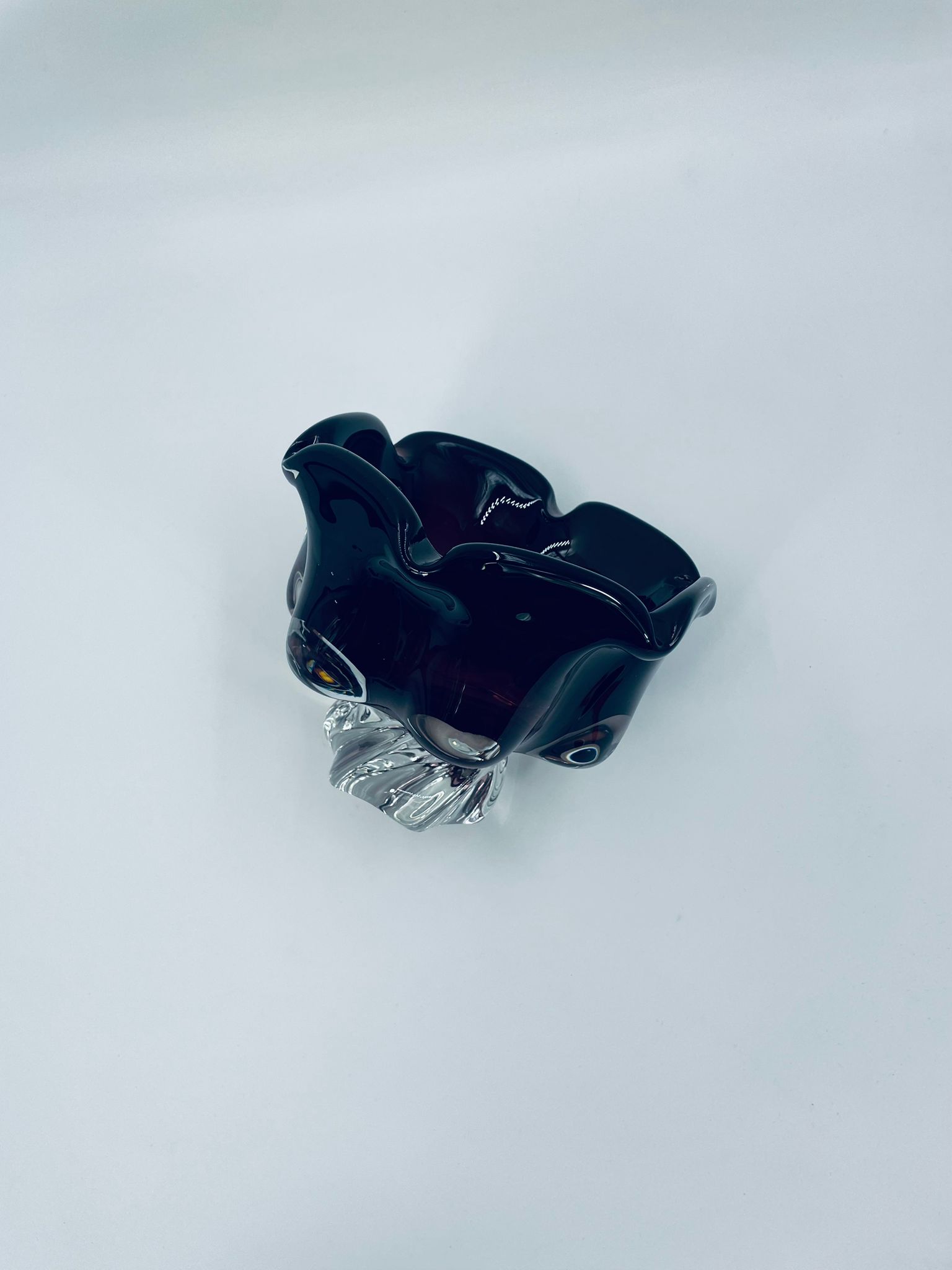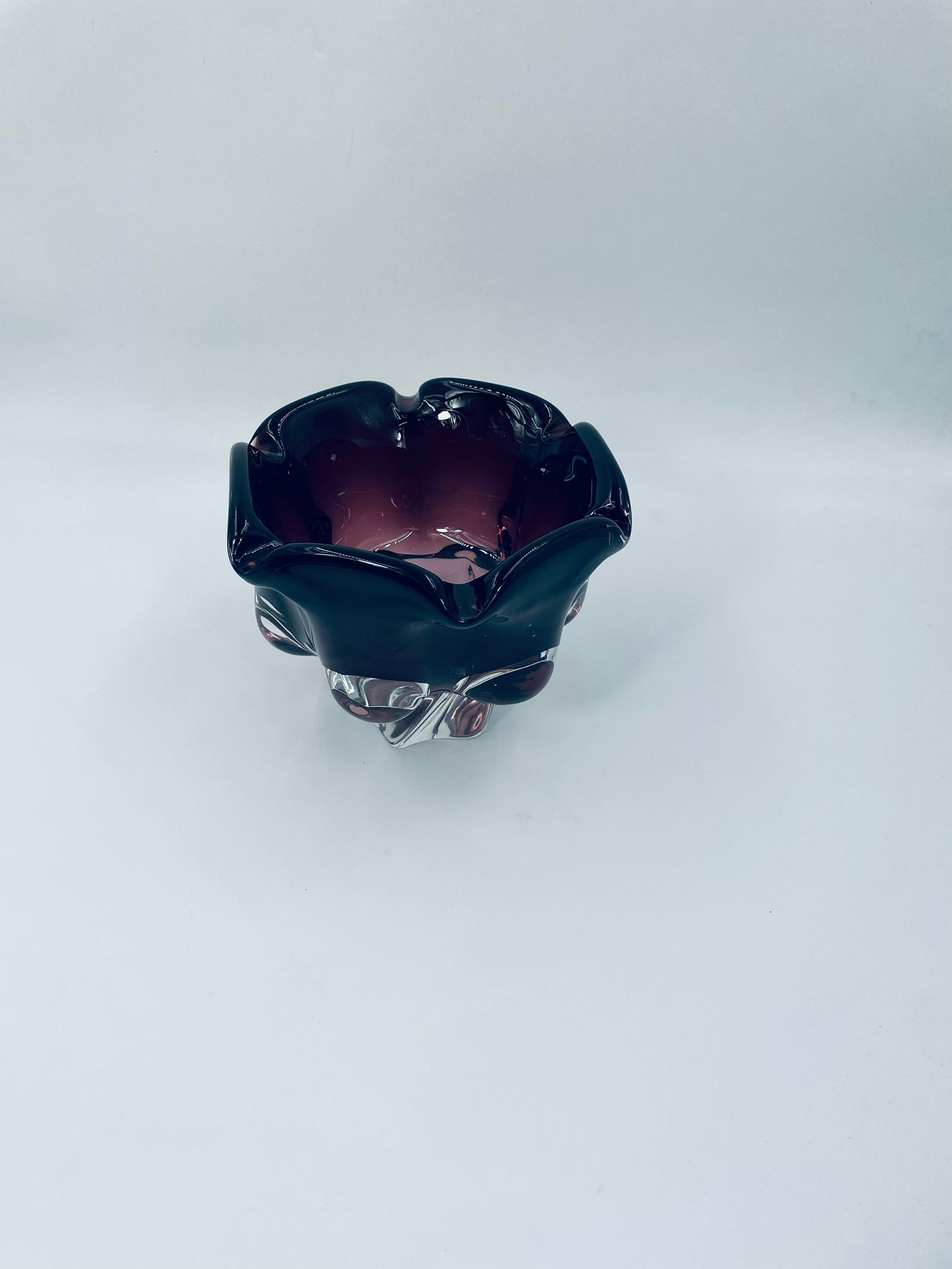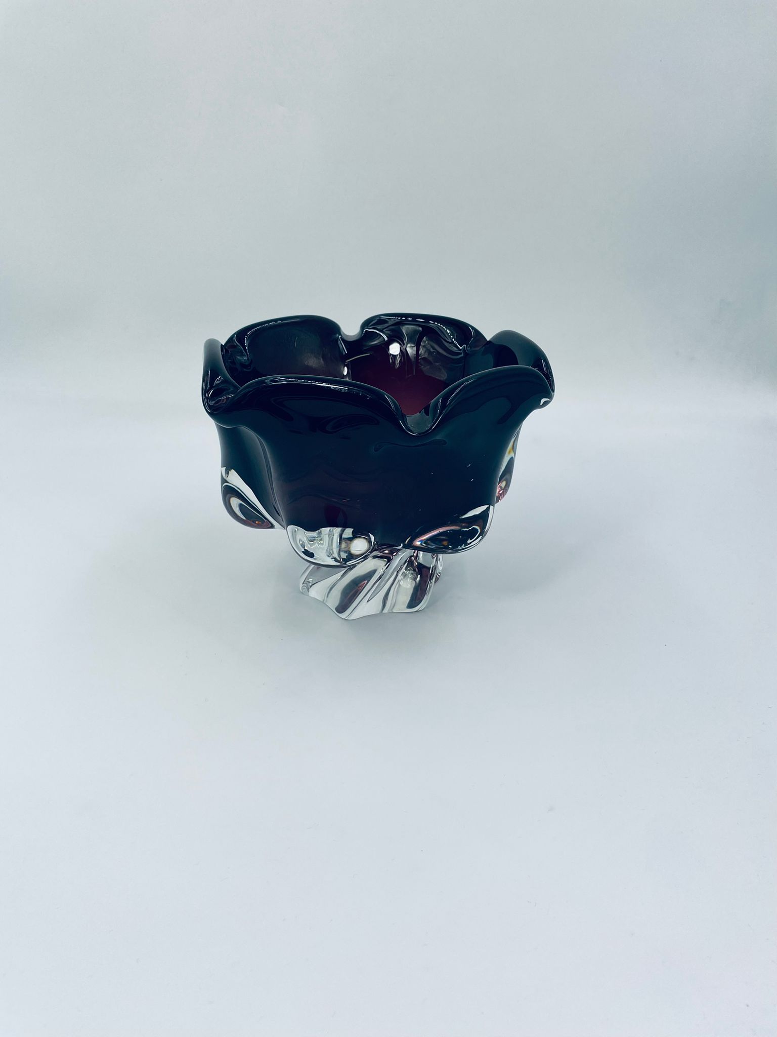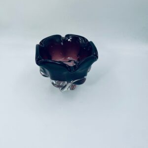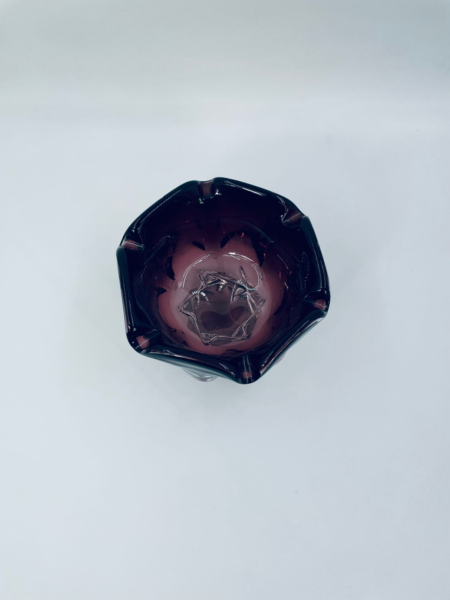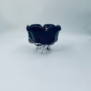 Misa/ wazon wykonana z ciężkiego szkła Murano w kolorze ciemnego fioletu z przezroczystą podstawką. Charakteryzuje się falistym, nieregularnym brzegiem oraz rzeźbioną podstawą.