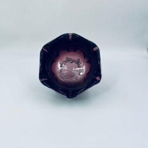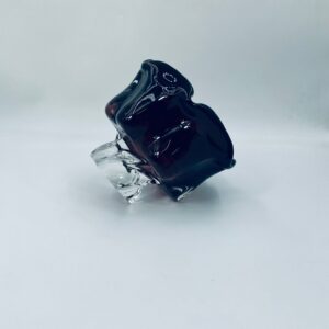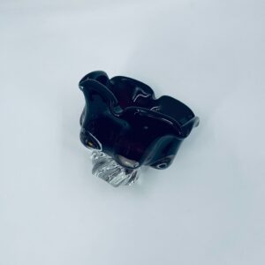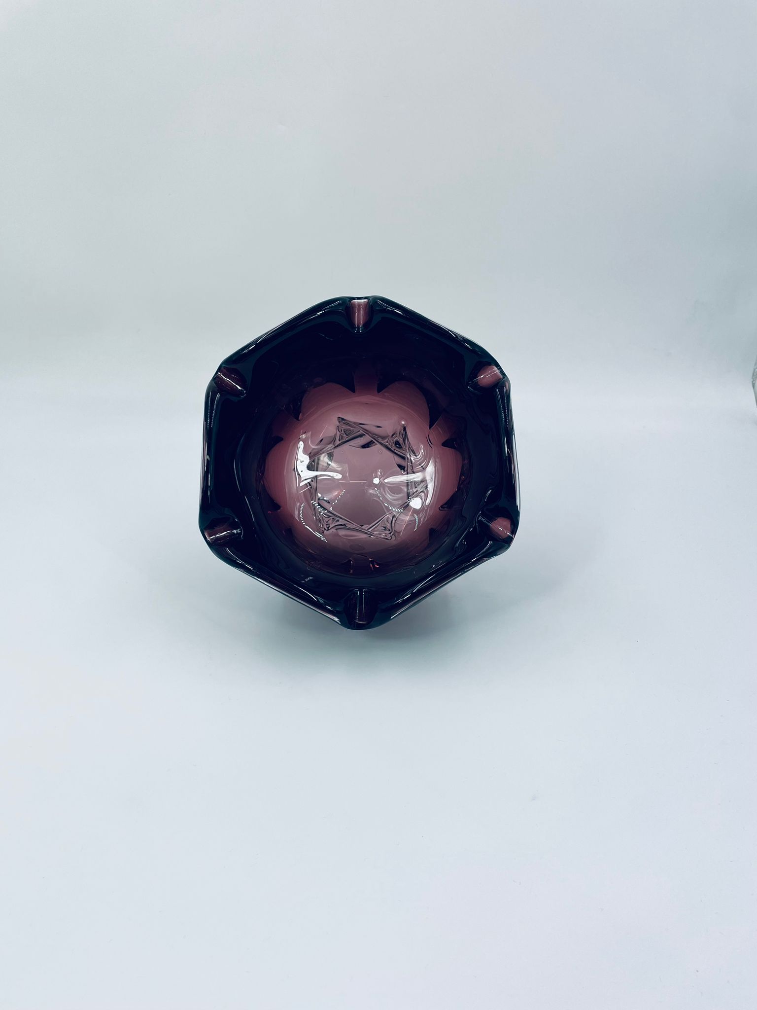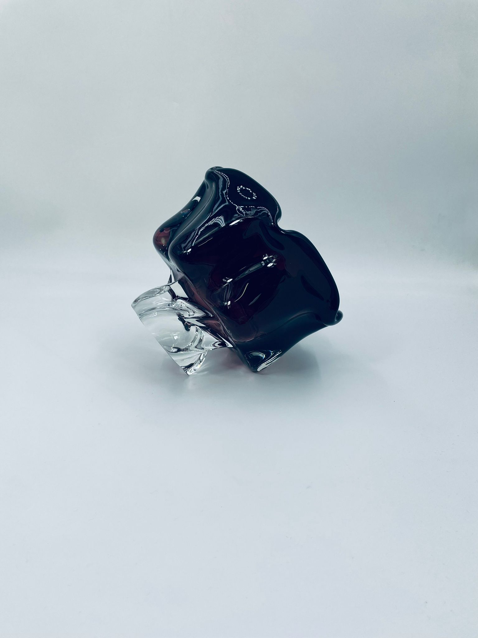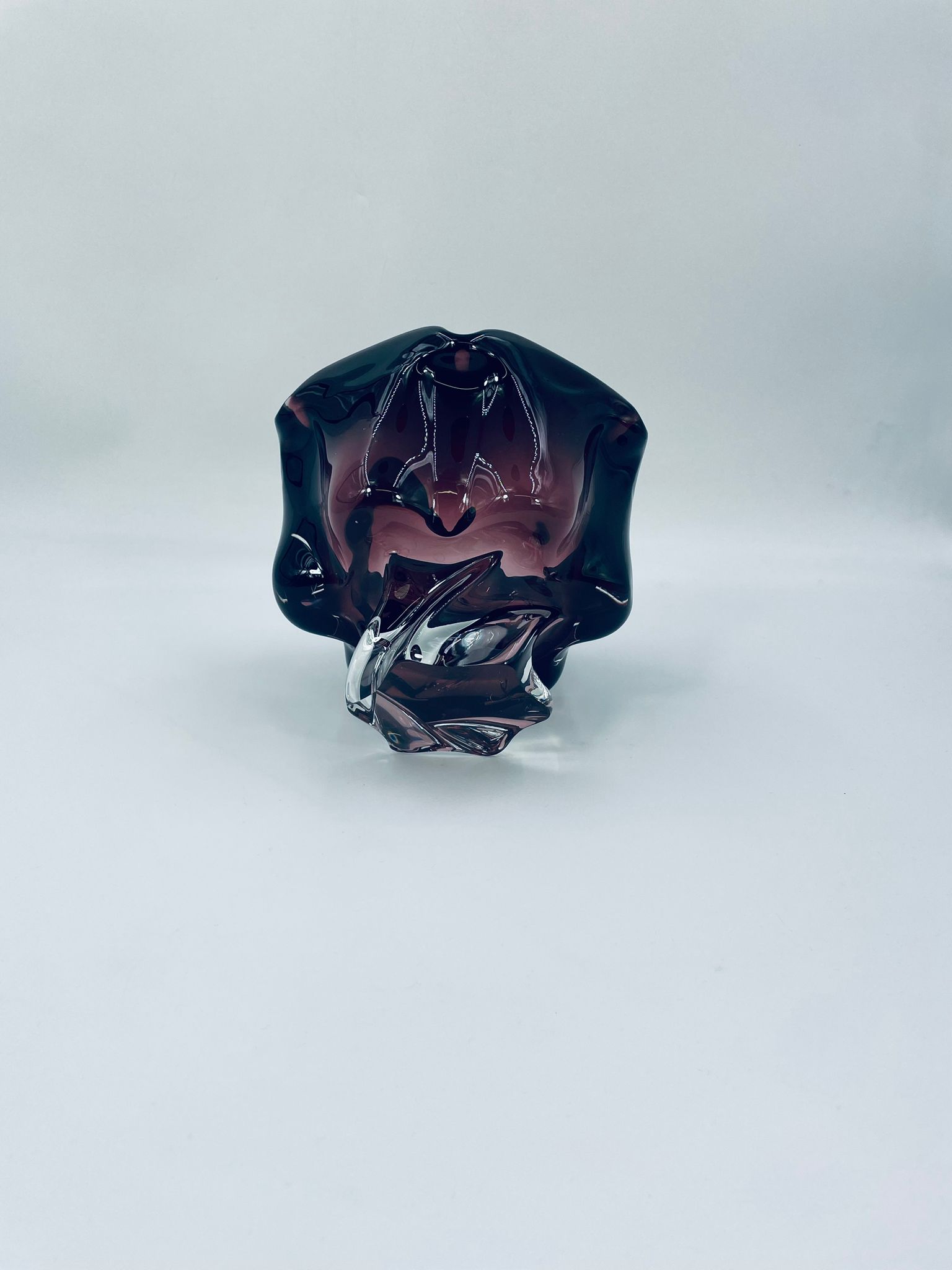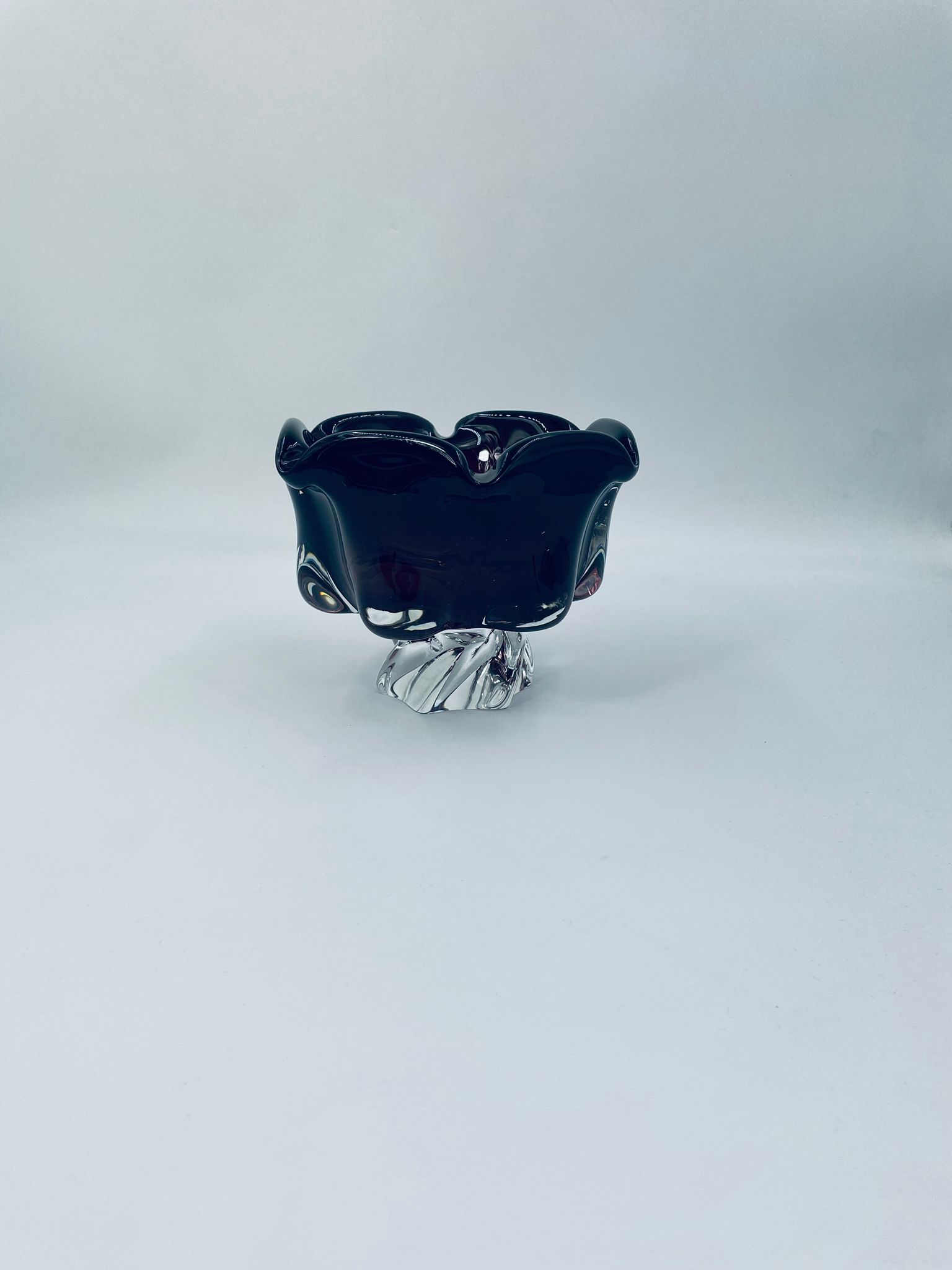 Misa/ wazon wykonana z ciężkiego szkła Murano w kolorze ciemnego fioletu z przezroczystą podstawką. Charakteryzuje się falistym, nieregularnym brzegiem oraz rzeźbioną podstawą.