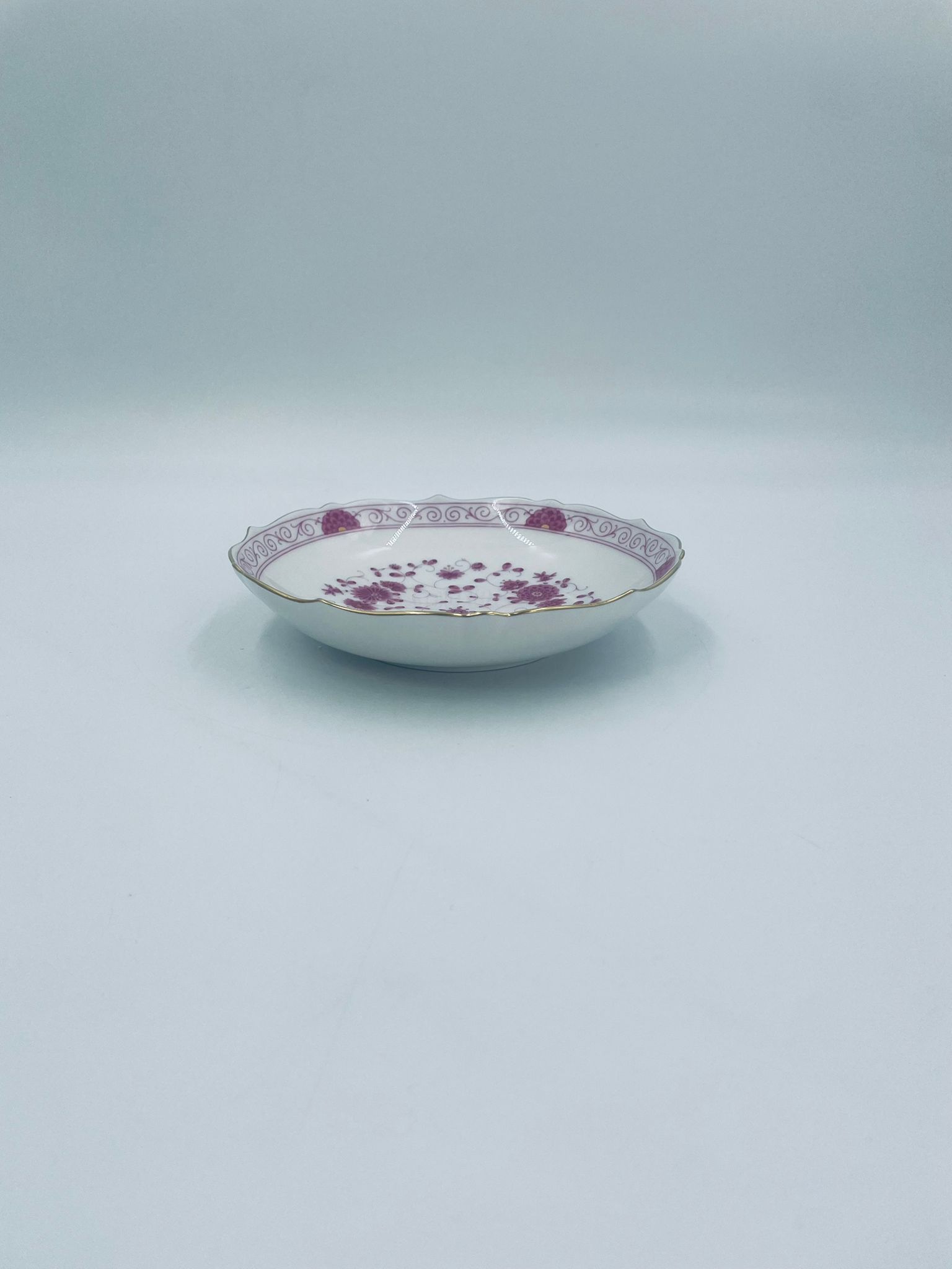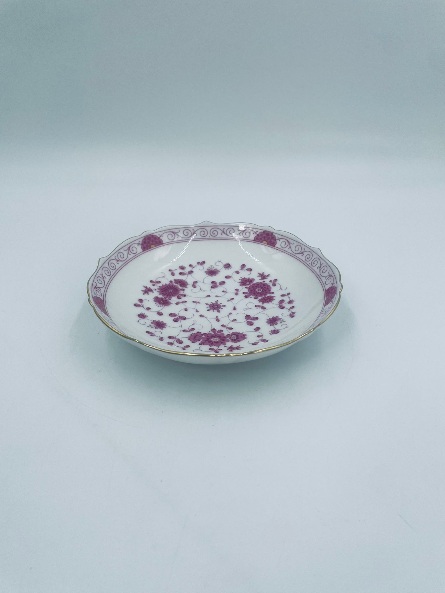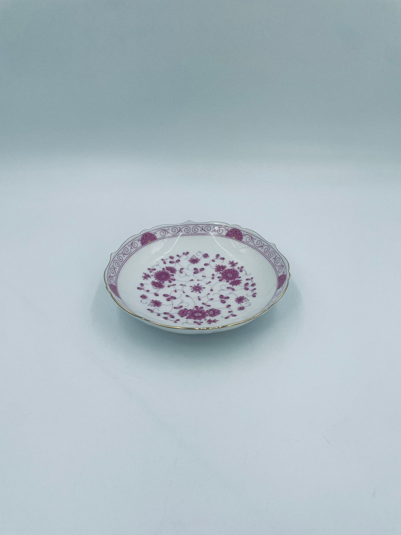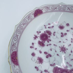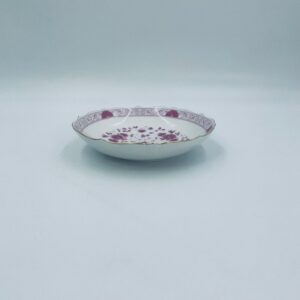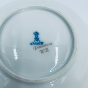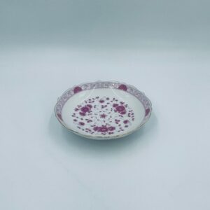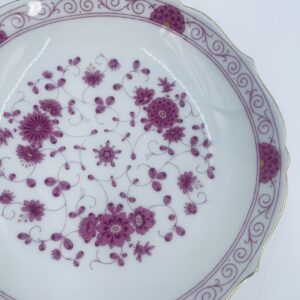 Zabytkowa i rzadka Miseczka wytwórni AK Kaiser Petersburg, wykonana z wysokiej jakości białej porcelany. Miseczka elegancka z pięknym wzorem kwiatowym w kolorze fuksji oraz z nieregularnym, złoconym górnym rantem.