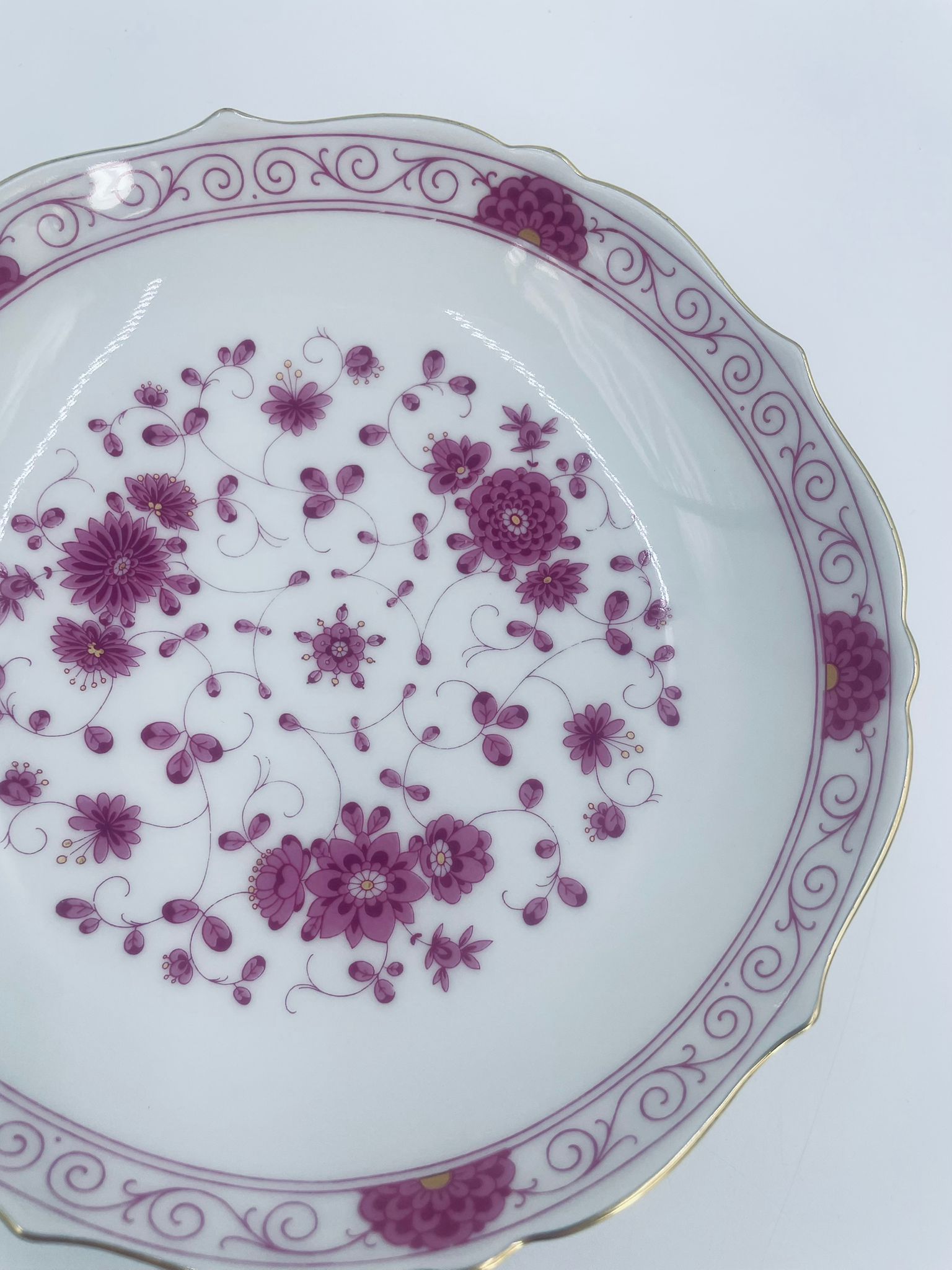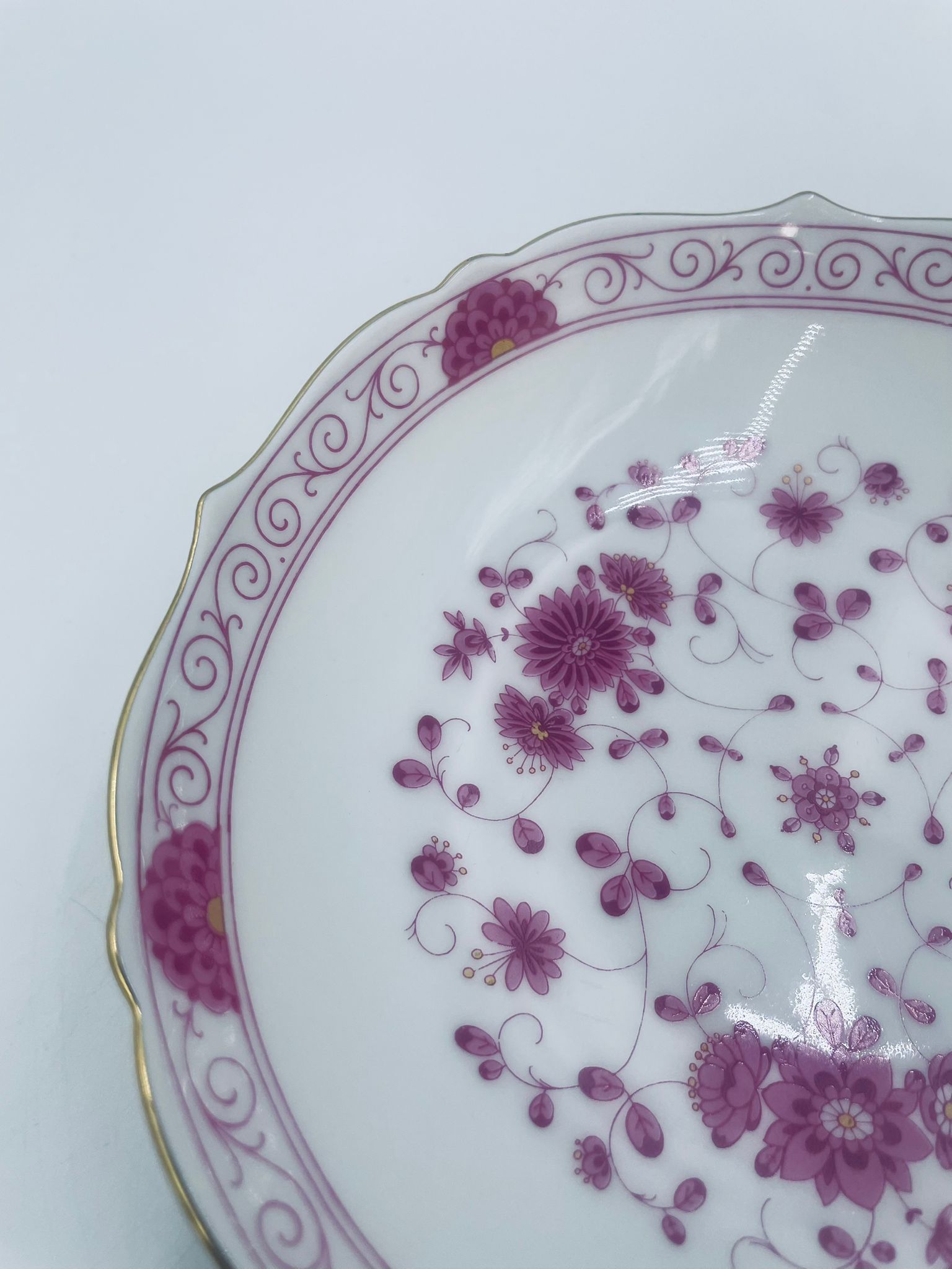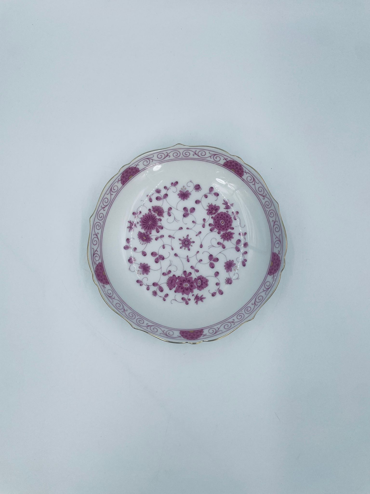 Zabytkowa i rzadka Miseczka wytwórni AK Kaiser Petersburg, wykonana z wysokiej jakości białej porcelany. Miseczka elegancka z pięknym wzorem kwiatowym w kolorze fuksji oraz z nieregularnym, złoconym górnym rantem.