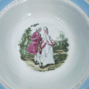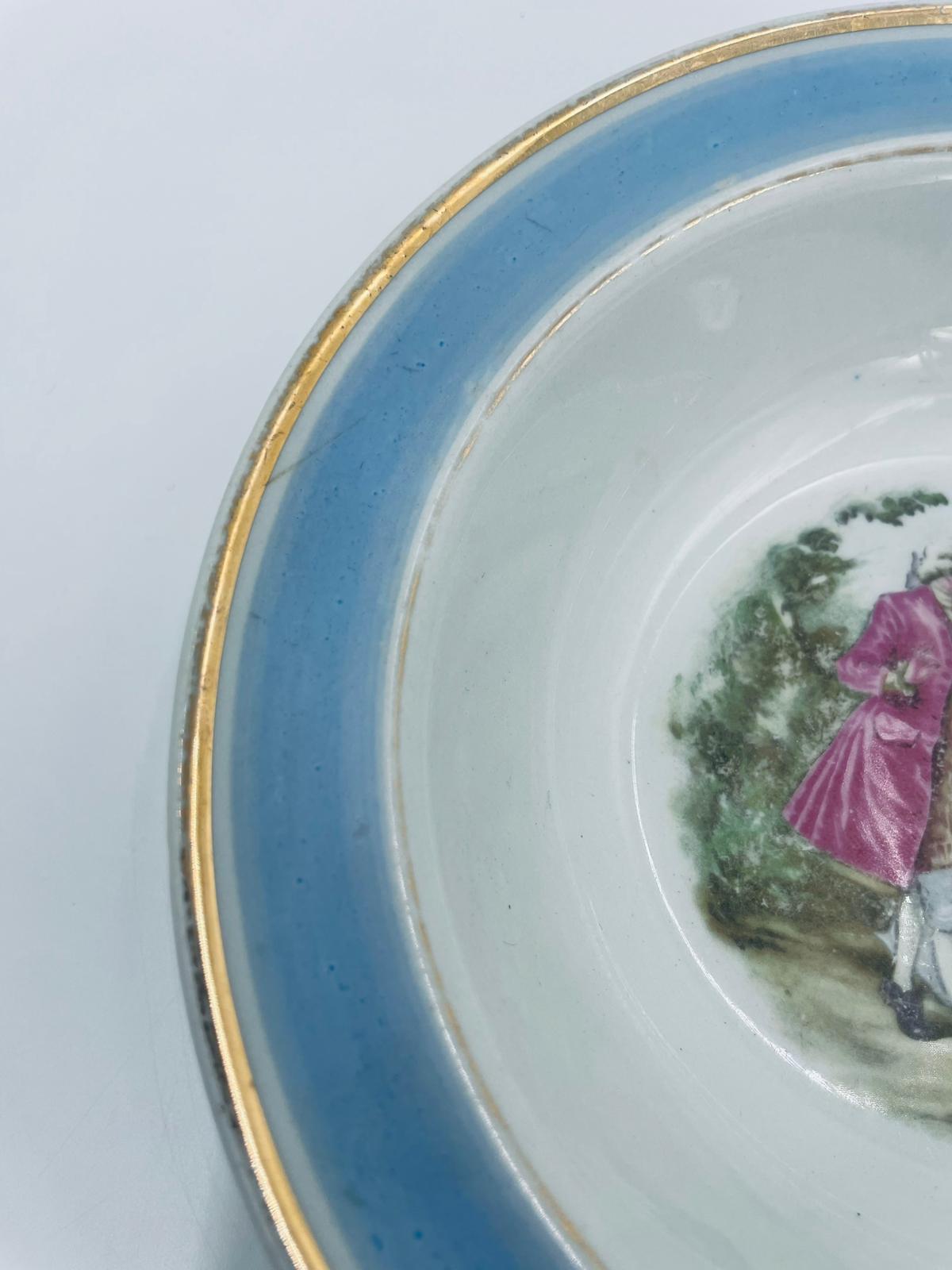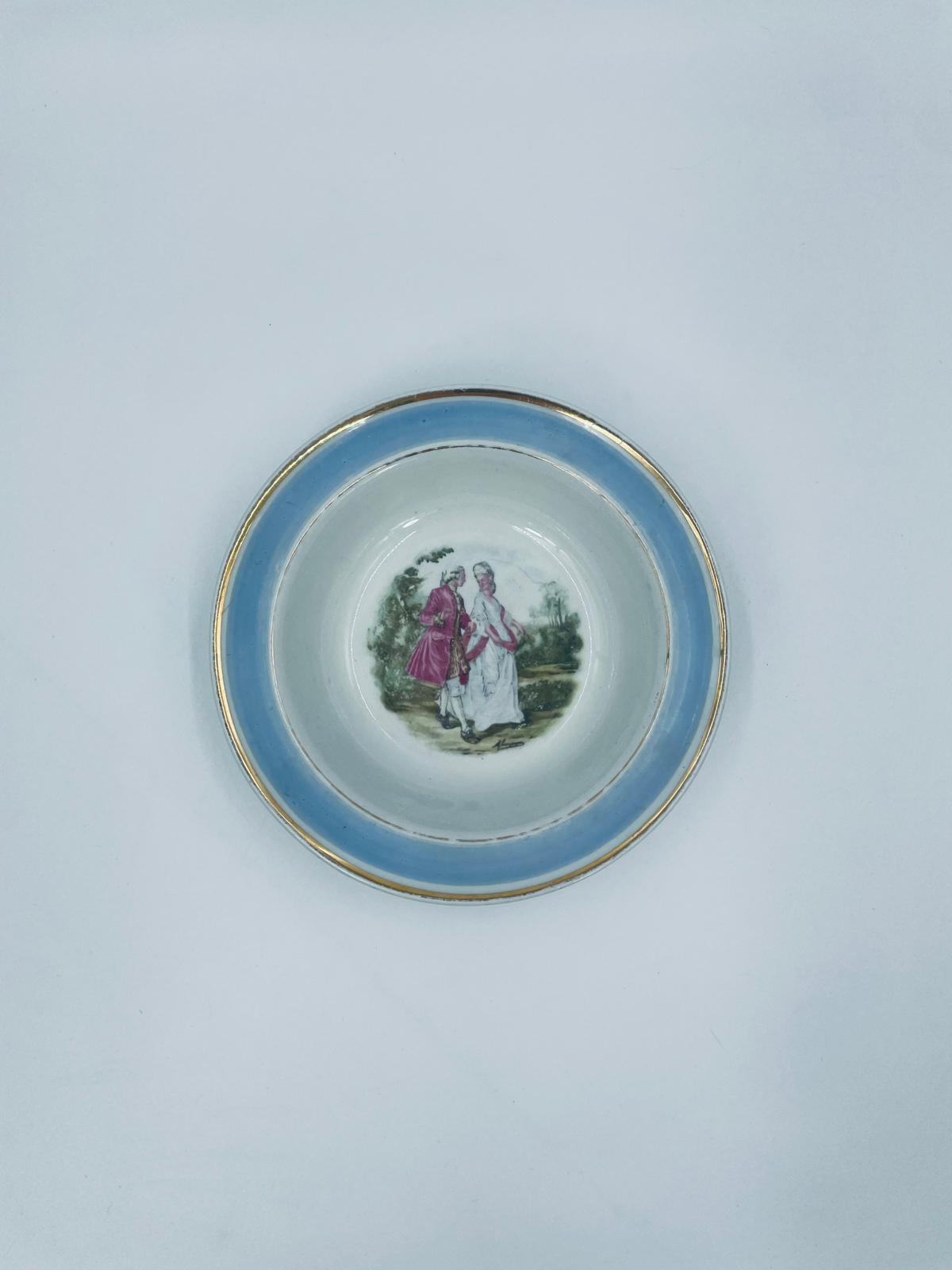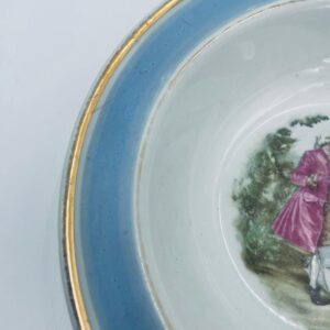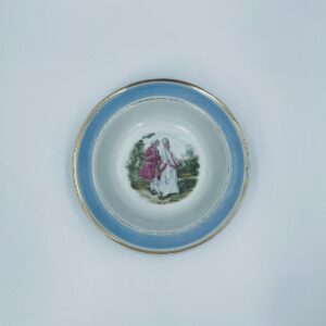 Miseczka dekoracyjna wytwórni Arabia Romantica, wyprodukowana w Finlandii, wykonana z wysokiej jakości porcelany. Miseczka ozdobiona sceną rodzajową z dwiema postaciami w strojach z epoki, jasnoniebieskim szerokim brzegiem ze złotym akcentem. Posiada przetarcie na złoceniu.