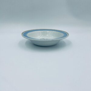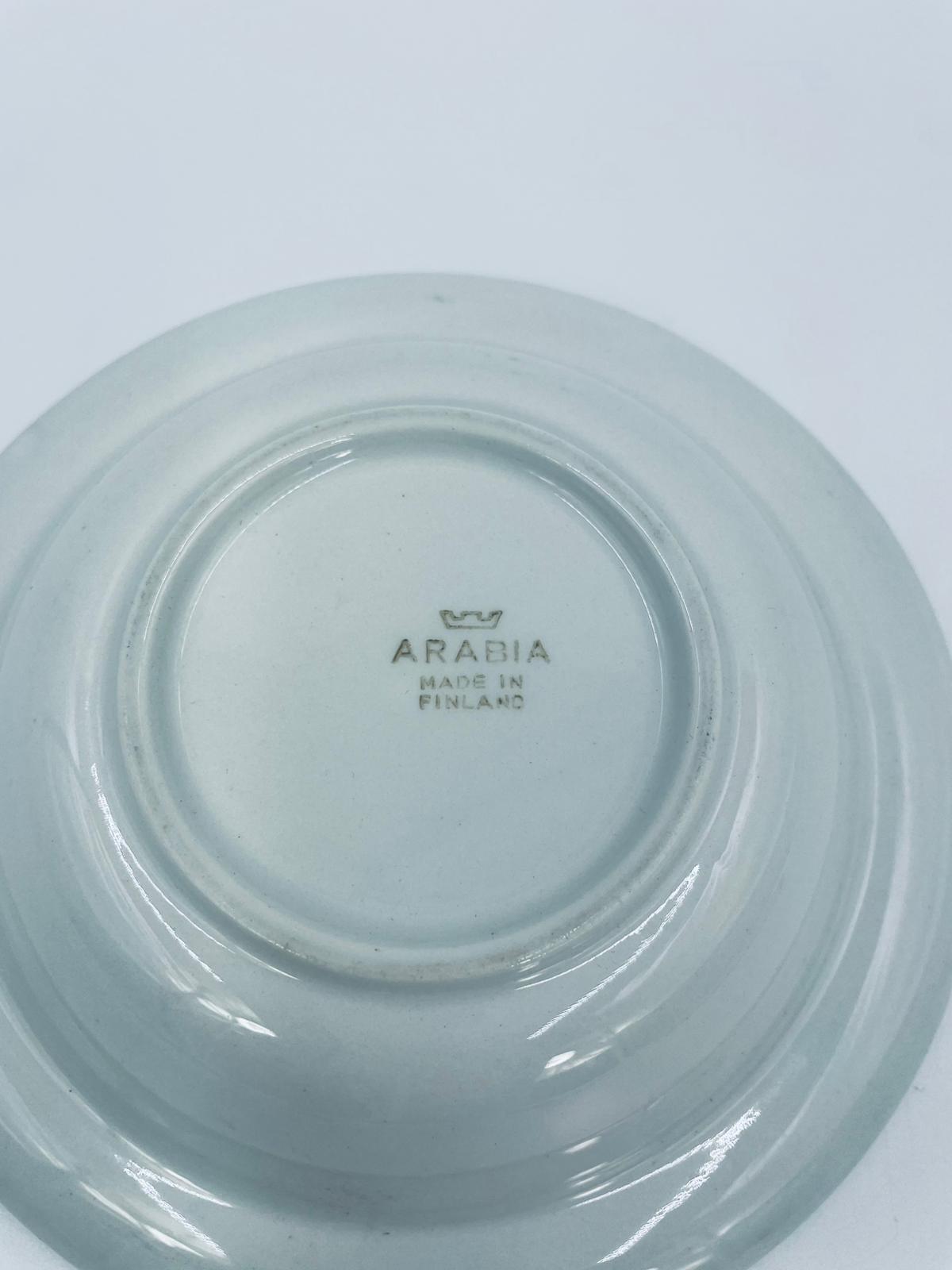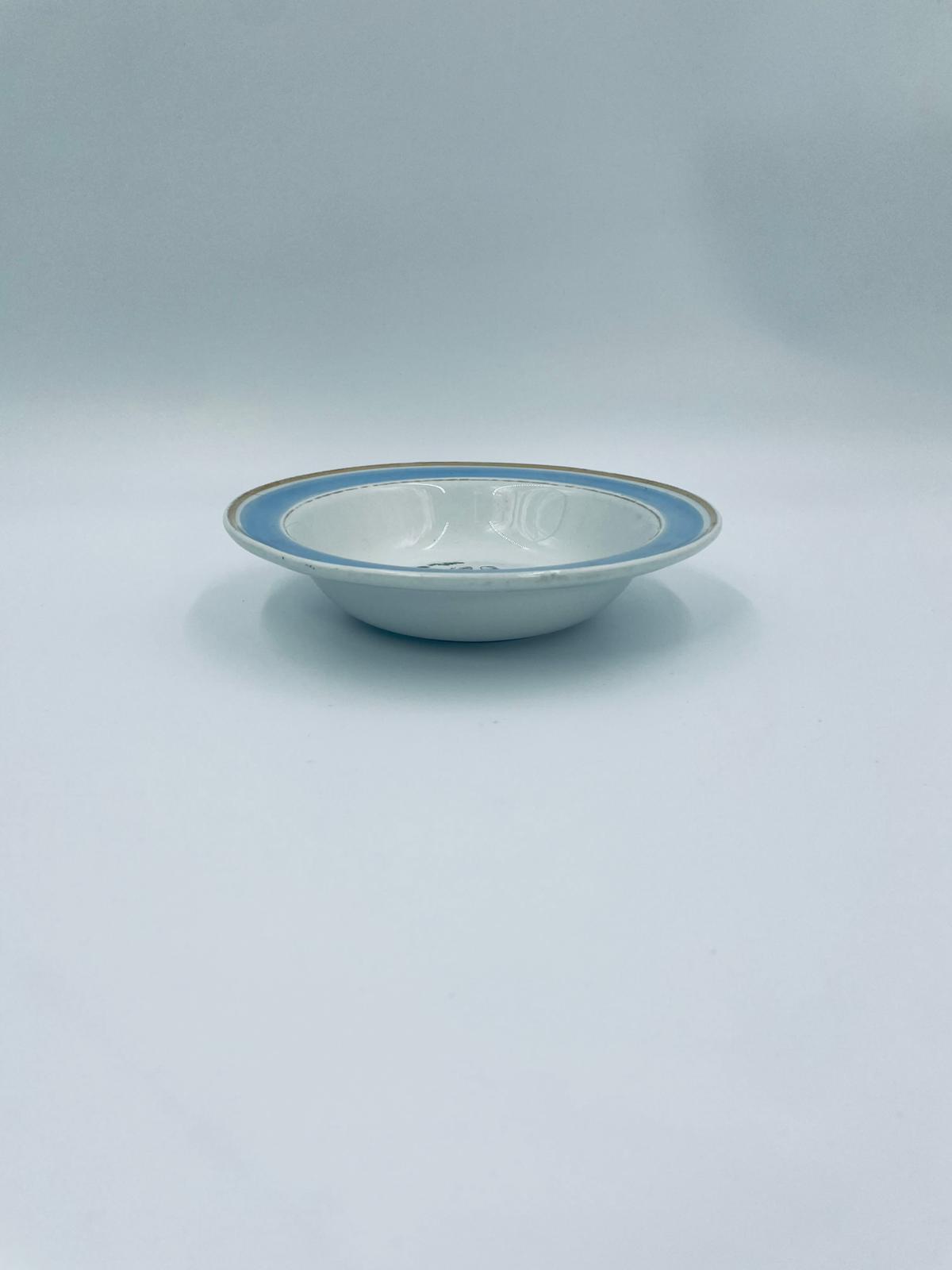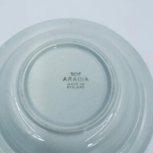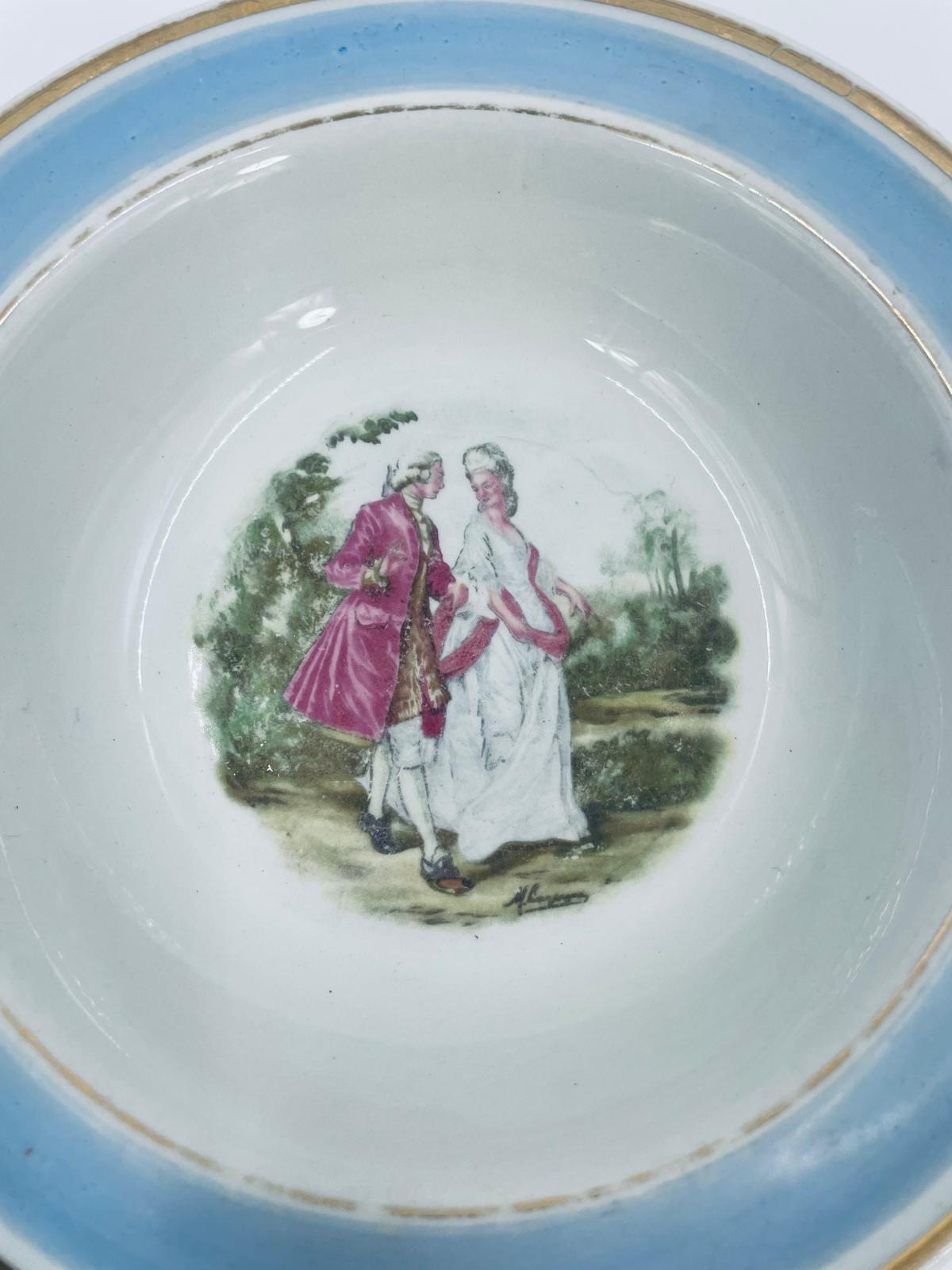 Miseczka dekoracyjna wytwórni Arabia Romantica, wyprodukowana w Finlandii, wykonana z wysokiej jakości porcelany. Miseczka ozdobiona sceną rodzajową z dwiema postaciami w strojach z epoki, jasnoniebieskim szerokim brzegiem ze złotym akcentem. Posiada przetarcie na złoceniu.