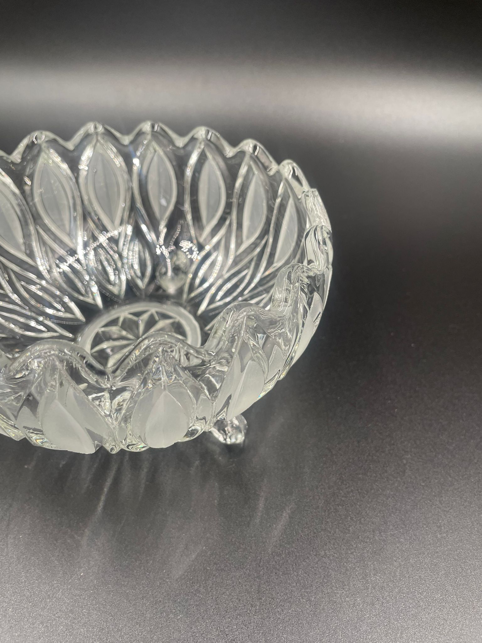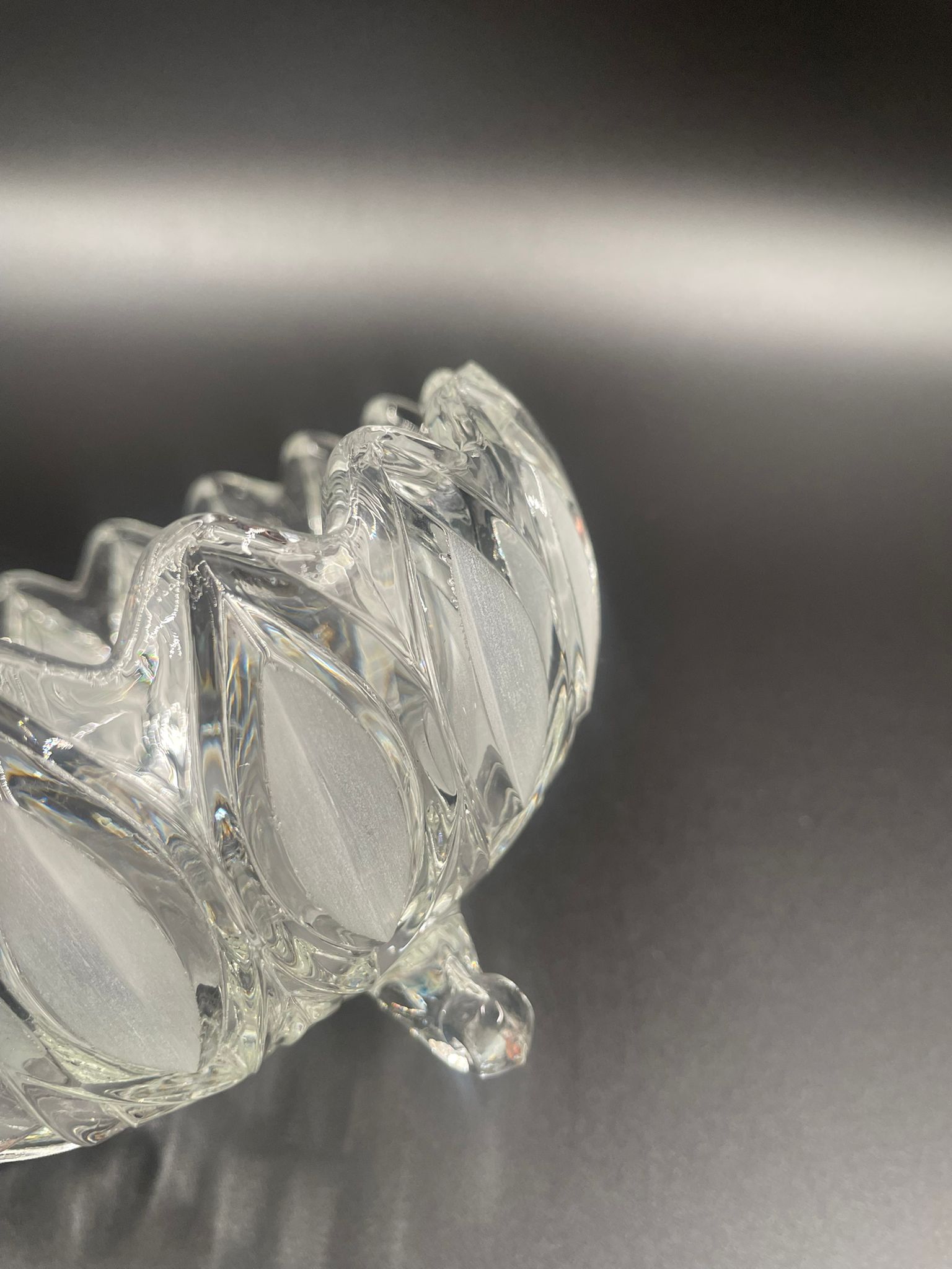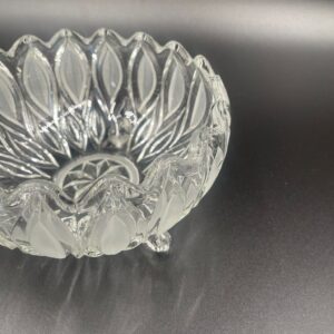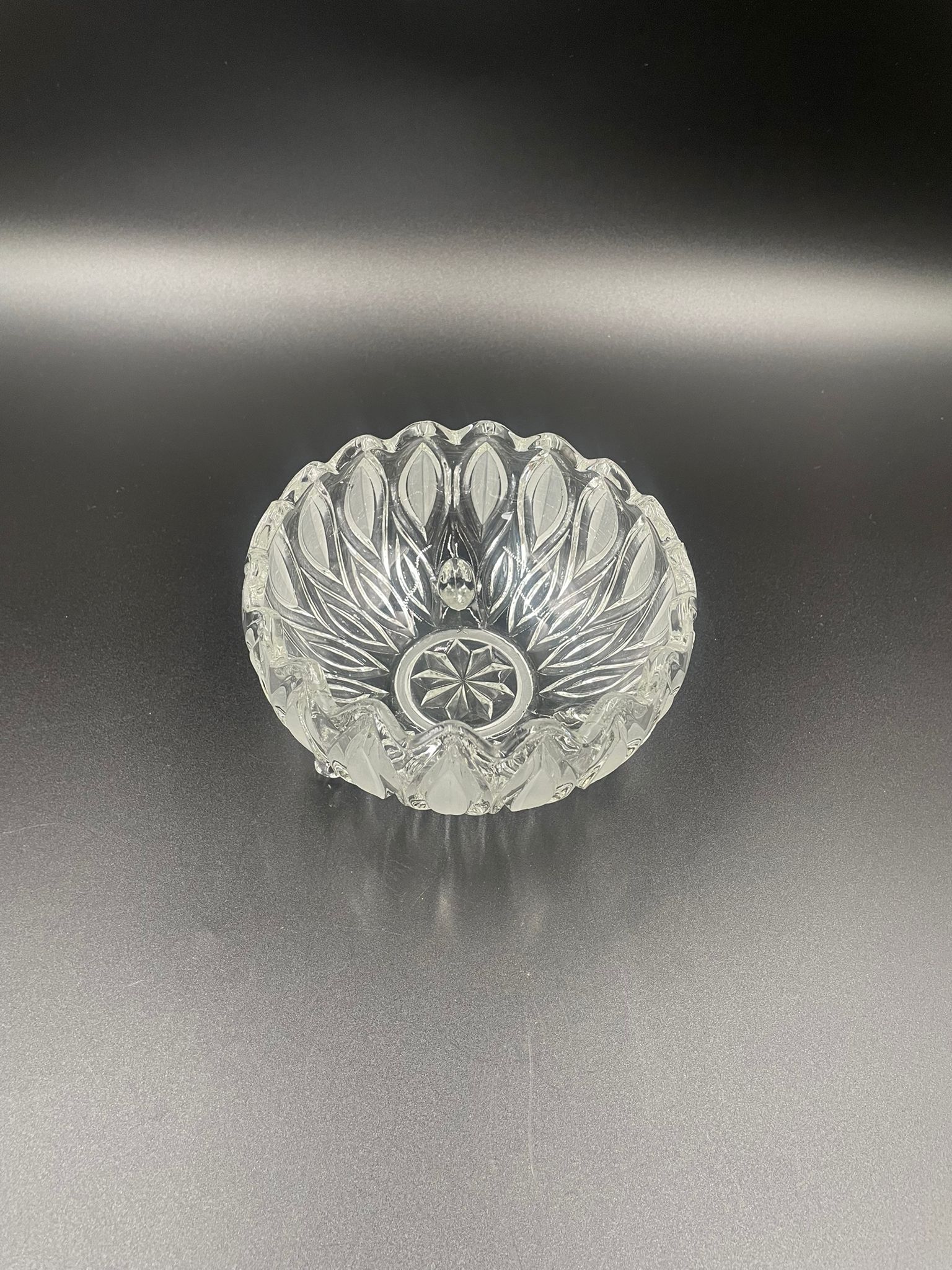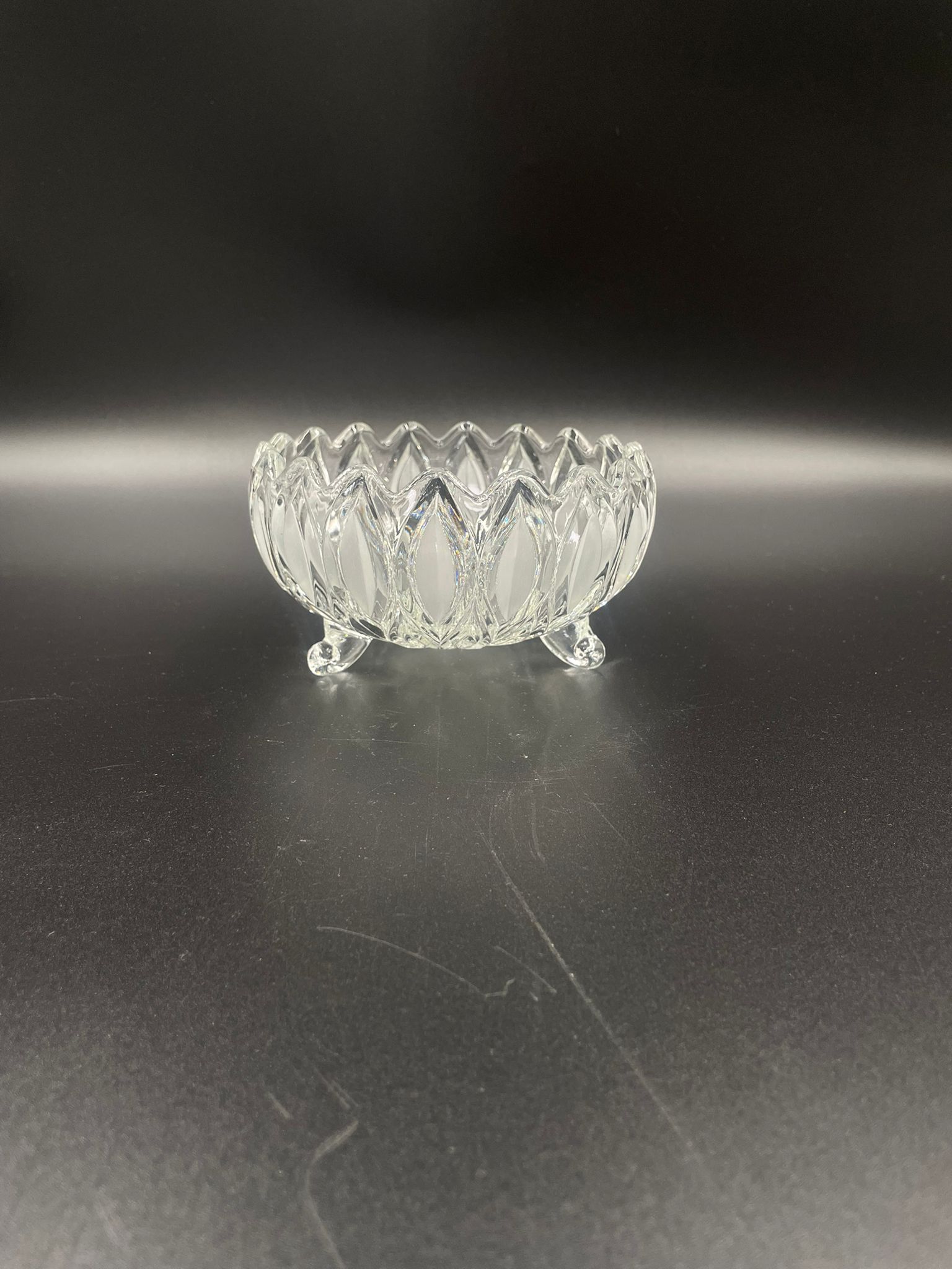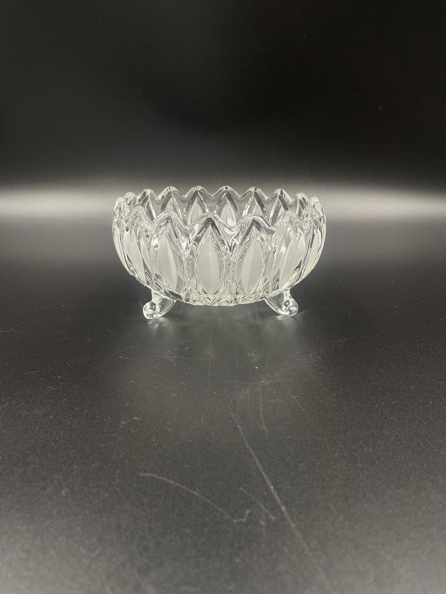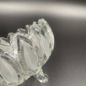 Miseczka dekoracyjna wytwórni Lousitzer serii Orion z lat 60tych, wykonana z wysokiej jakości szkła kryształowego. Miseczka osadzona na trzech ozdobnych nóżkach, z falistym górnym brzegiem, ozdobiona ręcznym, bogatym szlifem z matowym wzorem przypominającym płatki lub liście.