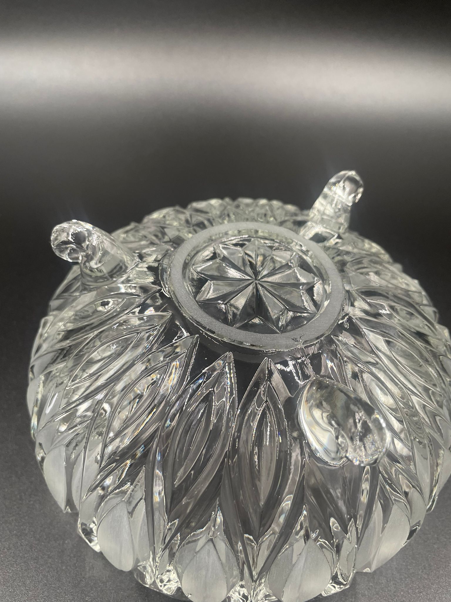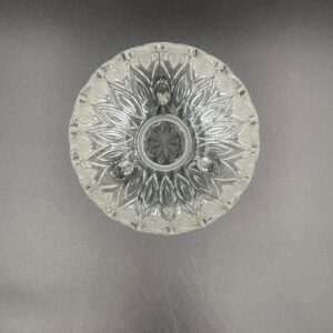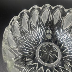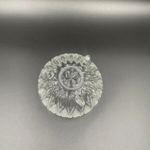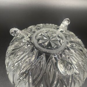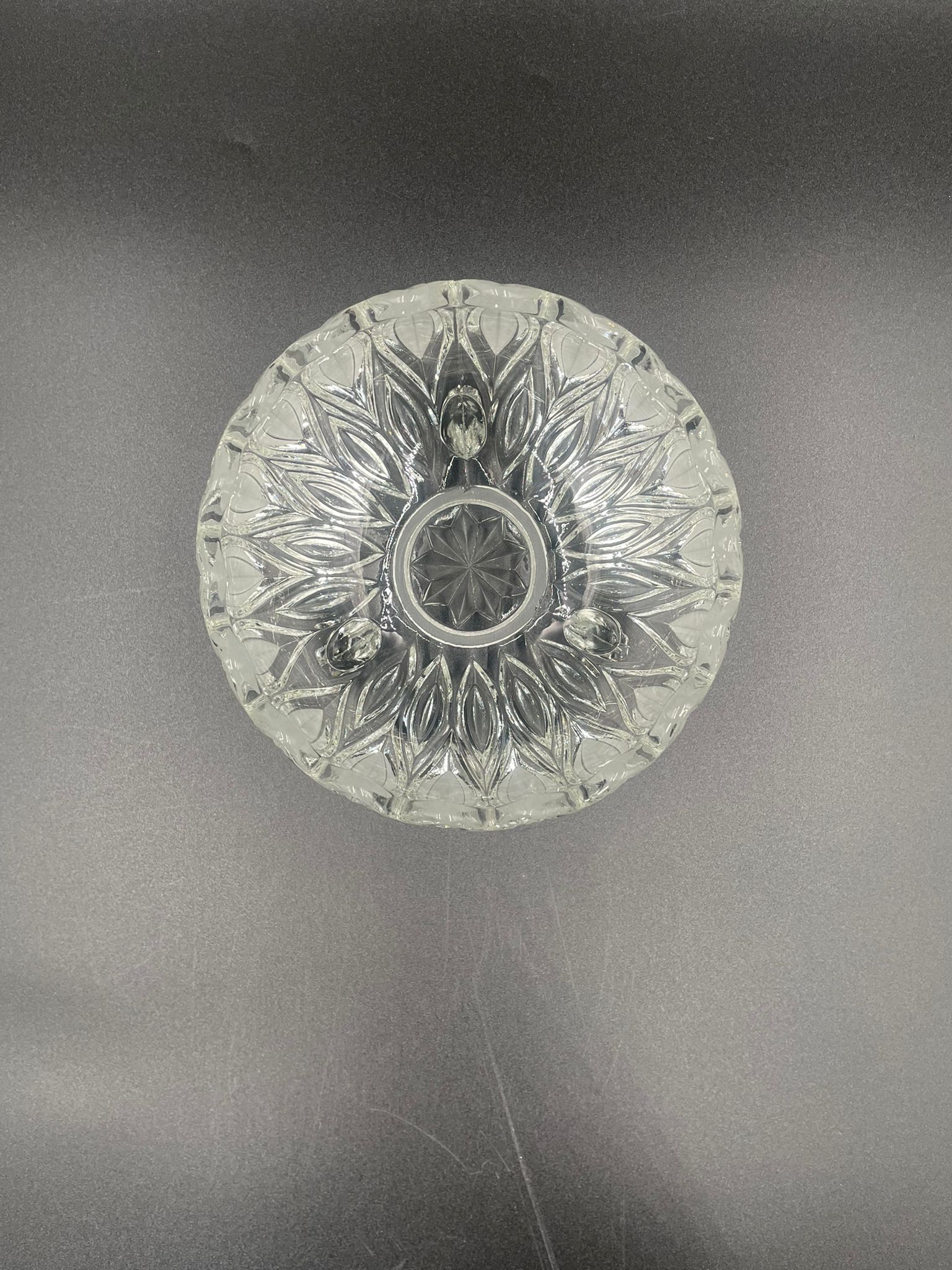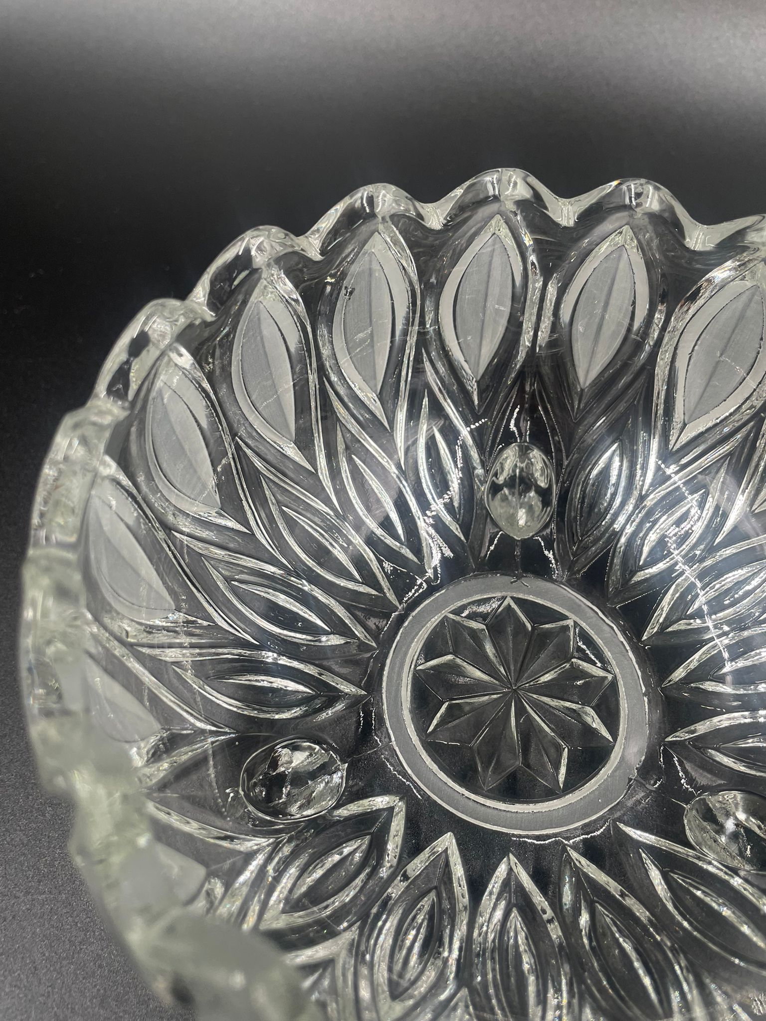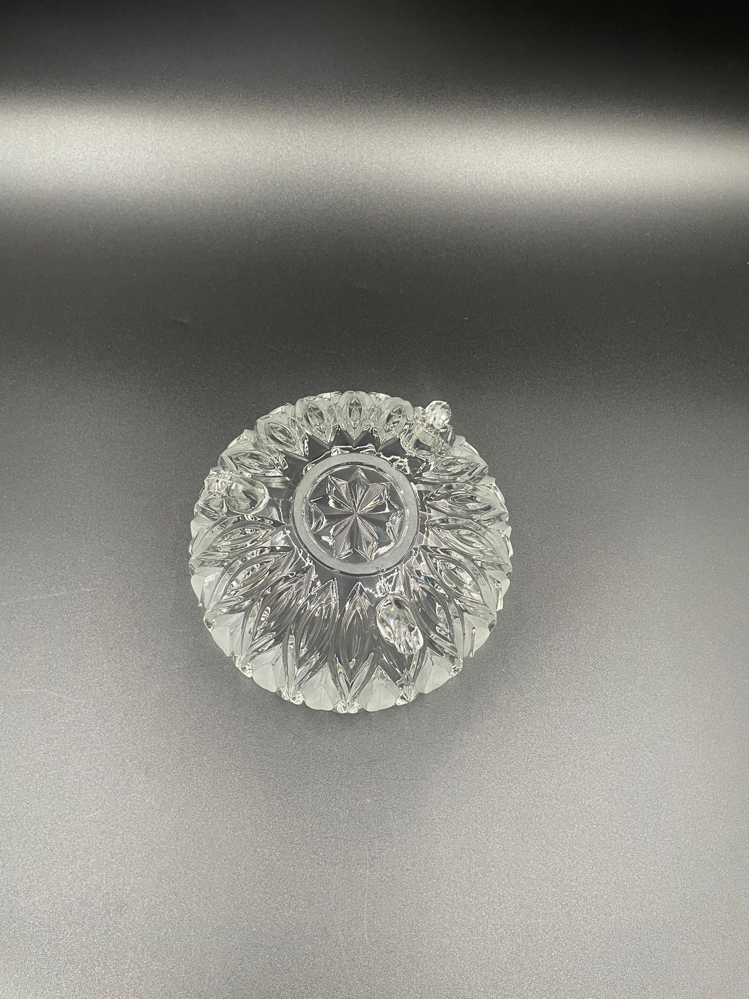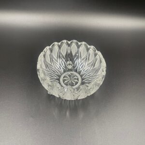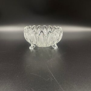 Miseczka dekoracyjna wytwórni Lousitzer serii Orion z lat 60tych, wykonana z wysokiej jakości szkła kryształowego. Miseczka osadzona na trzech ozdobnych nóżkach, z falistym górnym brzegiem, ozdobiona ręcznym, bogatym szlifem z matowym wzorem przypominającym płatki lub liście.