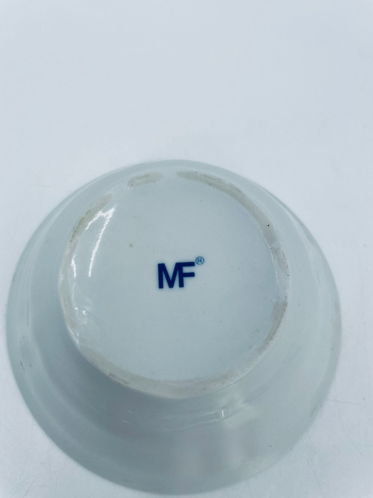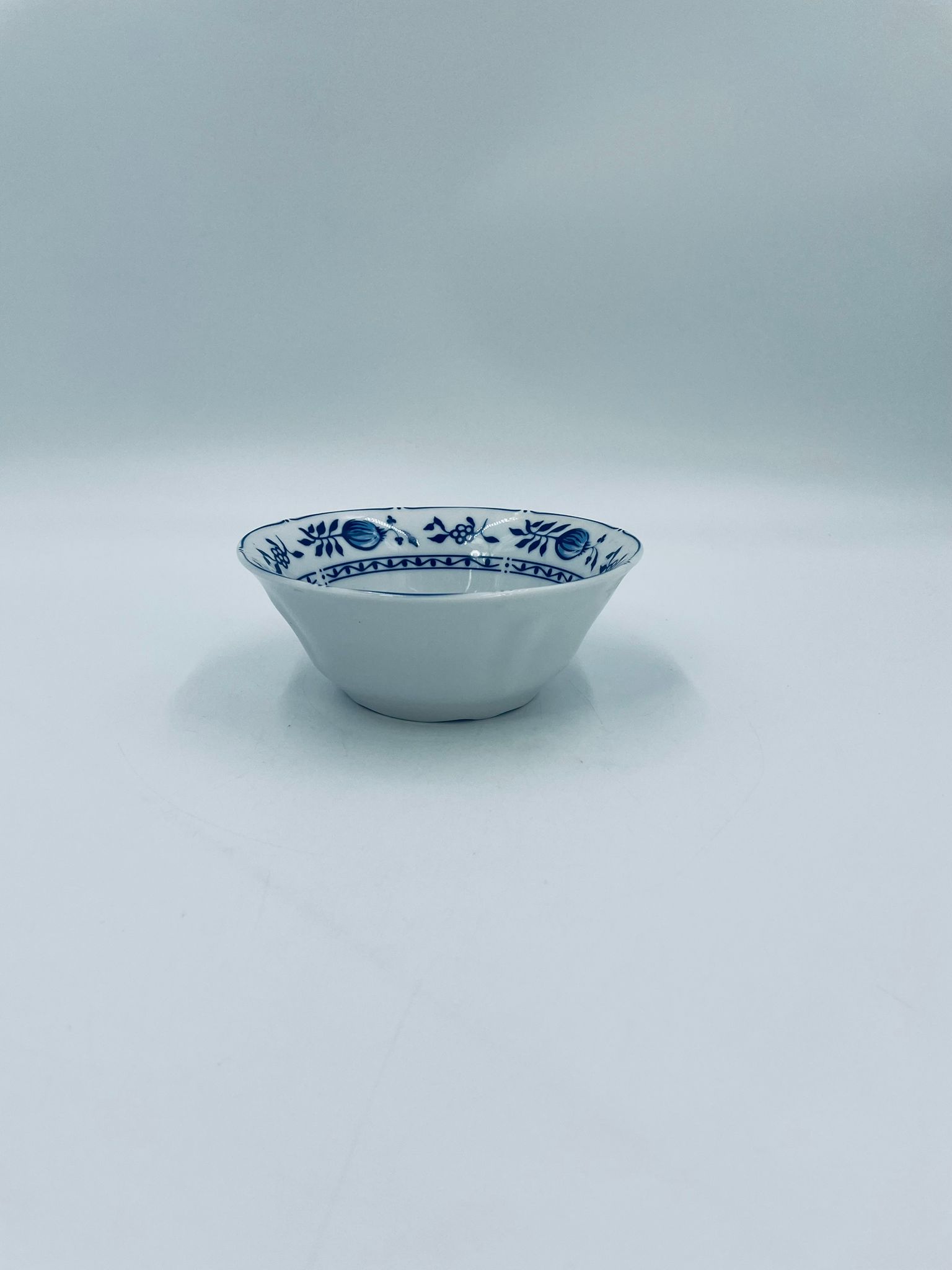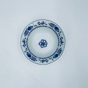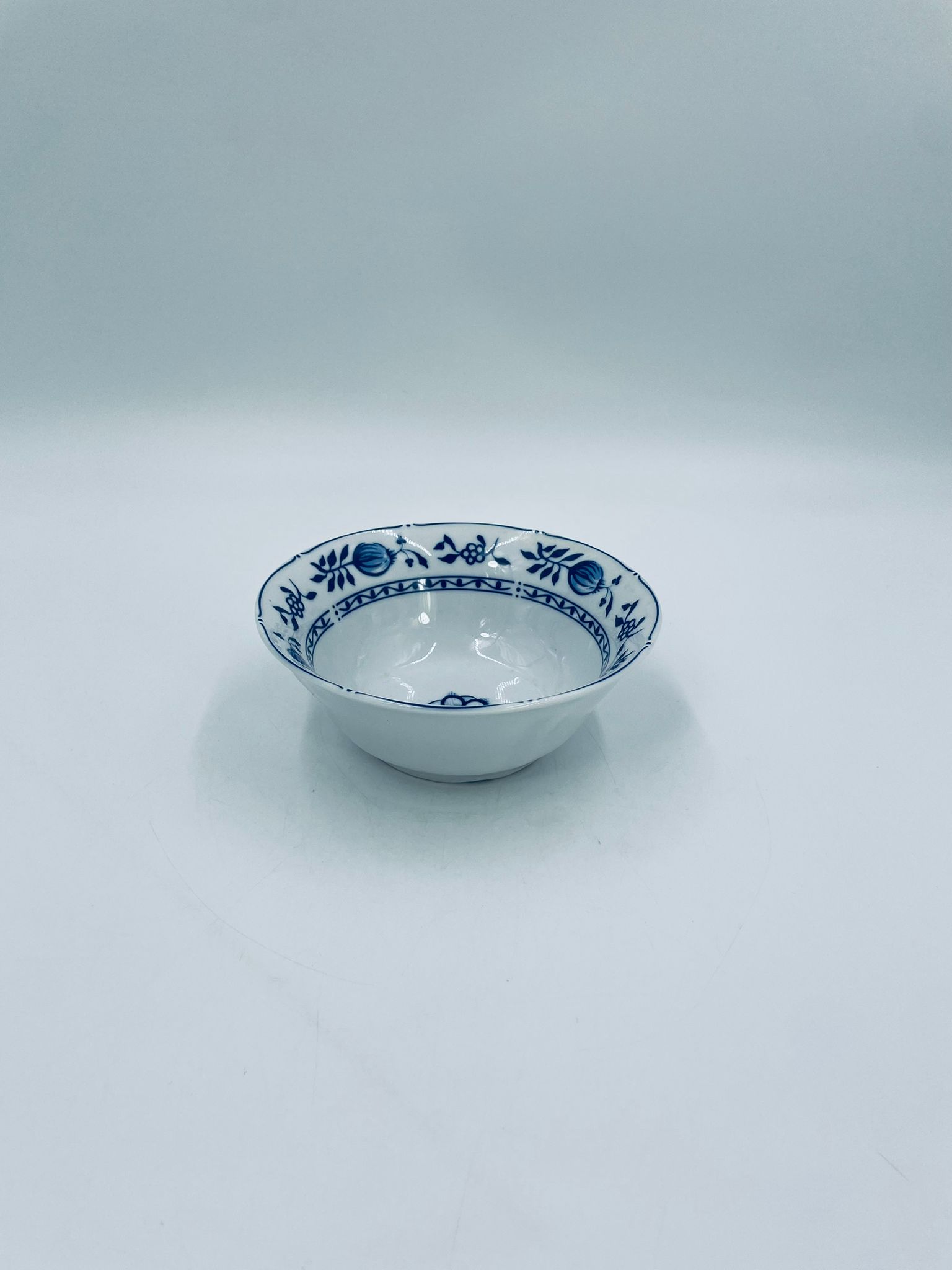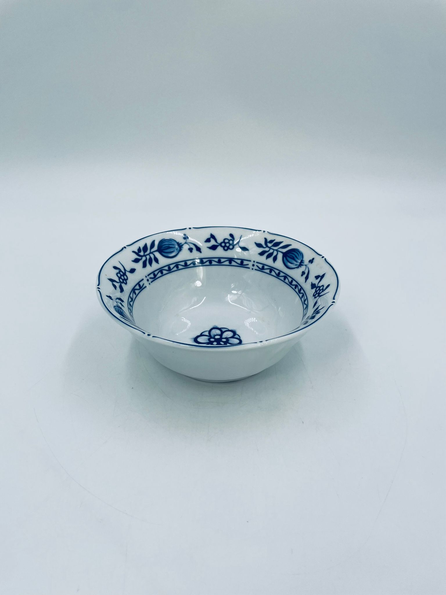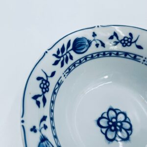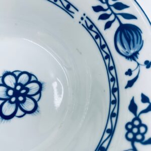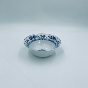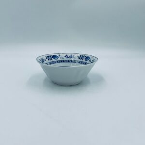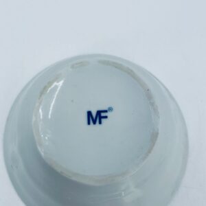 Miseczka wytwórni MF, wykonana z wysokiej jakości białej porcelany. Miseczka zdobiona tradycyjnym wzorem cebulowym z motywem roślinnym w kobaltowym kolorze. Posiada małe przebarwienie.