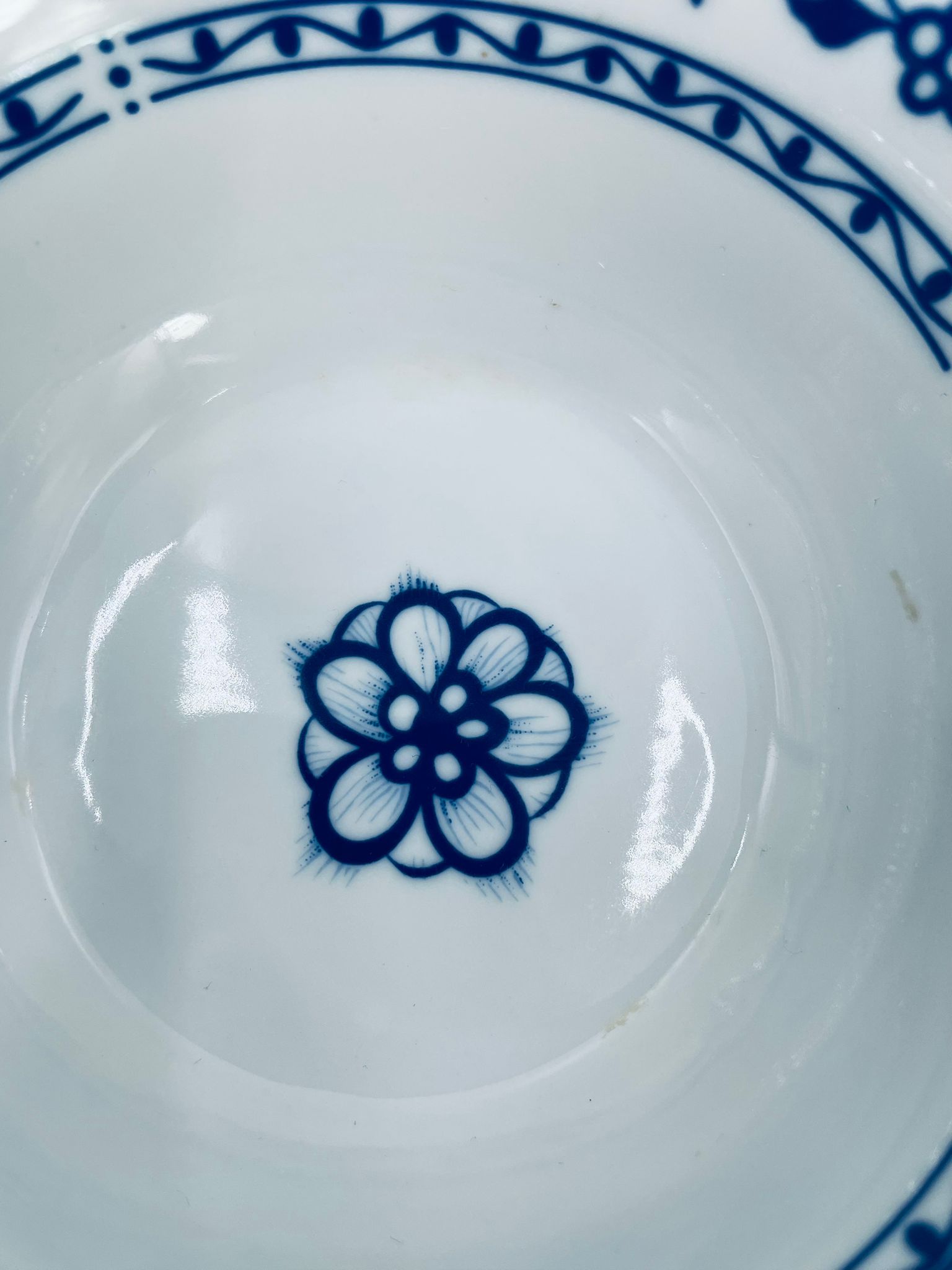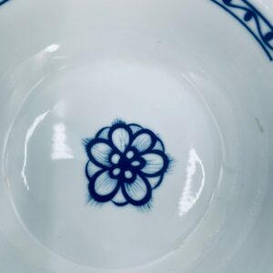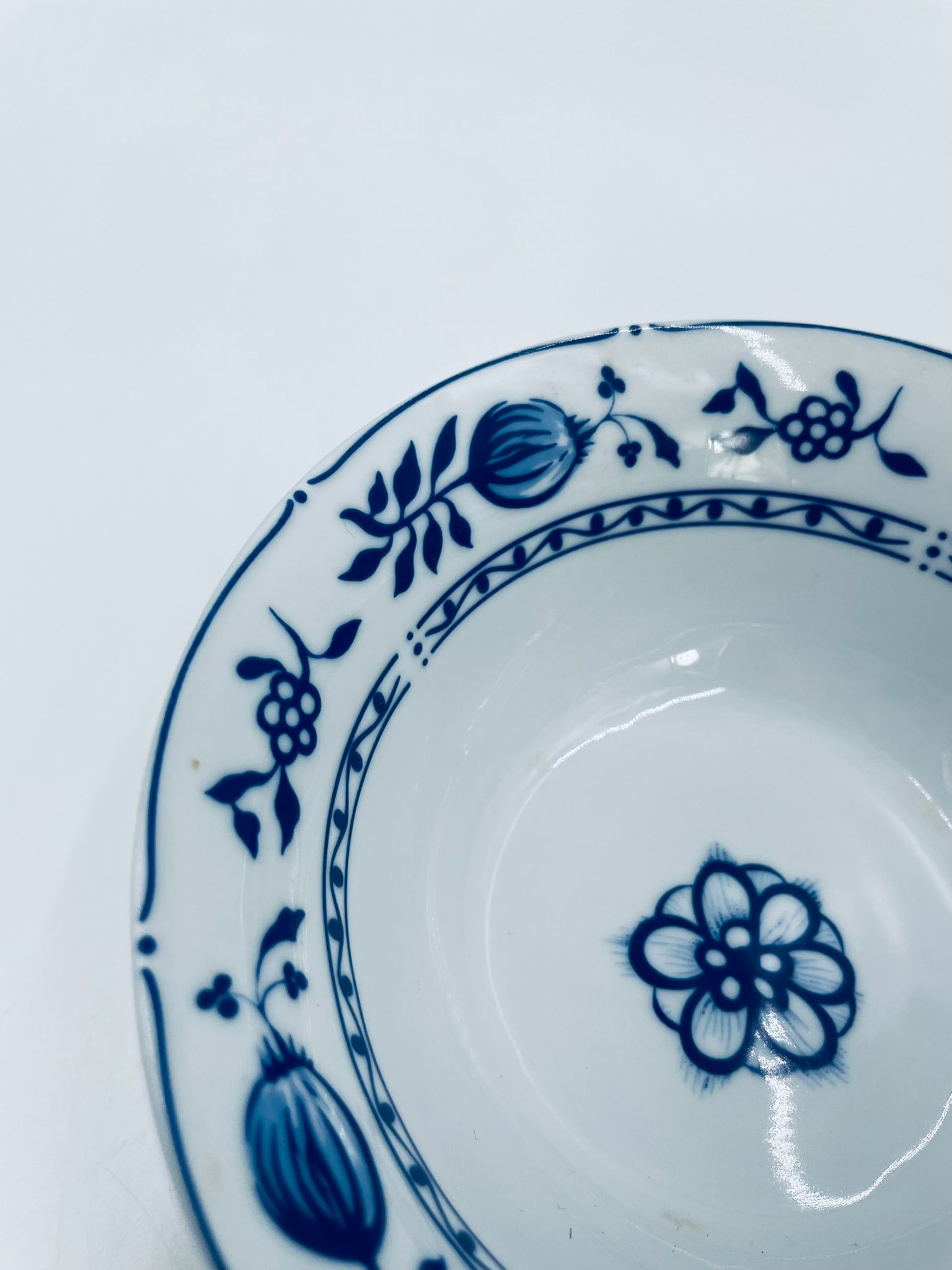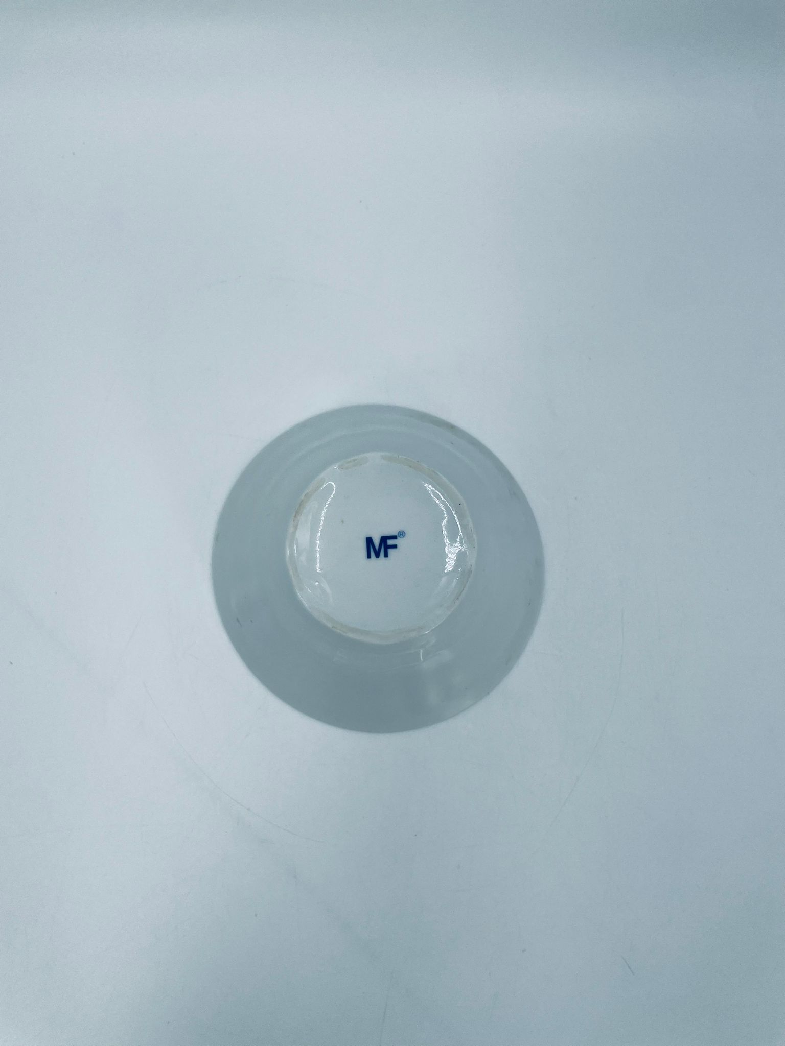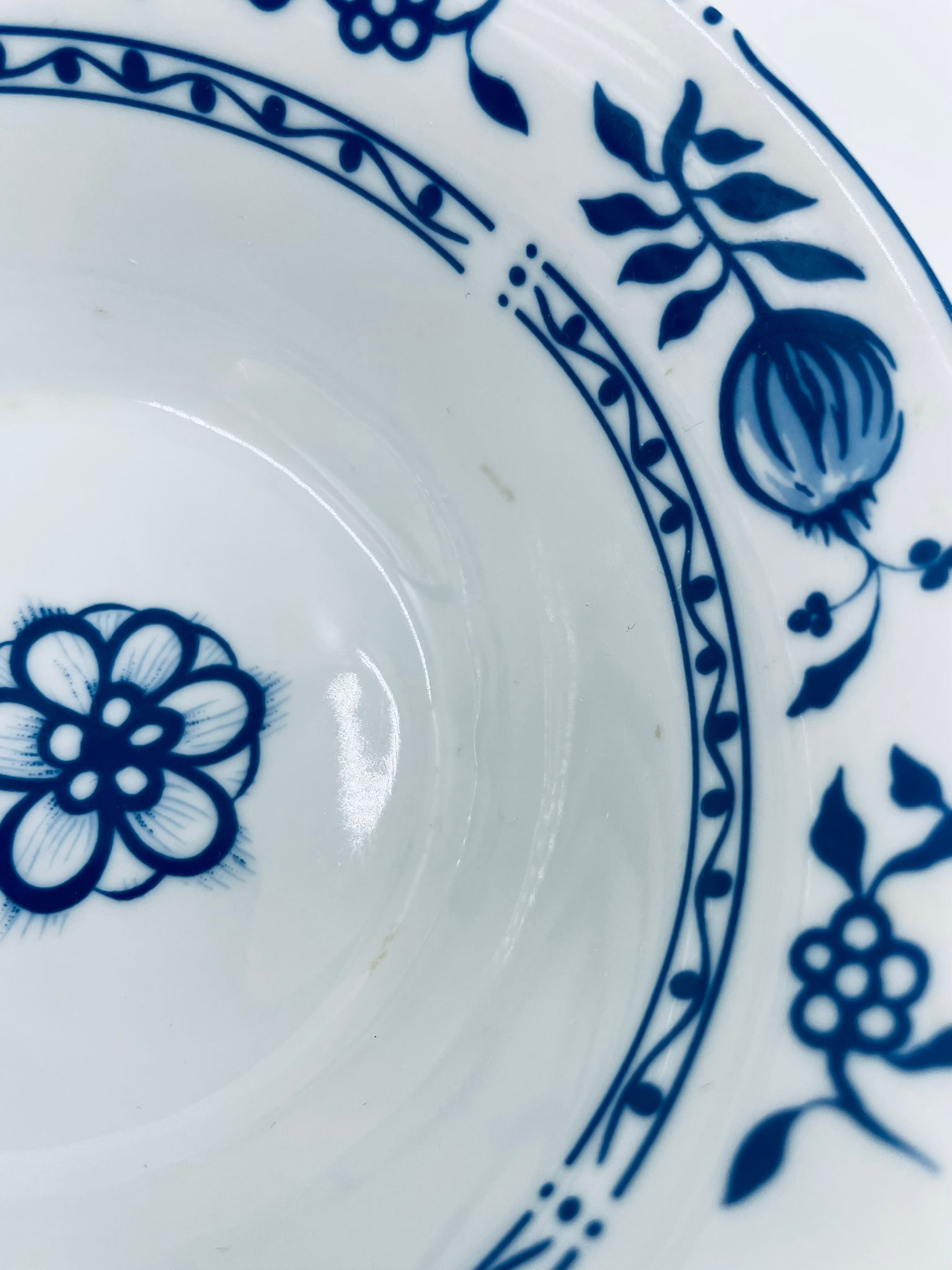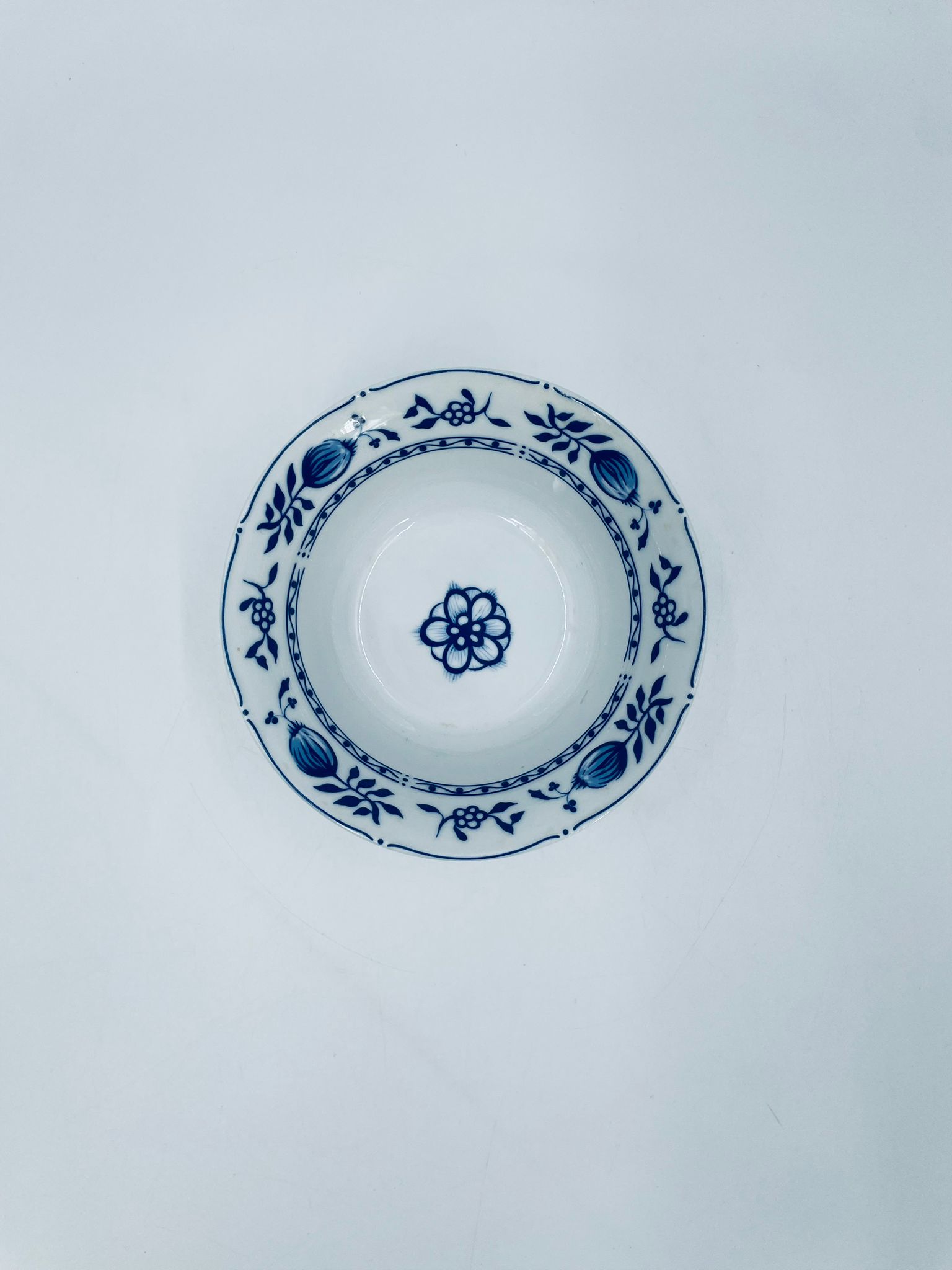 Miseczka wytwórni MF, wykonana z wysokiej jakości białej porcelany. Miseczka zdobiona tradycyjnym wzorem cebulowym z motywem roślinnym w kobaltowym kolorze. Posiada małe przebarwienie.