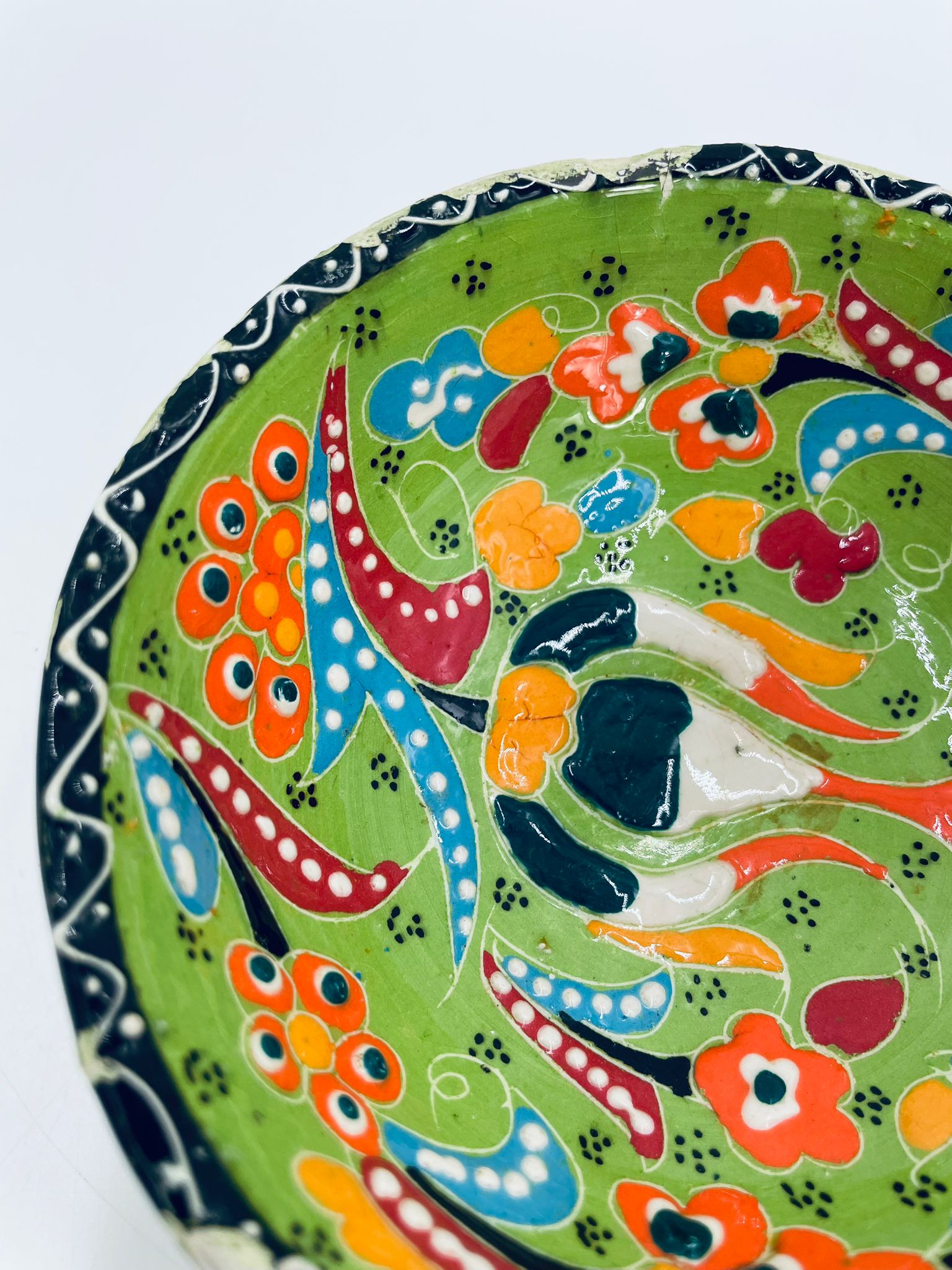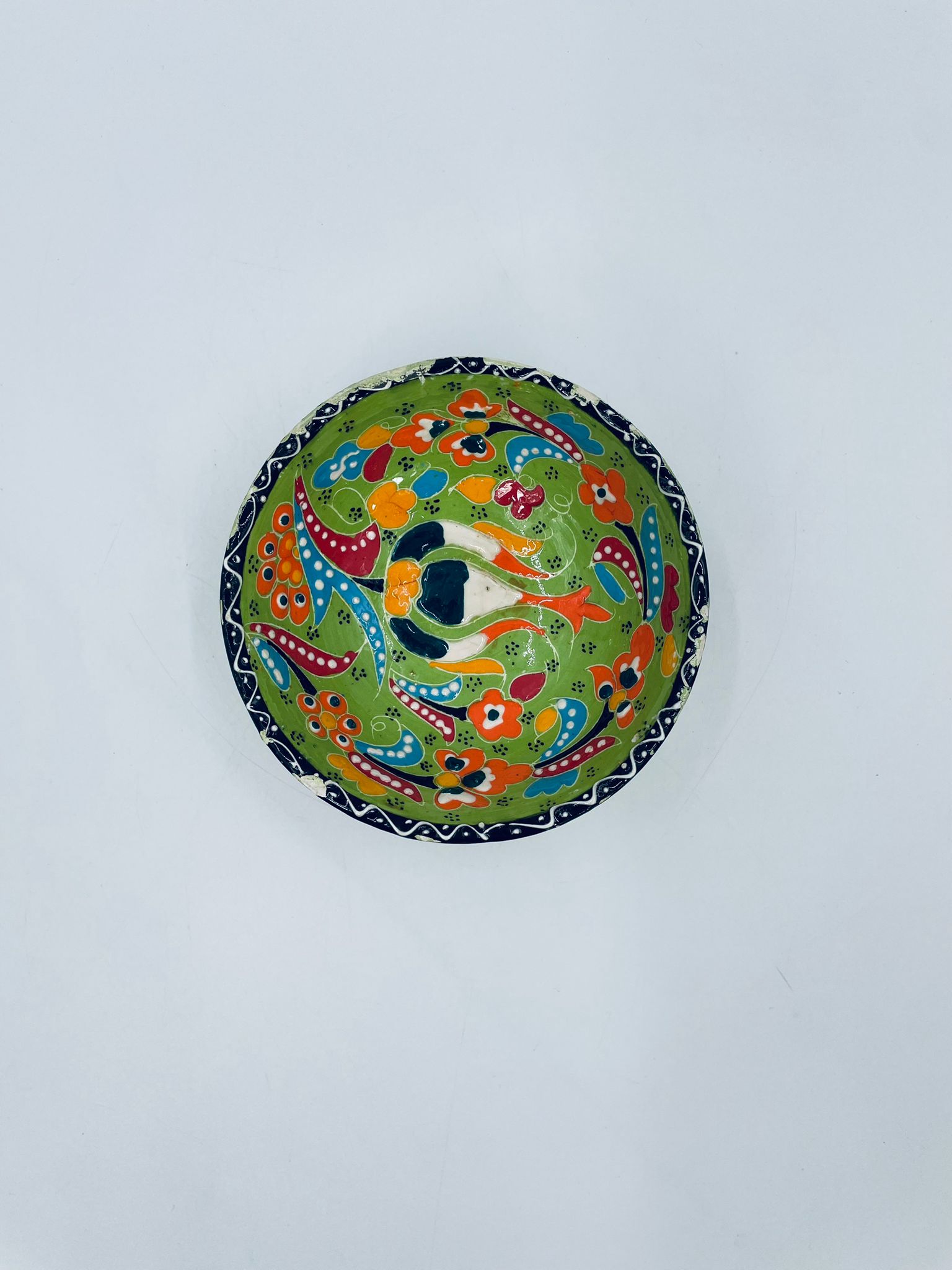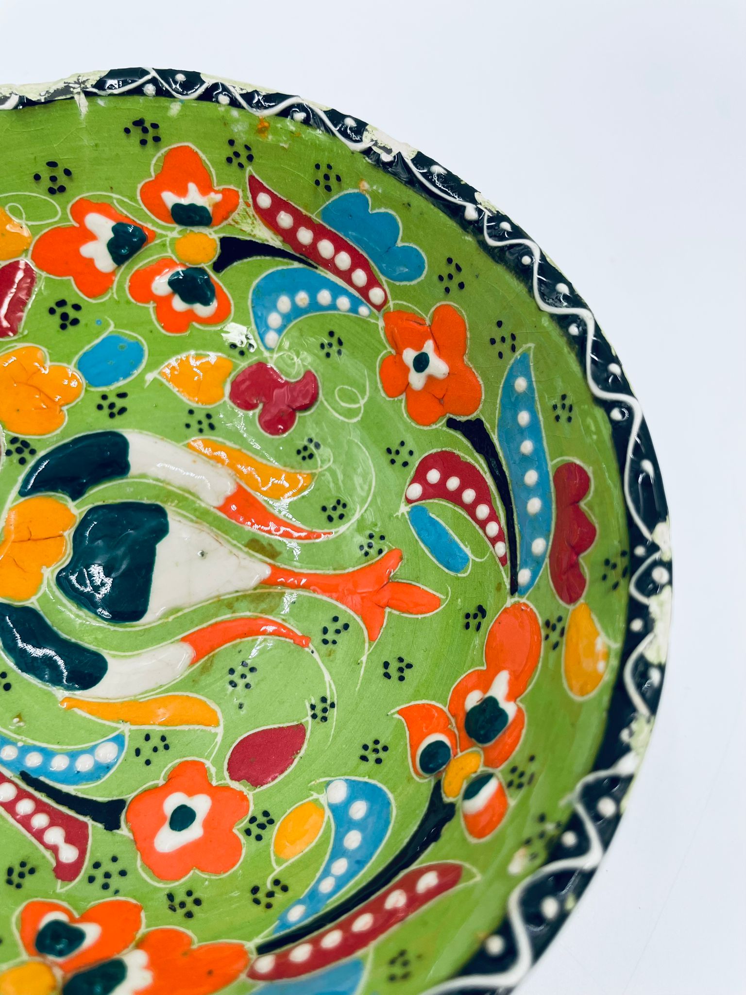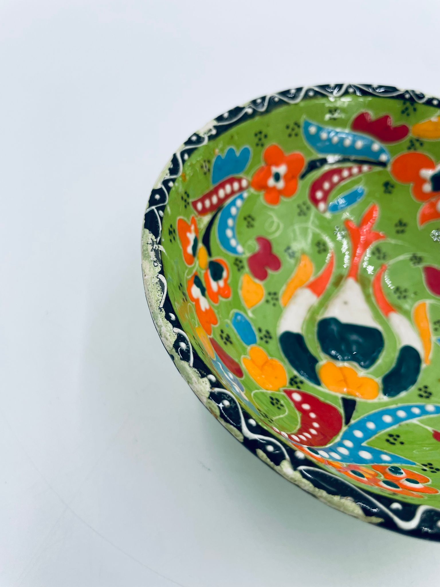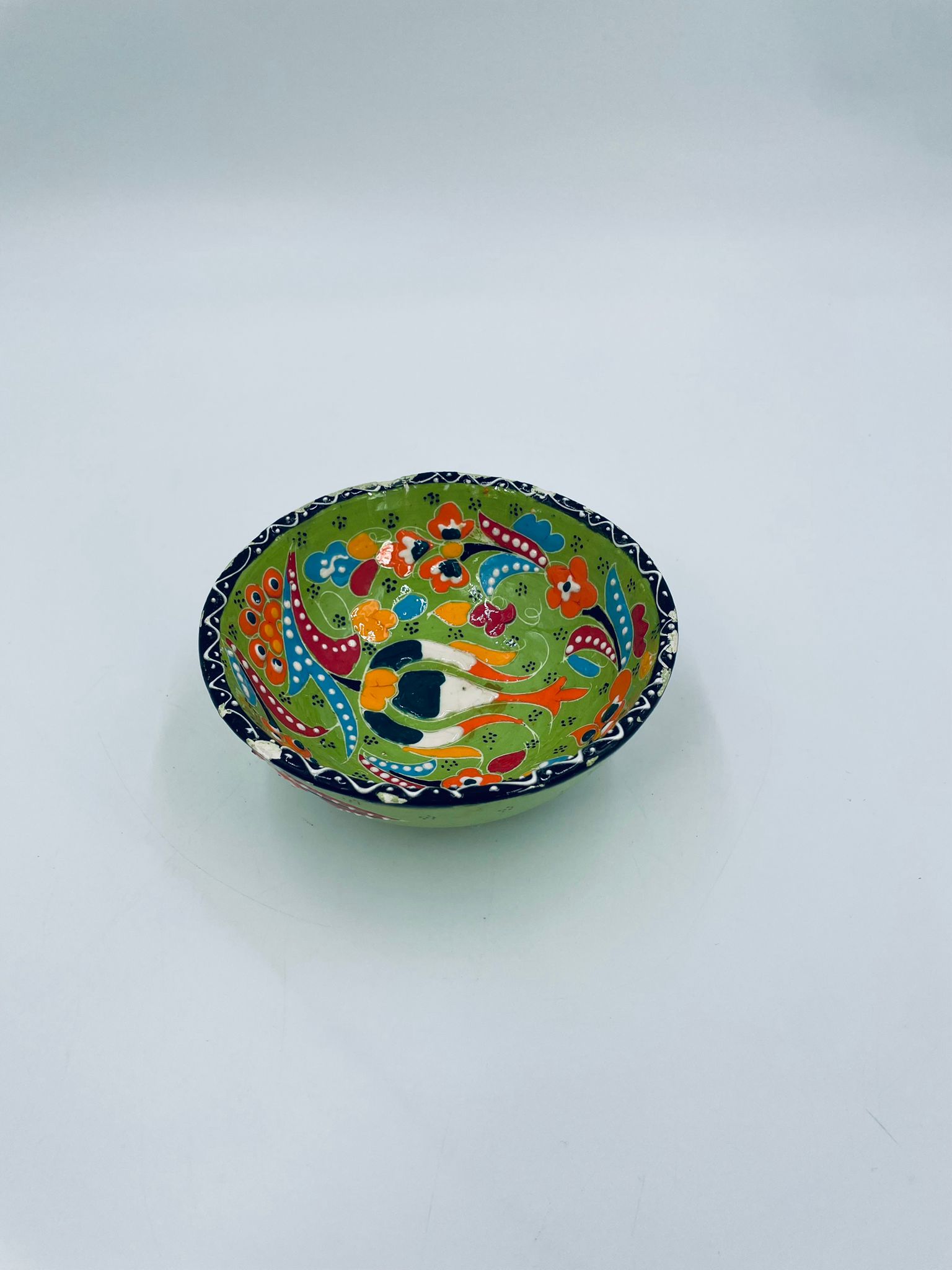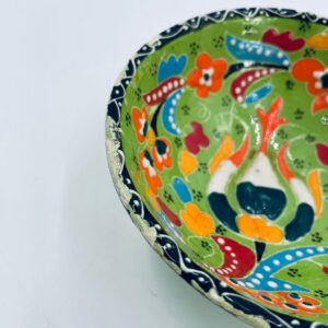 Miseczka, salaterka dekoracyjna w stylu Vintage, wykonana z wysokiej jakości tureckiej ceramiki. Miseczka w zielonym kolorze, ręcznie robiona, ręcznie malowana w orientalne, kolorowe wzory. Posiada pęknięcie szkliwa oraz uszczerbek na rancie.