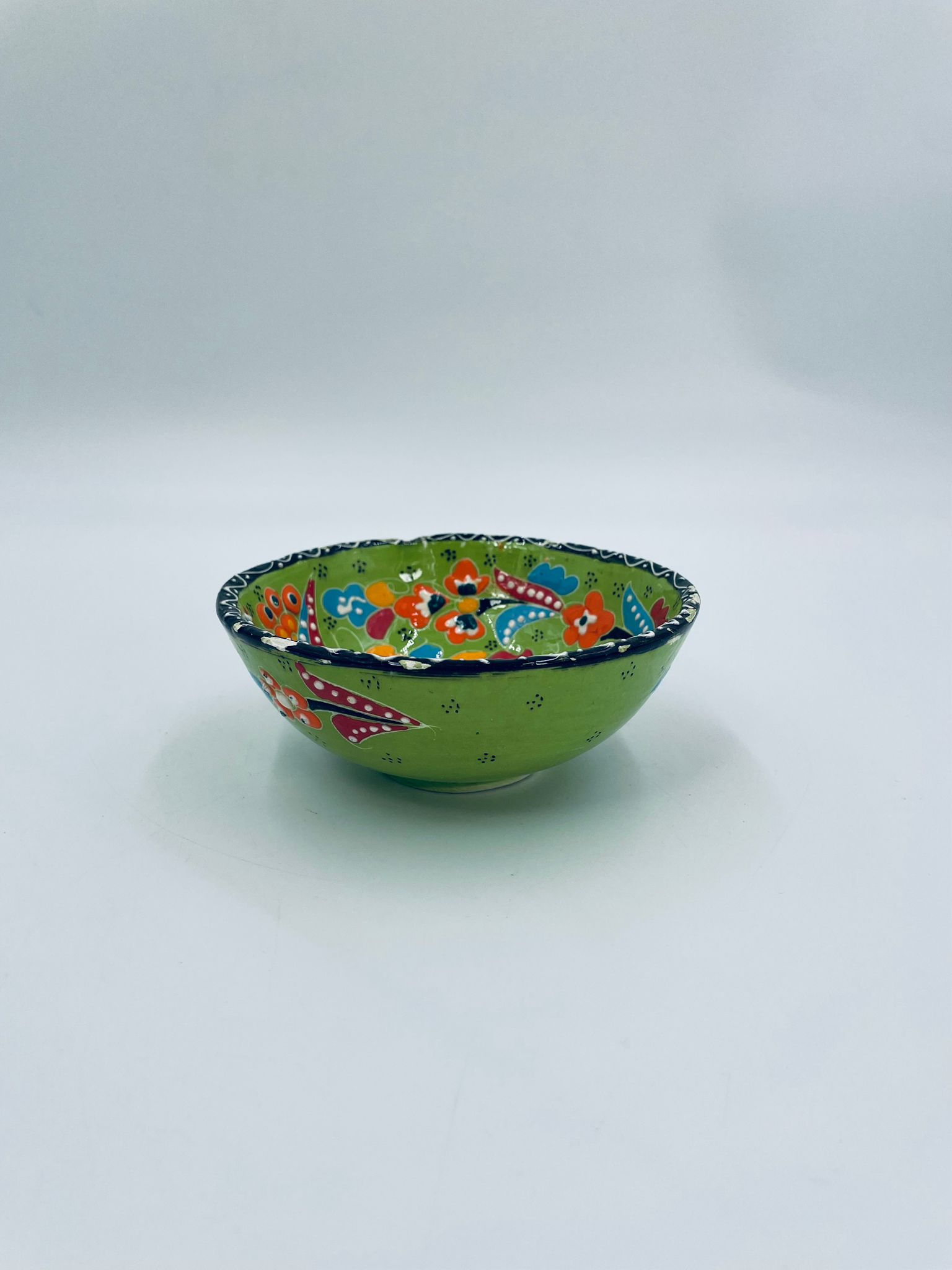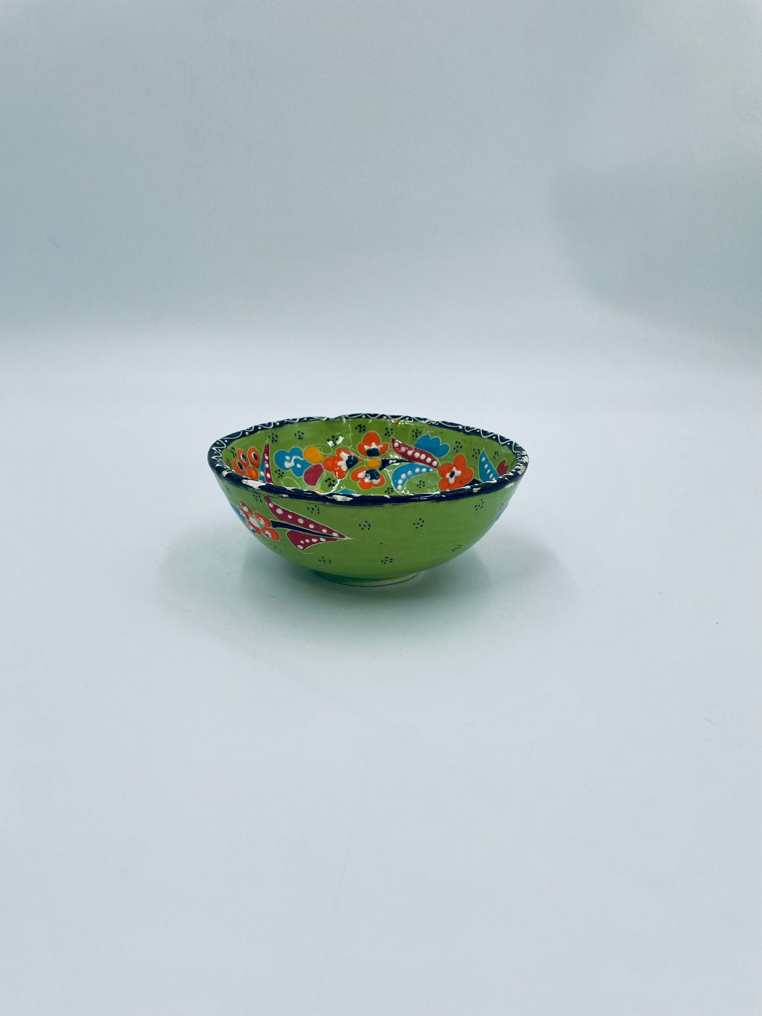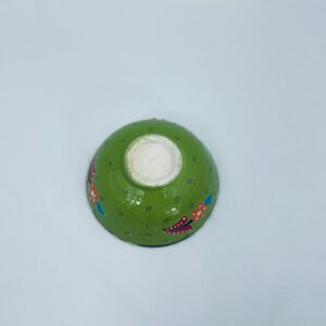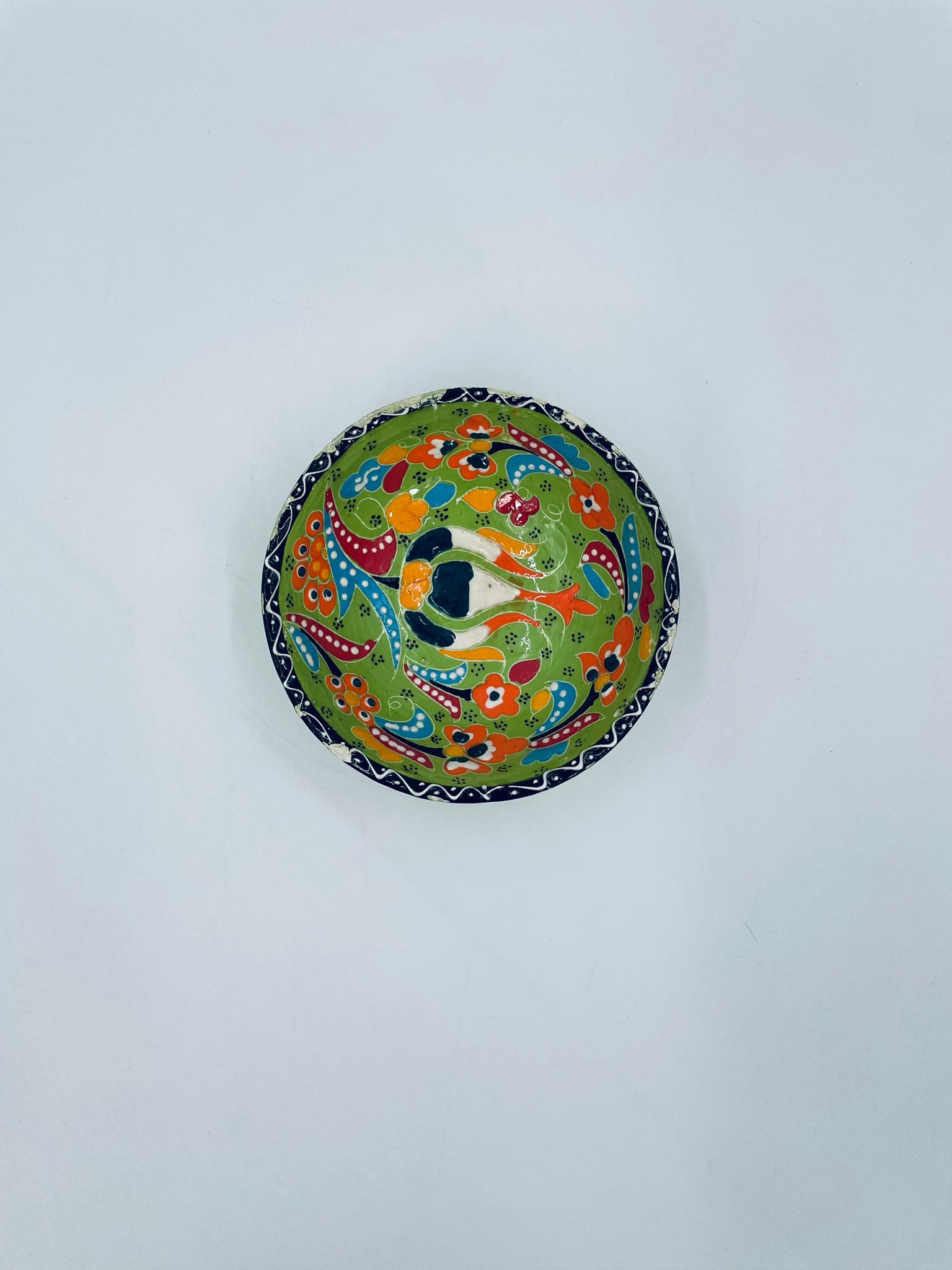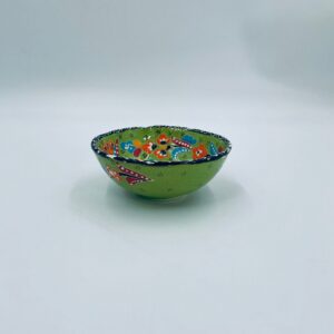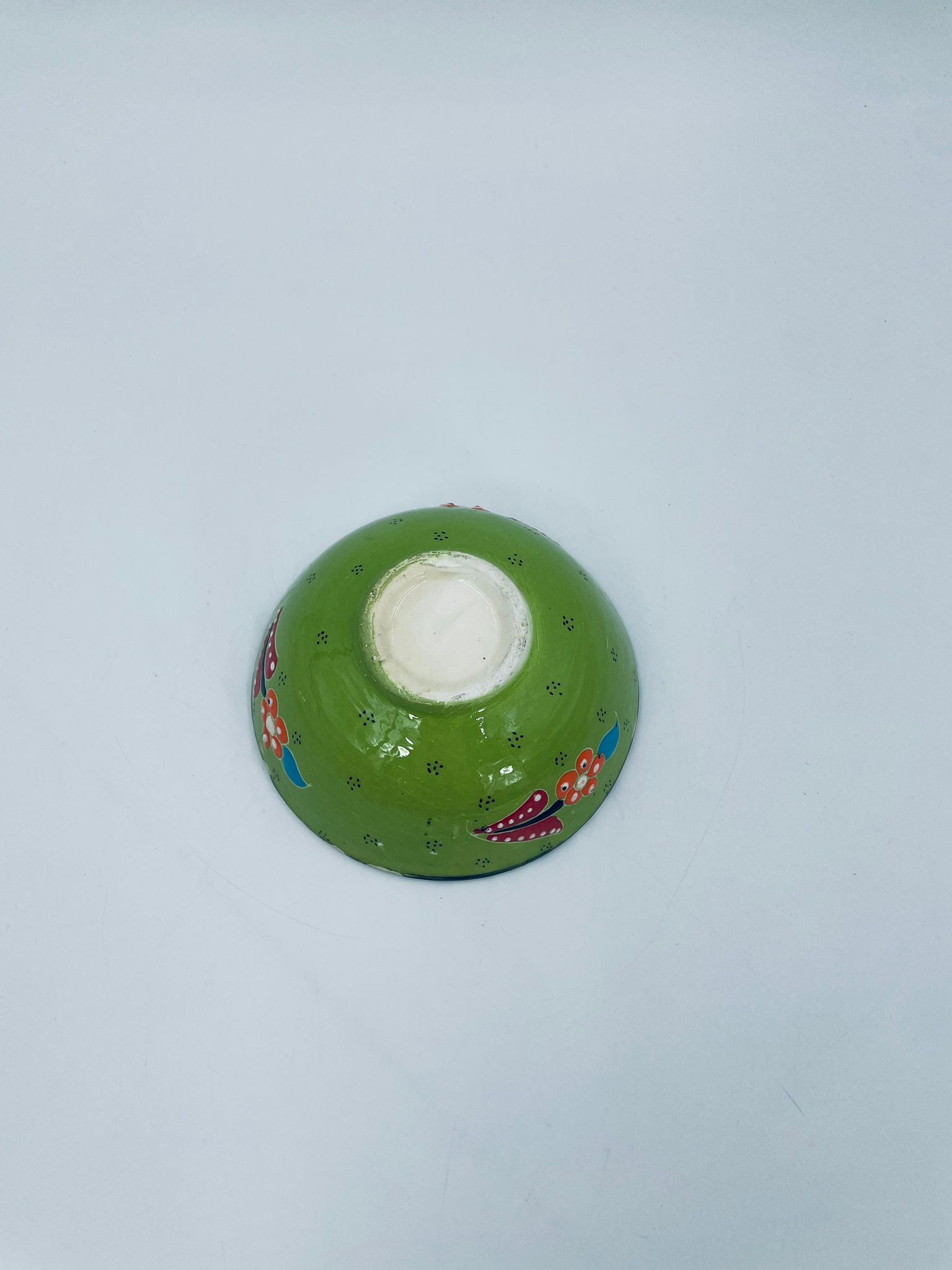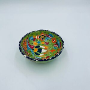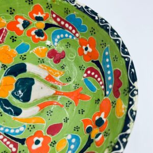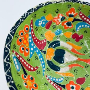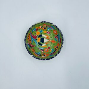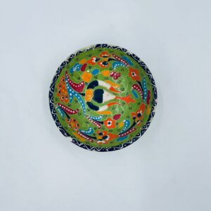 Miseczka, salaterka dekoracyjna w stylu Vintage, wykonana z wysokiej jakości tureckiej ceramiki. Miseczka w zielonym kolorze, ręcznie robiona, ręcznie malowana w orientalne, kolorowe wzory. Posiada pęknięcie szkliwa oraz uszczerbek na rancie.