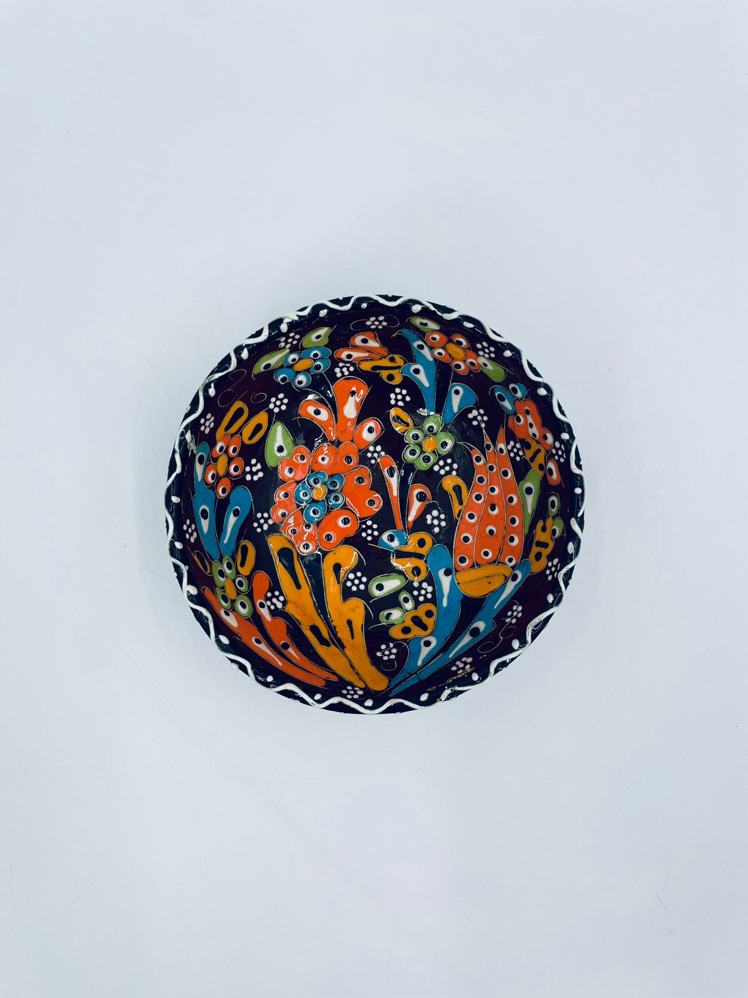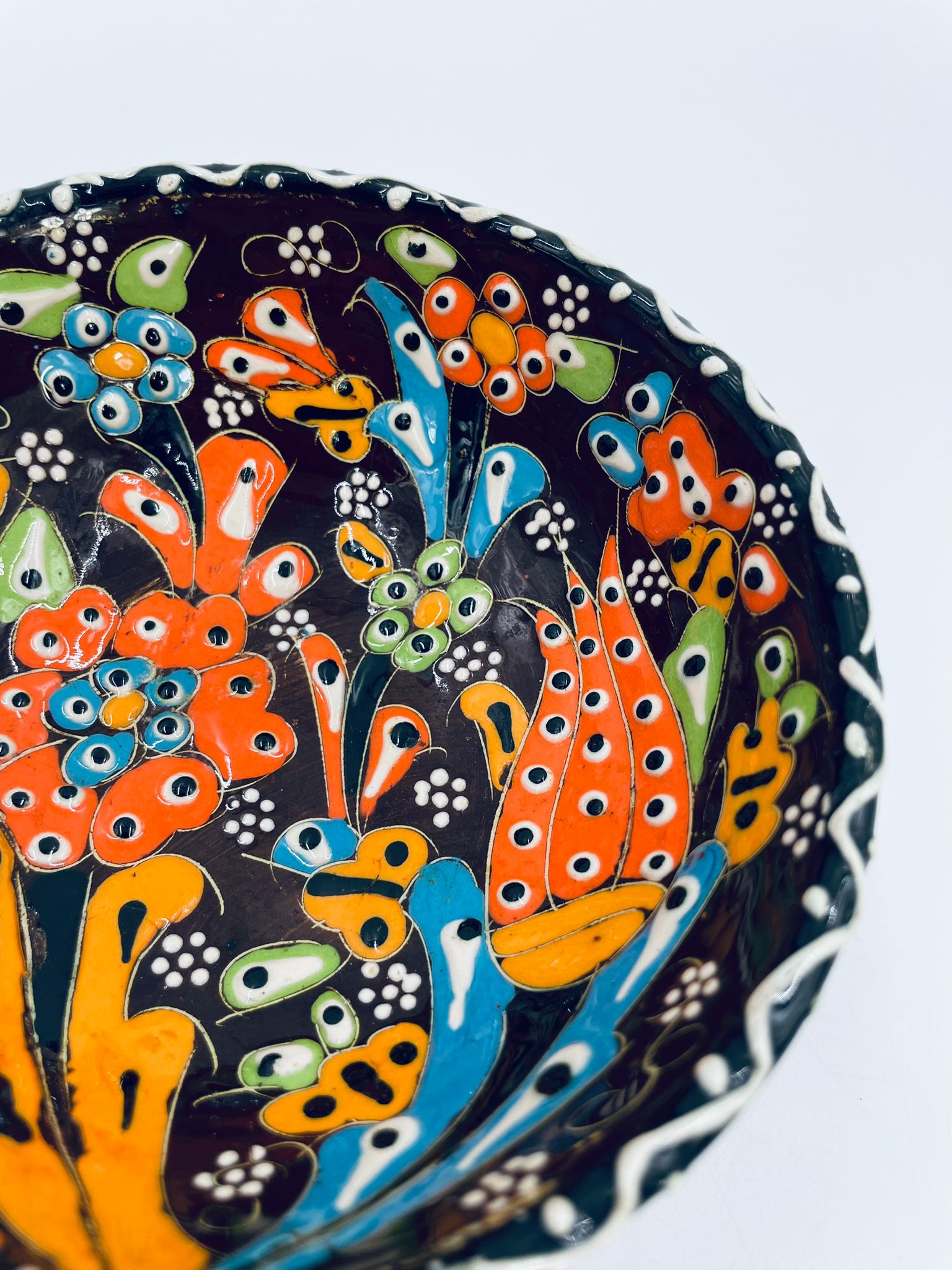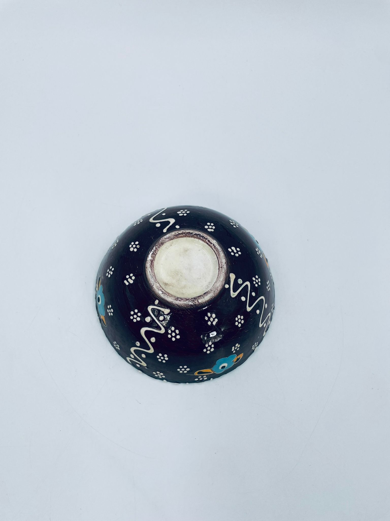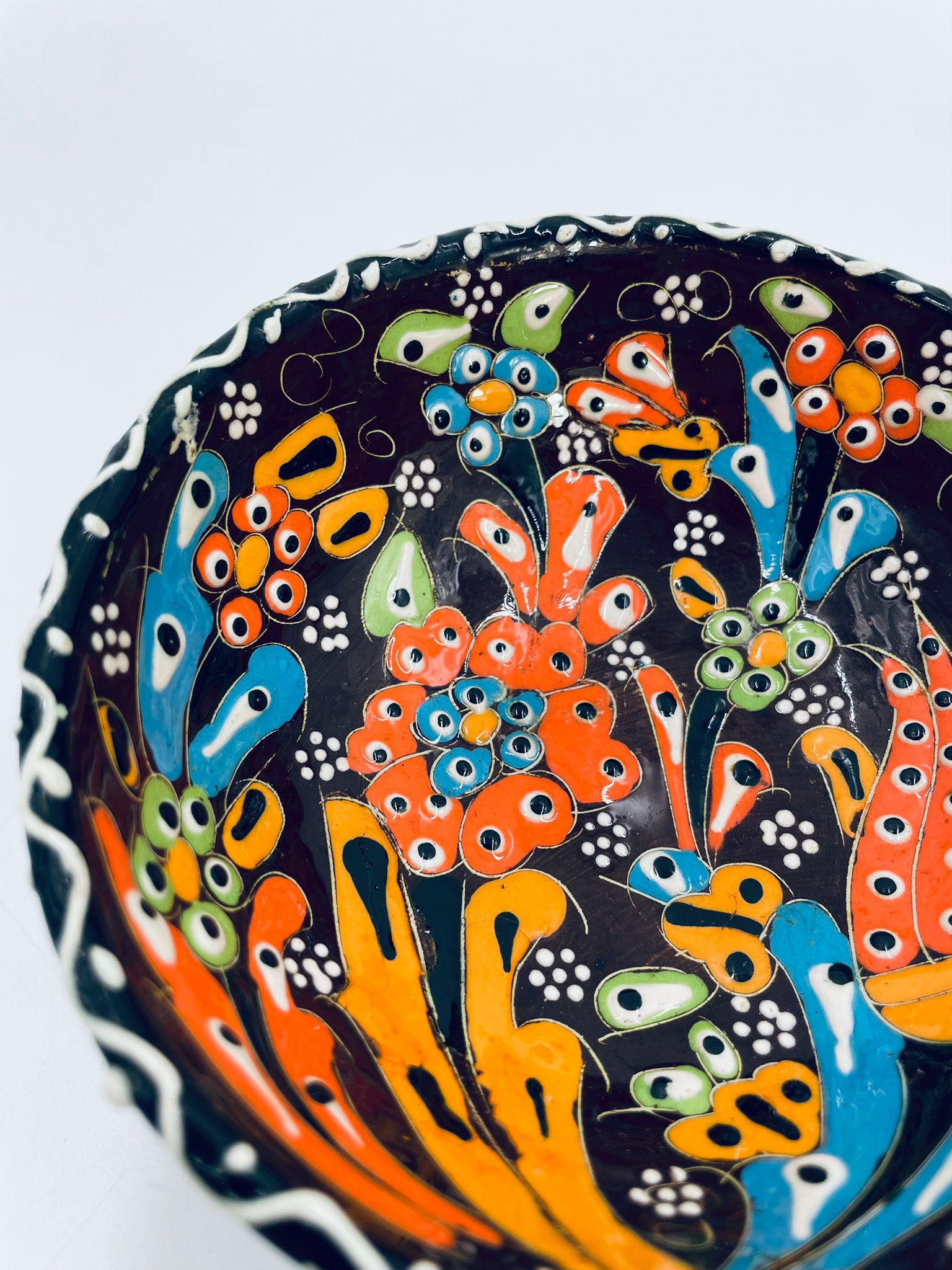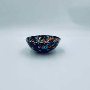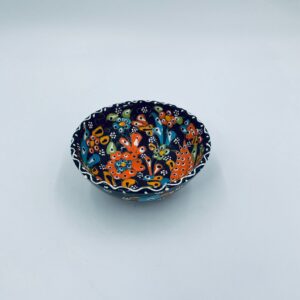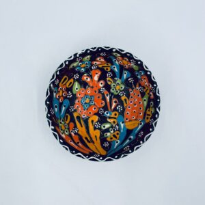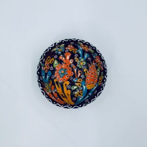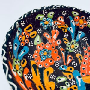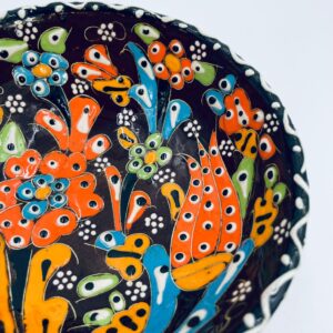 Miseczka, salaterka dekoracyjna w stylu Vintage, wykonana z wysokiej jakości tureckiej ceramiki. Miseczka w brązowym kolorze, ręcznie robiona, ręcznie malowana w orientalne, kolorowe wzory. Posiada pęknięcie szkliwa.