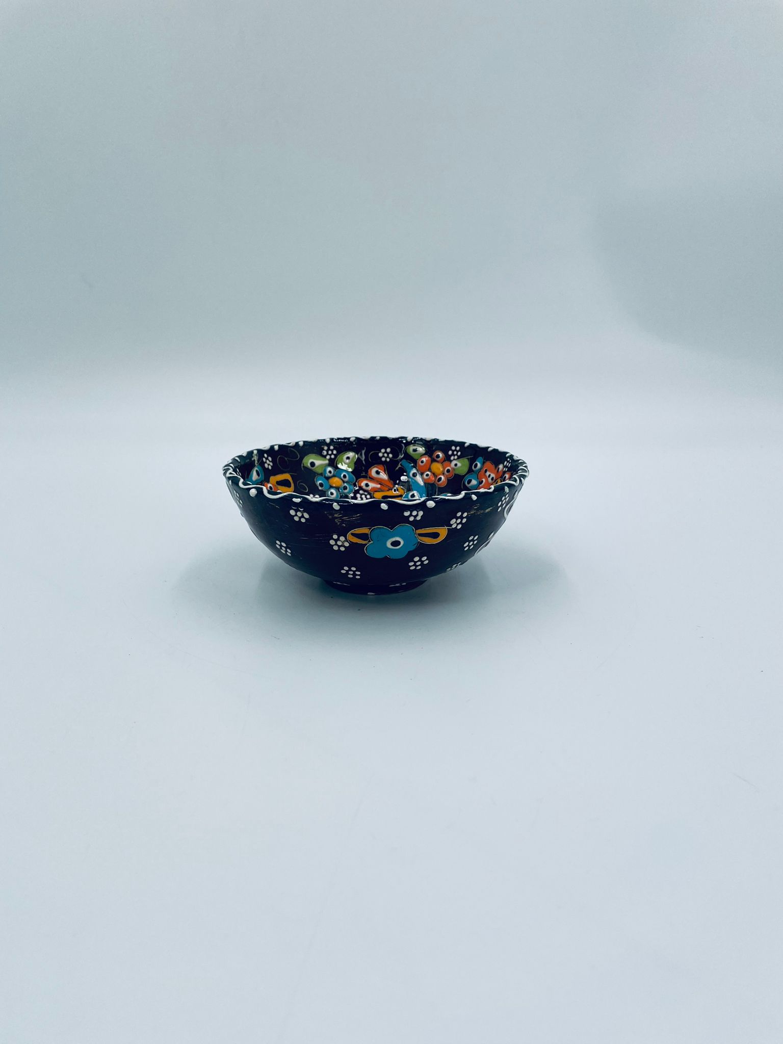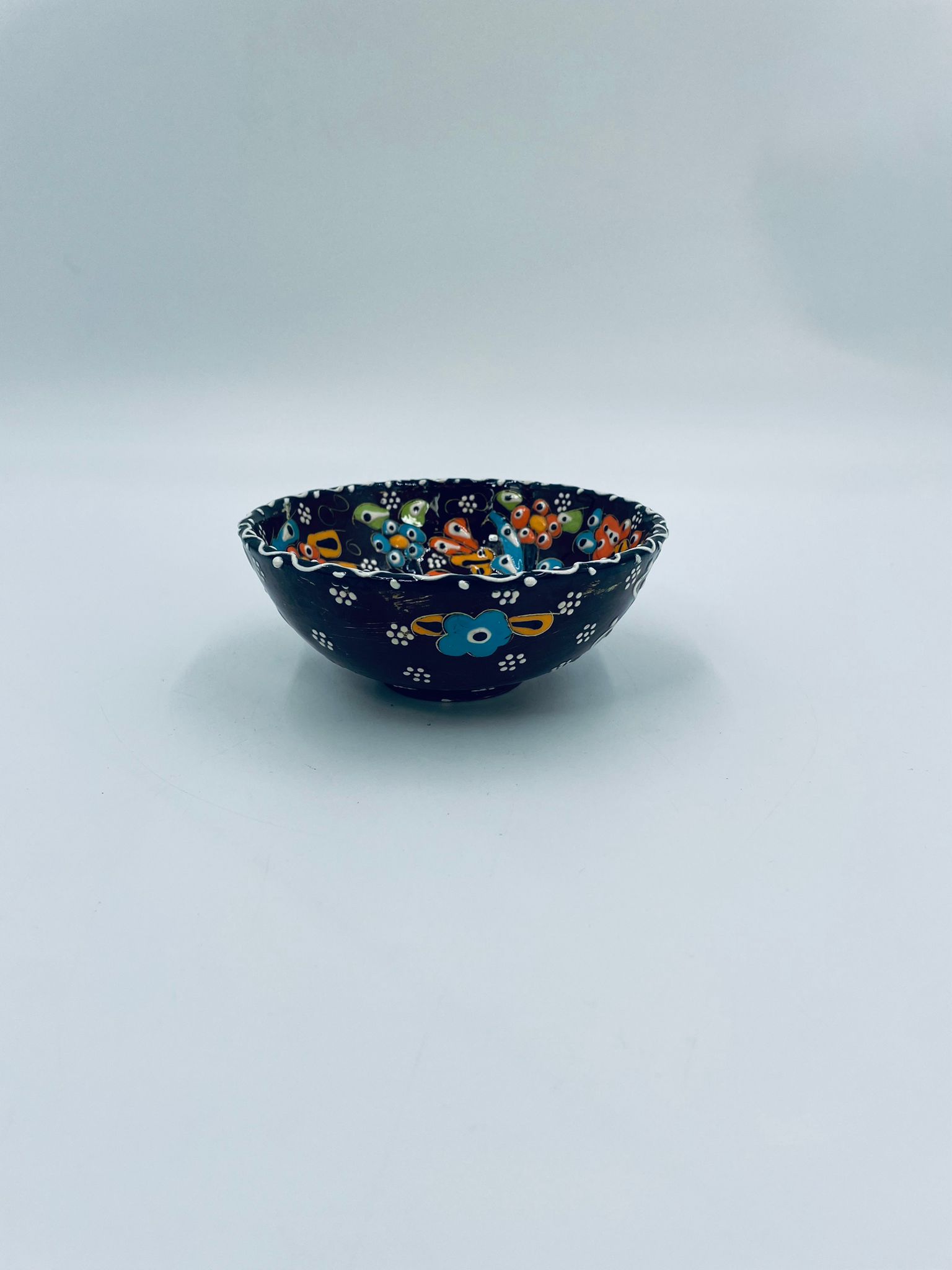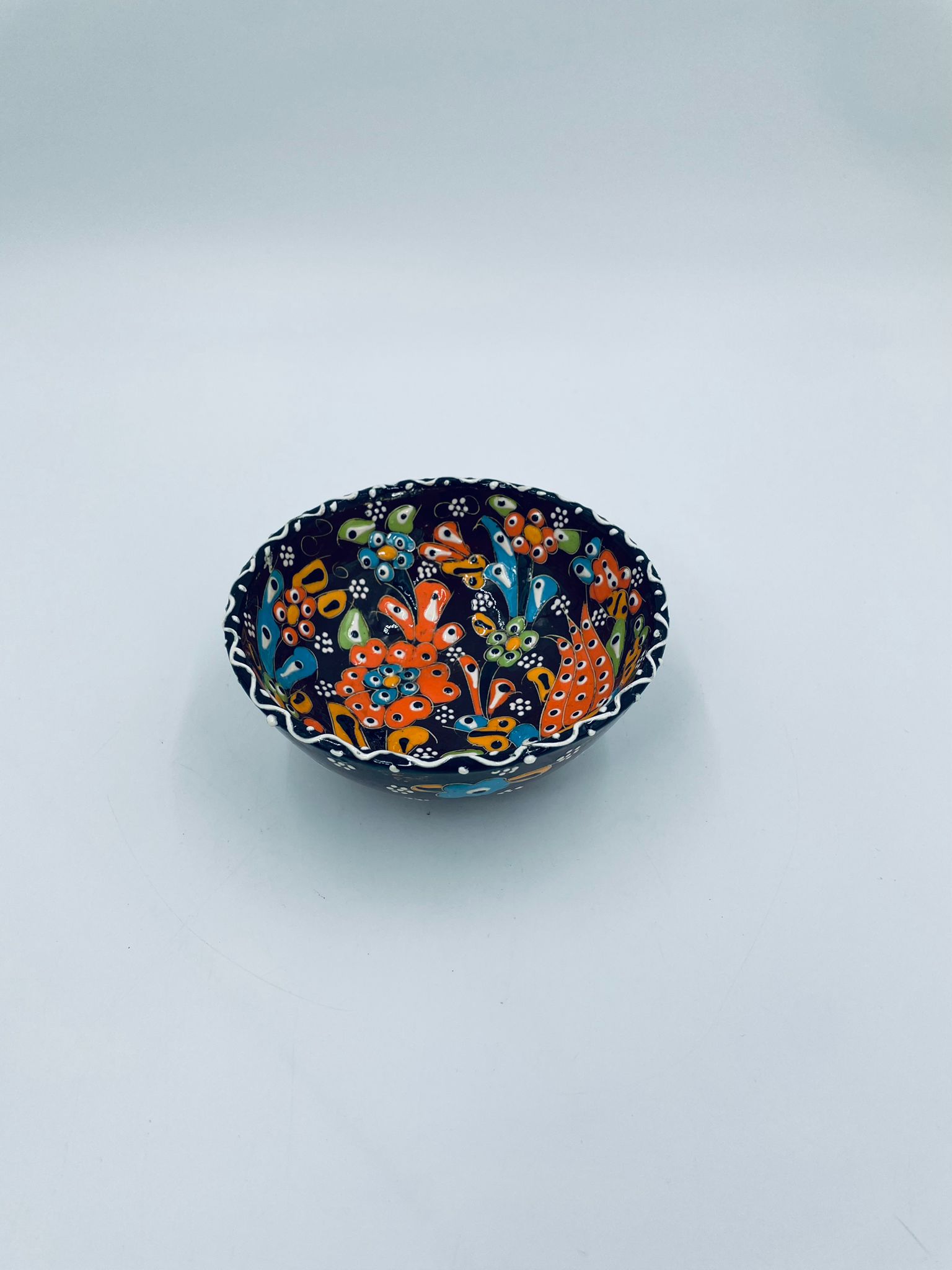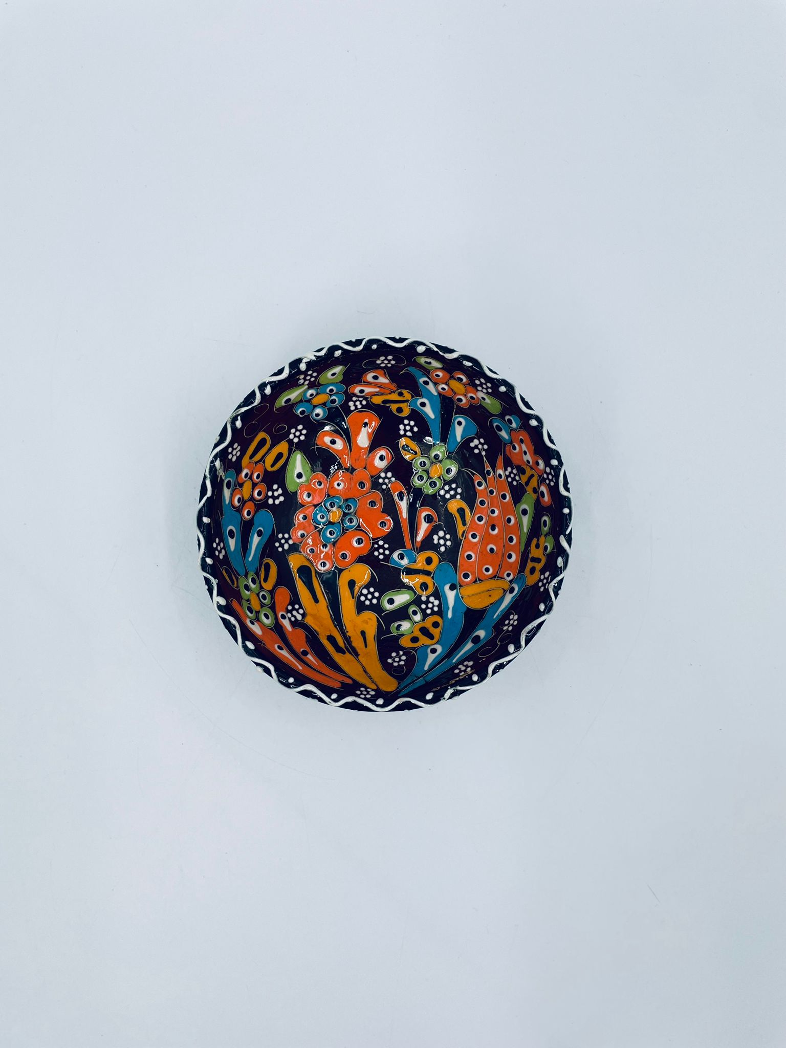 Miseczka, salaterka dekoracyjna w stylu Vintage, wykonana z wysokiej jakości tureckiej ceramiki. Miseczka w brązowym kolorze, ręcznie robiona, ręcznie malowana w orientalne, kolorowe wzory. Posiada pęknięcie szkliwa.