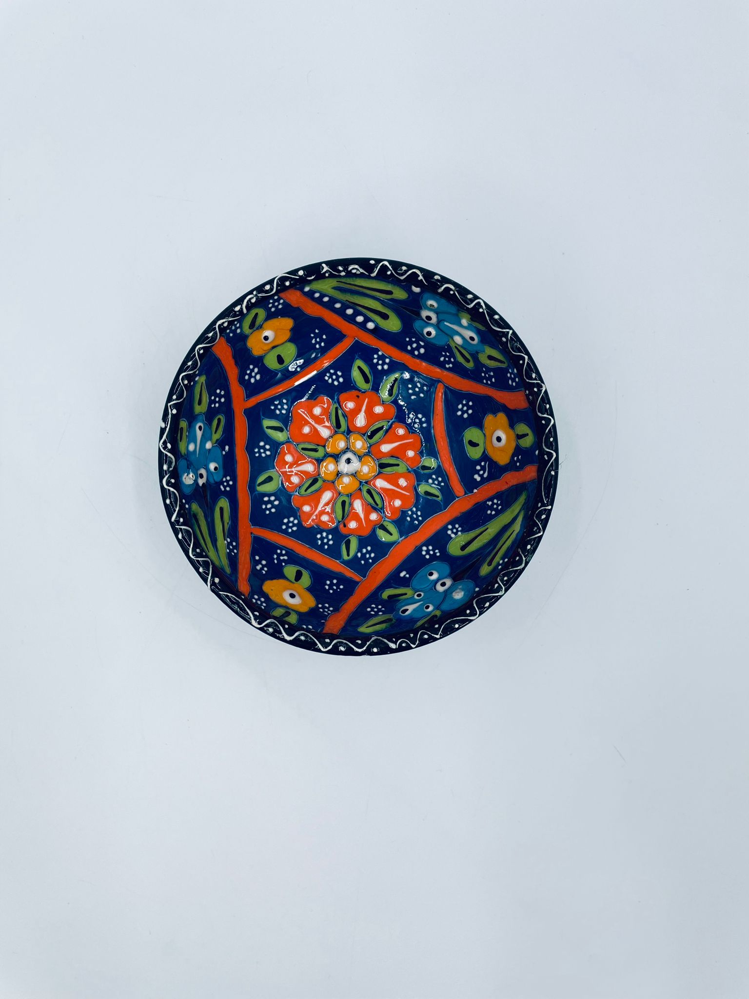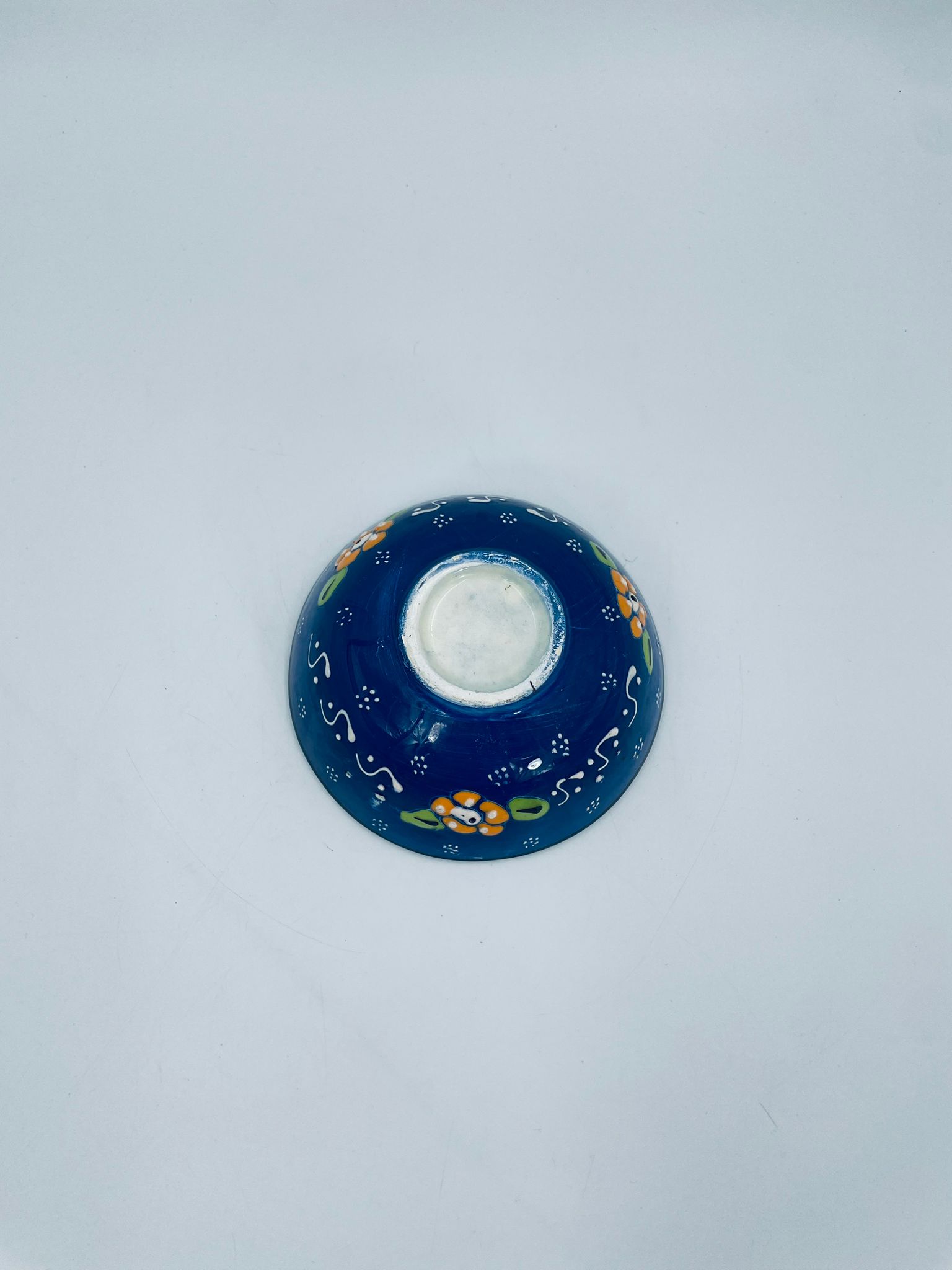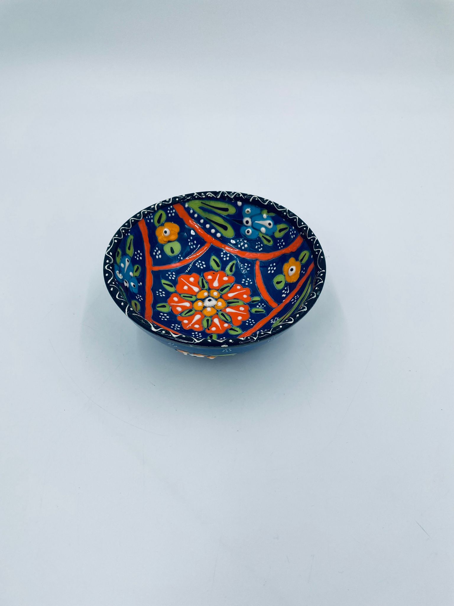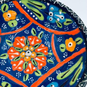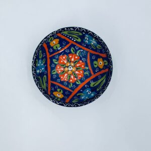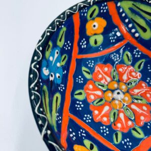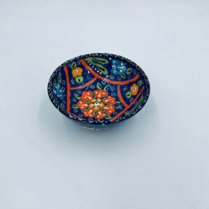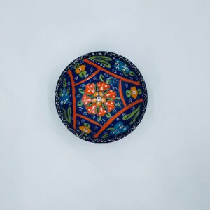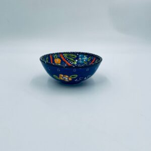 Miseczka, salaterka dekoracyjna w stylu Vintage, wykonana z wysokiej jakości tureckiej ceramiki. Miseczka w granatowym kolorze, ręcznie robiona, ręcznie malowana w orientalne, kolorowe wzory. Posiada pęknięcie szkliwa.