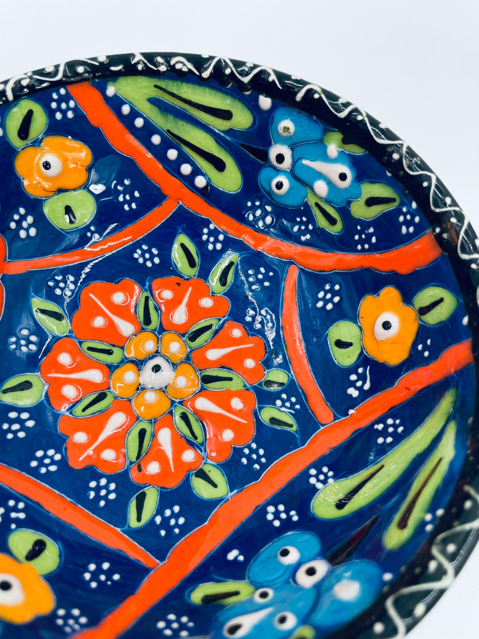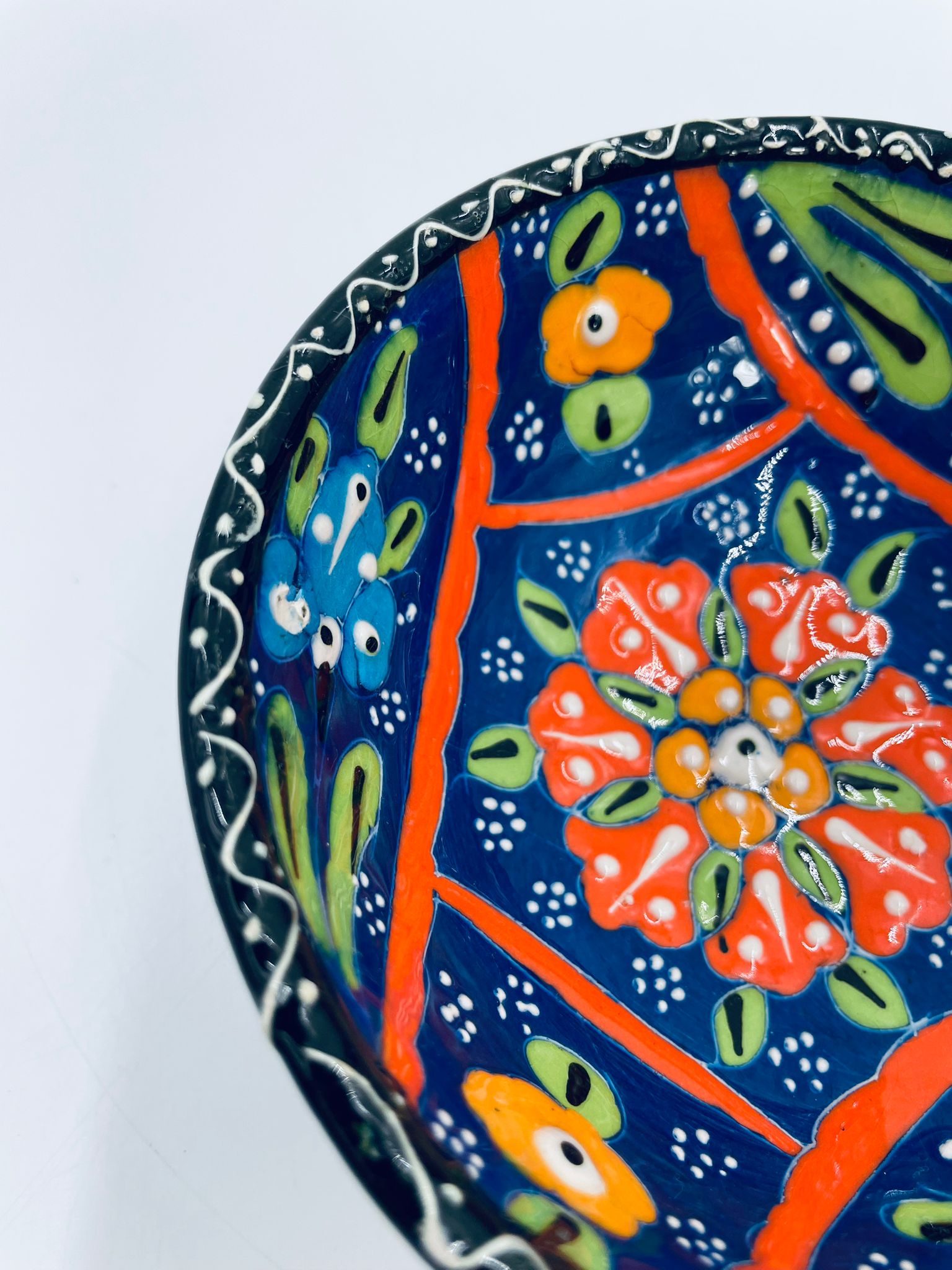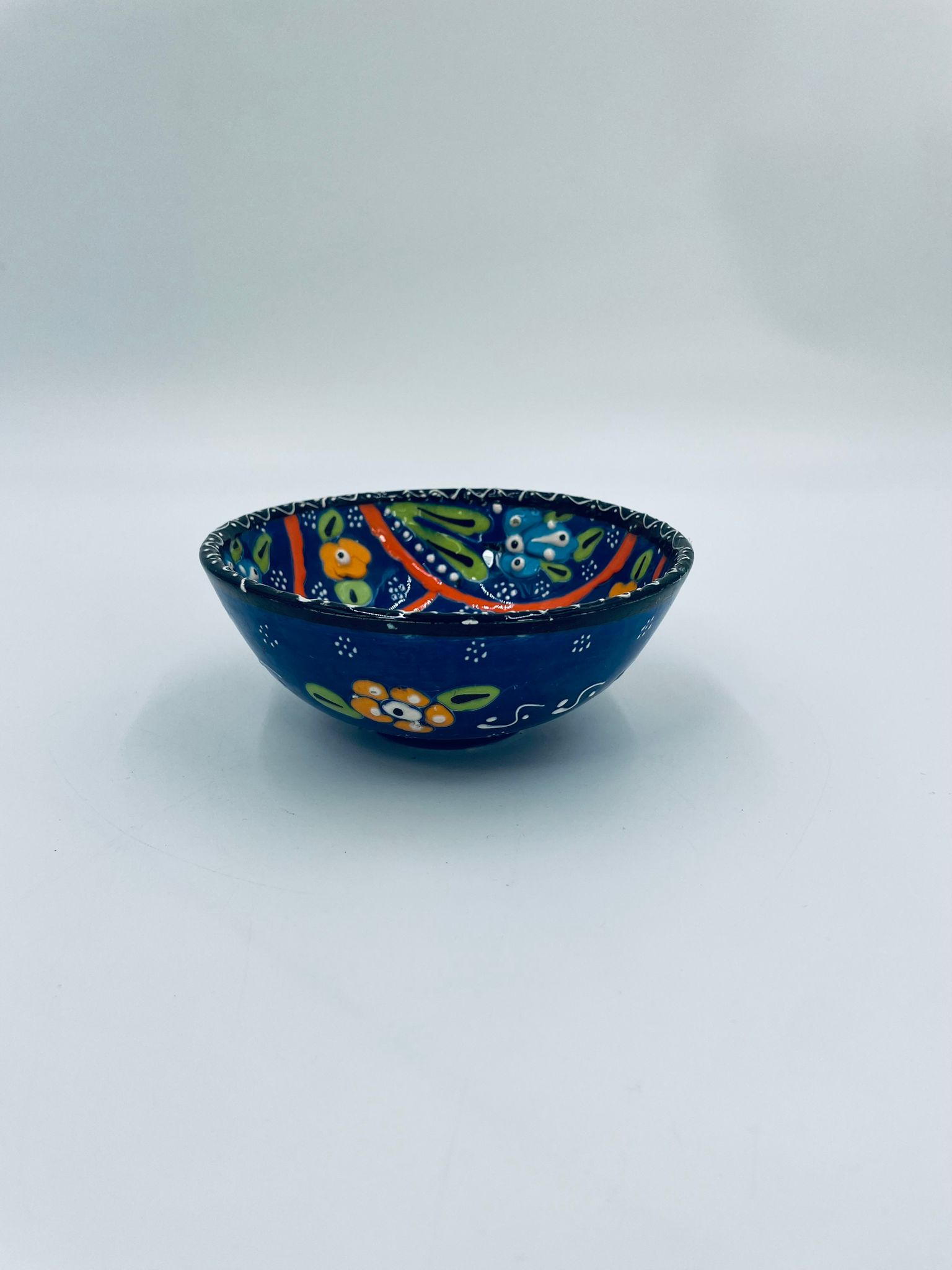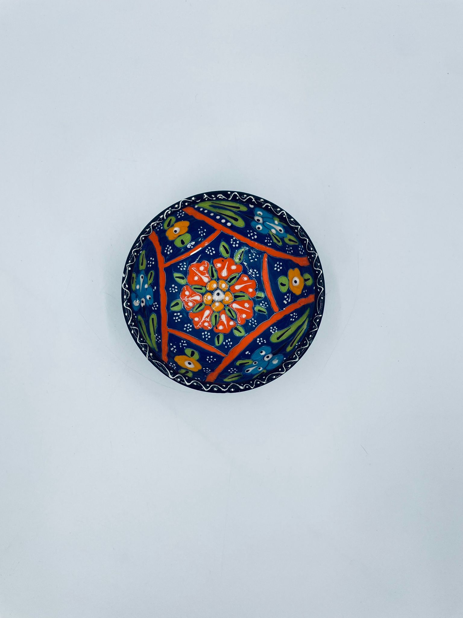 Miseczka, salaterka dekoracyjna w stylu Vintage, wykonana z wysokiej jakości tureckiej ceramiki. Miseczka w granatowym kolorze, ręcznie robiona, ręcznie malowana w orientalne, kolorowe wzory. Posiada pęknięcie szkliwa.